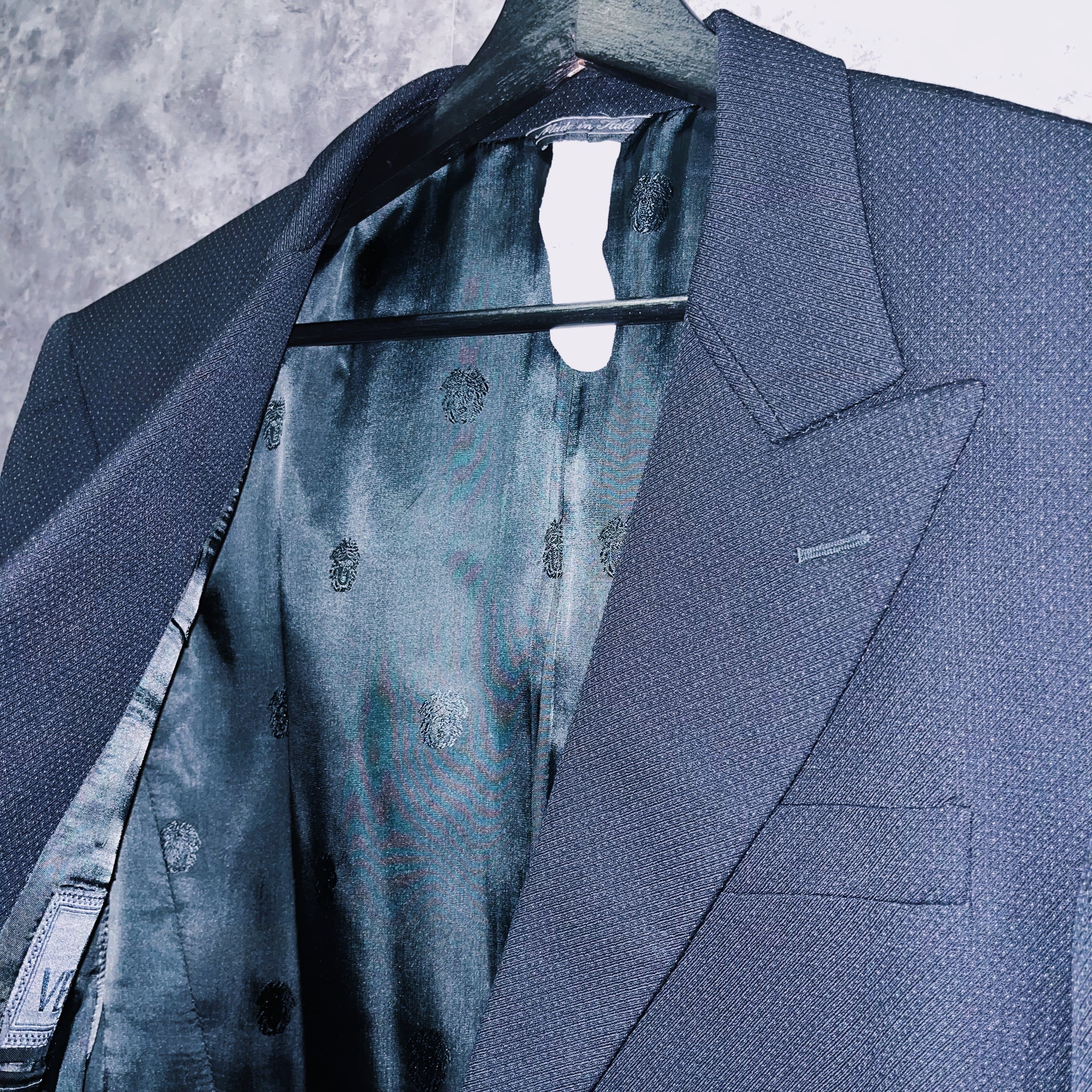 シンプルなブラックカラーで統一された上品なデザインの一着。裏地には “VERSACE” を代表するメデューサがデザインされ、細部へのこだわりはボタンにまでしっかり刻まれた一貫性。