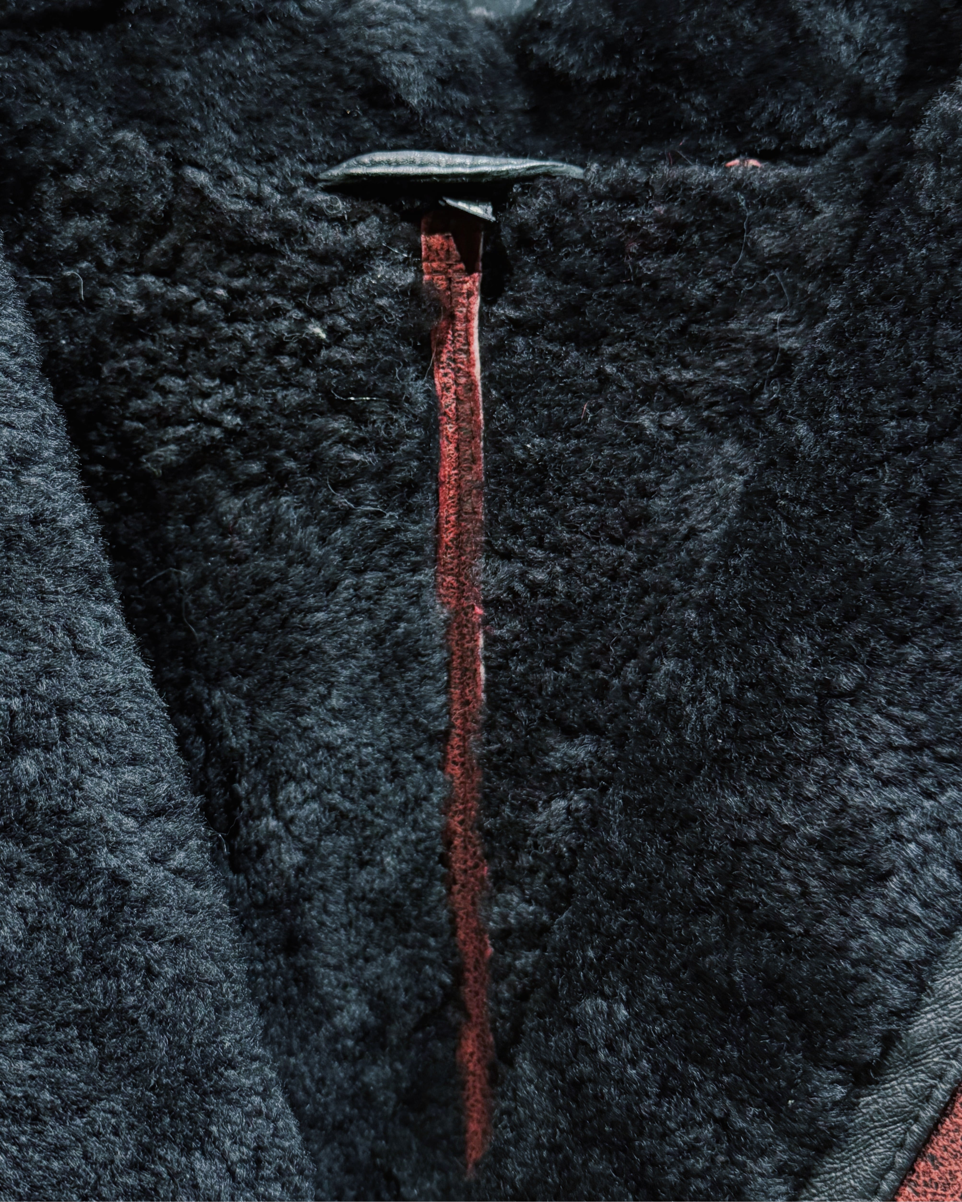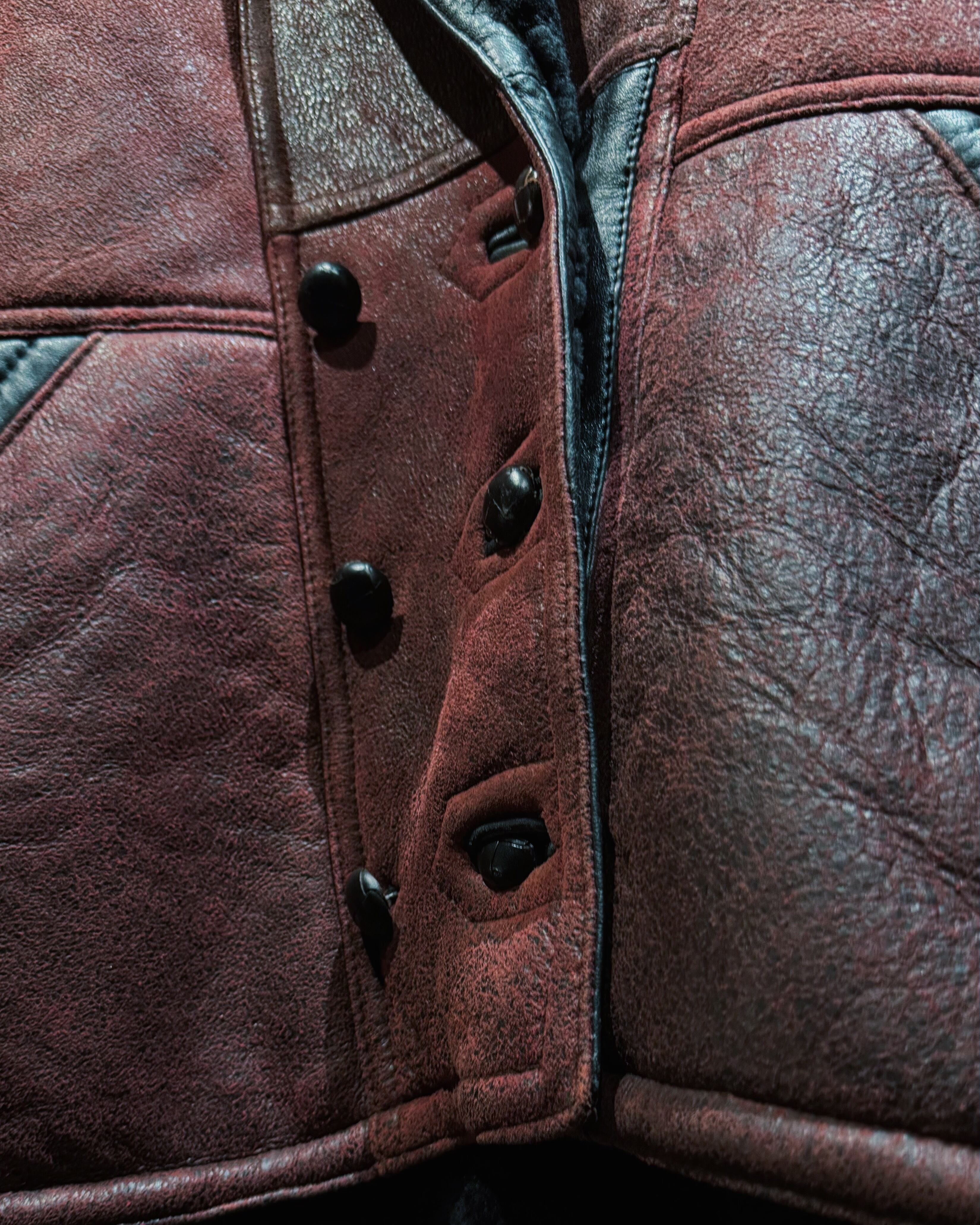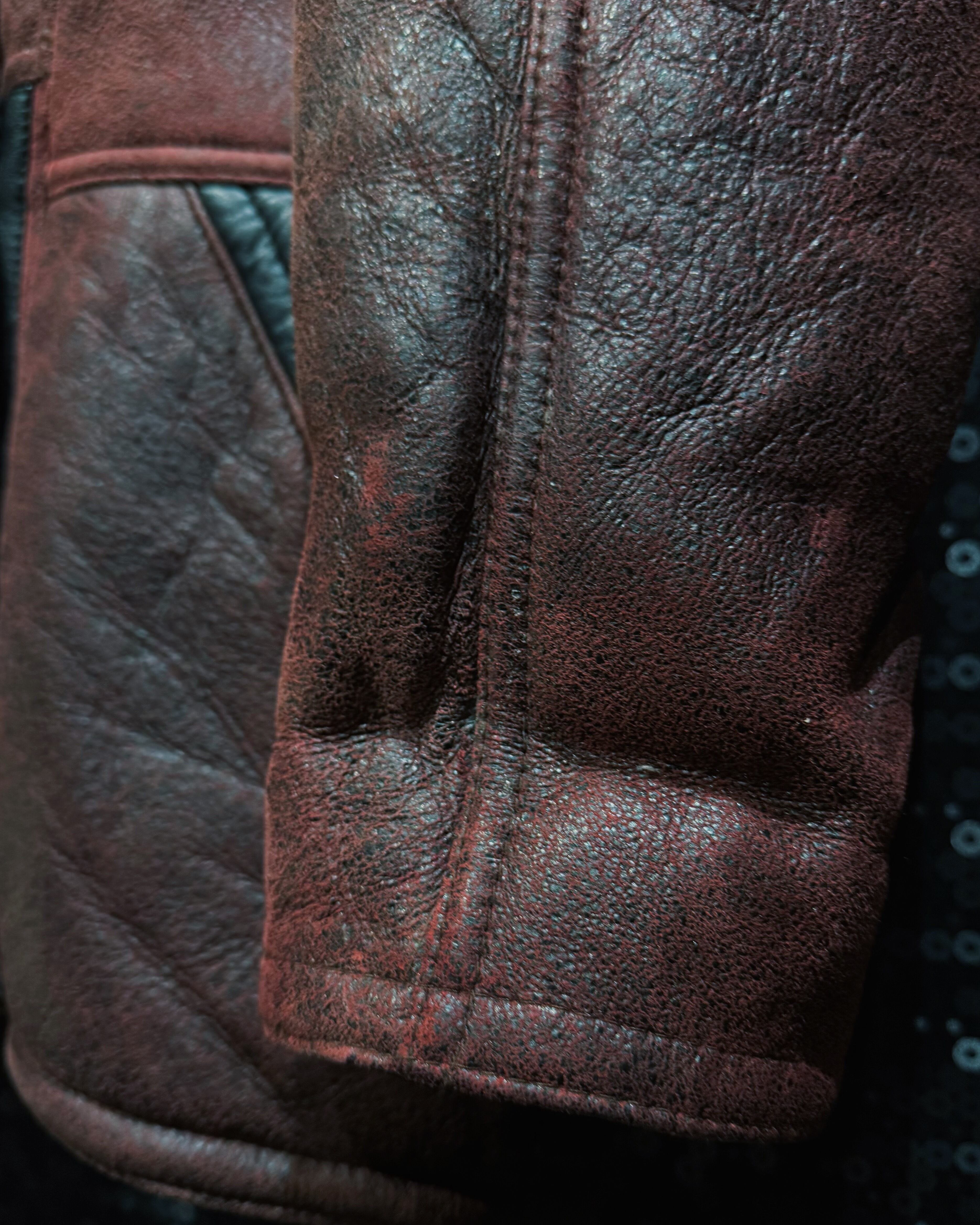 深く鈍い光を放つワインレッドのスエードレザーに、内側全面を覆うブラックシアリングを組み合わせたヴィンテージレザージャケット。