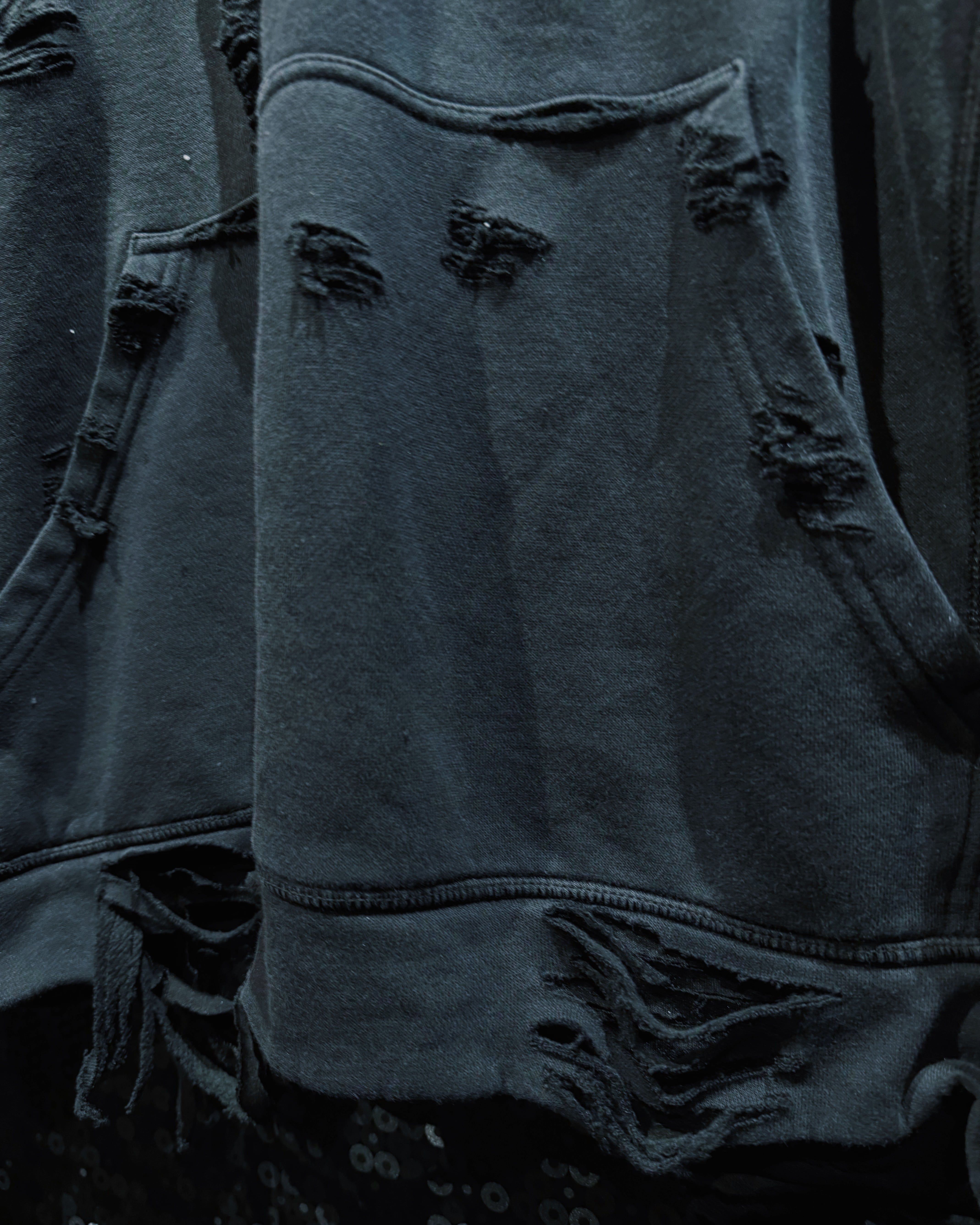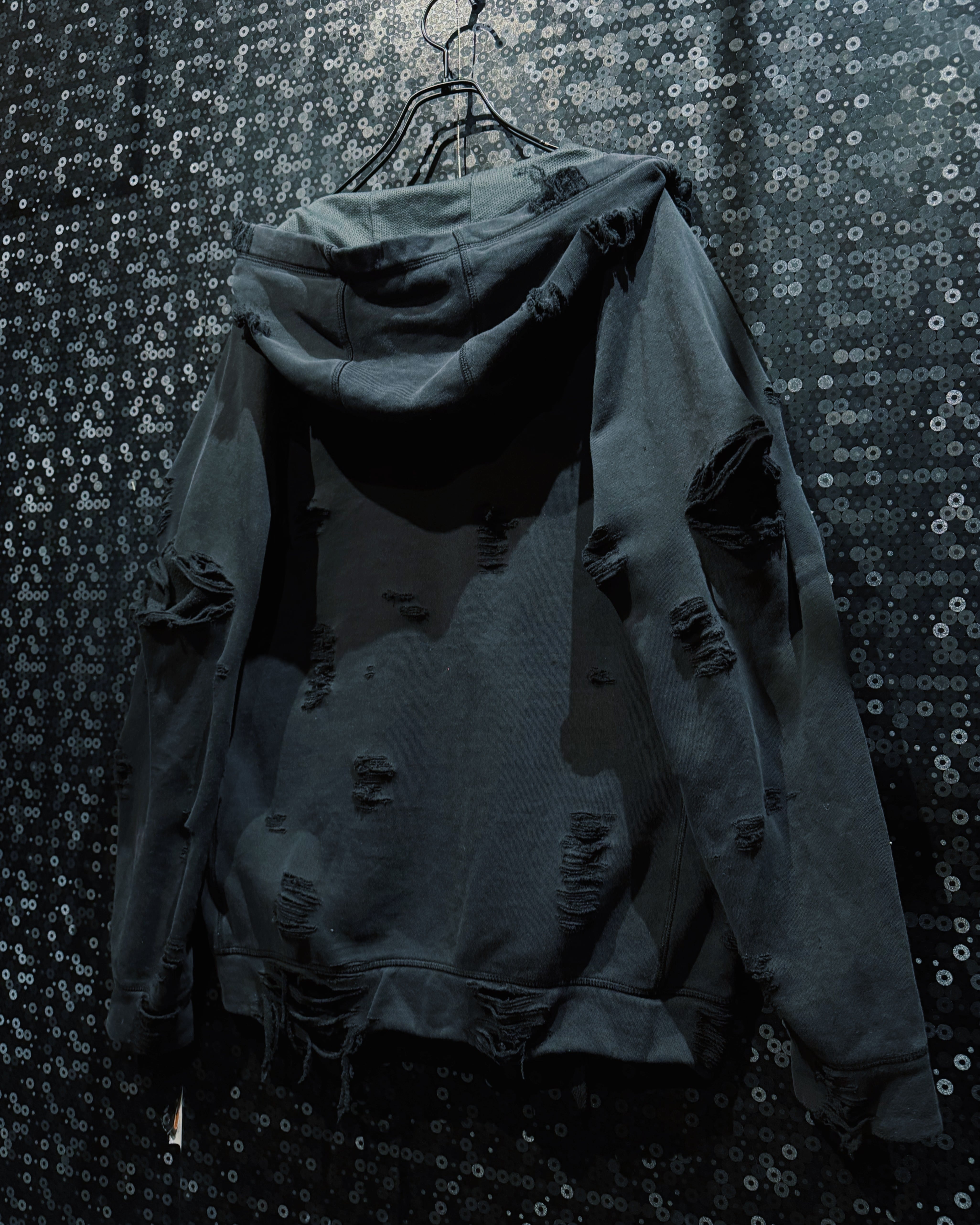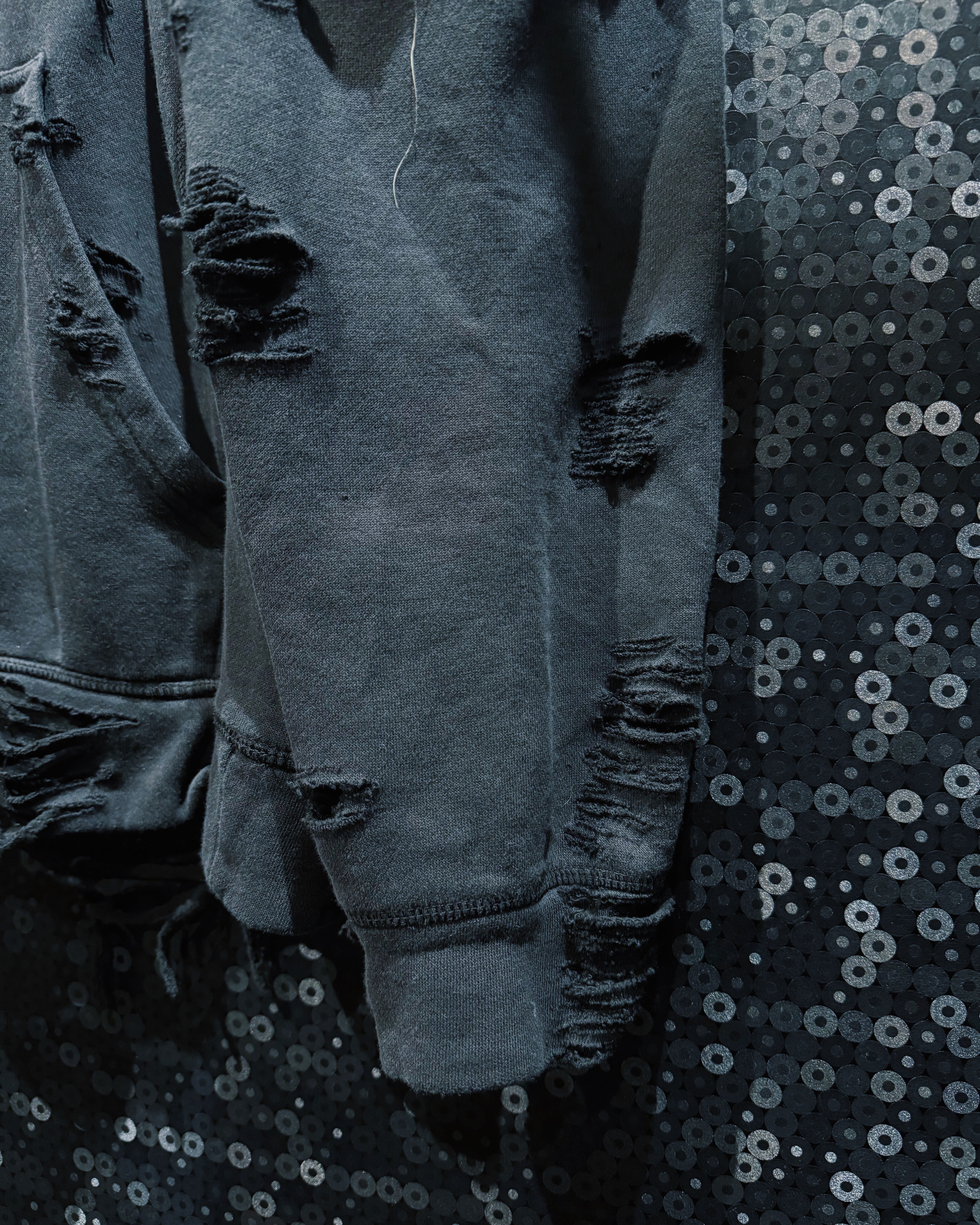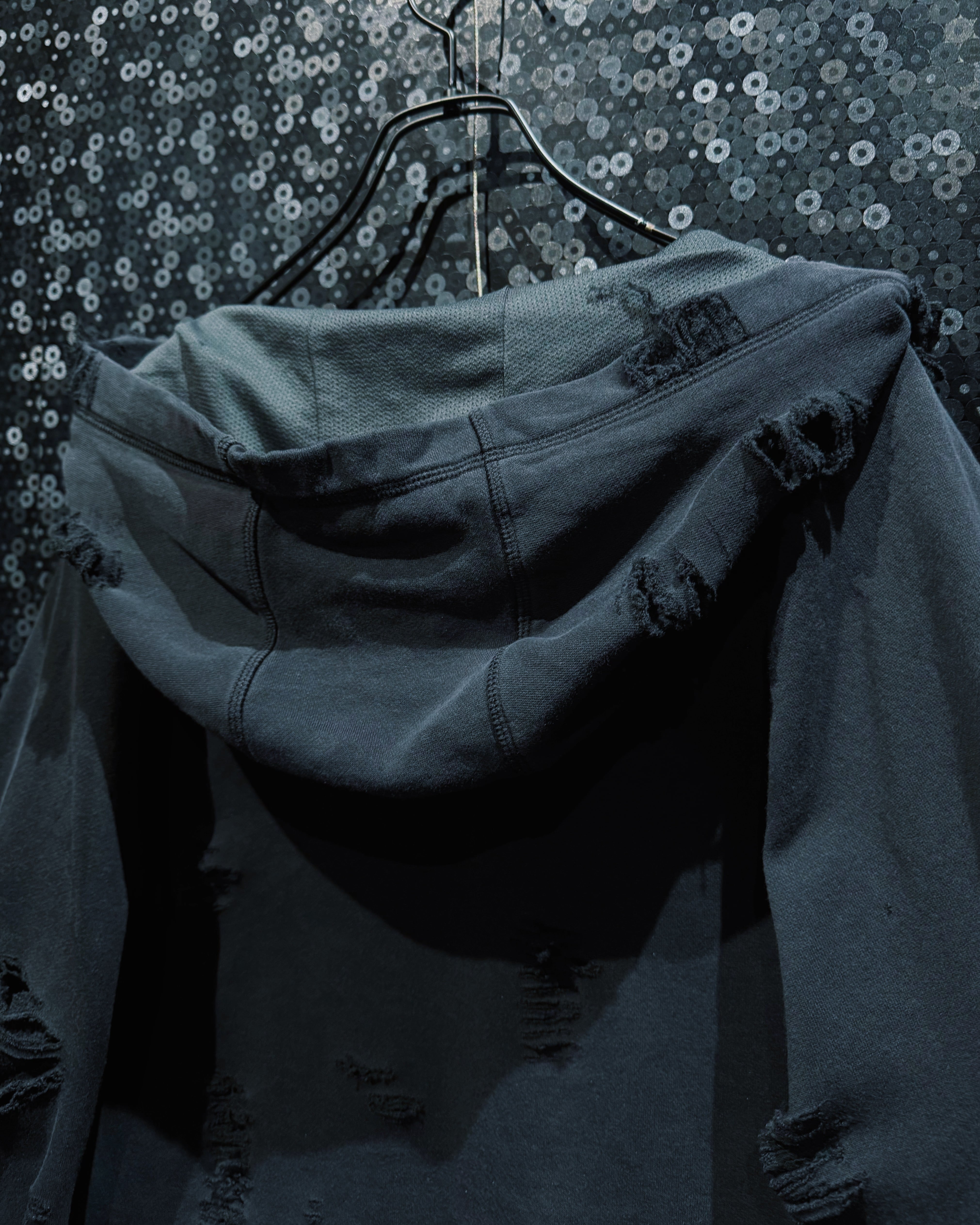 生地の表情は一箇所として同じものがなく、時間と着用を重ねたかのようなリアリティを演出している。フードやネック周りの崩し方も大胆で、被った際に自然と生まれる歪みがこの個体ならではのシルエットを形成。