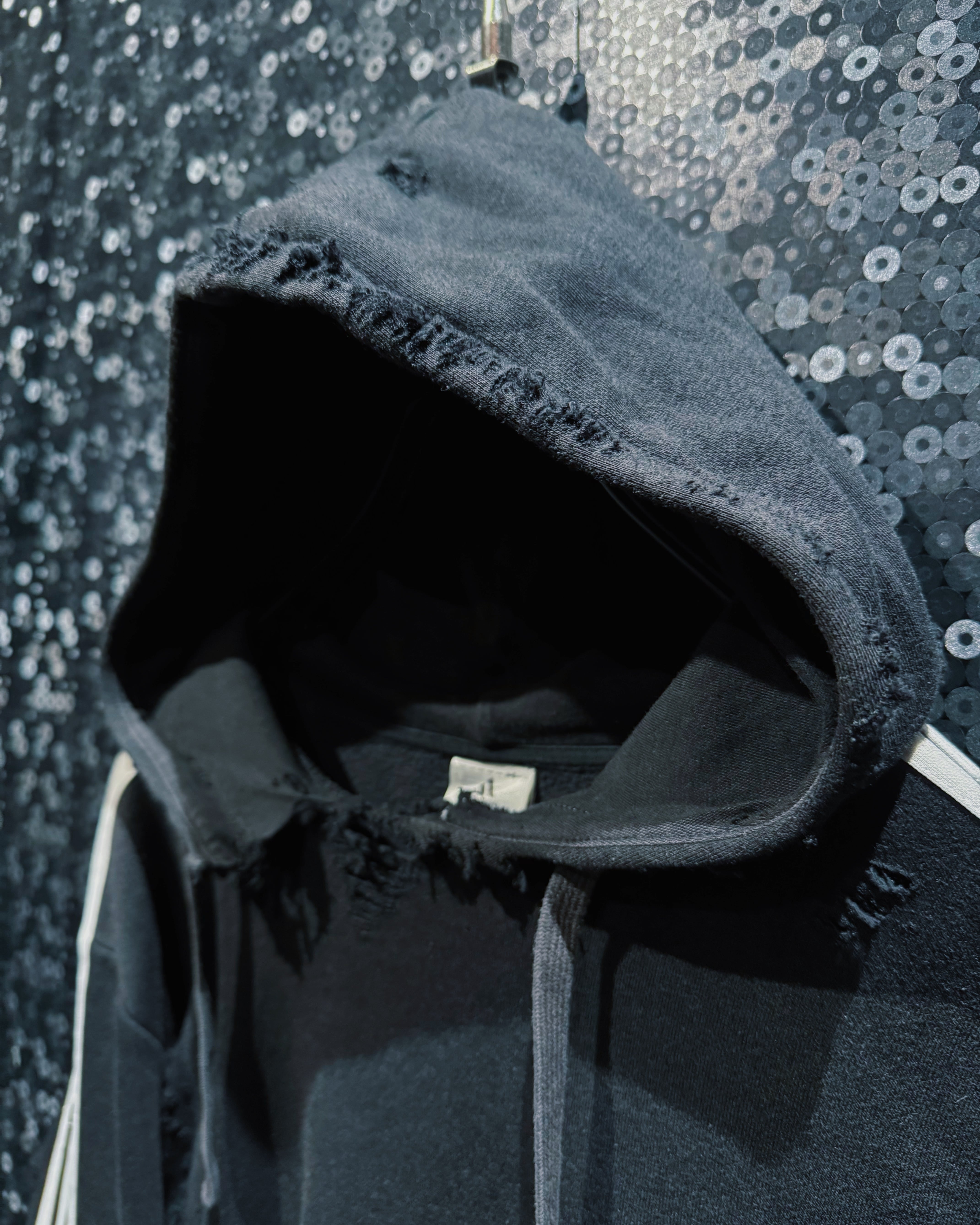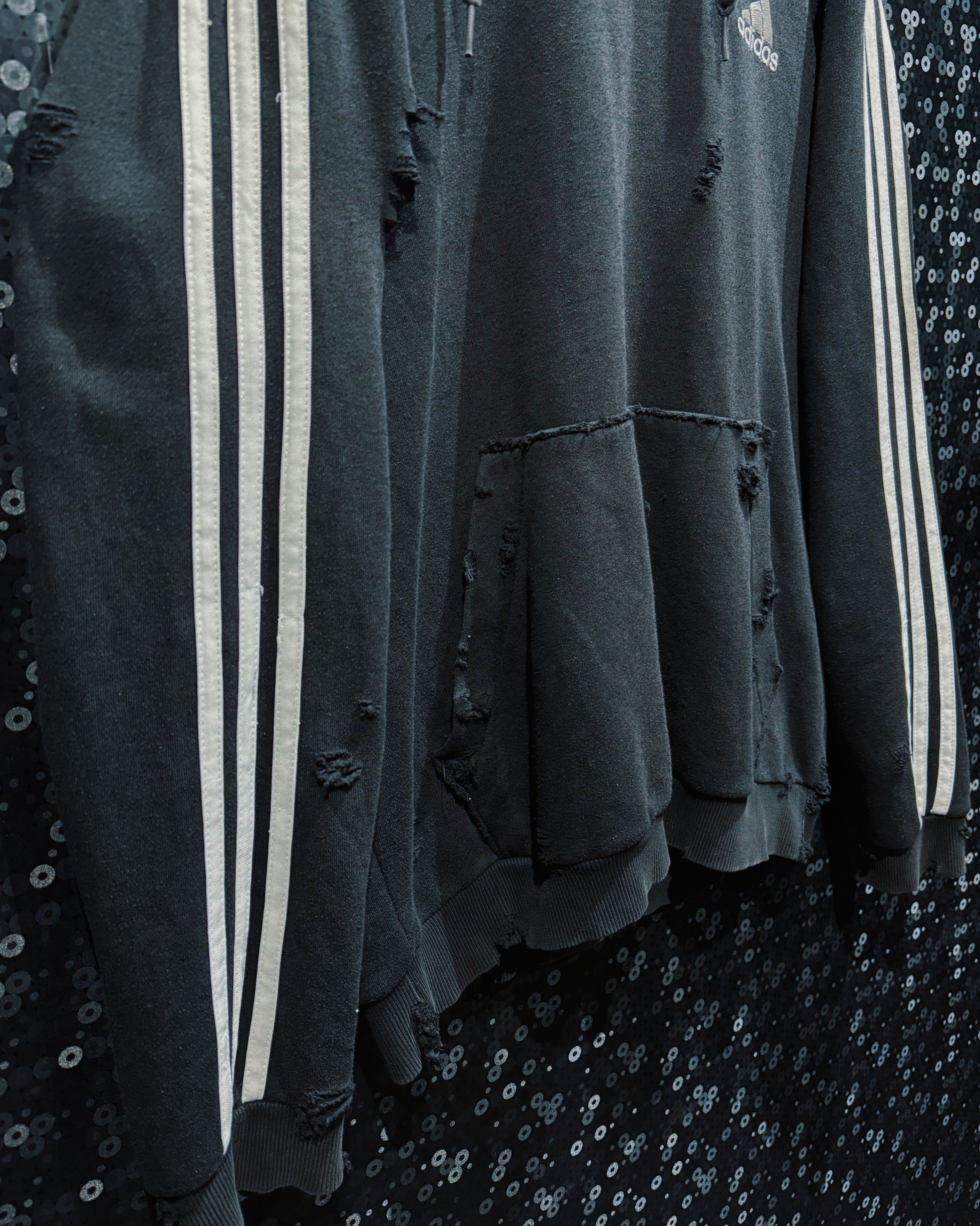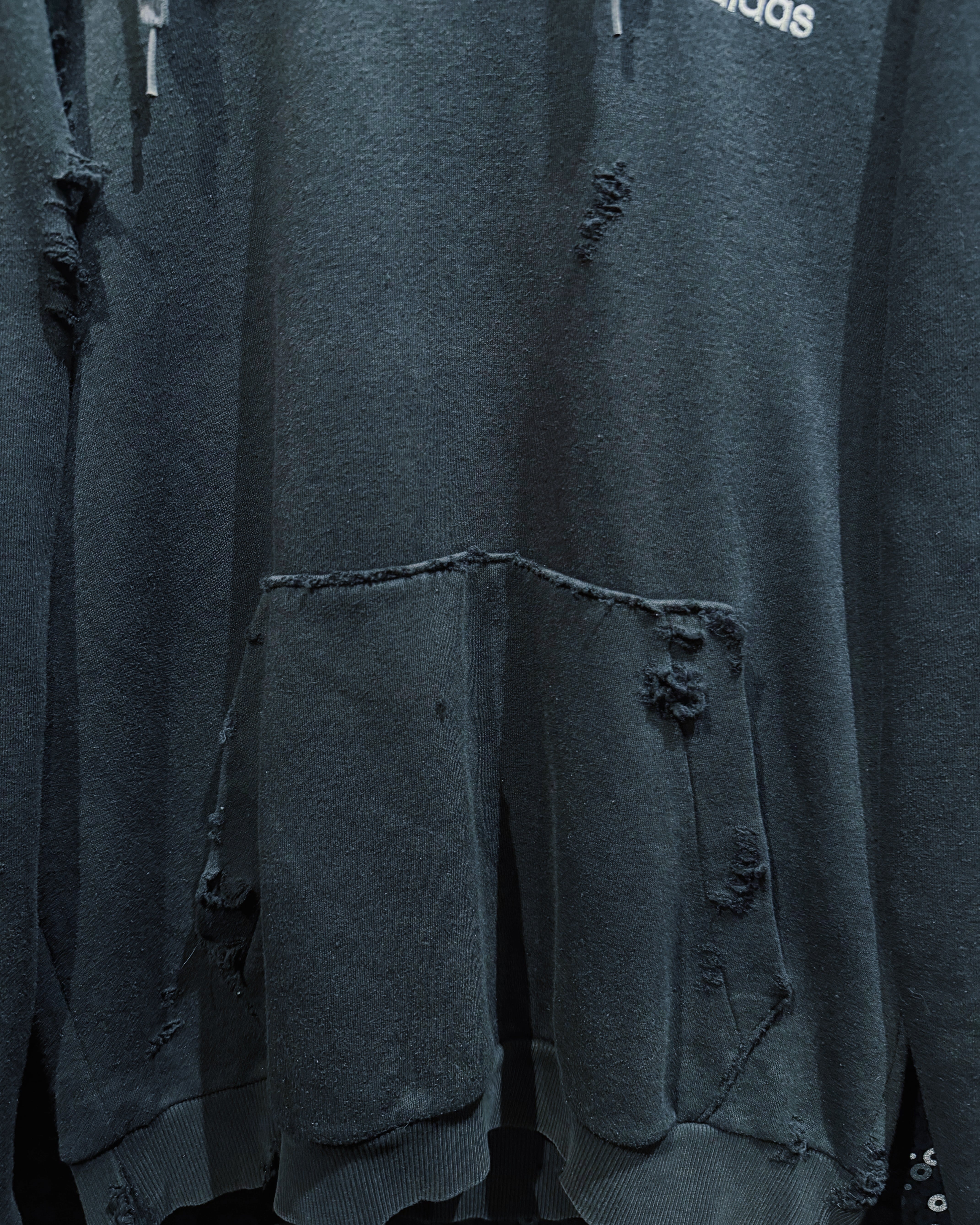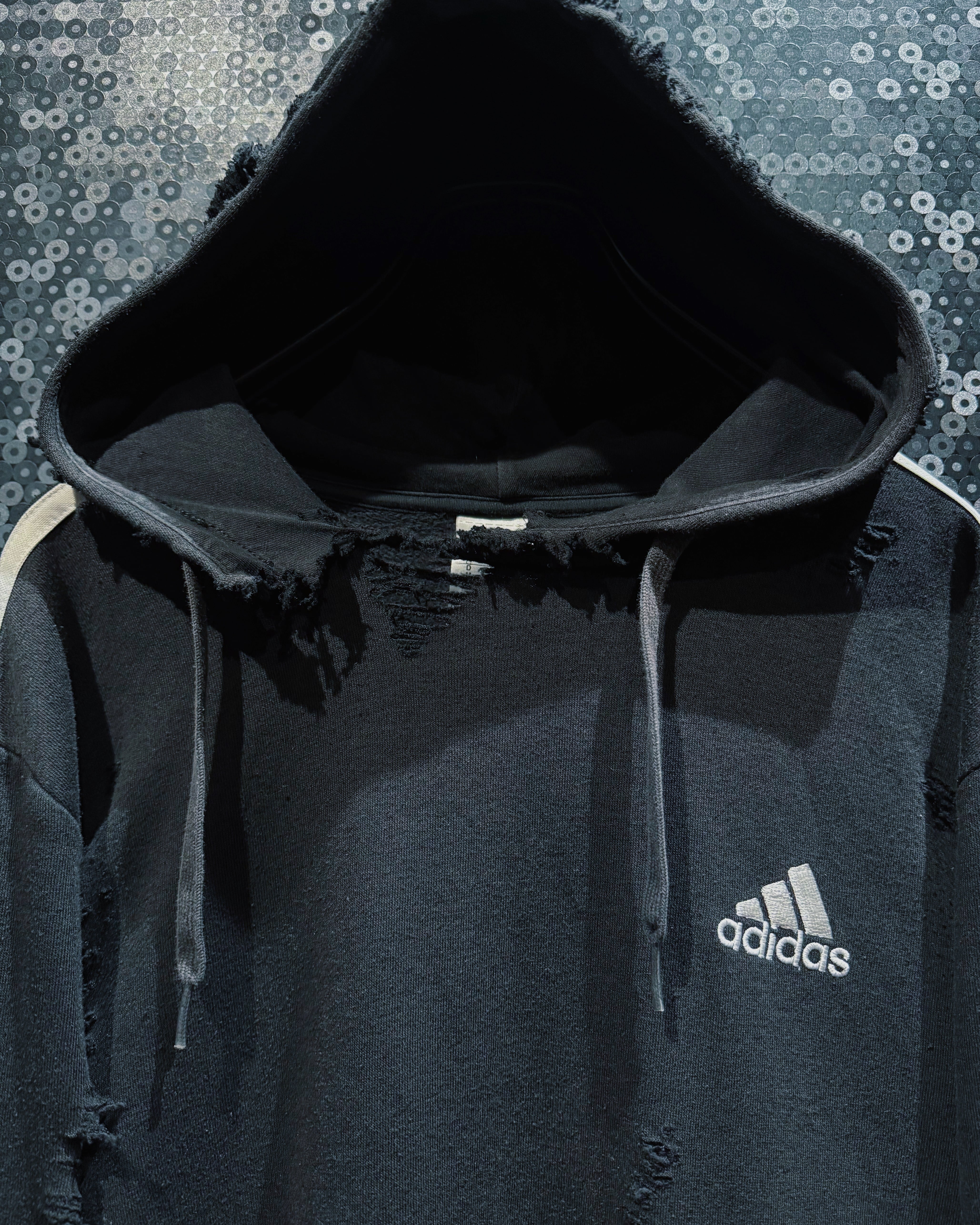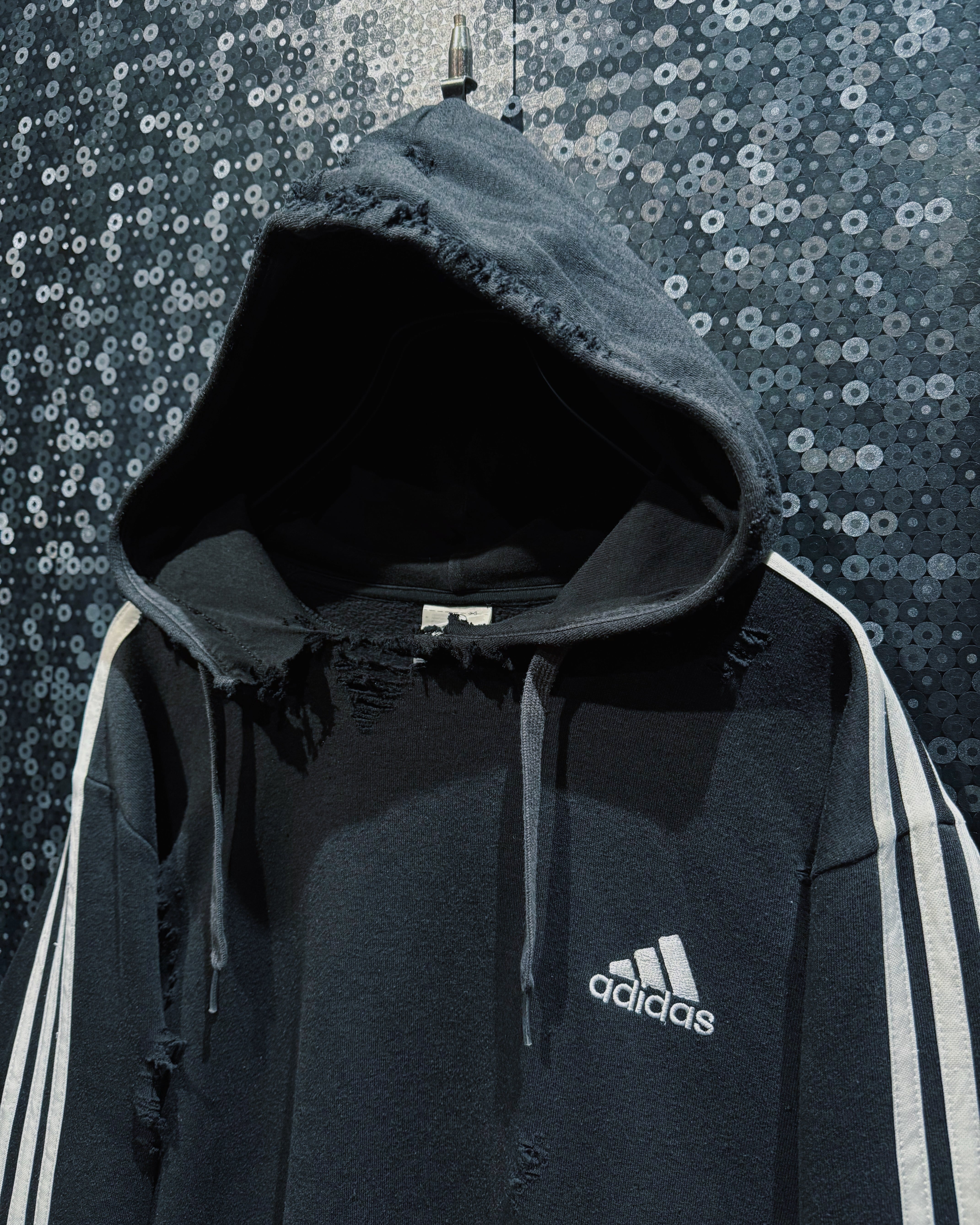 adidasのアイコンであるスリーストライプとブラックボディをキャンバスに、ÆIEMが得意とするボロリメイクを全面に落とし込んだフーディー。