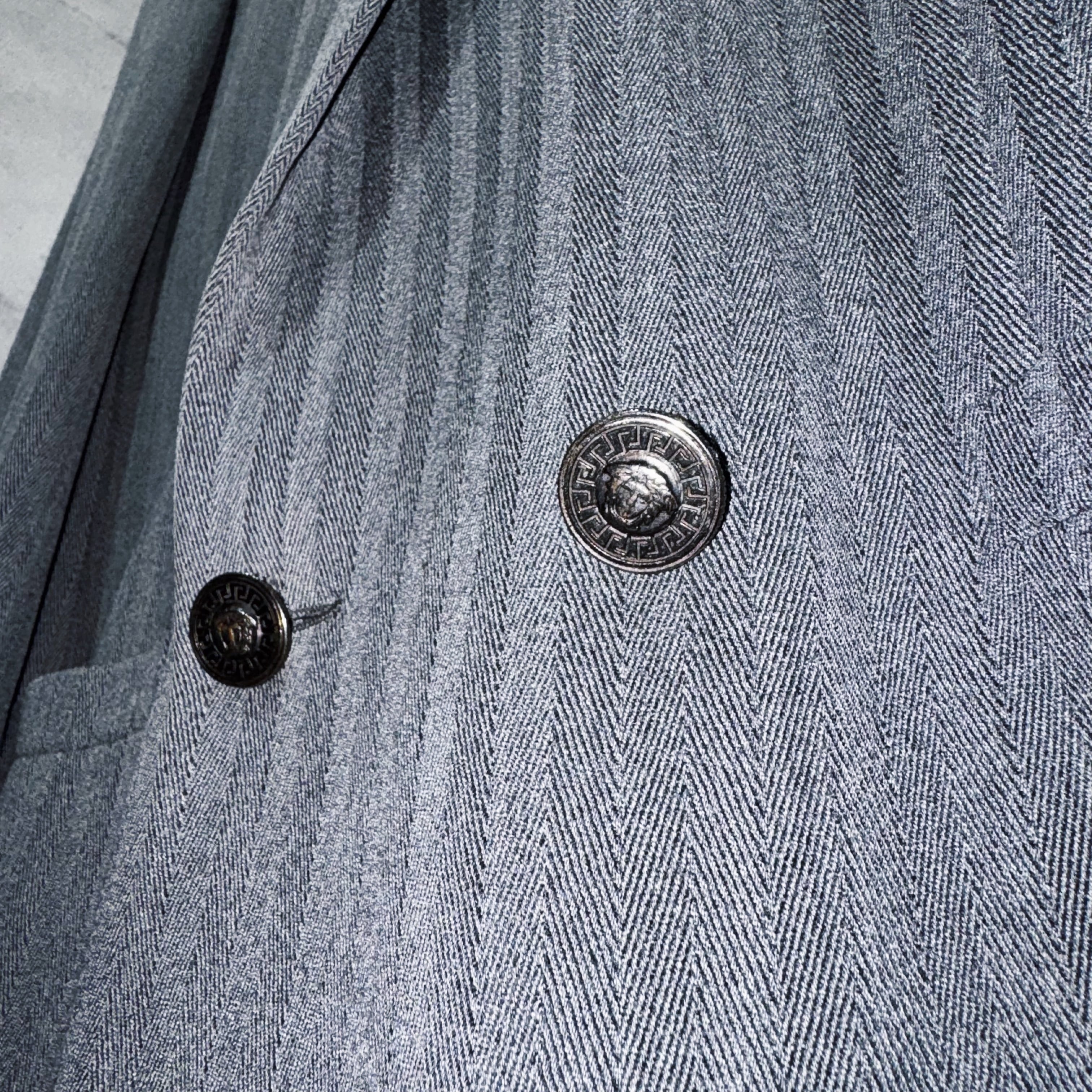 ボタン1つひとつがヴェルサーチの代名詞であるメデューサの刻印が刻まれており、魅力的なディテール。