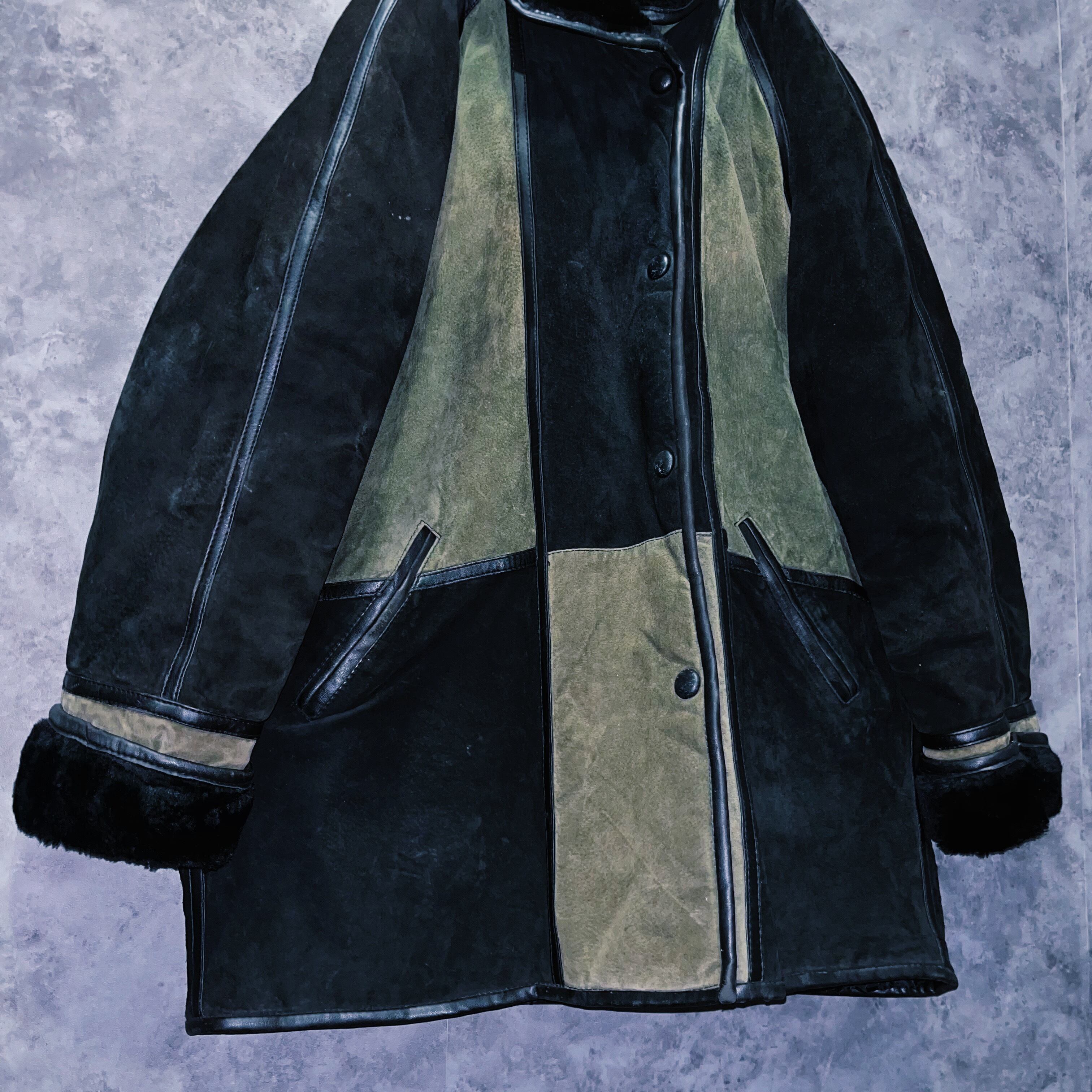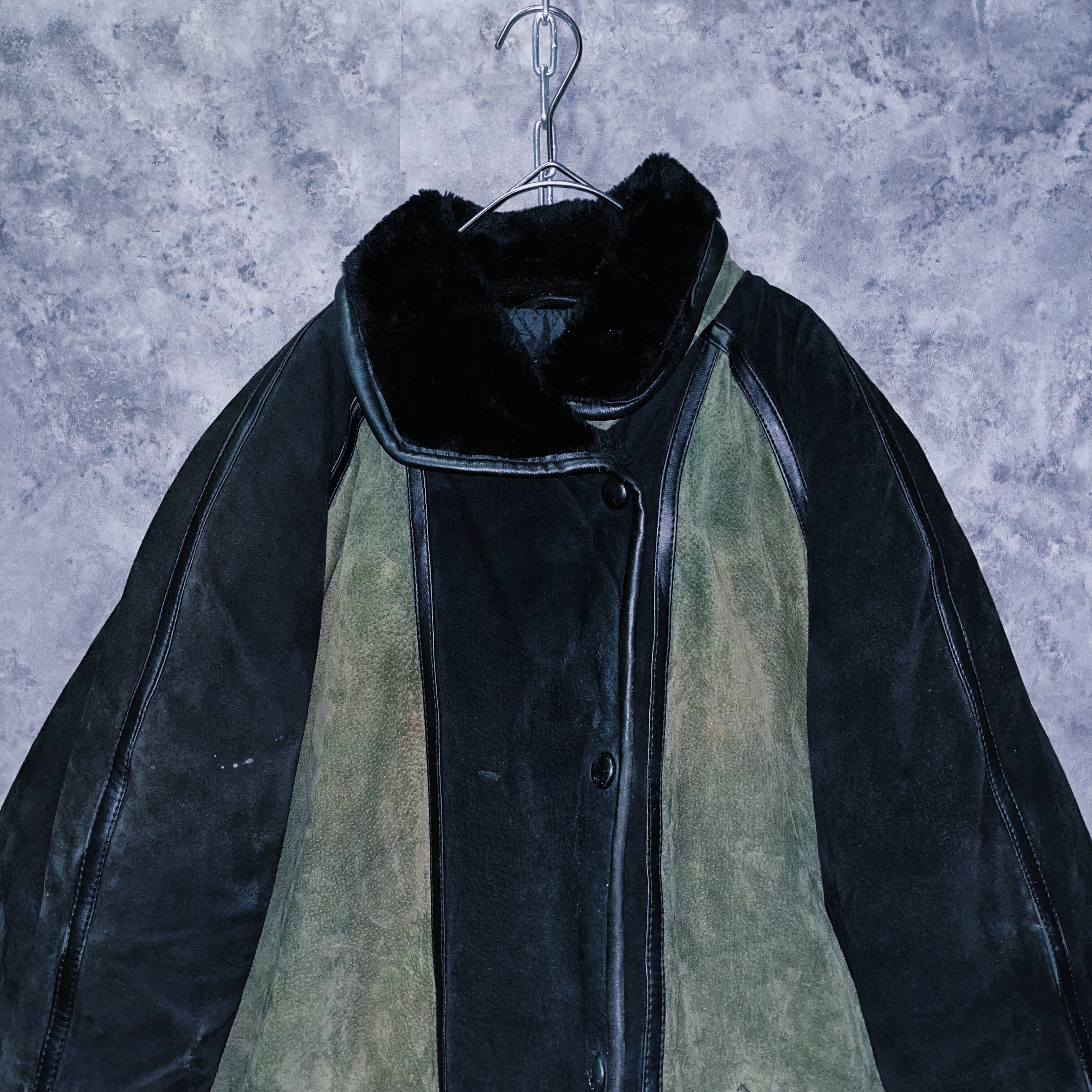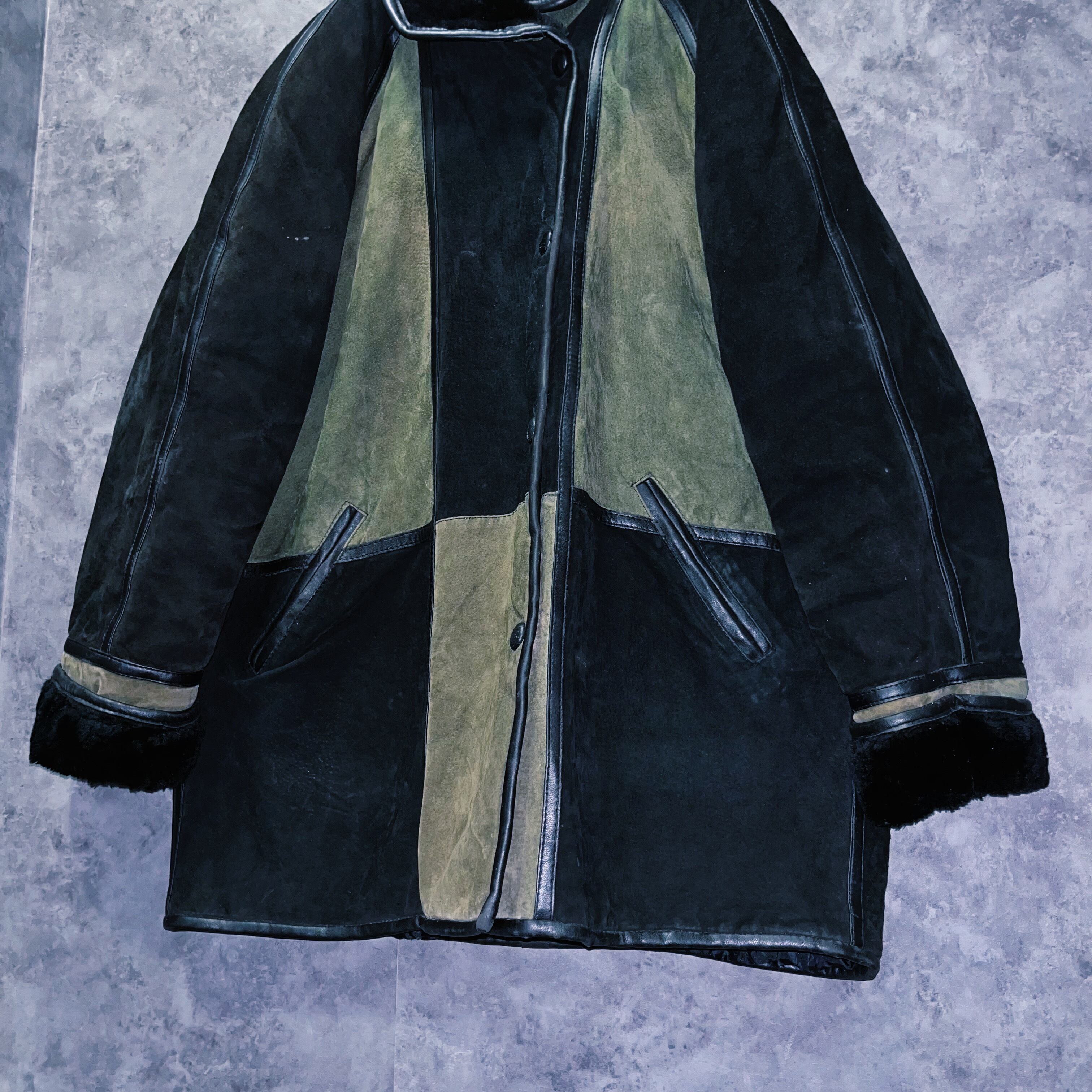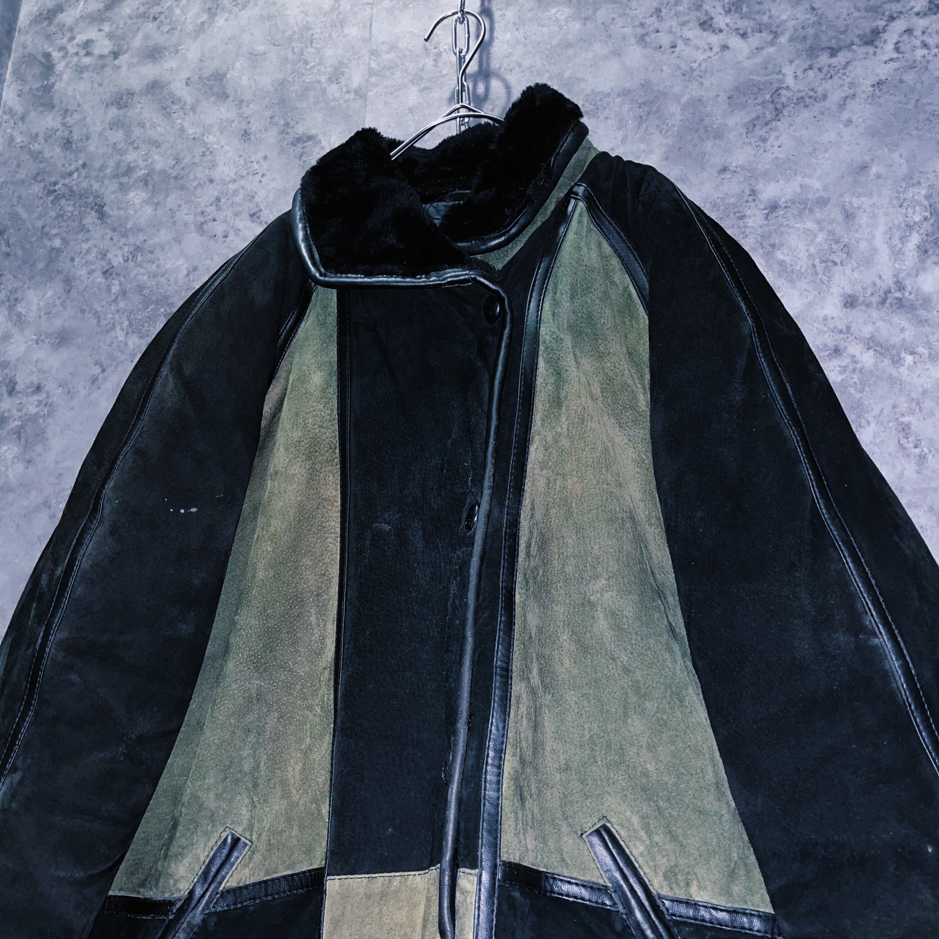 ランプブラックと、セージグリーンのツートンカラーを採用した、スウェードレザージャケット。