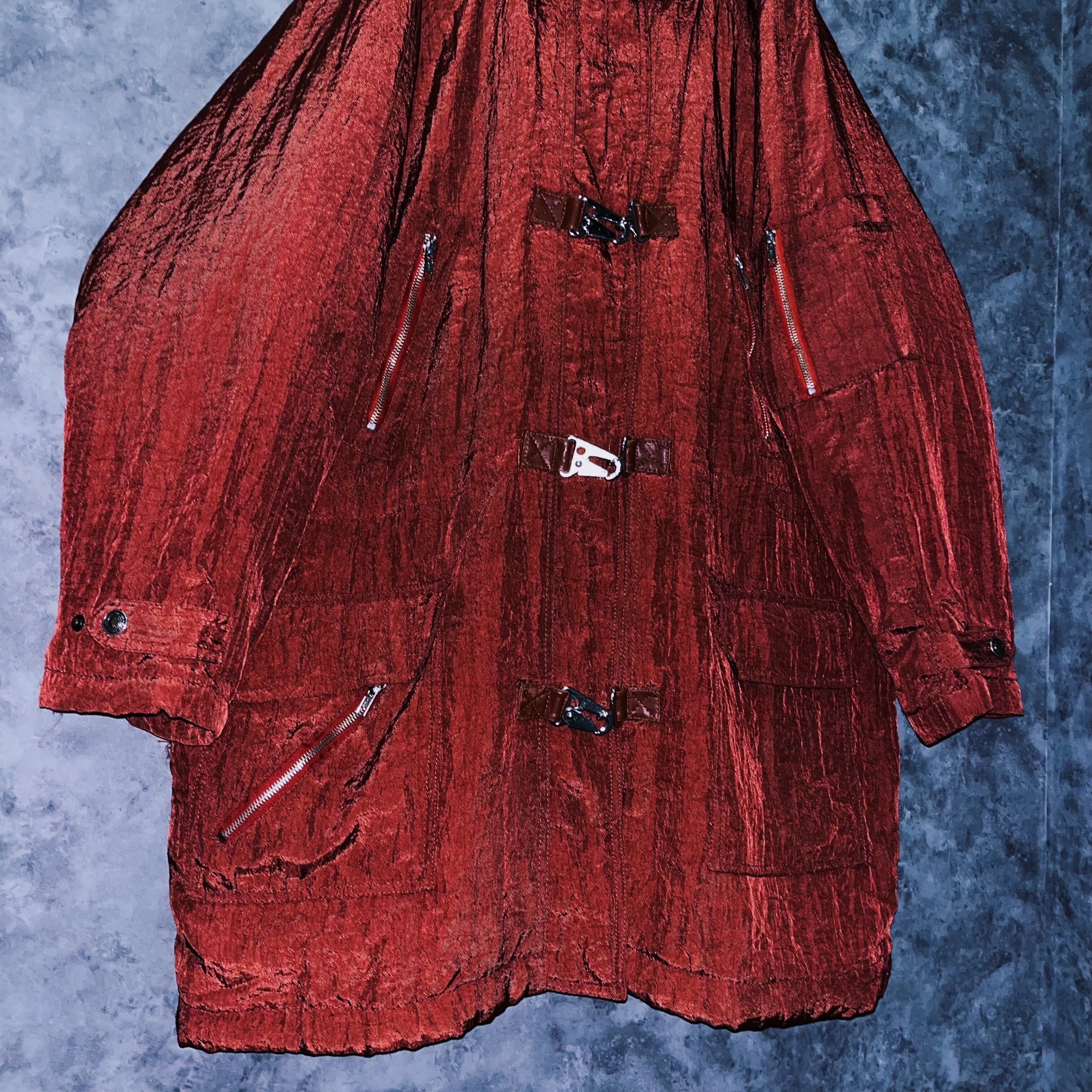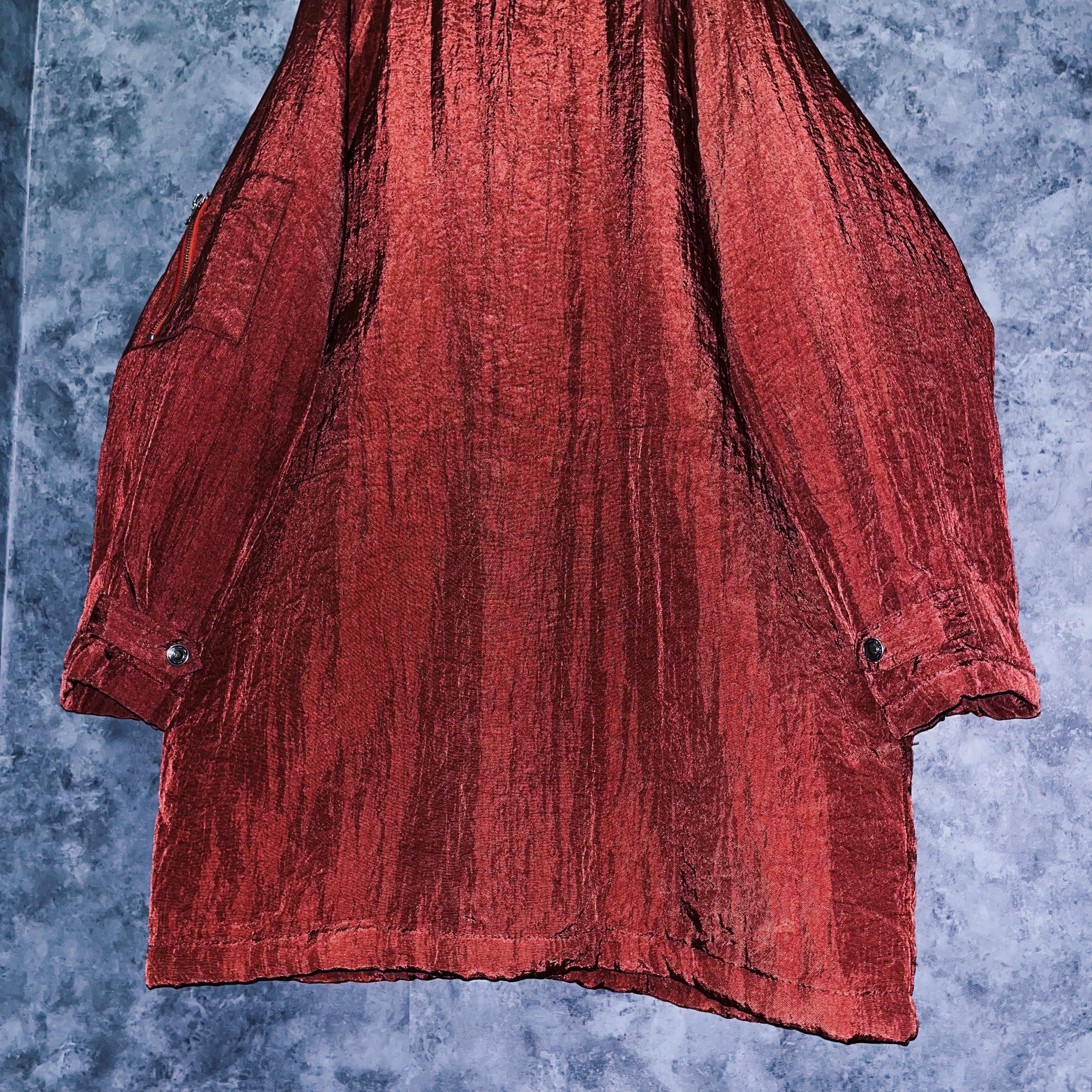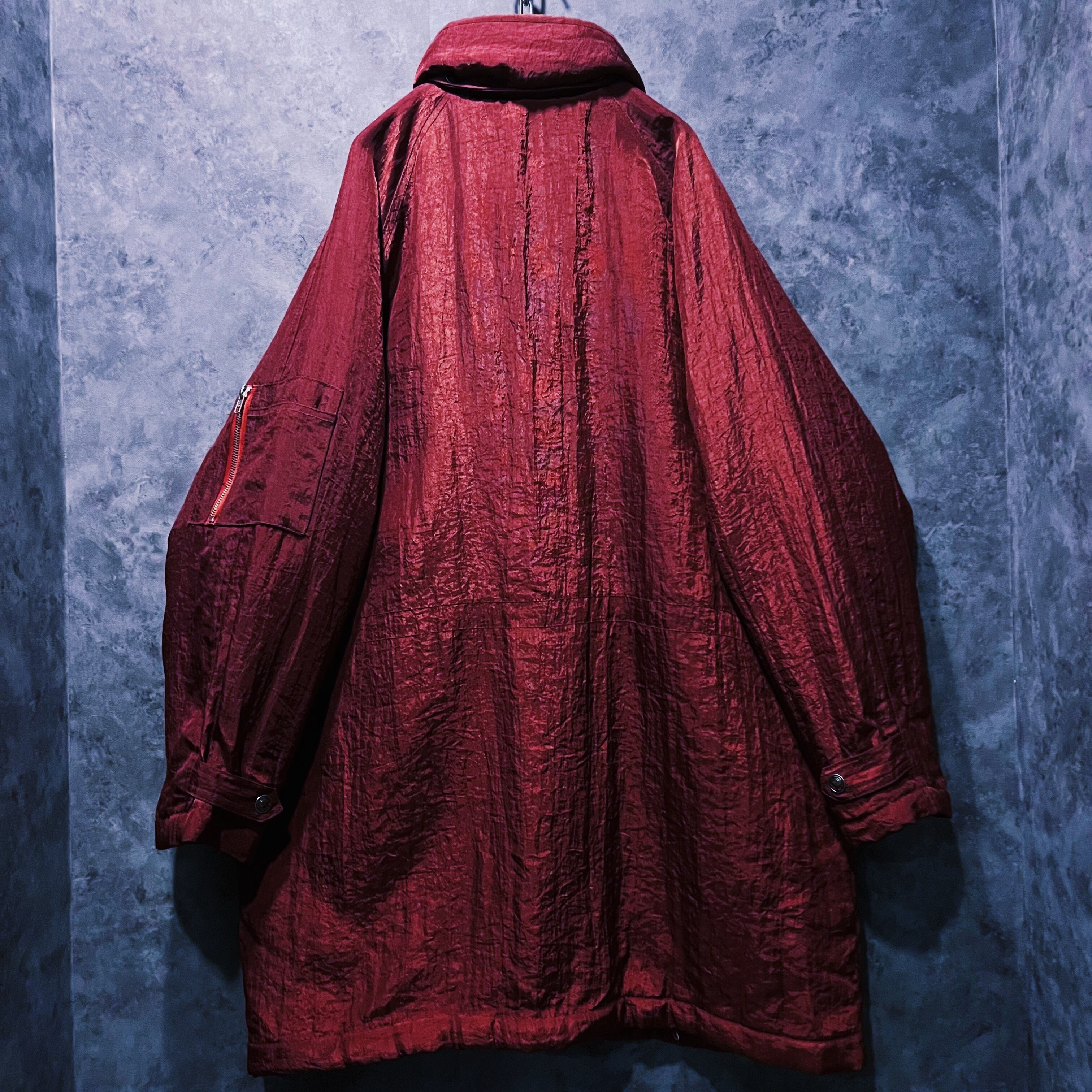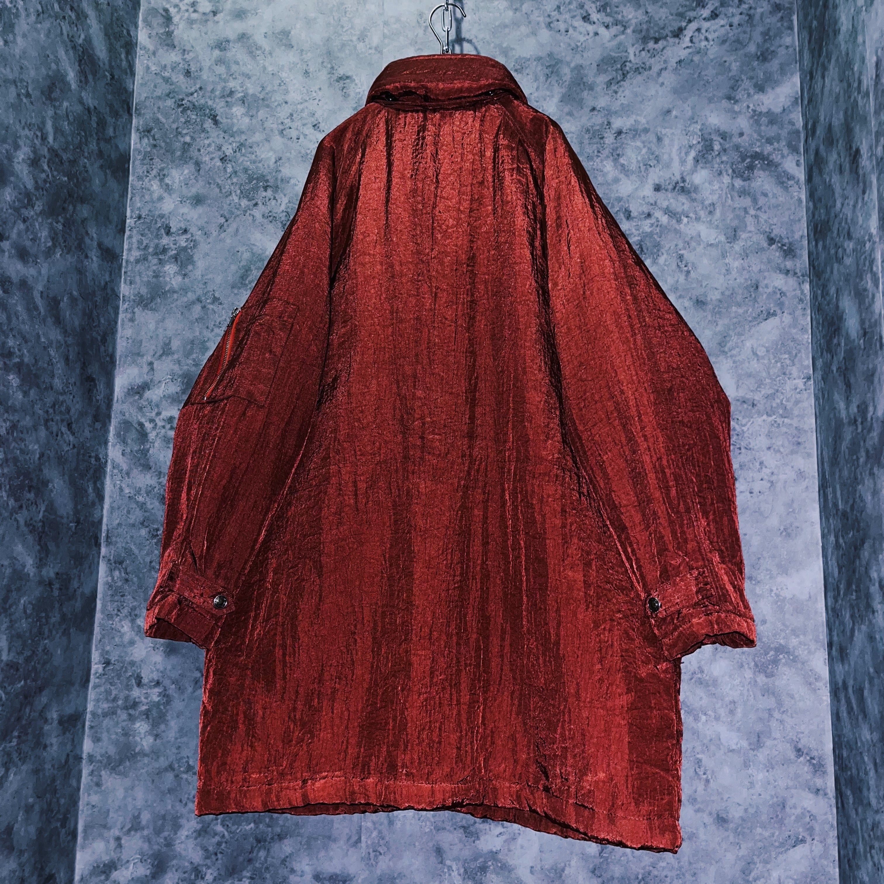 写真からでも伝わってくる光沢に加え、発色のいいボルドーカラーを身に纏い、ナイロン独特のシワを刻んだMA-1ジャケット。今回は丈が長めのミドルジャケットでミリタリーはもちろん、綺麗目に着こなすことができる優れ物。
