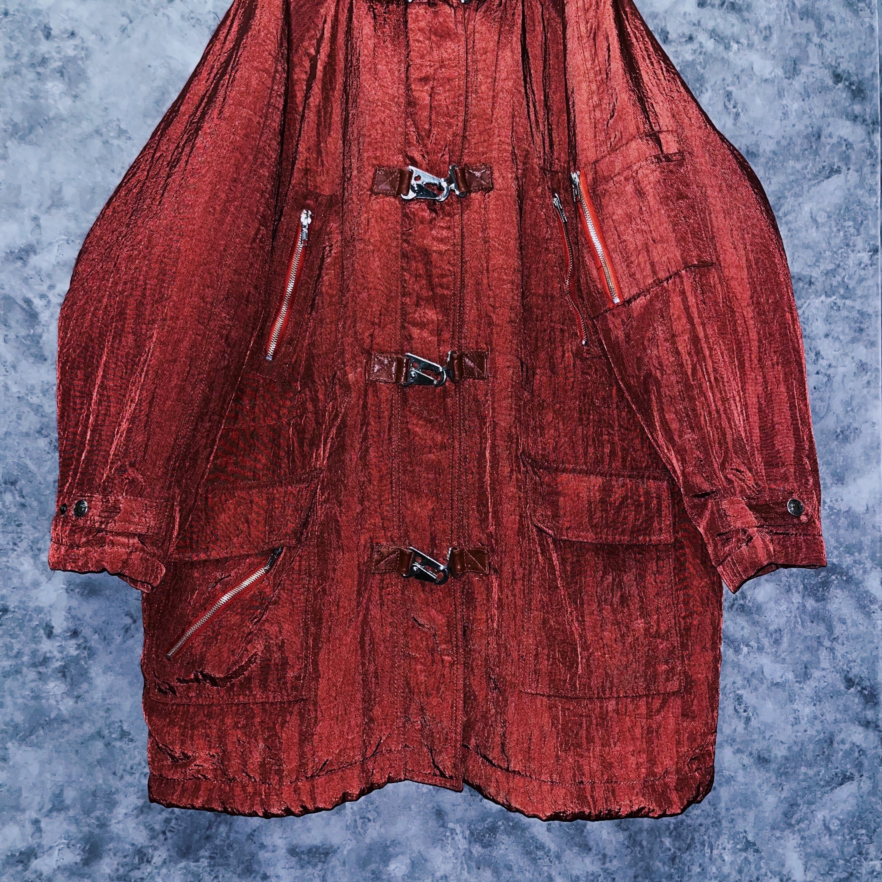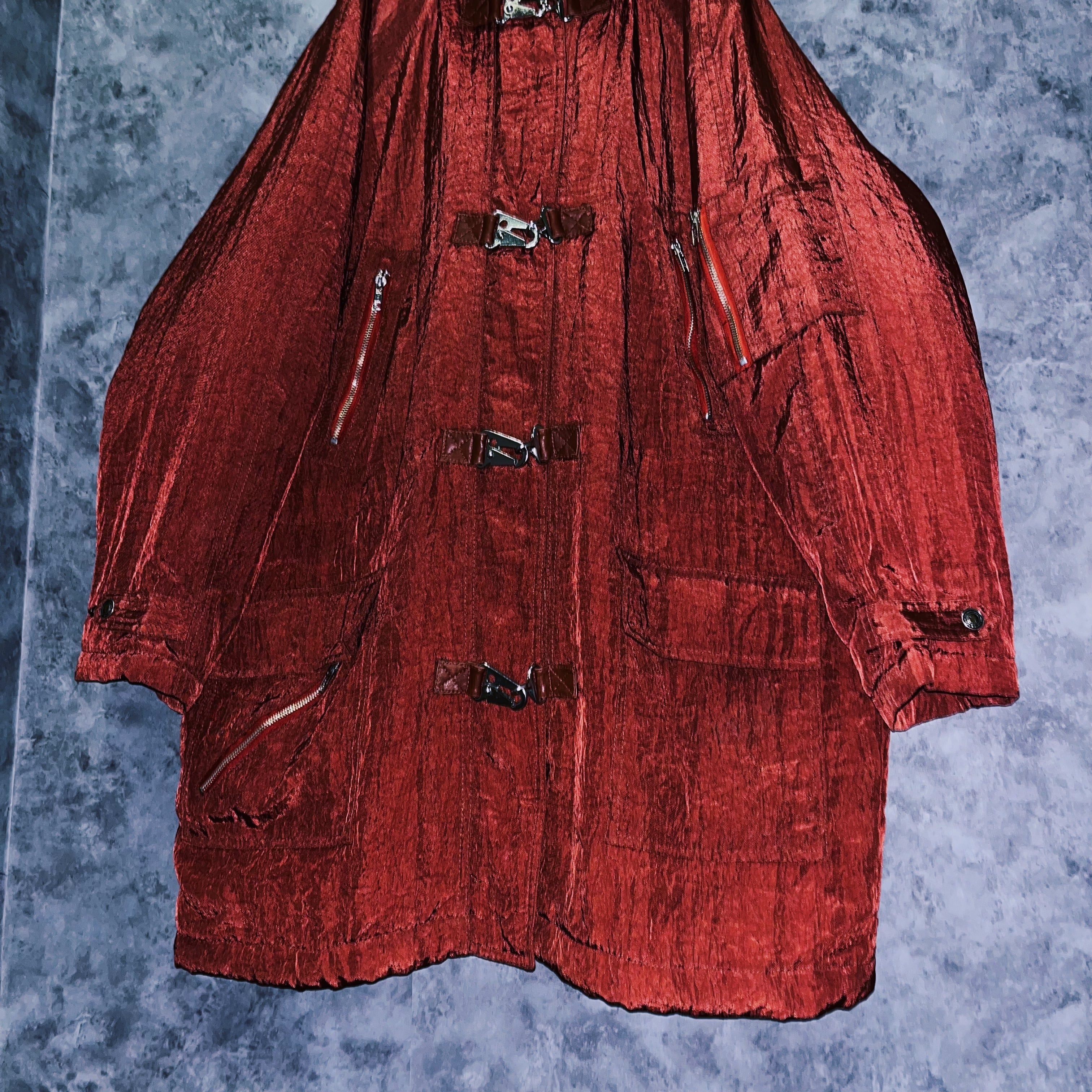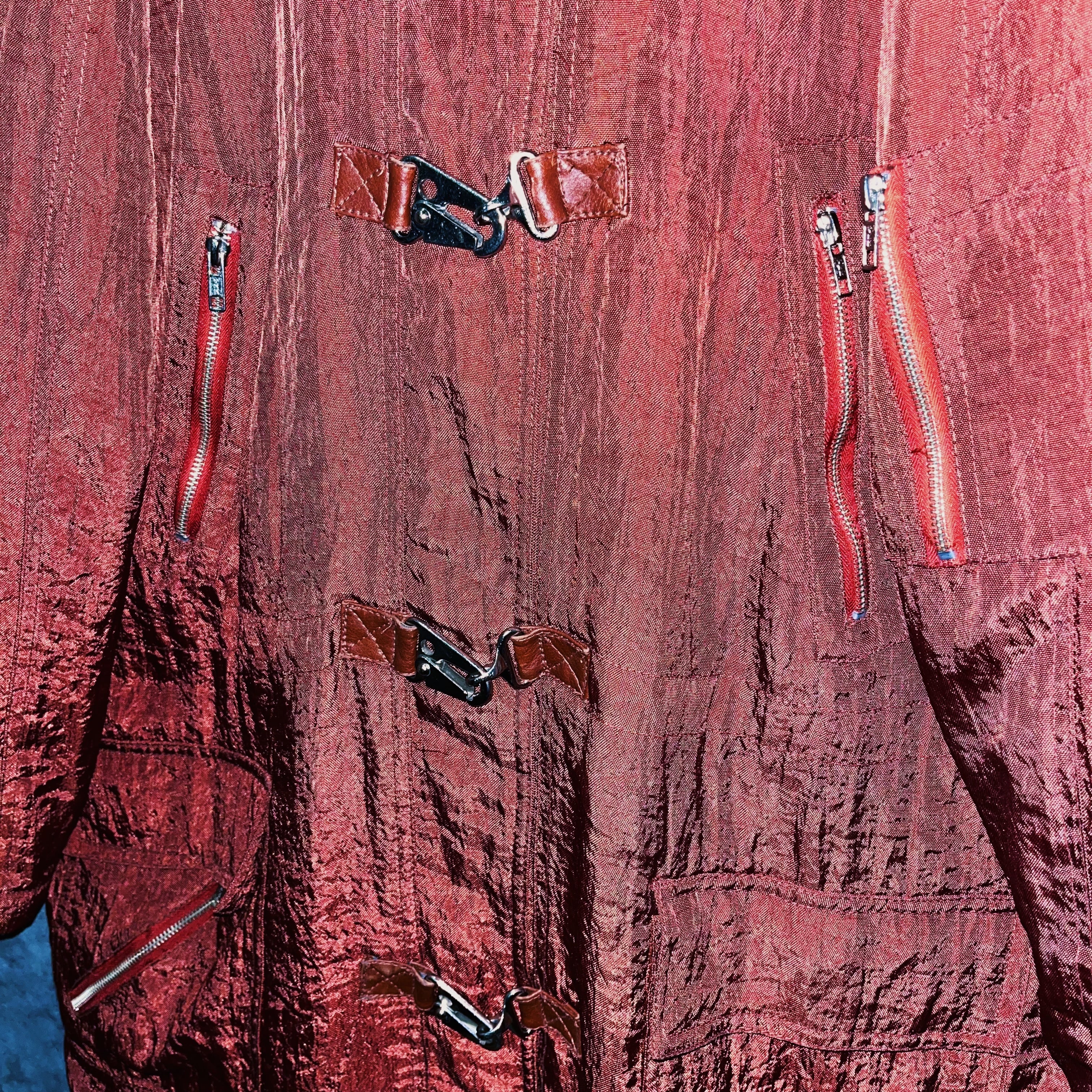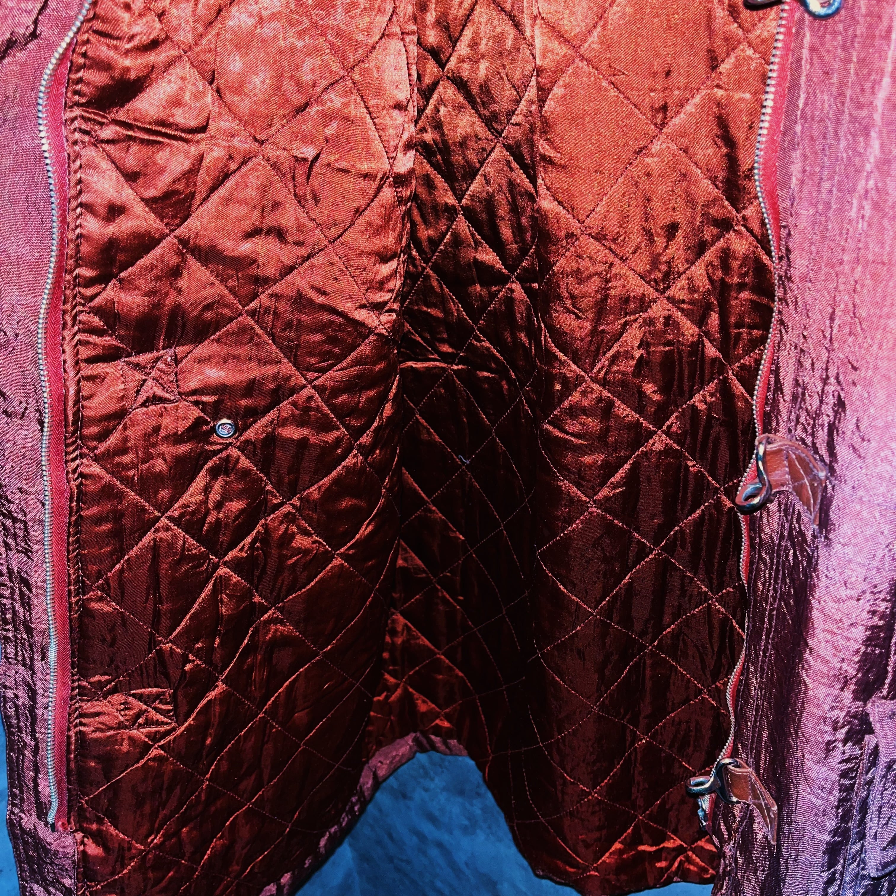 写真からでも伝わってくる光沢に加え、発色のいいボルドーカラーを身に纏い、ナイロン独特のシワを刻んだMA-1ジャケット。今回は丈が長めのミドルジャケットでミリタリーはもちろん、綺麗目に着こなすことができる優れ物。