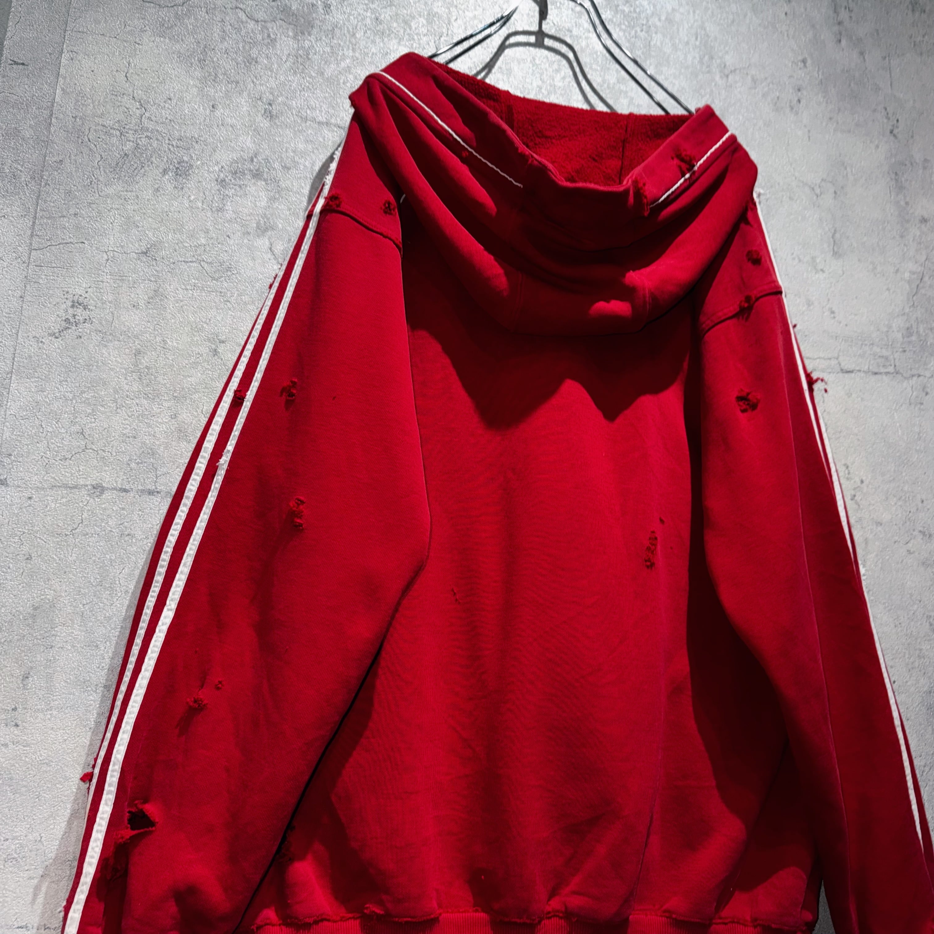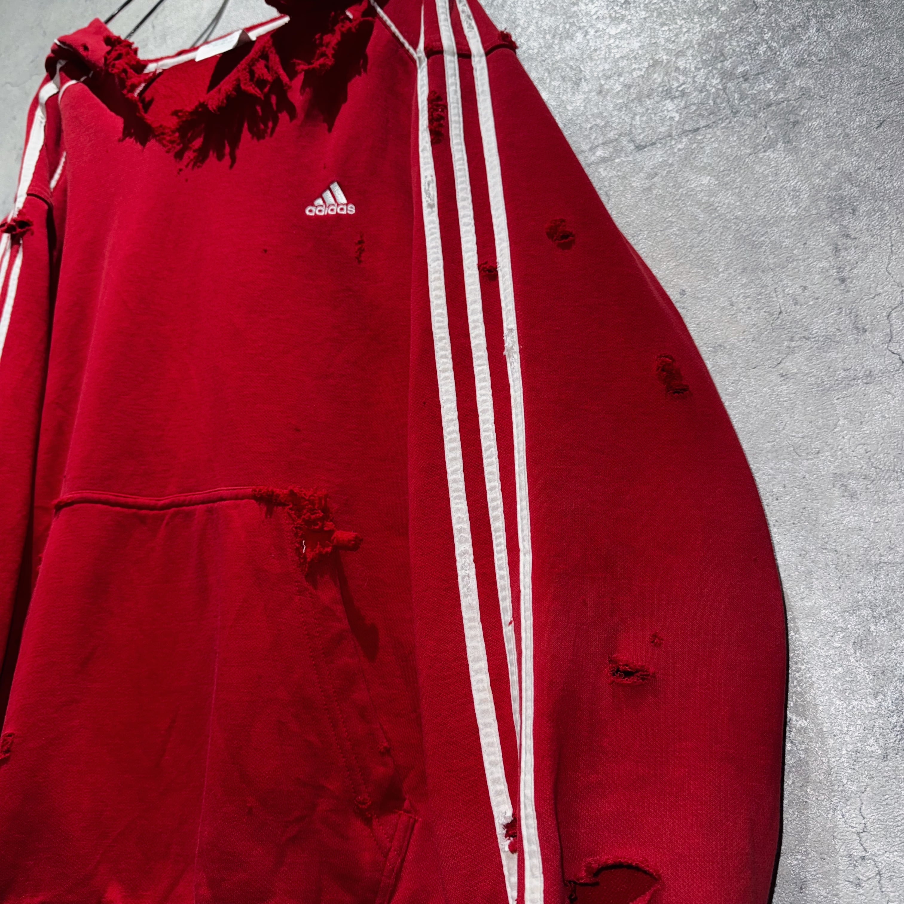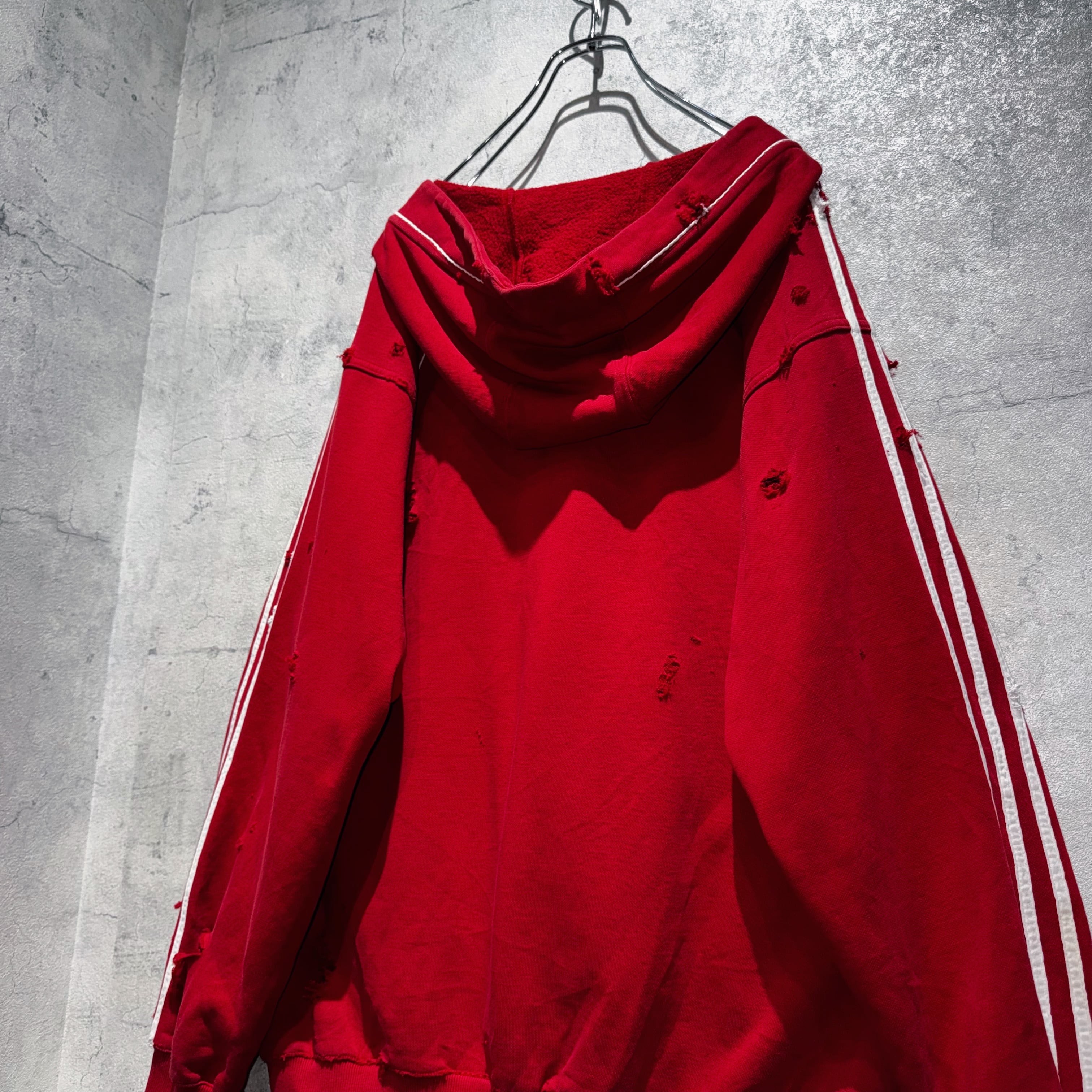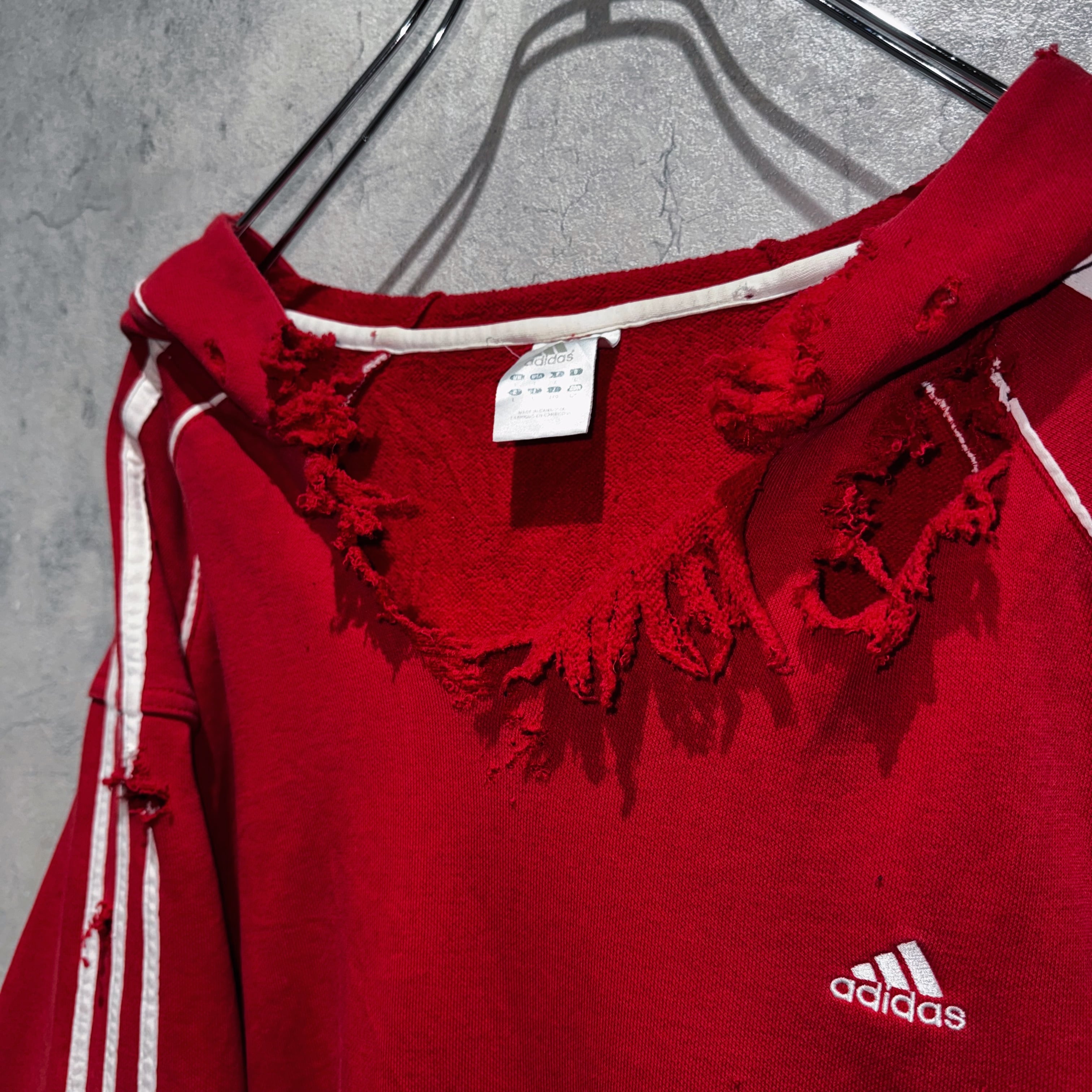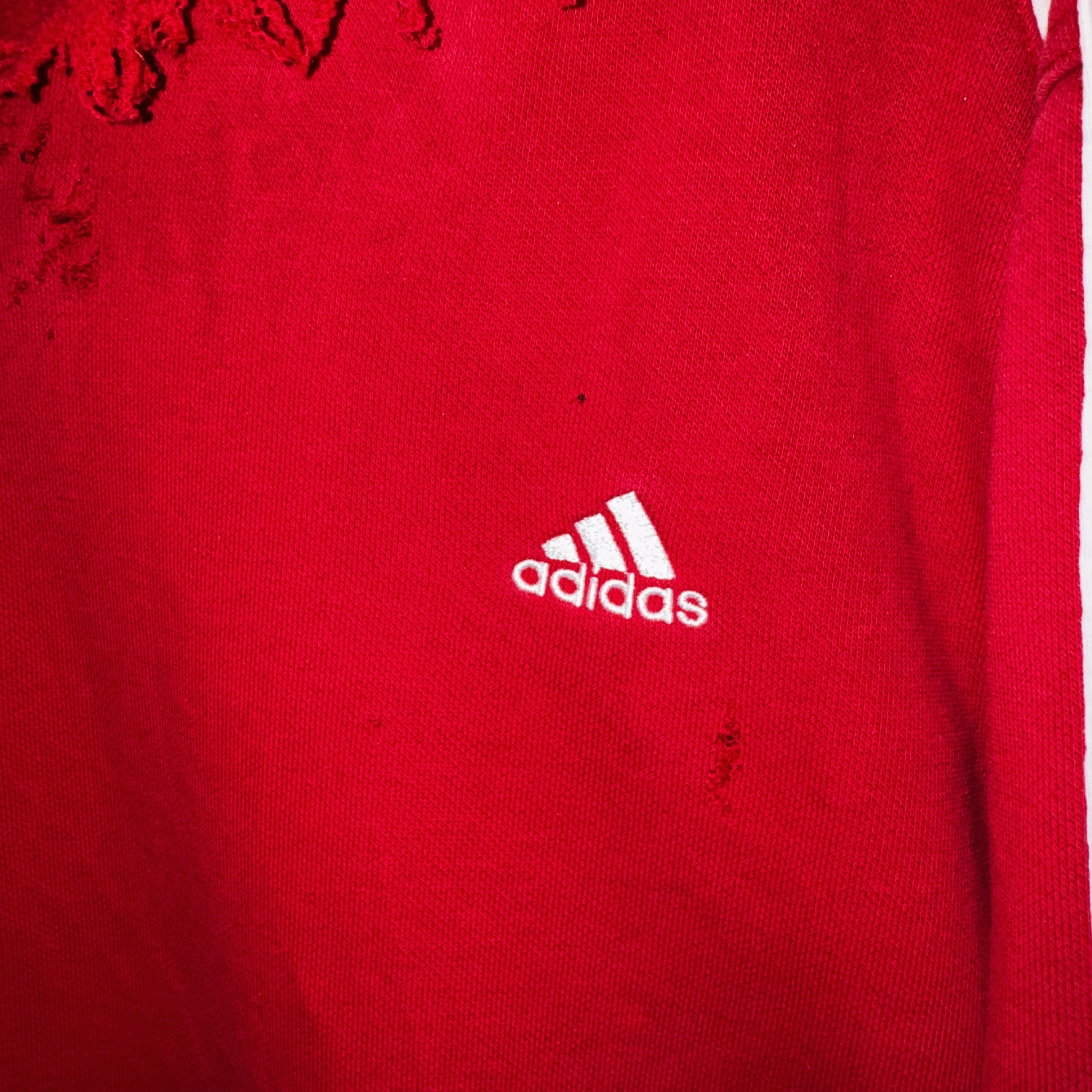 当店十八番のボロリメイクの中でもかなり人気の高い"ADIDAS"を贅沢にボロカスタムした一枚。”ADIDAS”の代名詞でもあるパフォーマンスロゴをフロントに、3ストライプスを袖に、クリムゾンレッドのカラーも素晴らしくボディも一級品。