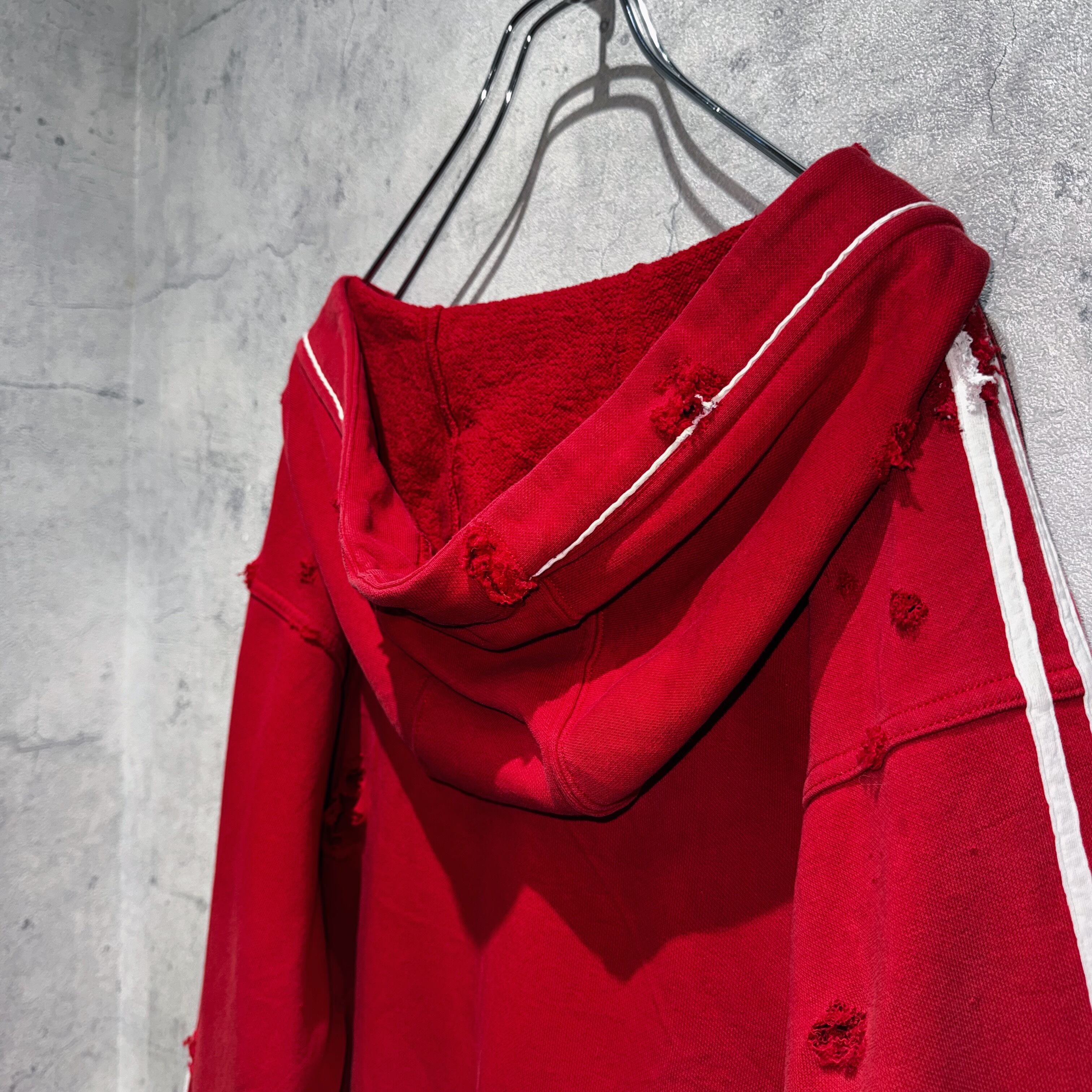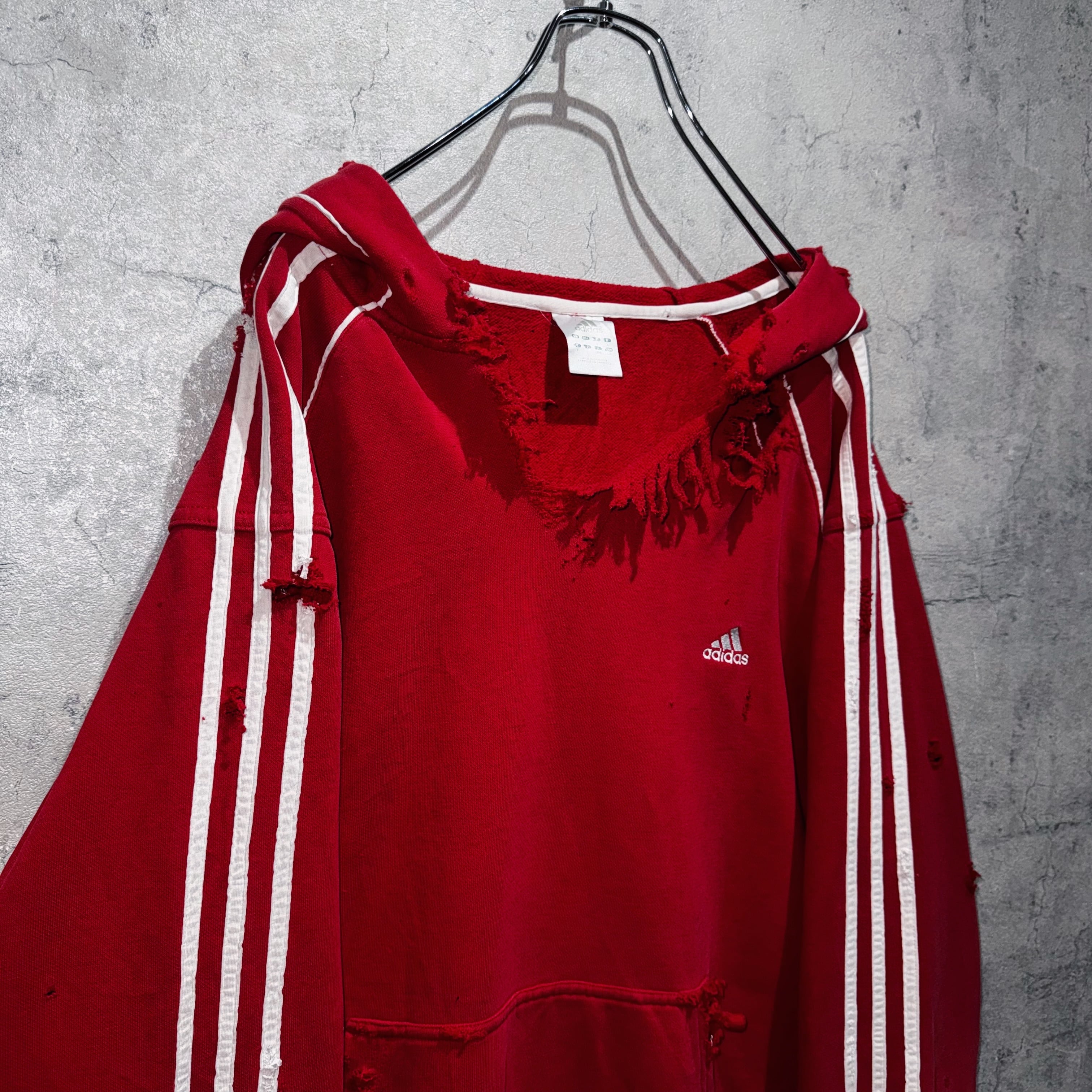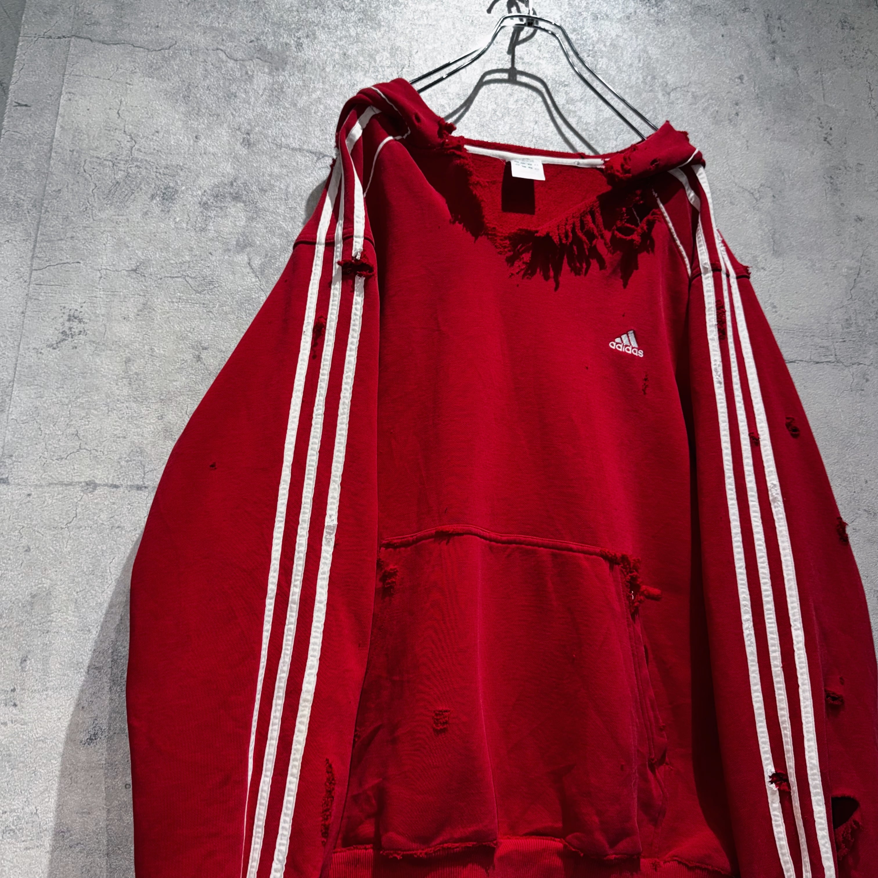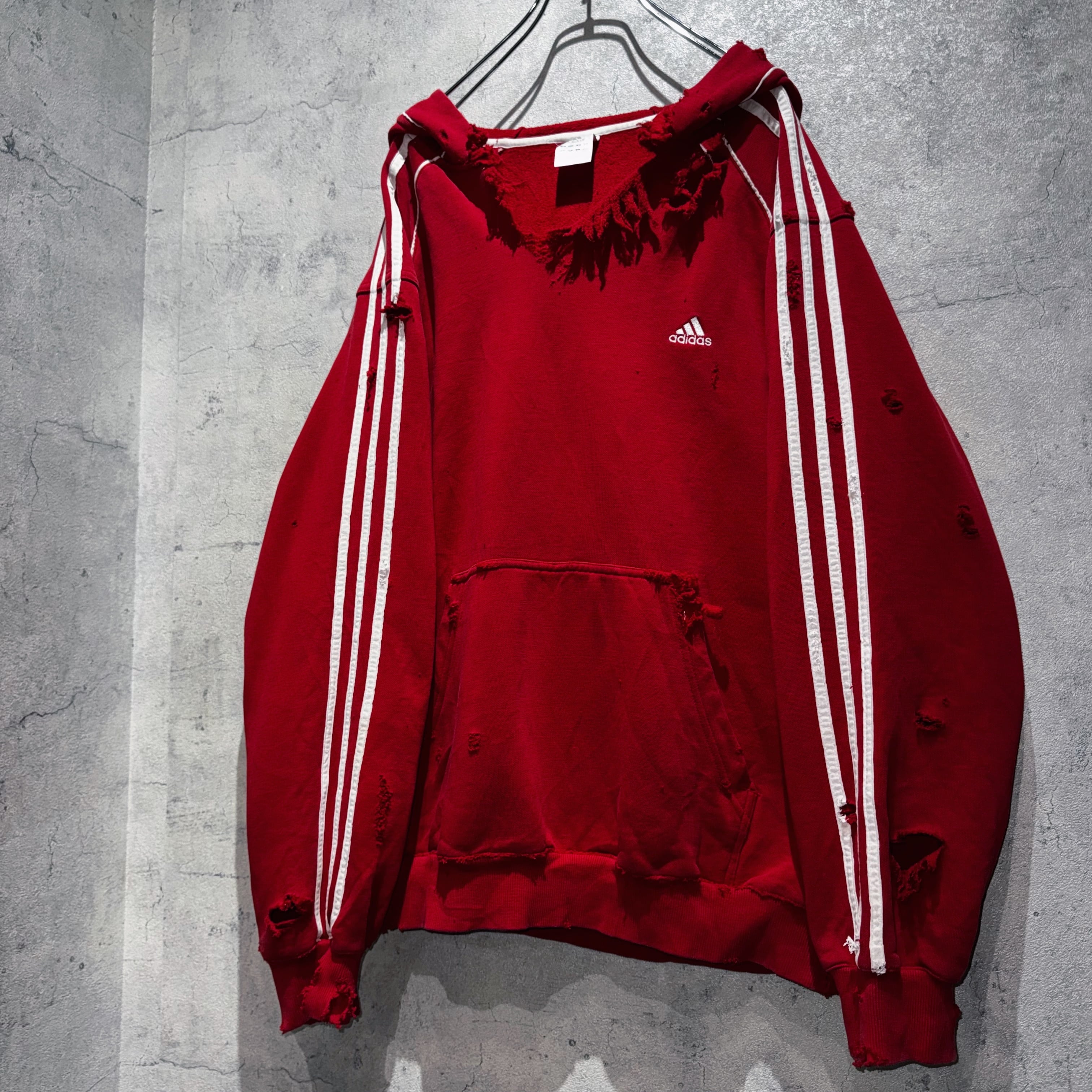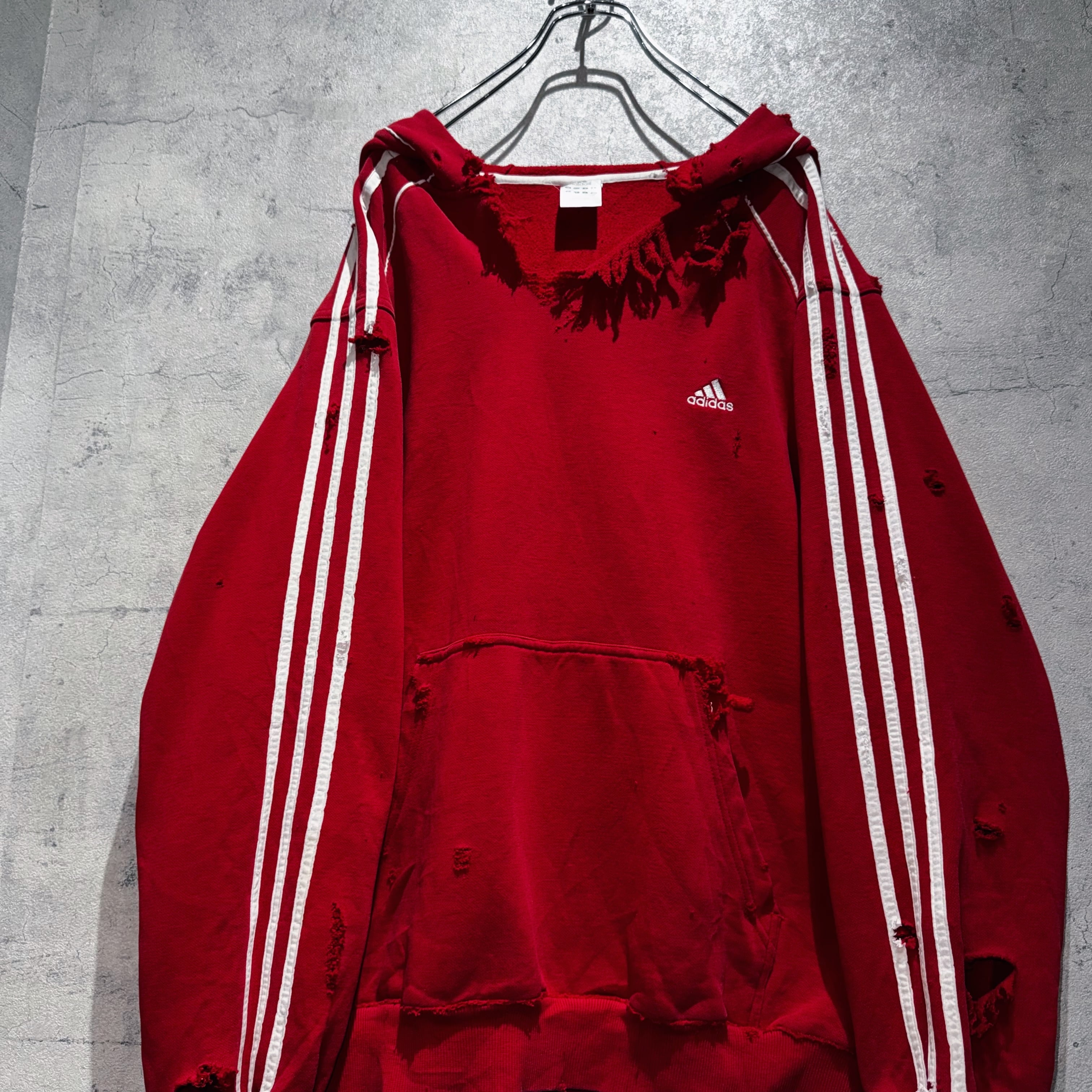 当店十八番のボロリメイクの中でもかなり人気の高い"ADIDAS"を贅沢にボロカスタムした一枚。”ADIDAS”の代名詞でもあるパフォーマンスロゴをフロントに、3ストライプスを袖に、クリムゾンレッドのカラーも素晴らしくボディも一級品。