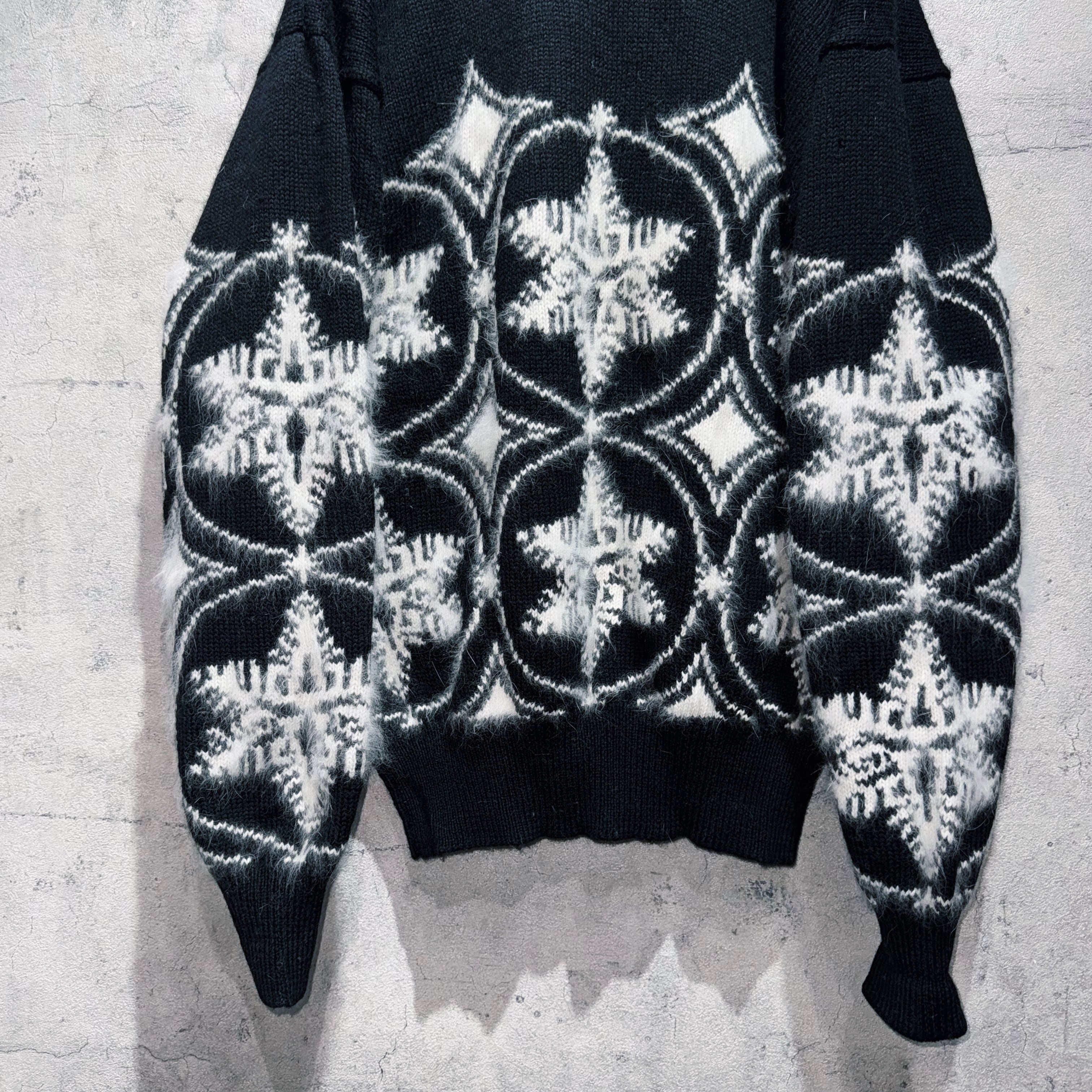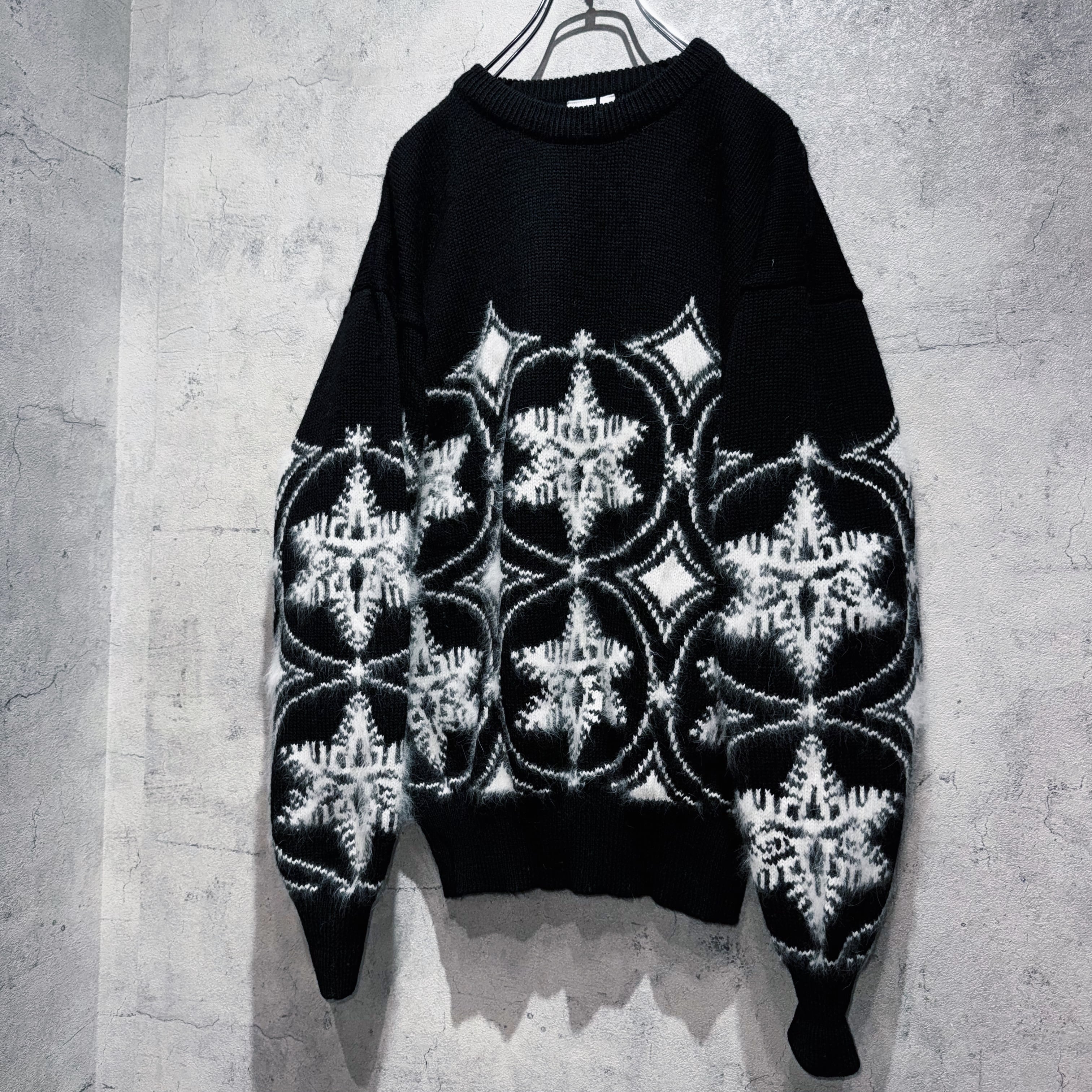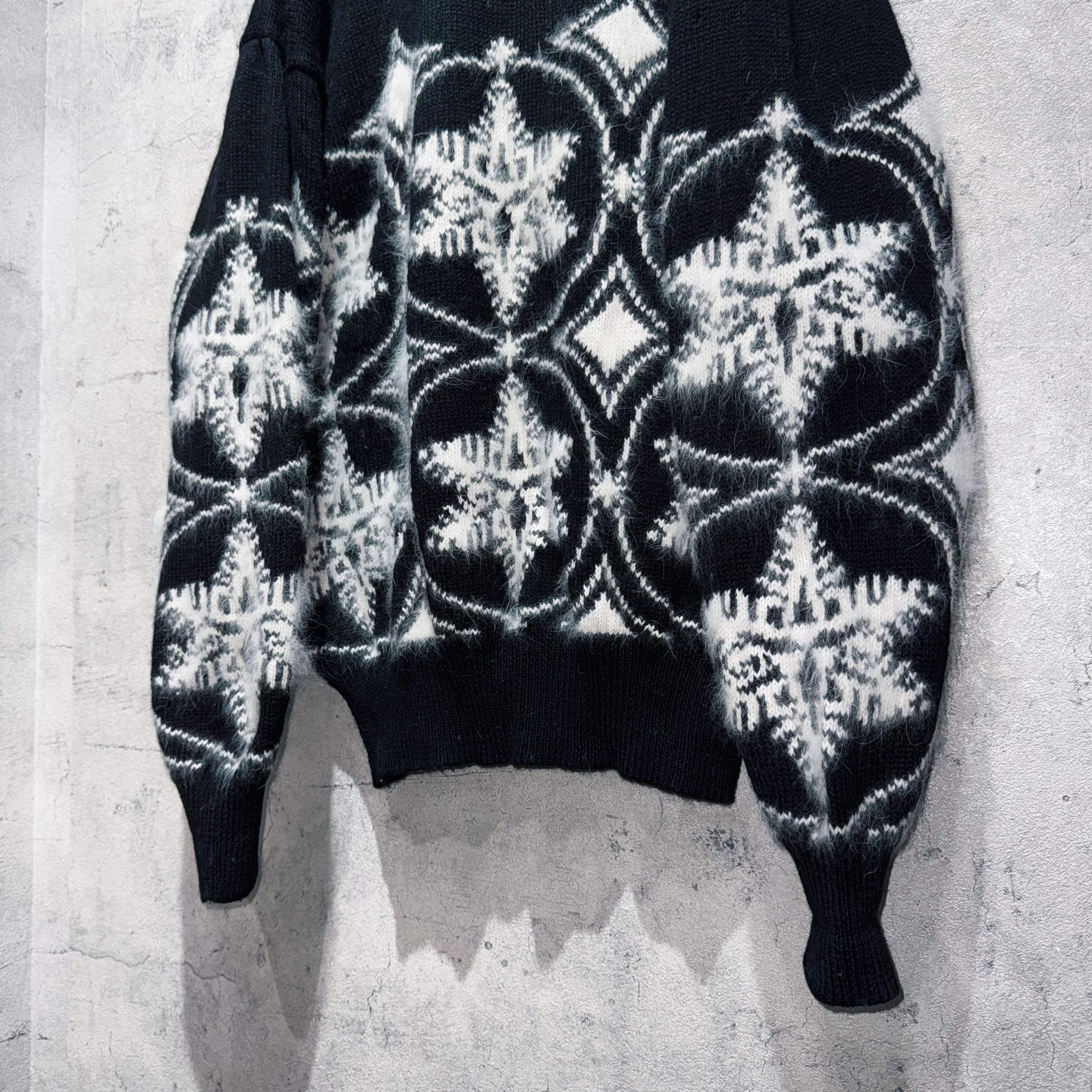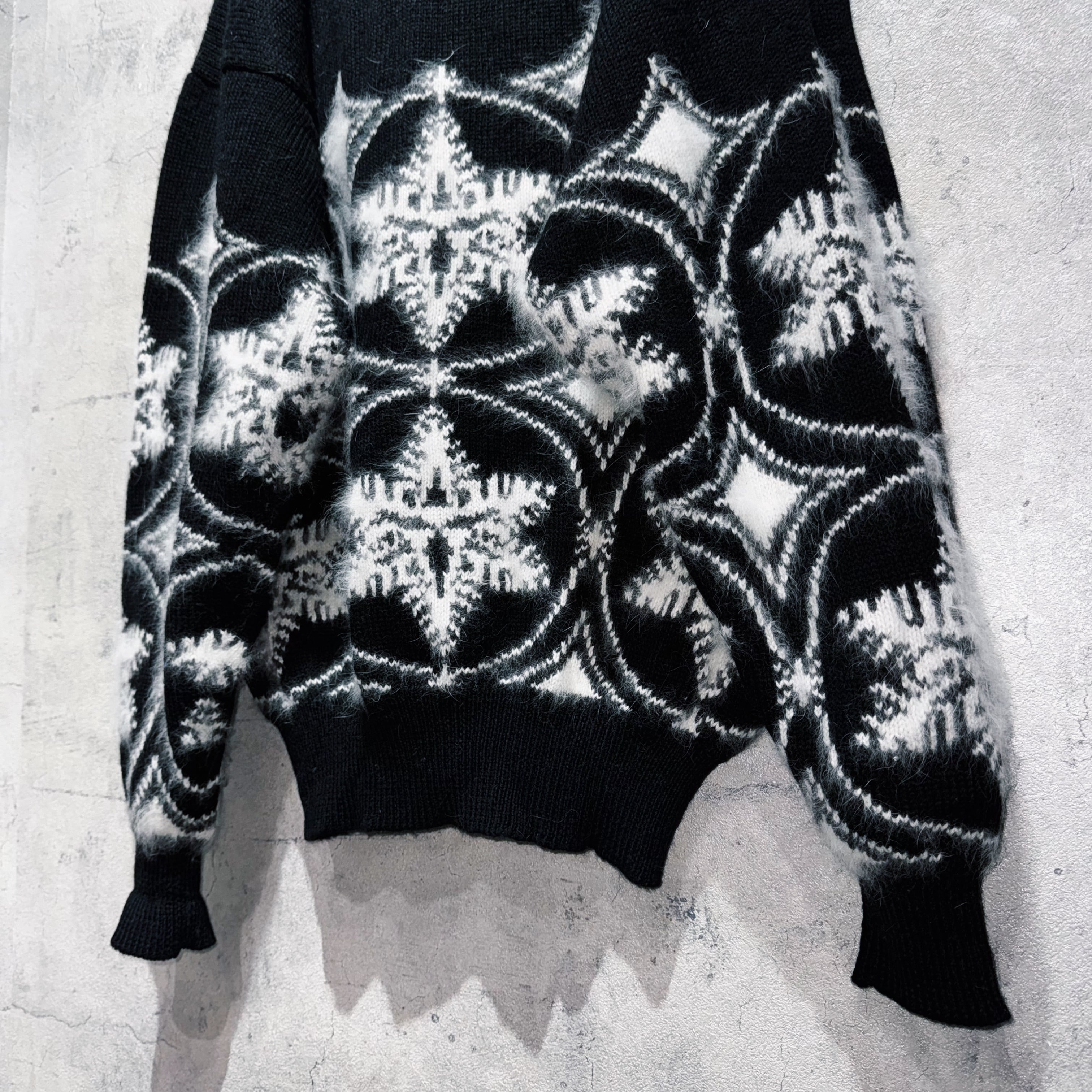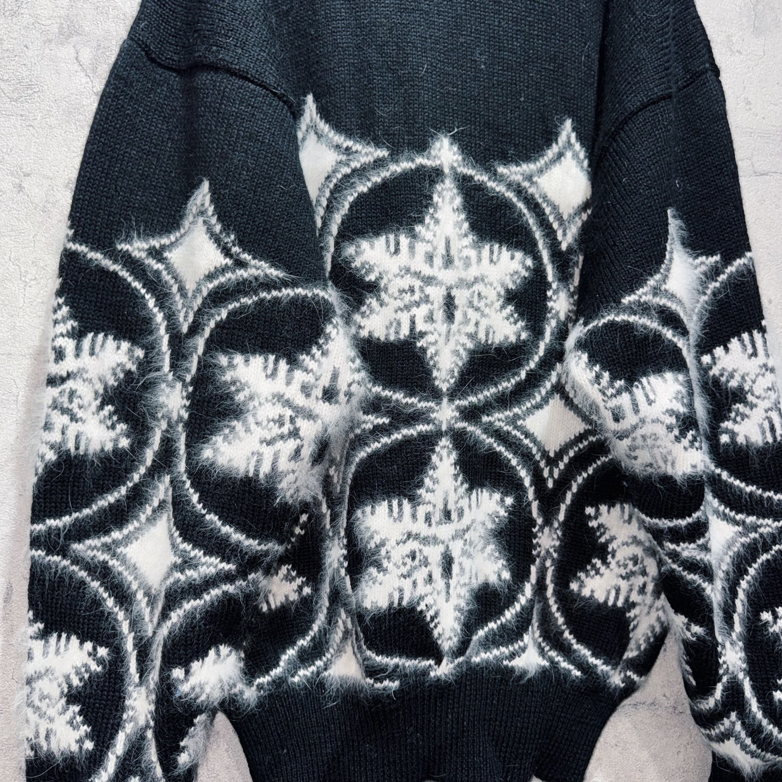 ブラックのボディに雪の結晶模様を載せ、ノルディック柄のようなエスニックパターンで仕上げたプルオーバーニット。モノトーンで構成することで貴賓のある佇まいに。