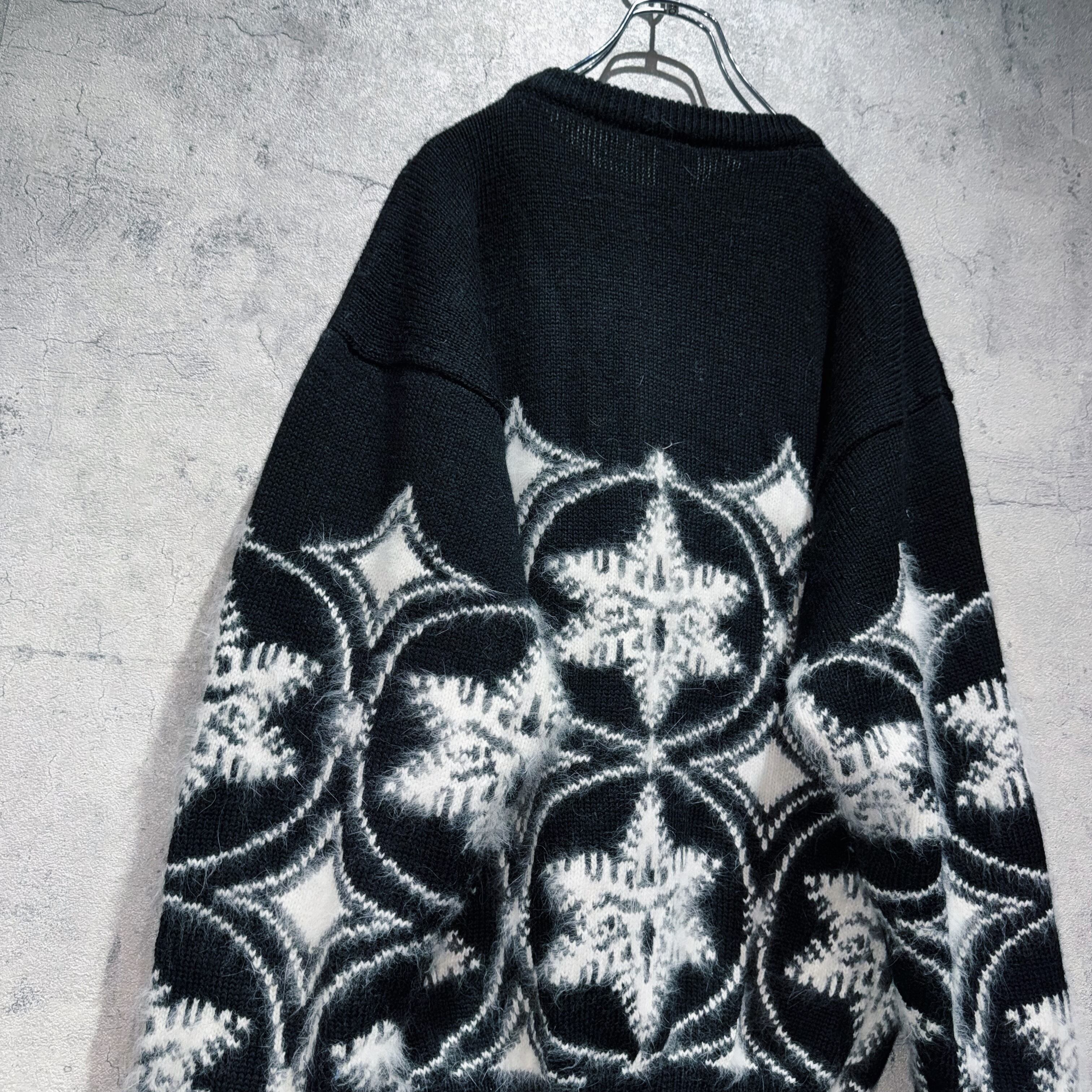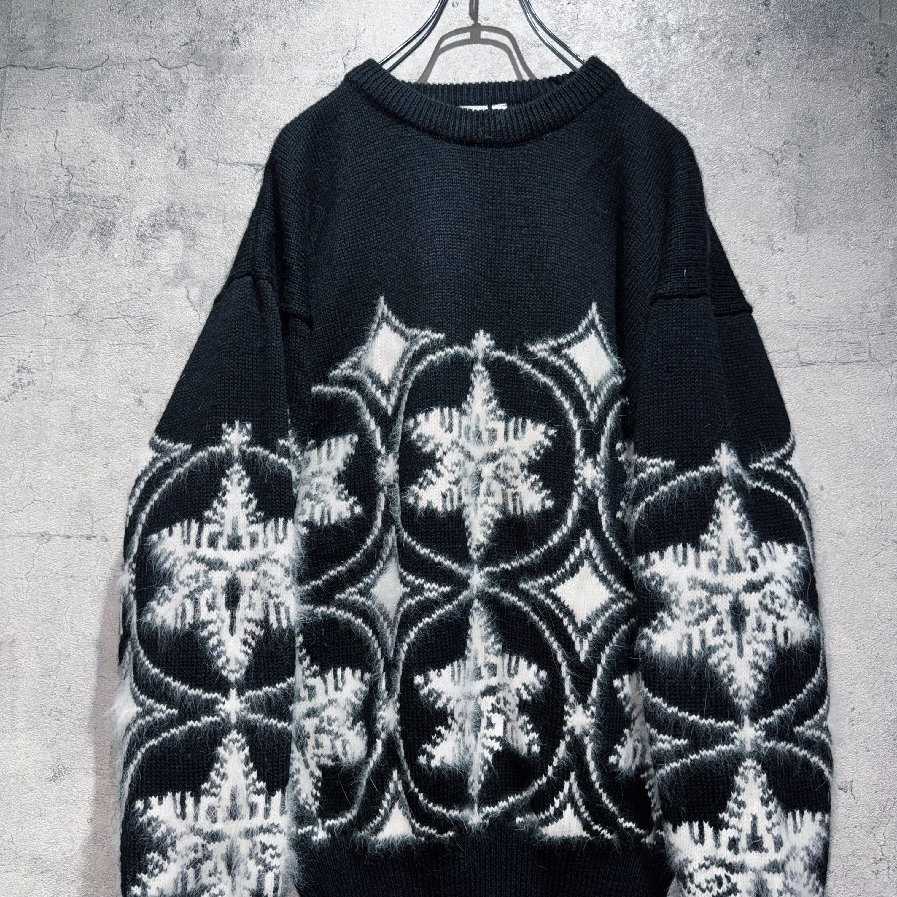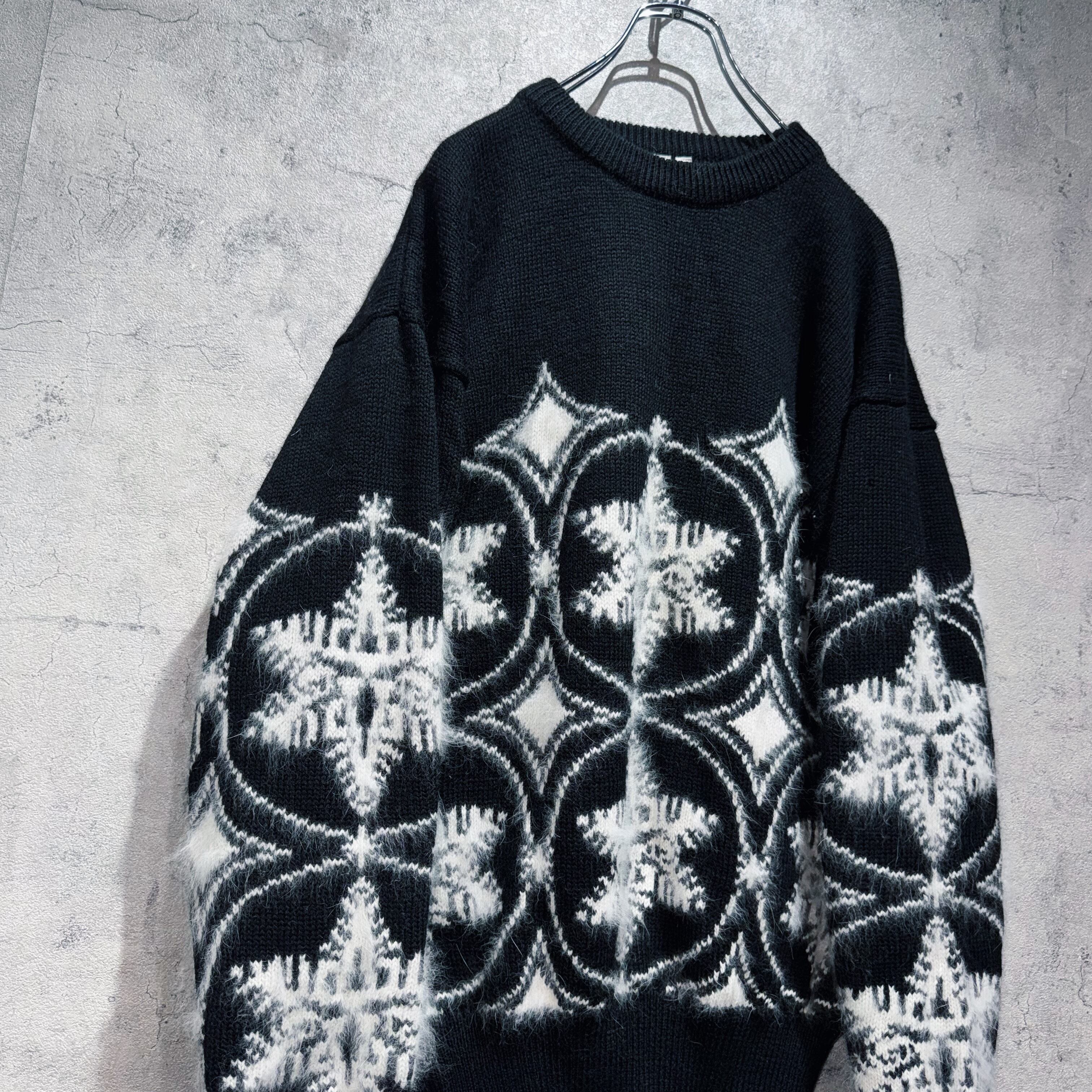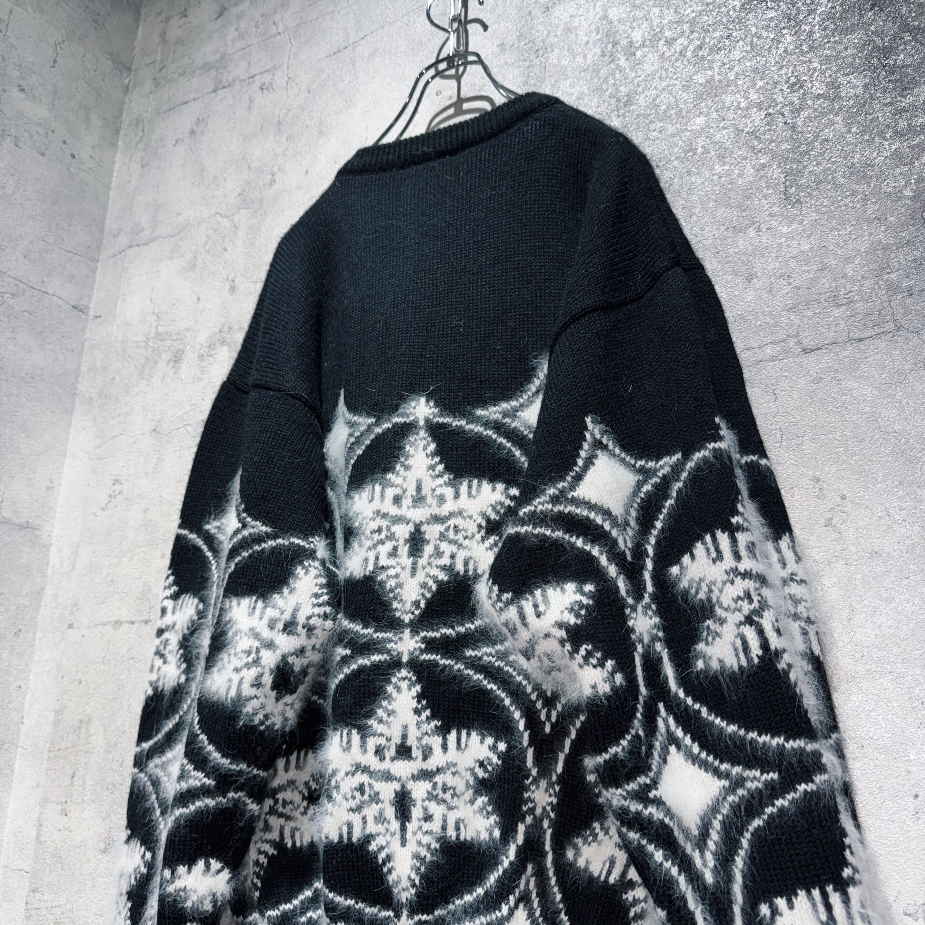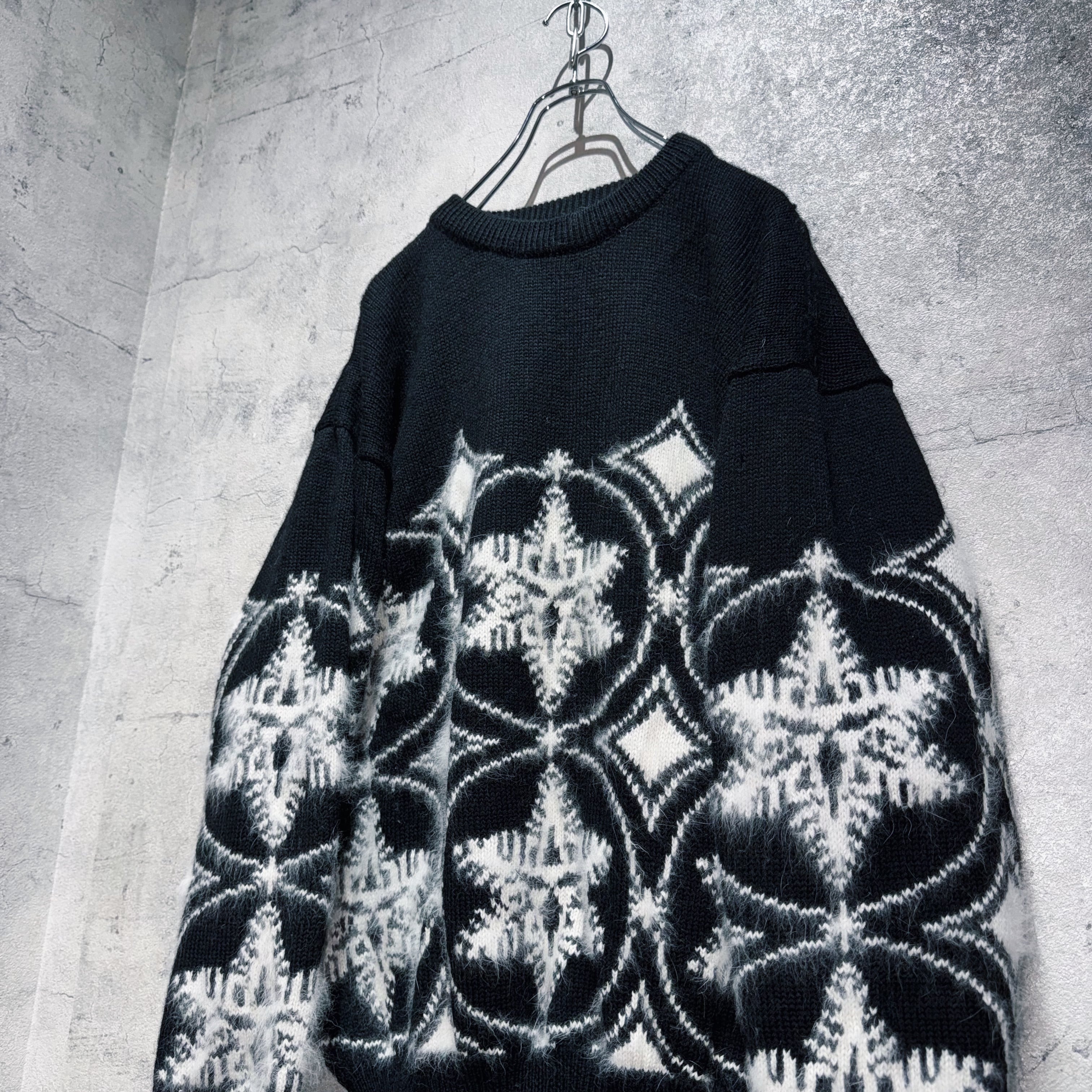 ブラックのボディに雪の結晶模様を載せ、ノルディック柄のようなエスニックパターンで仕上げたプルオーバーニット。モノトーンで構成することで貴賓のある佇まいに。