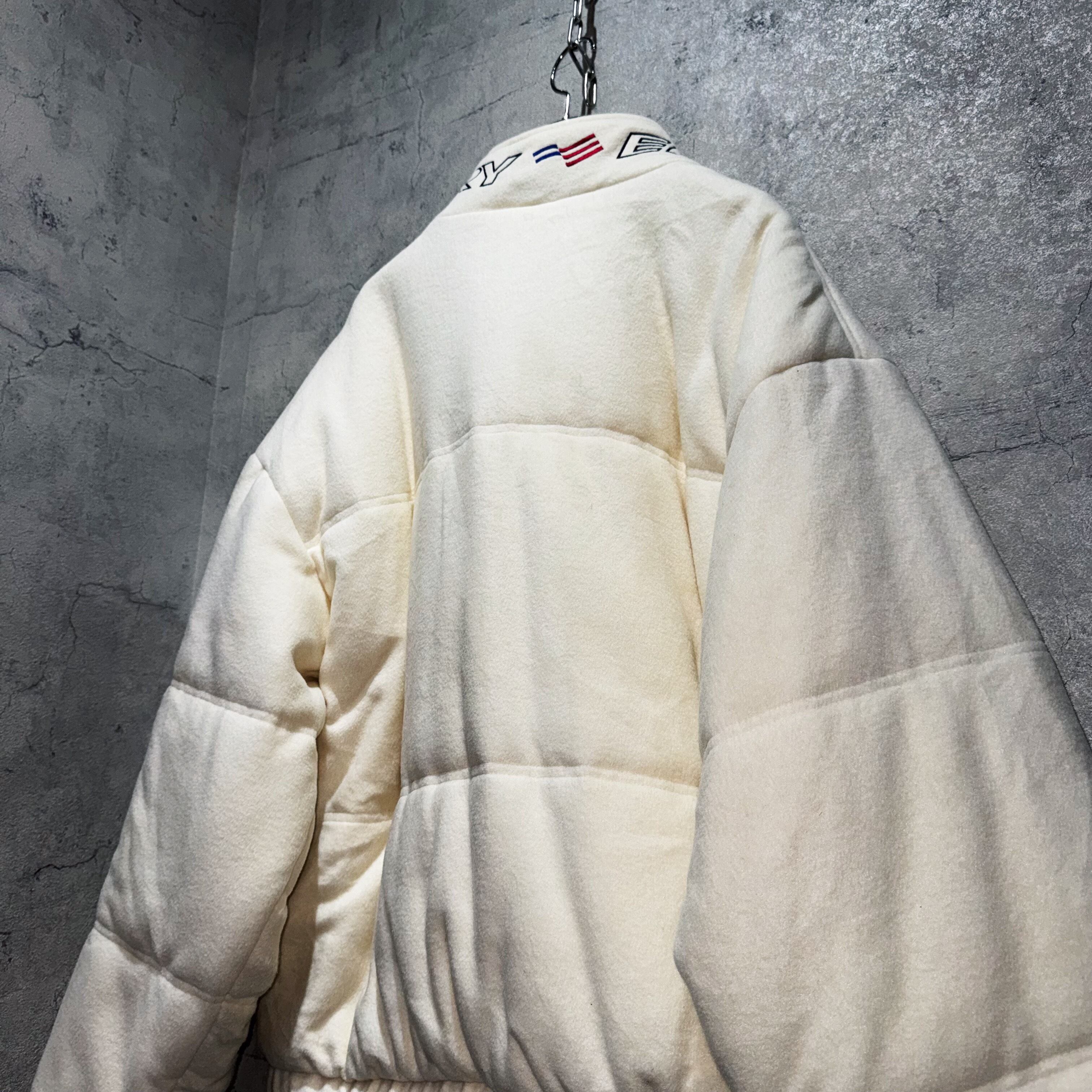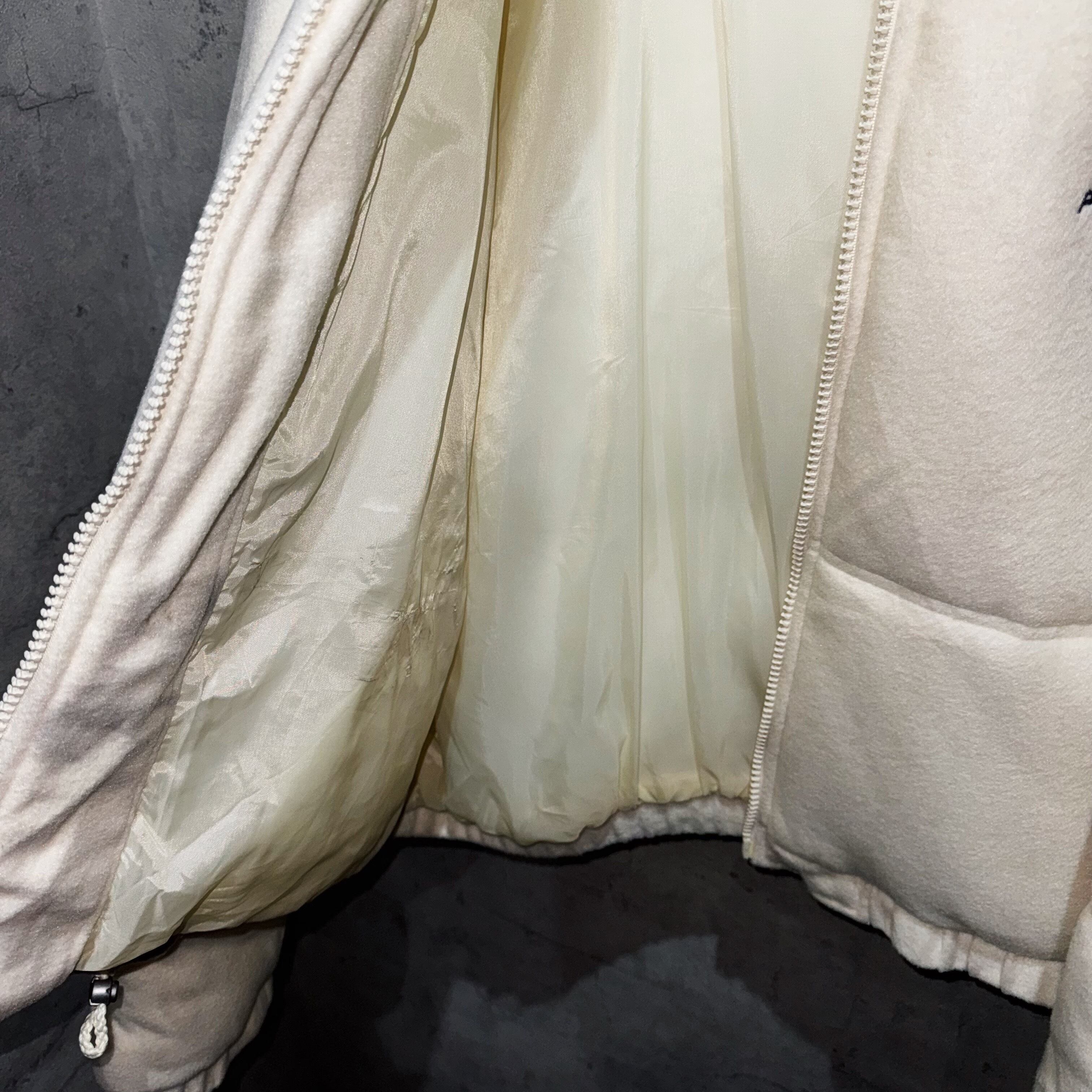 真っ白なボディにはきめ細やかで滑らかなフリースを採用し、胸元にブランド名の刺繍を刻んだオーバーサイズのダウンジャケット。配色バランスが絶妙で、サイズ感といいかなりの存在感があります。