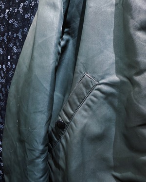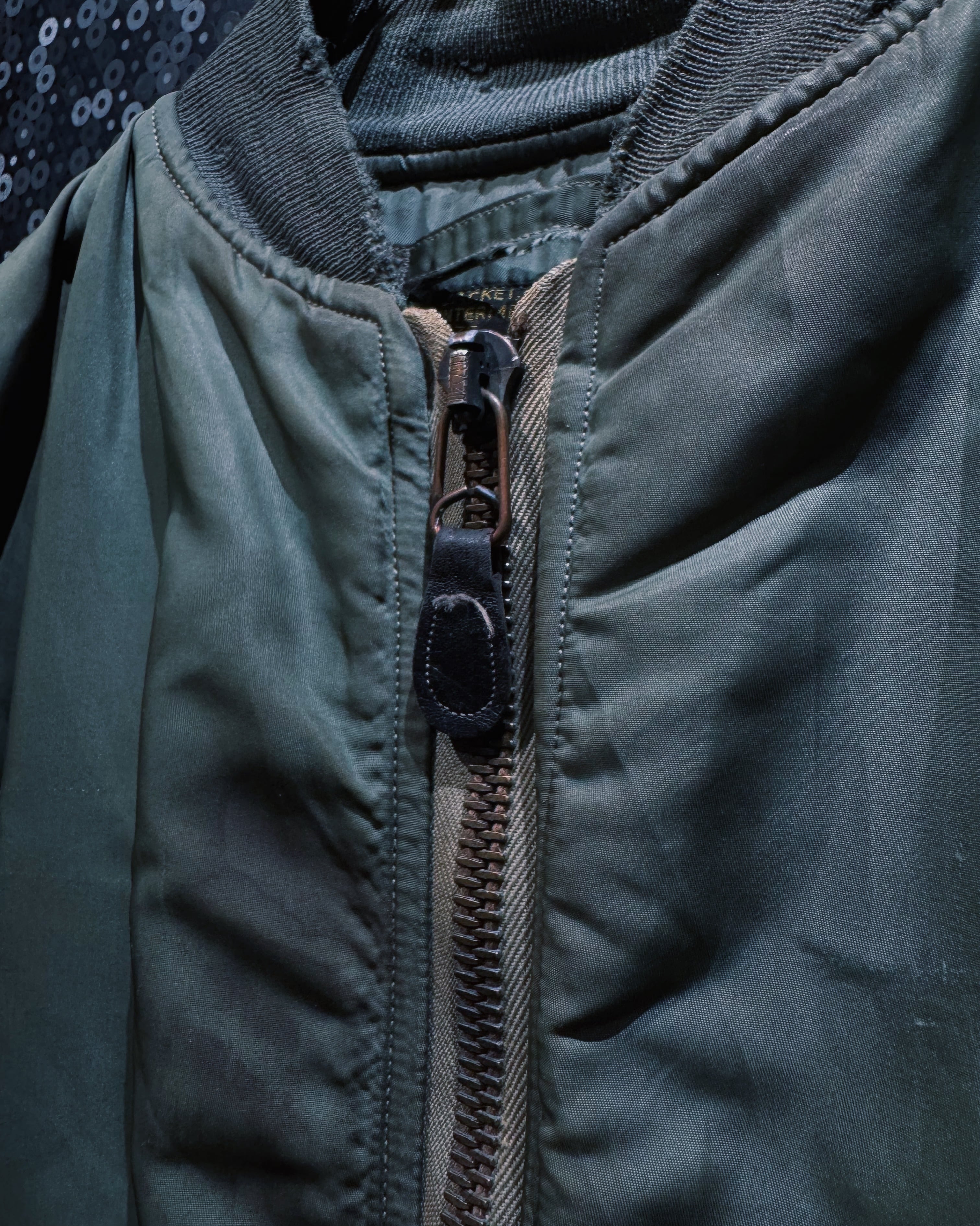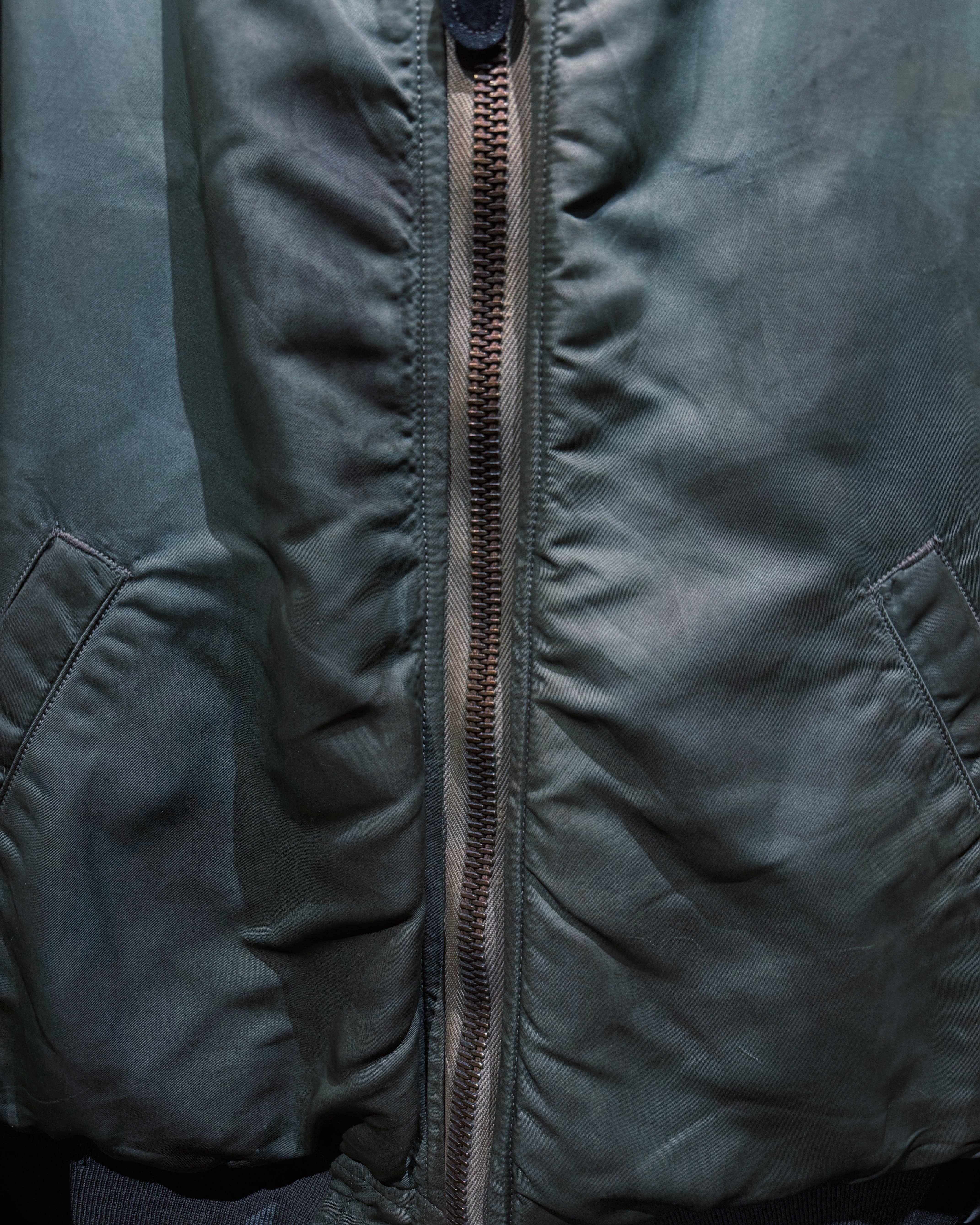 ディテールはMA-1の基本設計を踏襲しつつ、レザー用に調整された縫製やパーツ構成が見て取れる。リブとのコントラスト、革のシワやアタリ、経年による艶の出方は、ナイロンでは絶対に表現できない領域。着込むほどに完成していくMA-1という、極めて贅沢な仕様だ。