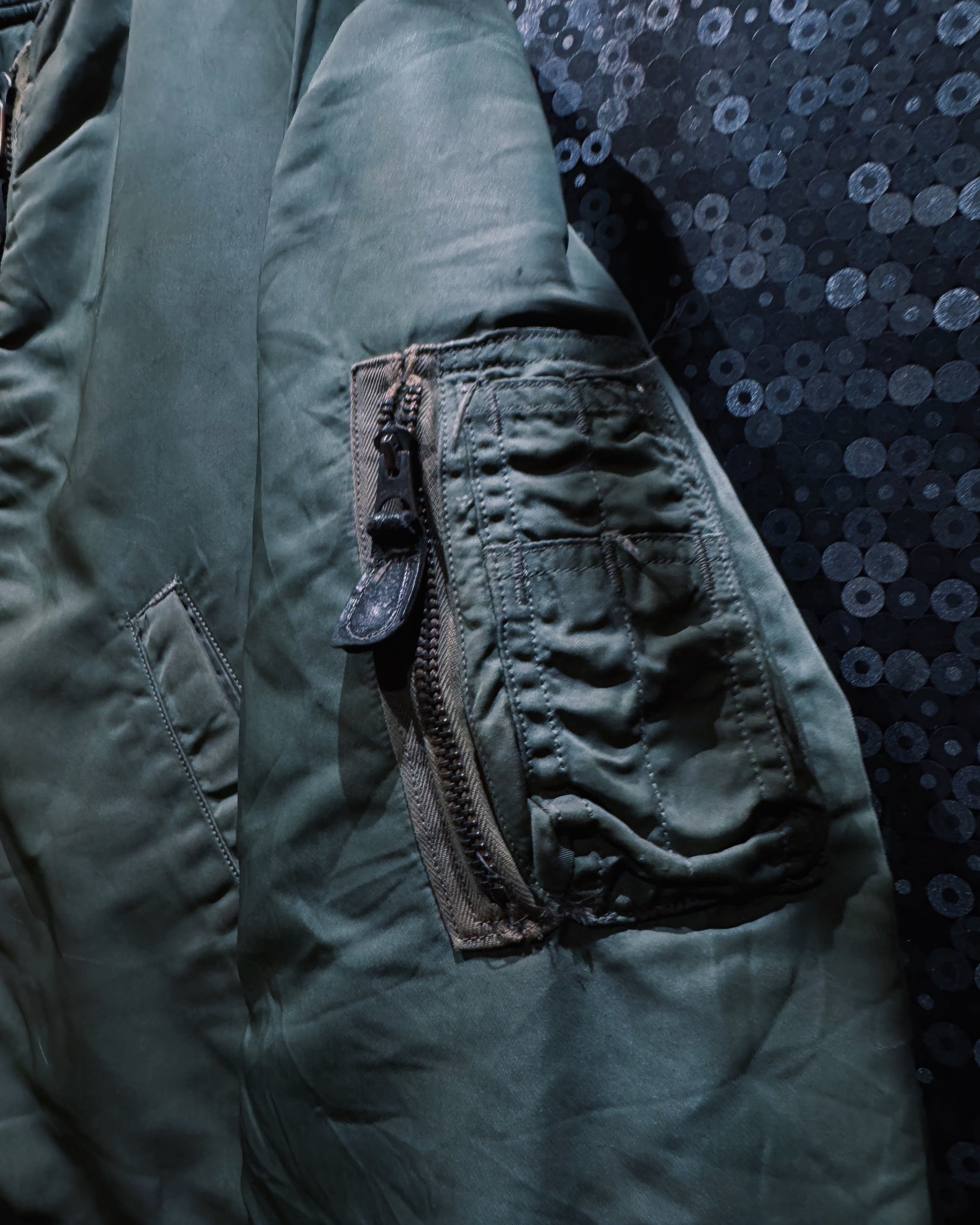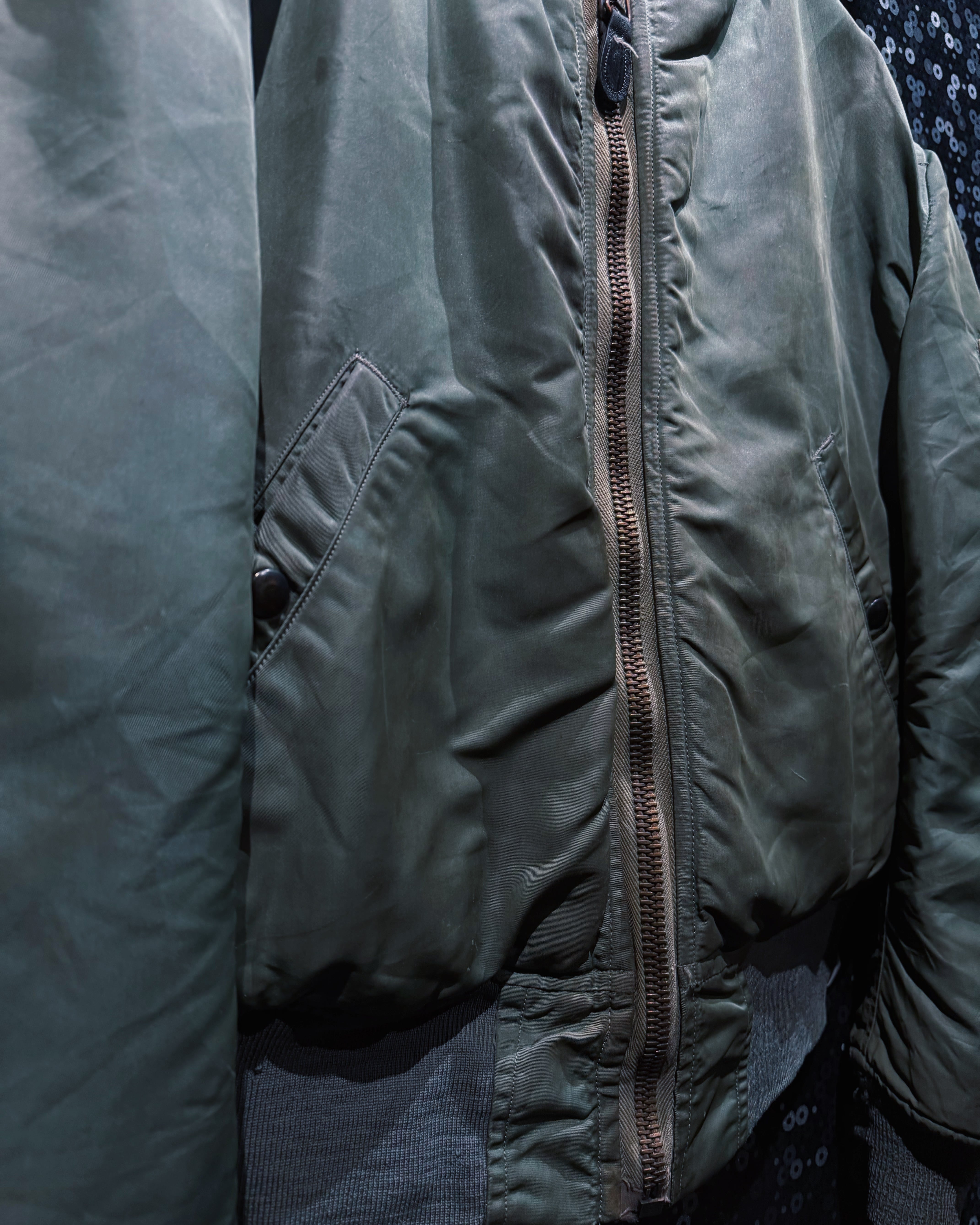 John Ownbeyは、主にB-3やG-1などのレザーフライトジャケットで知られるメーカーで、本来は「革のフライトジャケット」を得意とするブランド。そのJohn Ownbeyが、MA-1という“本来ナイロンであるべきモデル”を、しかもレザー(牛革)で製作しているという点がまず異常。軍納品の王道ラインではなく、民間・展示・特殊用途、もしくは極小ロットでの企画品だった可能性が極めて高い。