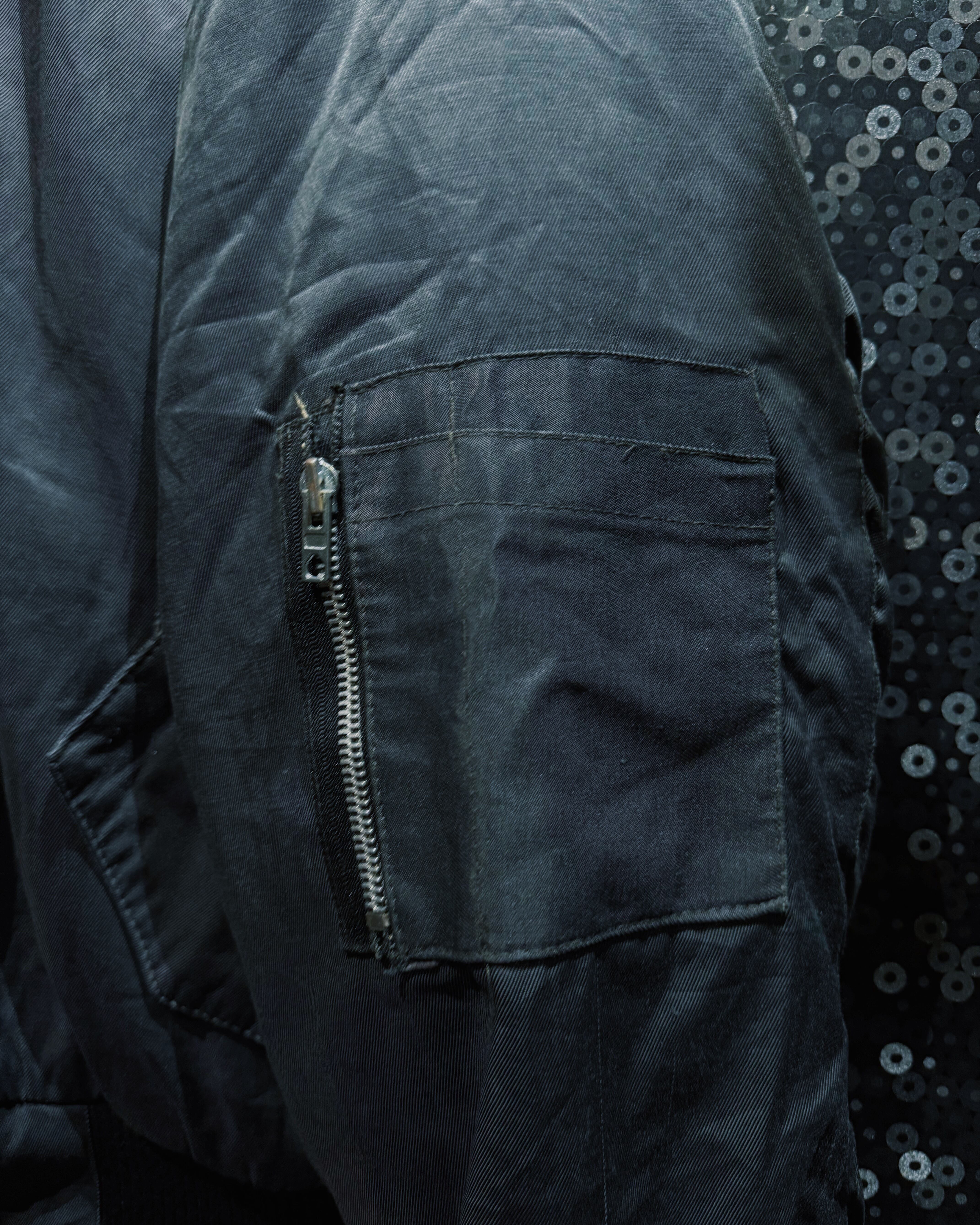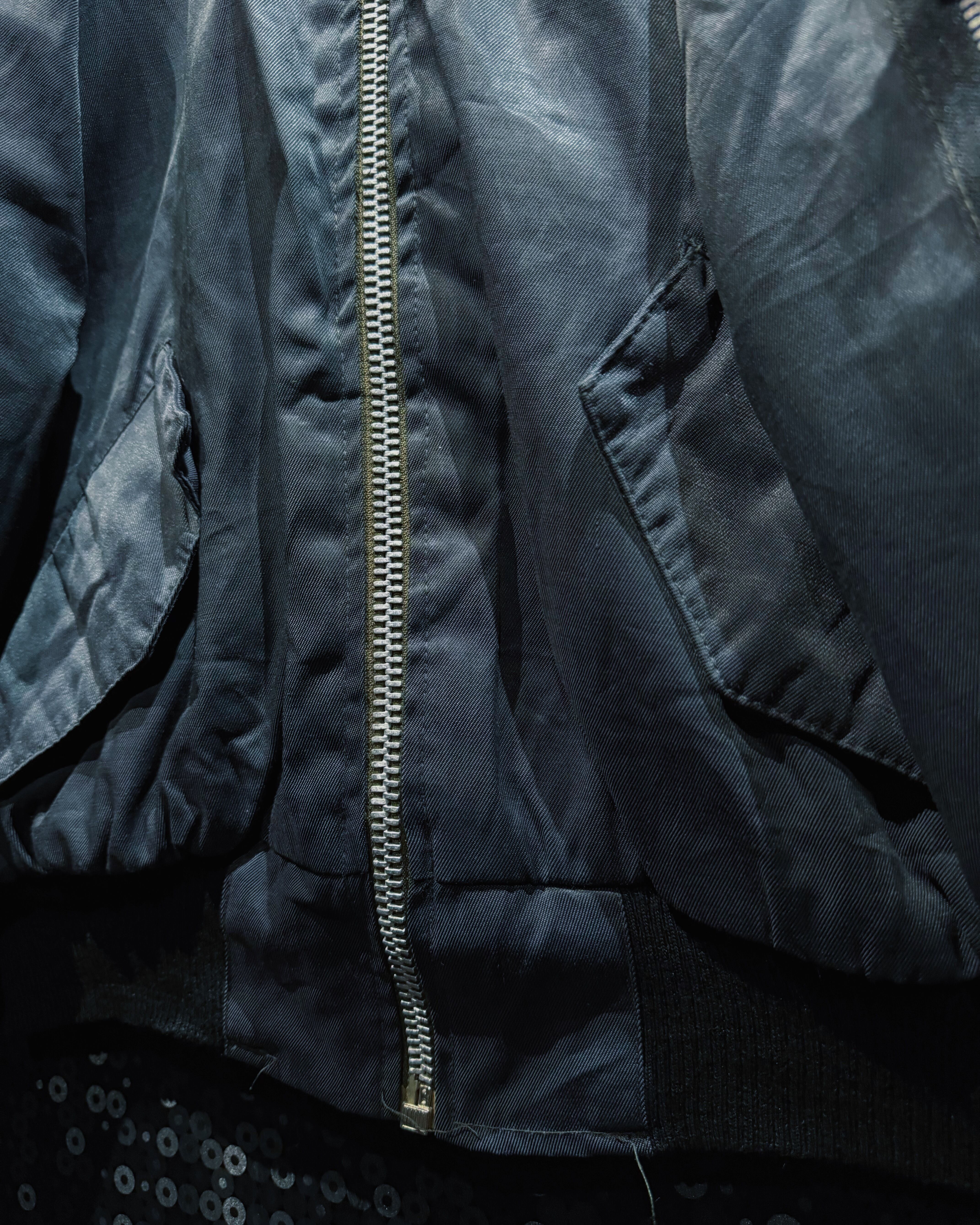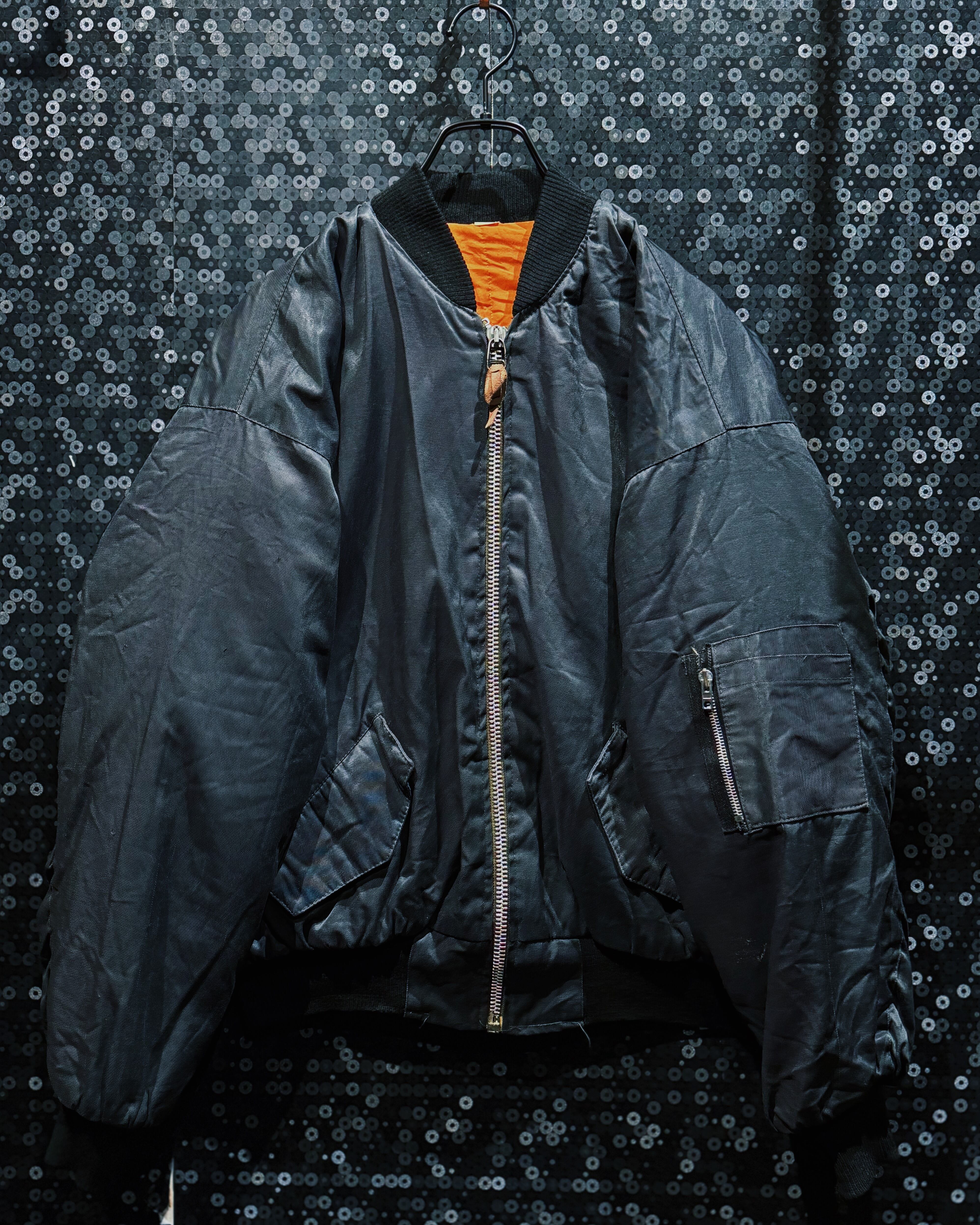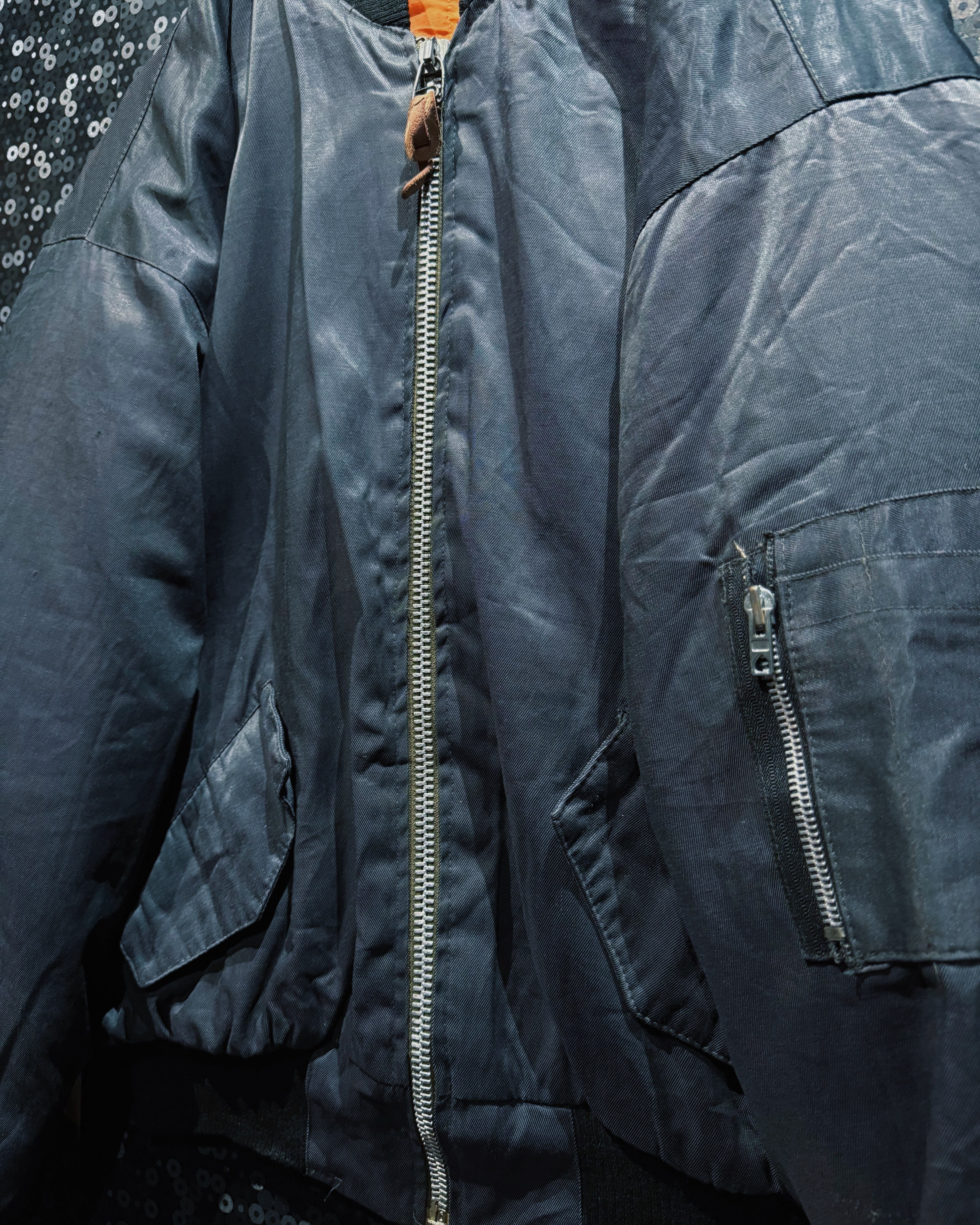 一般的なナイロン製MA-1とは完全に一線を画す、牛革(カウレザー)を使用した極めて特殊なMA-1。そもそもMA-1は、空軍用フライトジャケットとして軽量性と機動性を最優先にナイロンで作られたモデルであり、レザー仕様は本来かなり例外的な存在。だからこそ、この一着は市場でも数が少なく、見つかること自体が稀。