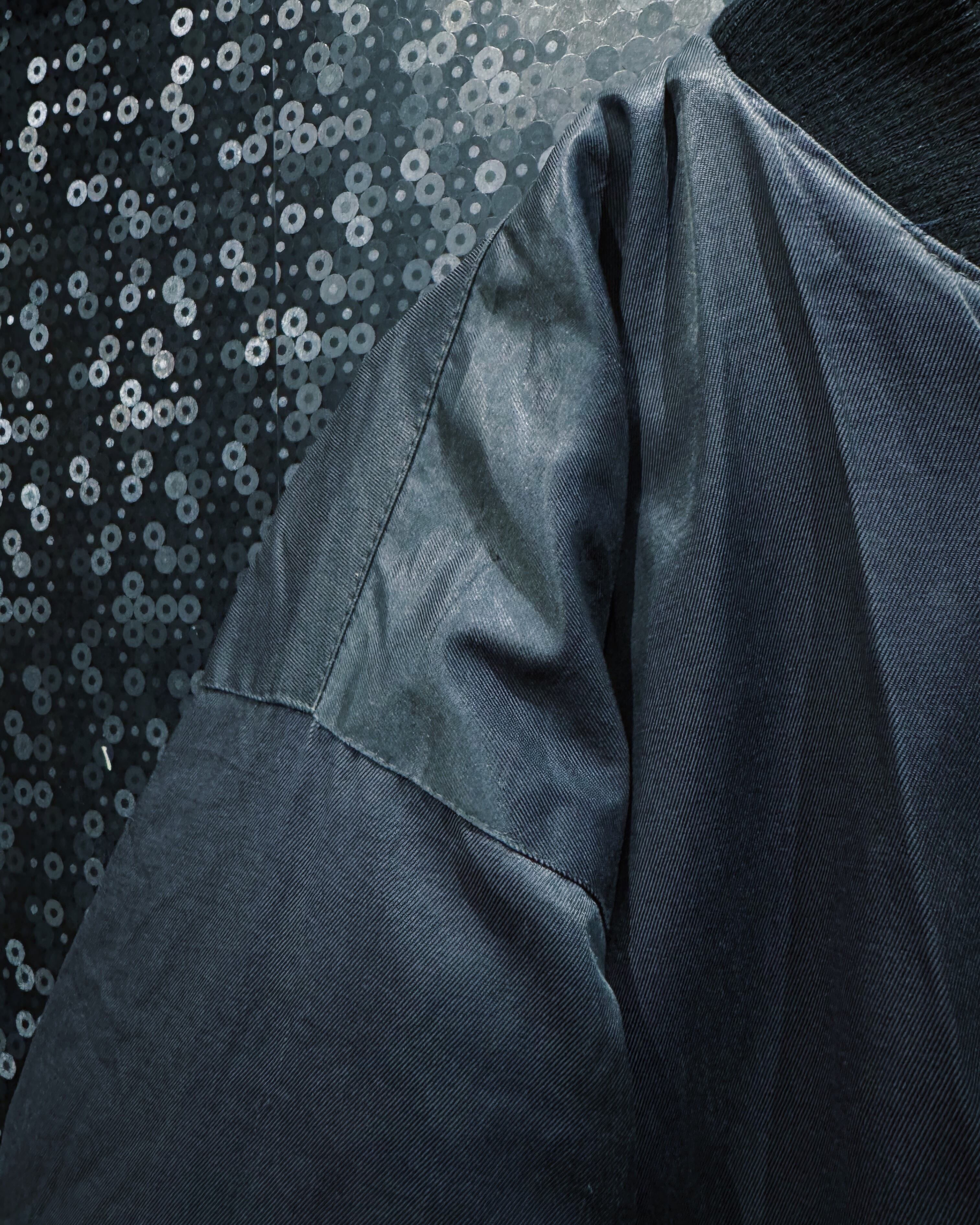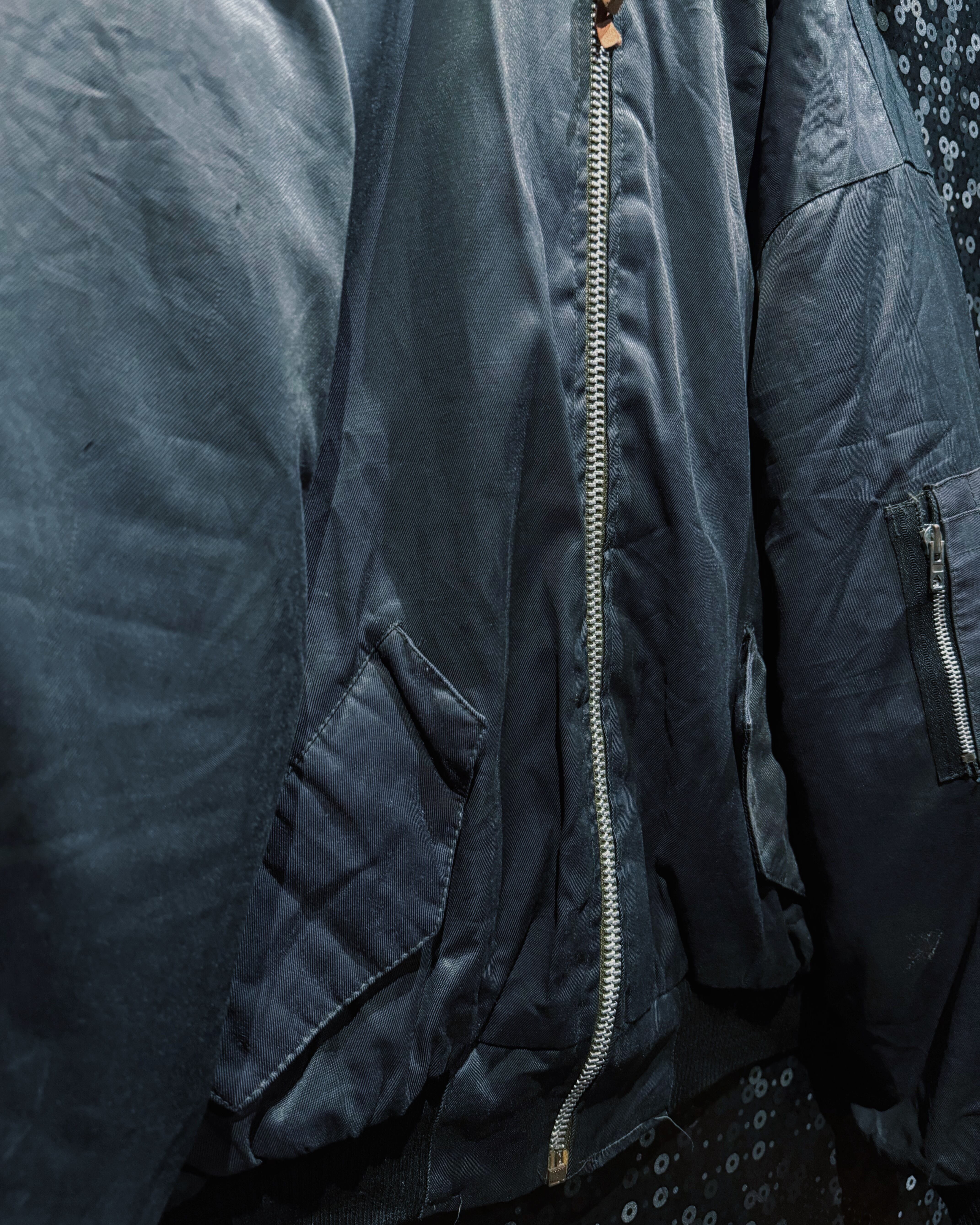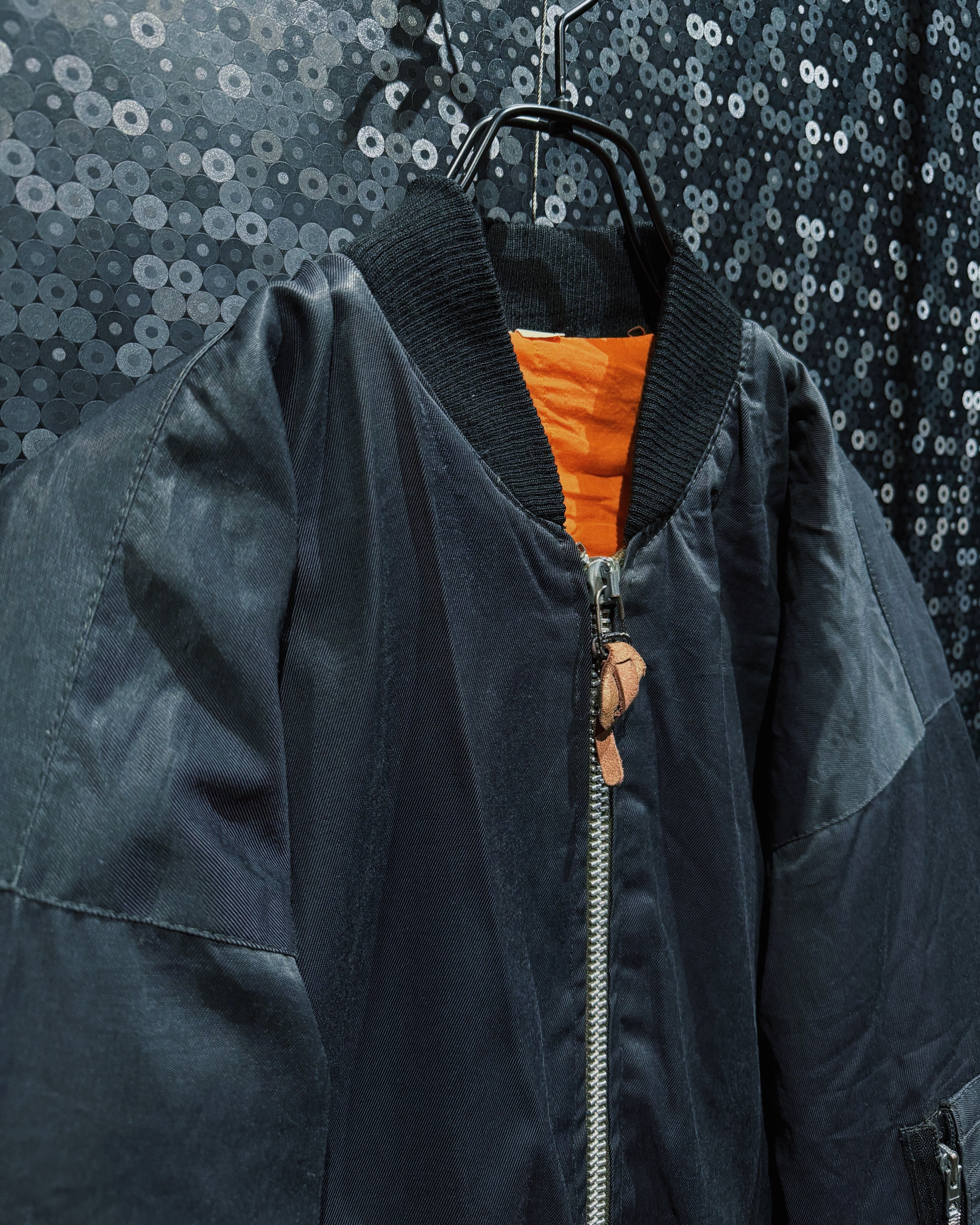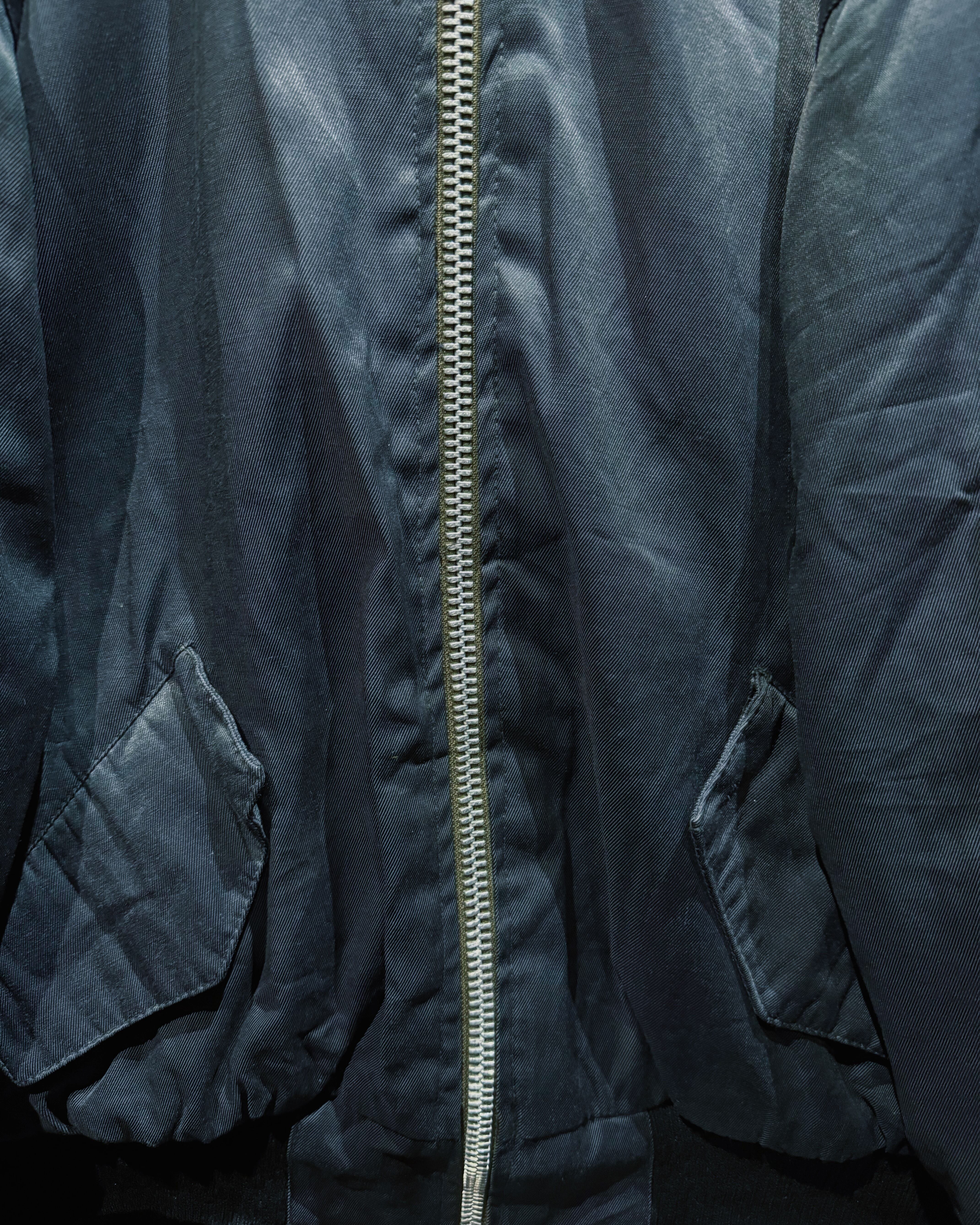 シルエット自体はMA-1の王道を踏襲しており、短丈で丸みのあるフォルムは健在。そのフォルムを重厚な牛革で構成しているため、無骨さと色気が共存した独特の存在感を放つ。リブやフライトジャケット特有のディテールもレザーとのコントラストでより際立ち、ミリタリーという枠を超えてファッションピースとして成立している。