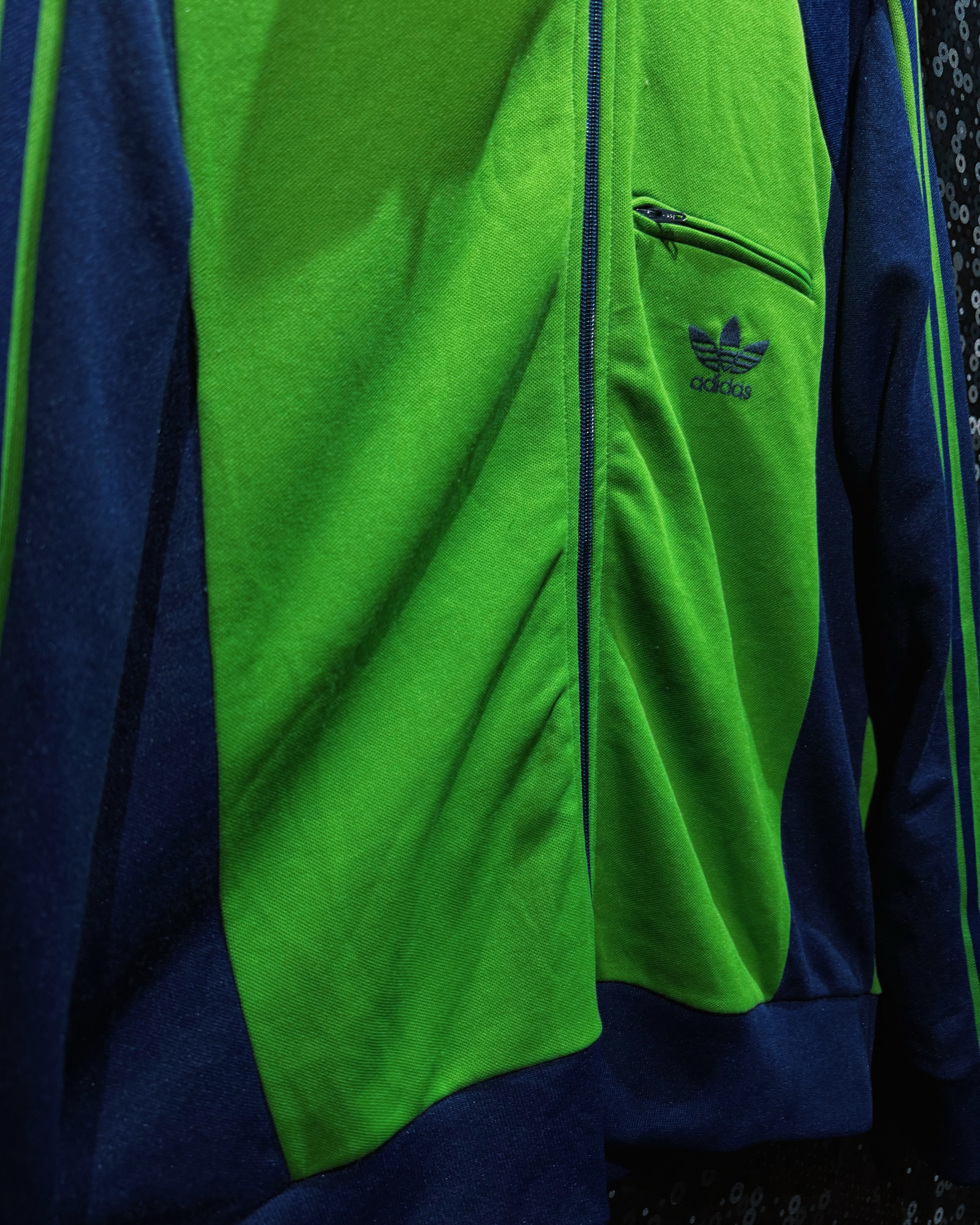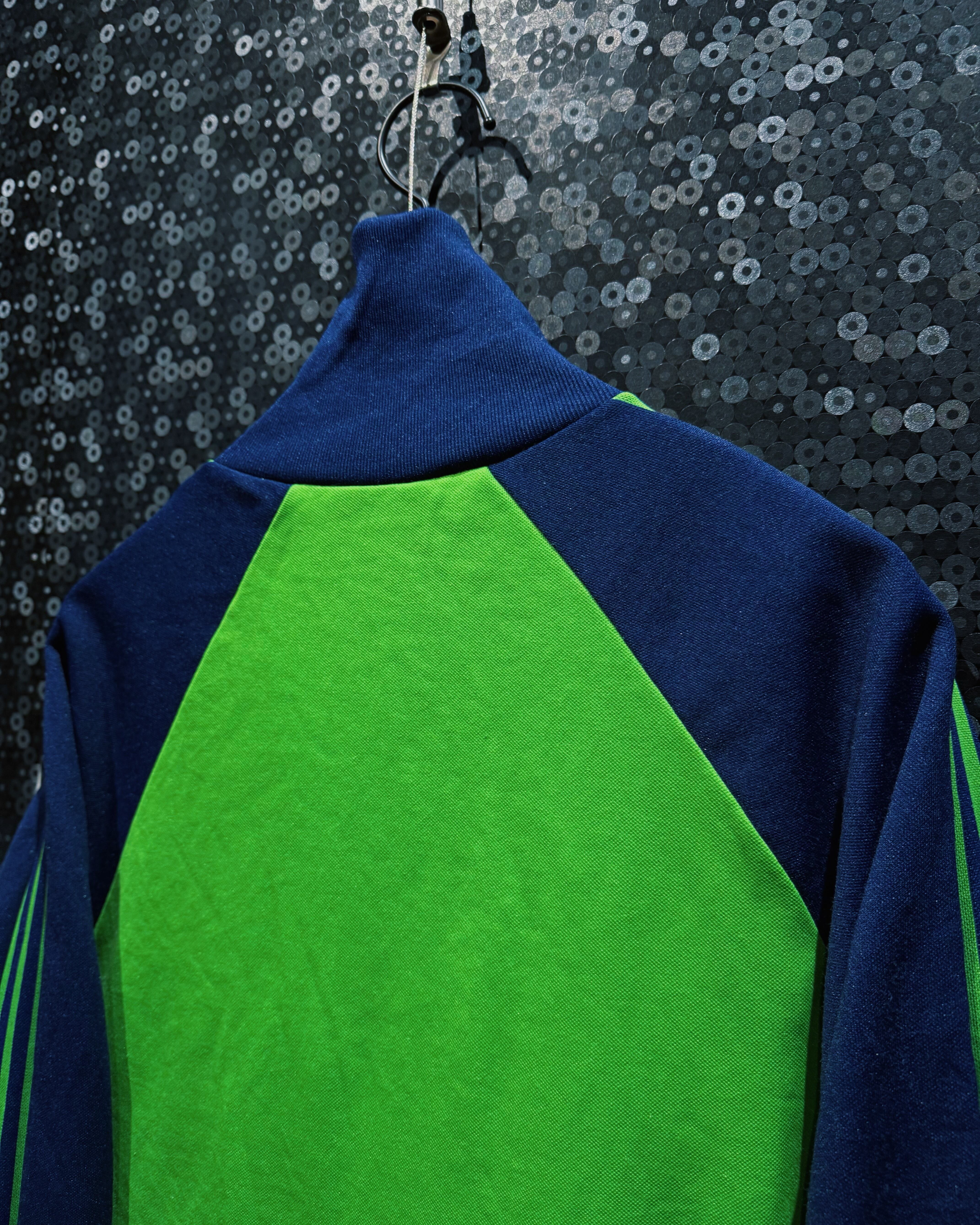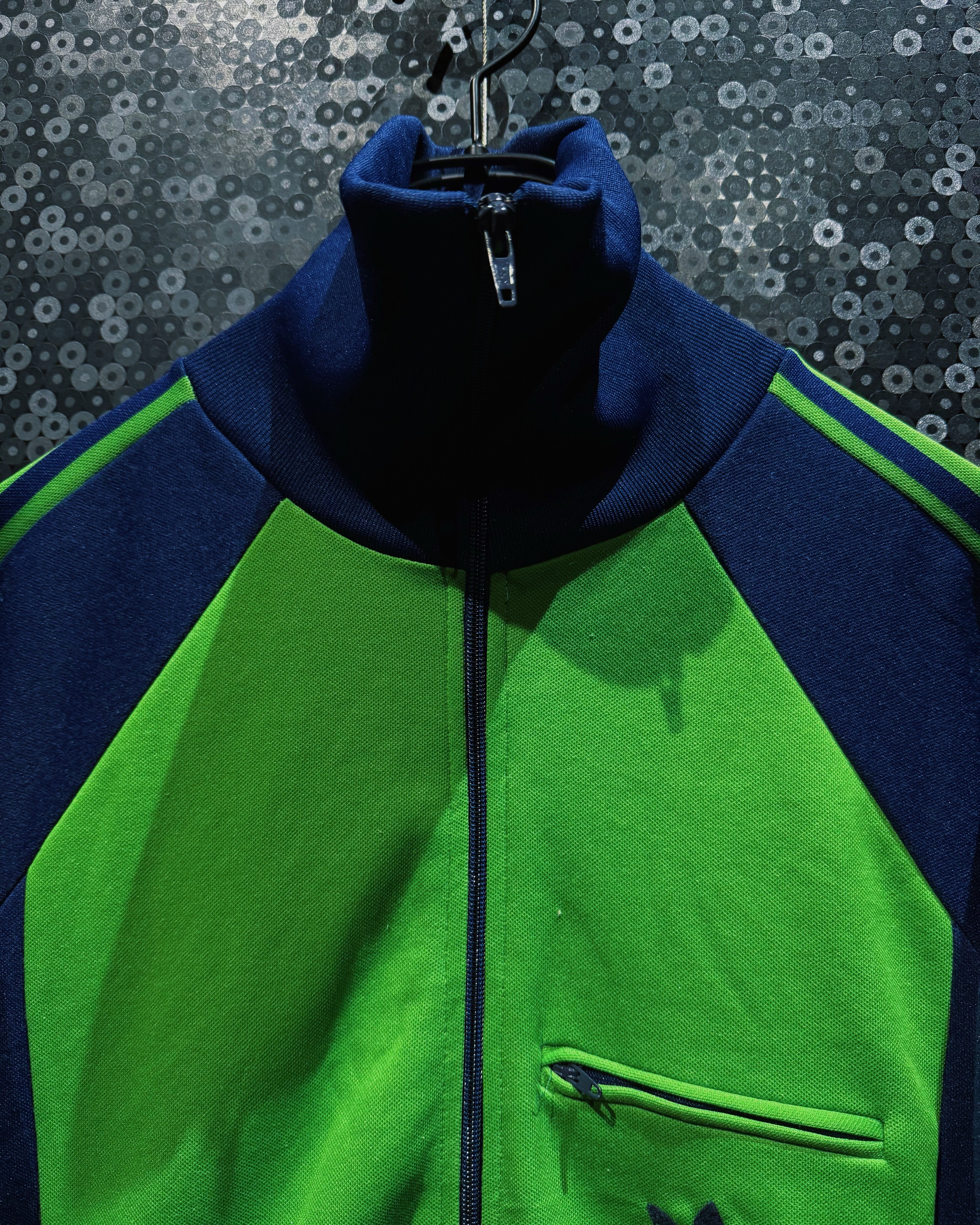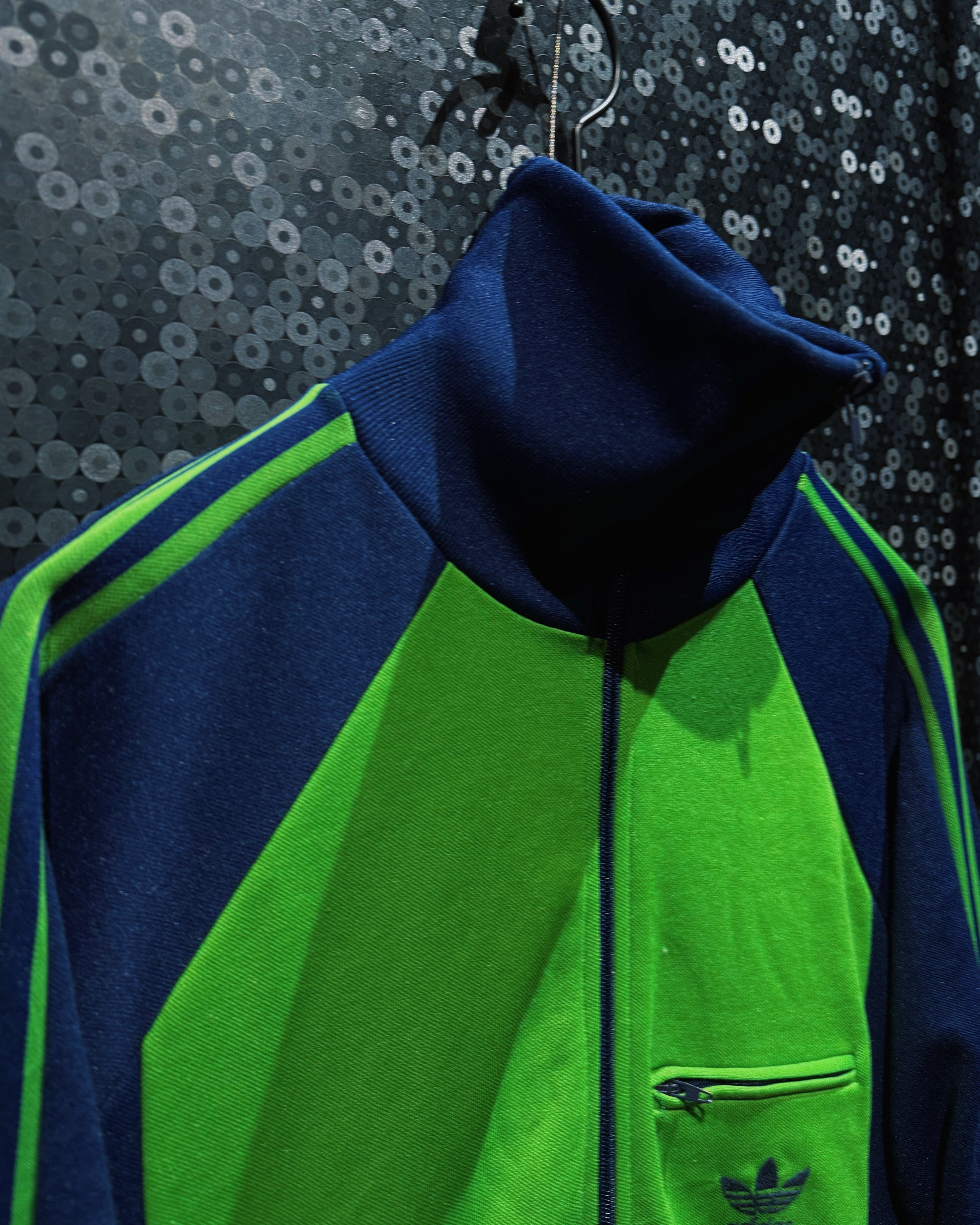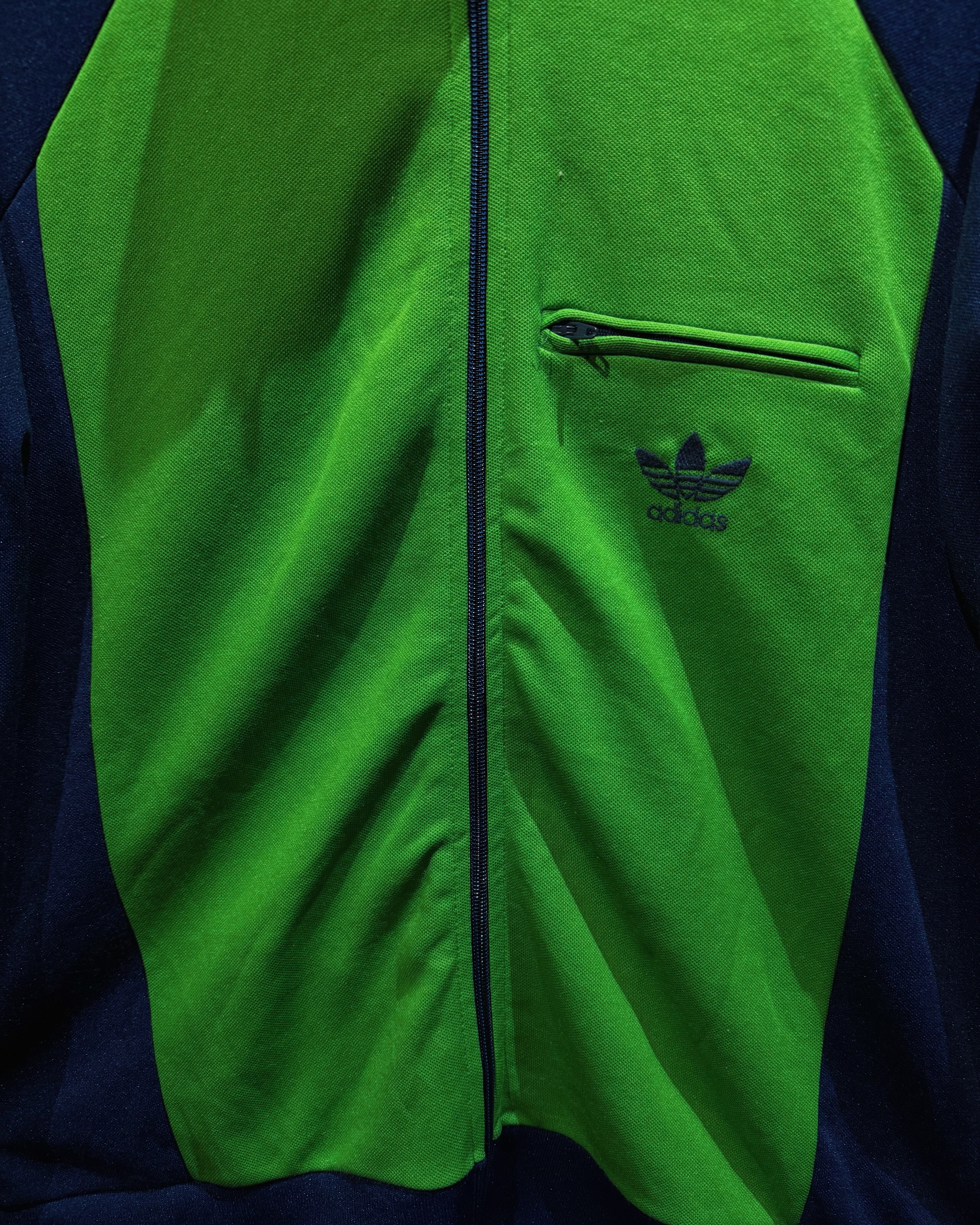 グリーン×ネイビーの大胆なバイカラーデザインは、当時のフレンチadidasらしいスポーツとファッションの境界を曖昧にする配色センス。現行品ではまず見られない色の深みとコントラストがあり、ヴィンテージならではの説得力を放っている。フロント左胸にはジップ付きポケットが配置されており、トラックジャケットとしては珍しいディテール。この一点だけでもVENTEX製らしい実験性と実用性の高さがうかがえる。