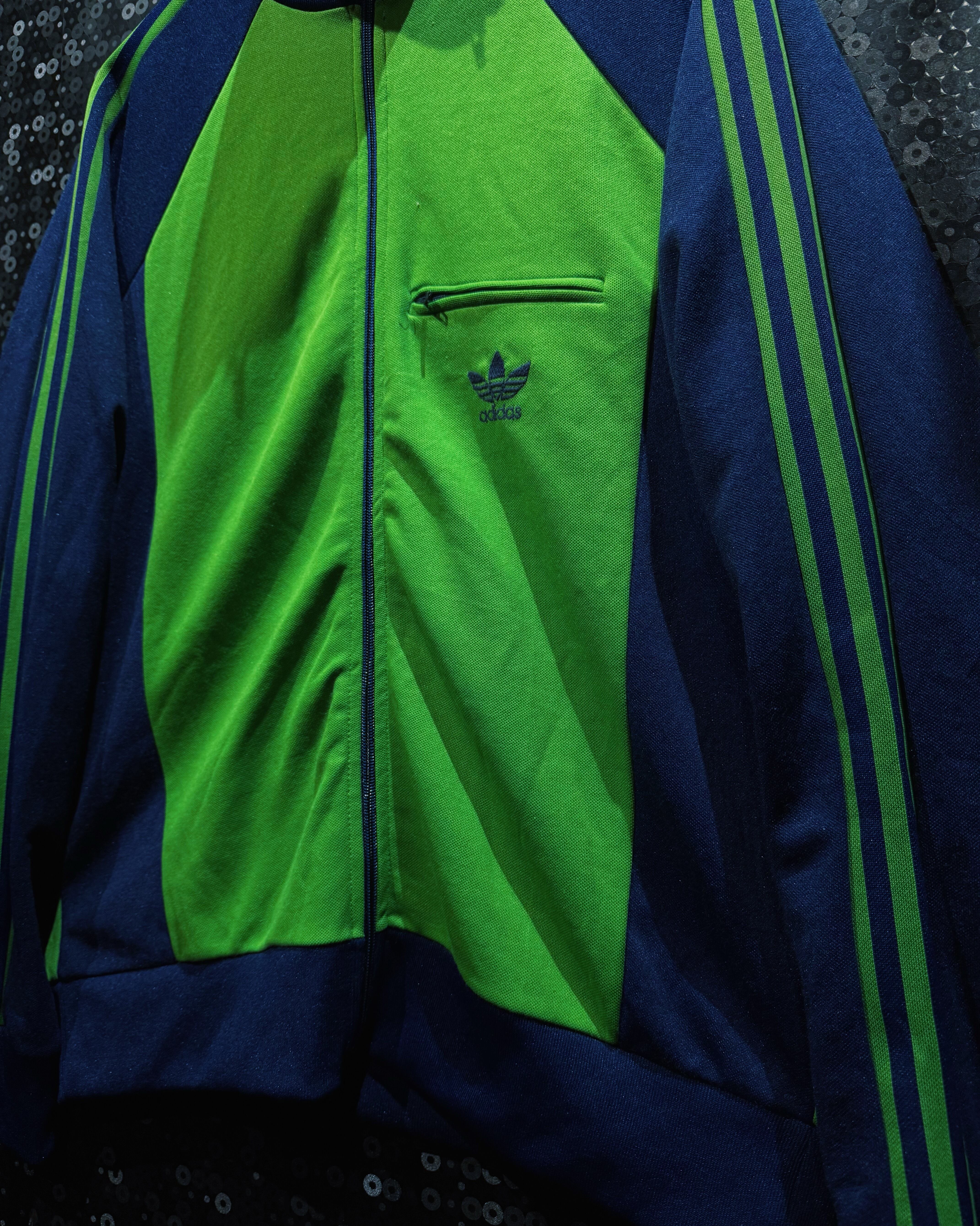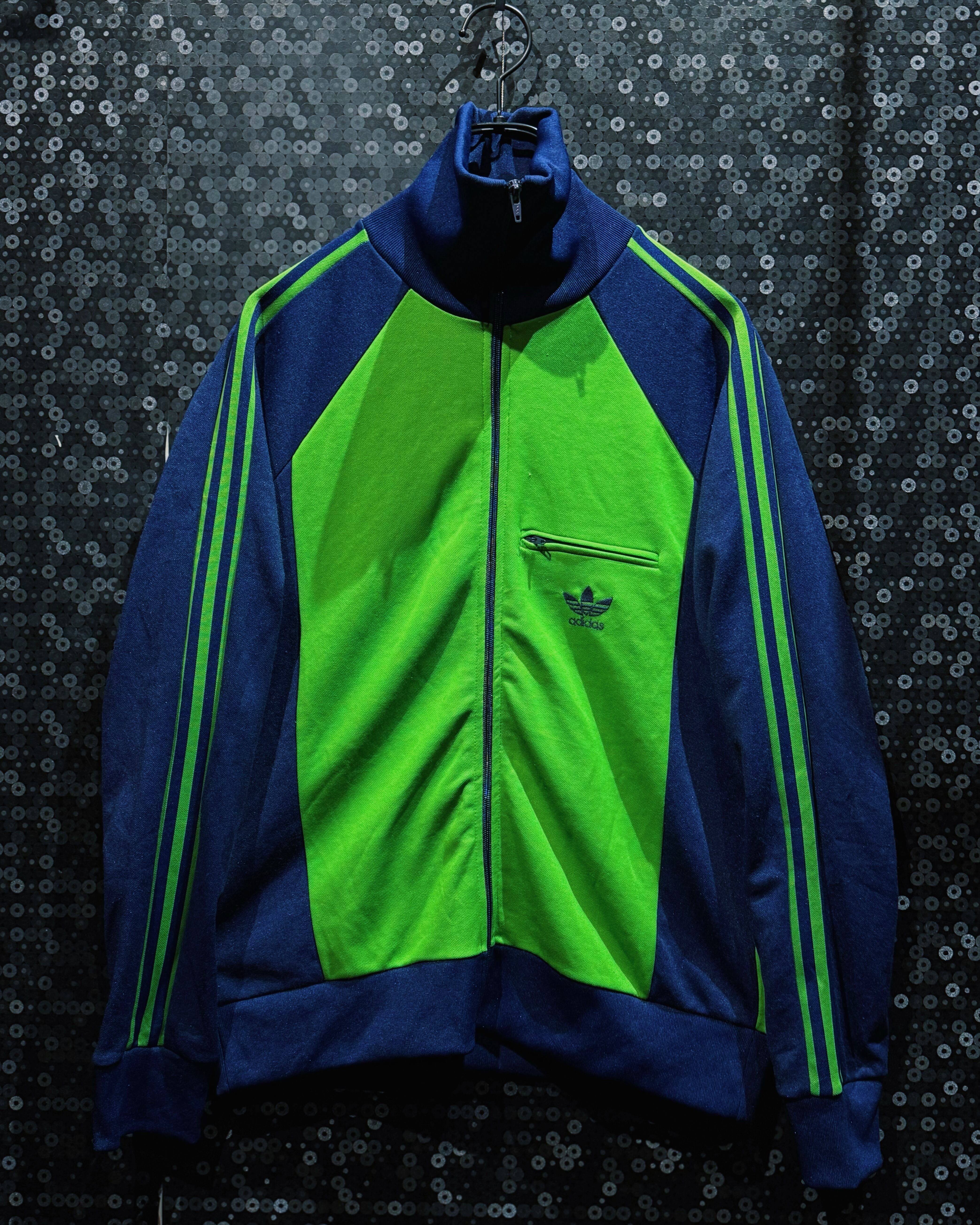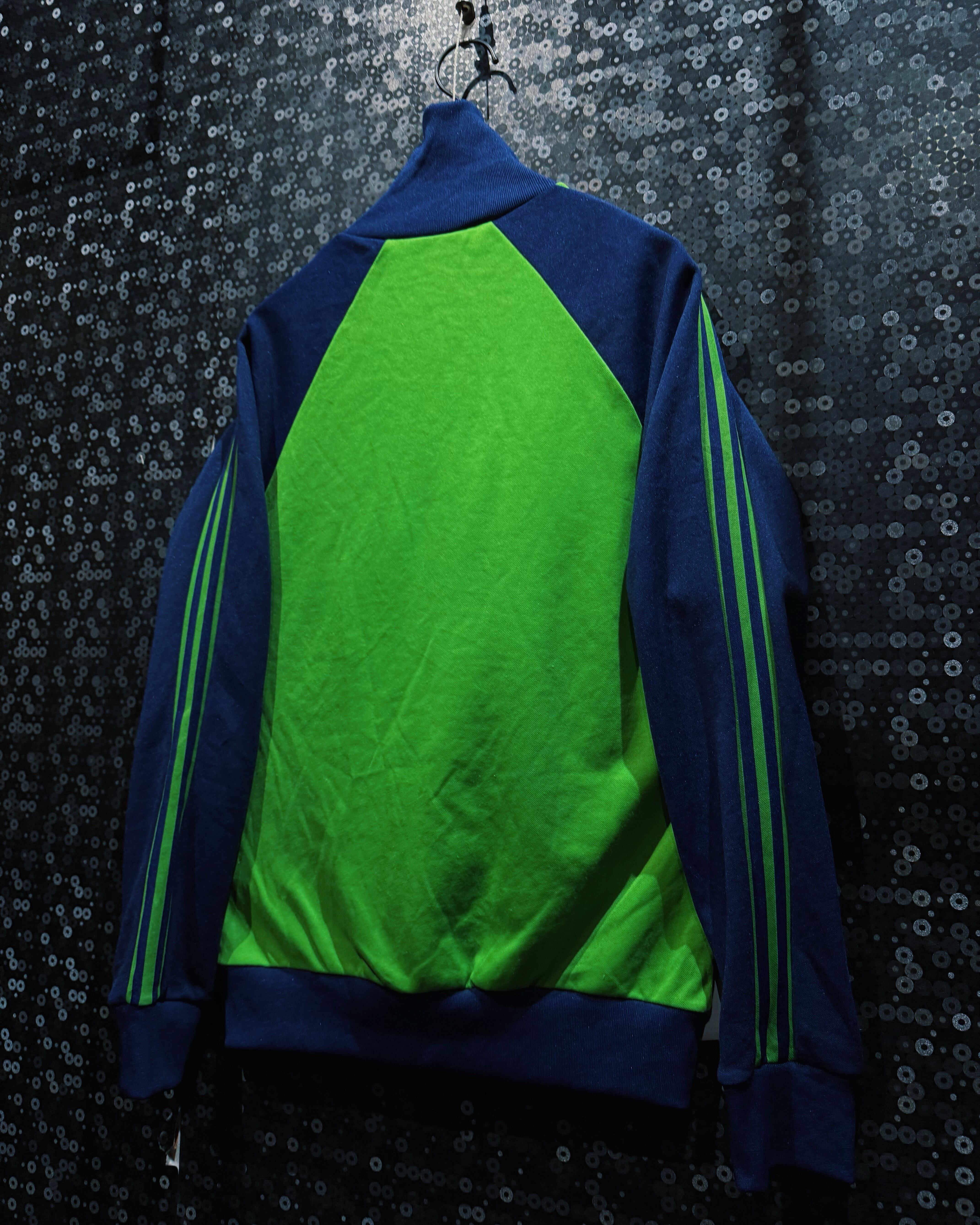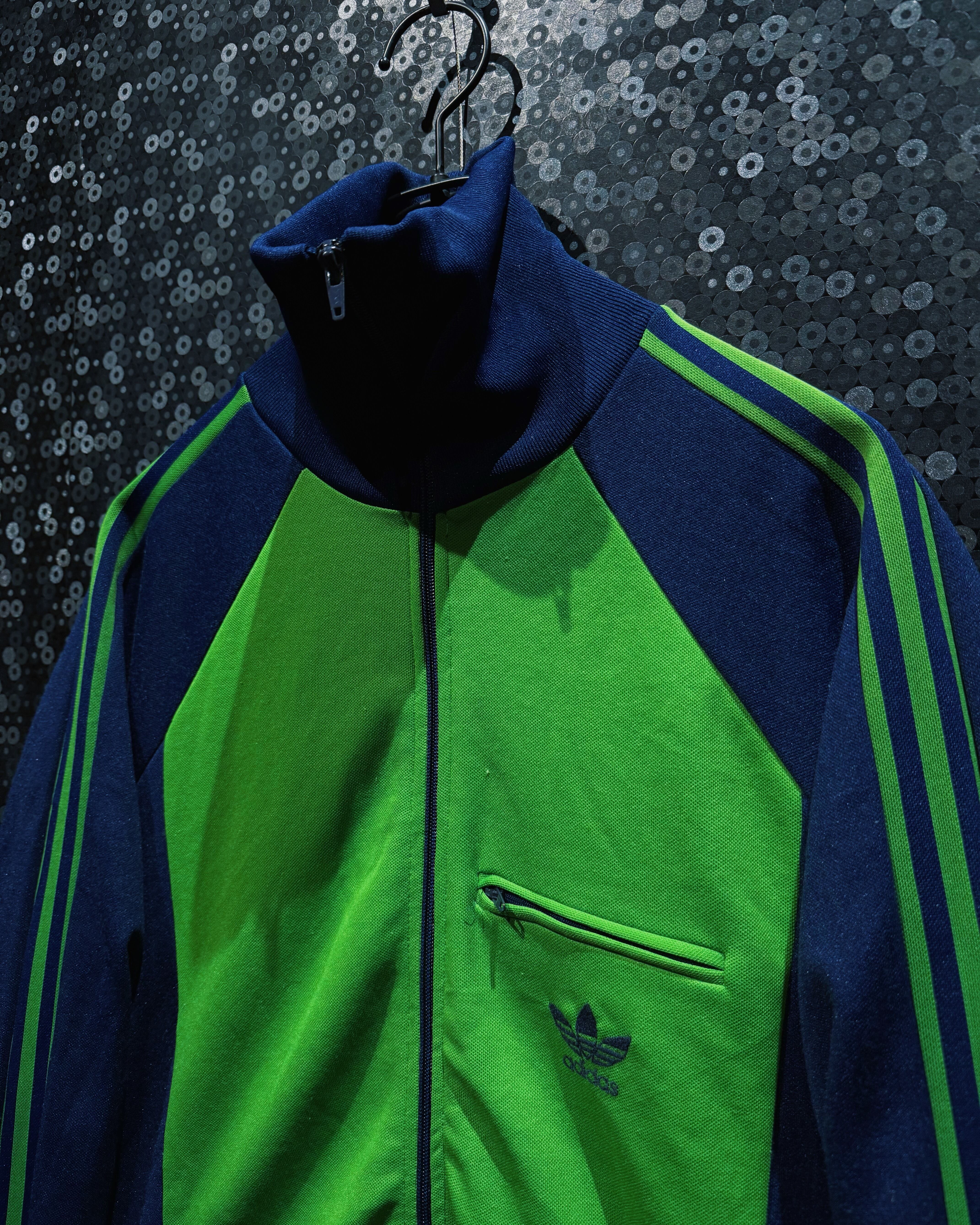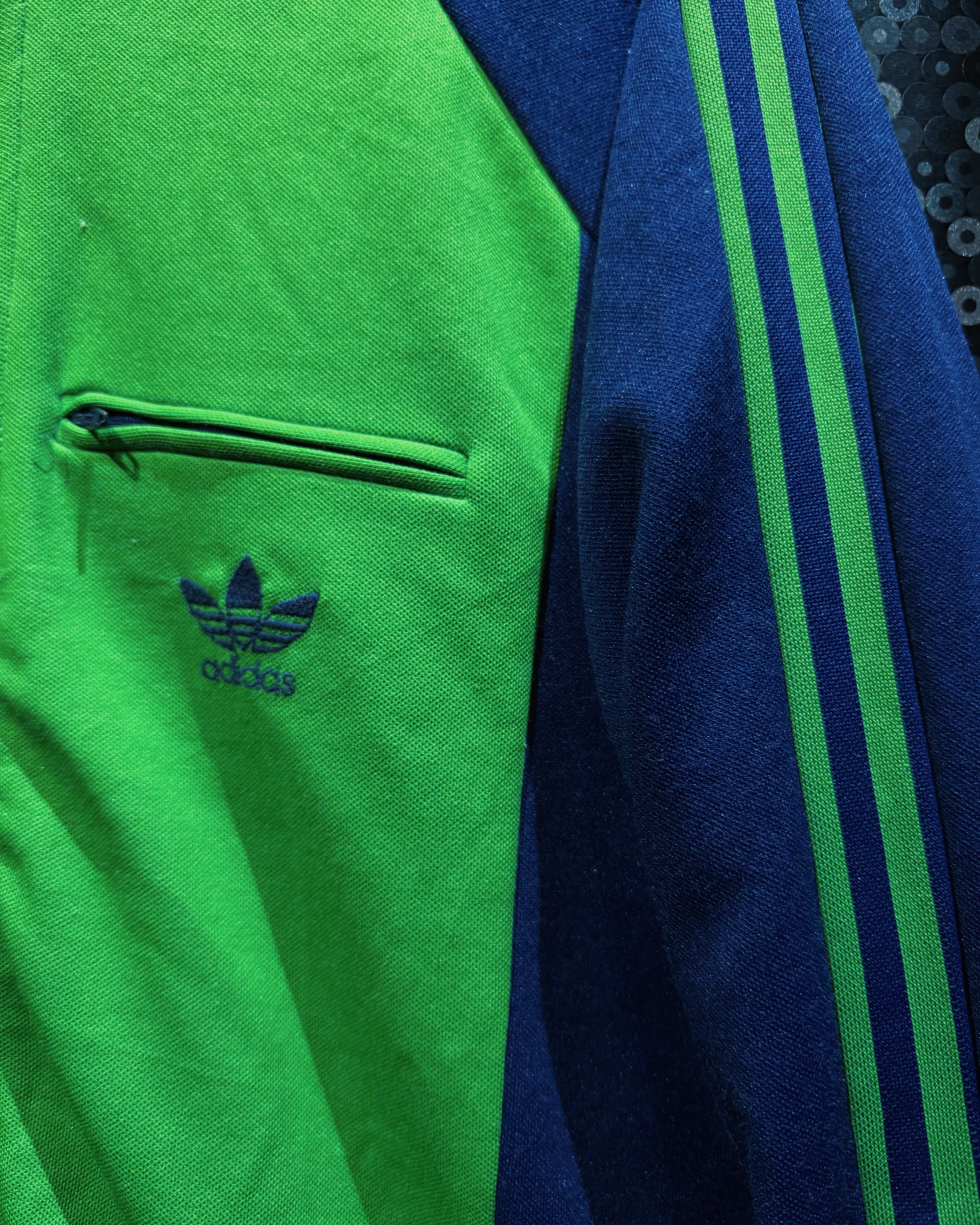 グリーン×ネイビーの大胆なバイカラーデザインは、当時のフレンチadidasらしいスポーツとファッションの境界を曖昧にする配色センス。現行品ではまず見られない色の深みとコントラストがあり、ヴィンテージならではの説得力を放っている。フロント左胸にはジップ付きポケットが配置されており、トラックジャケットとしては珍しいディテール。この一点だけでもVENTEX製らしい実験性と実用性の高さがうかがえる。