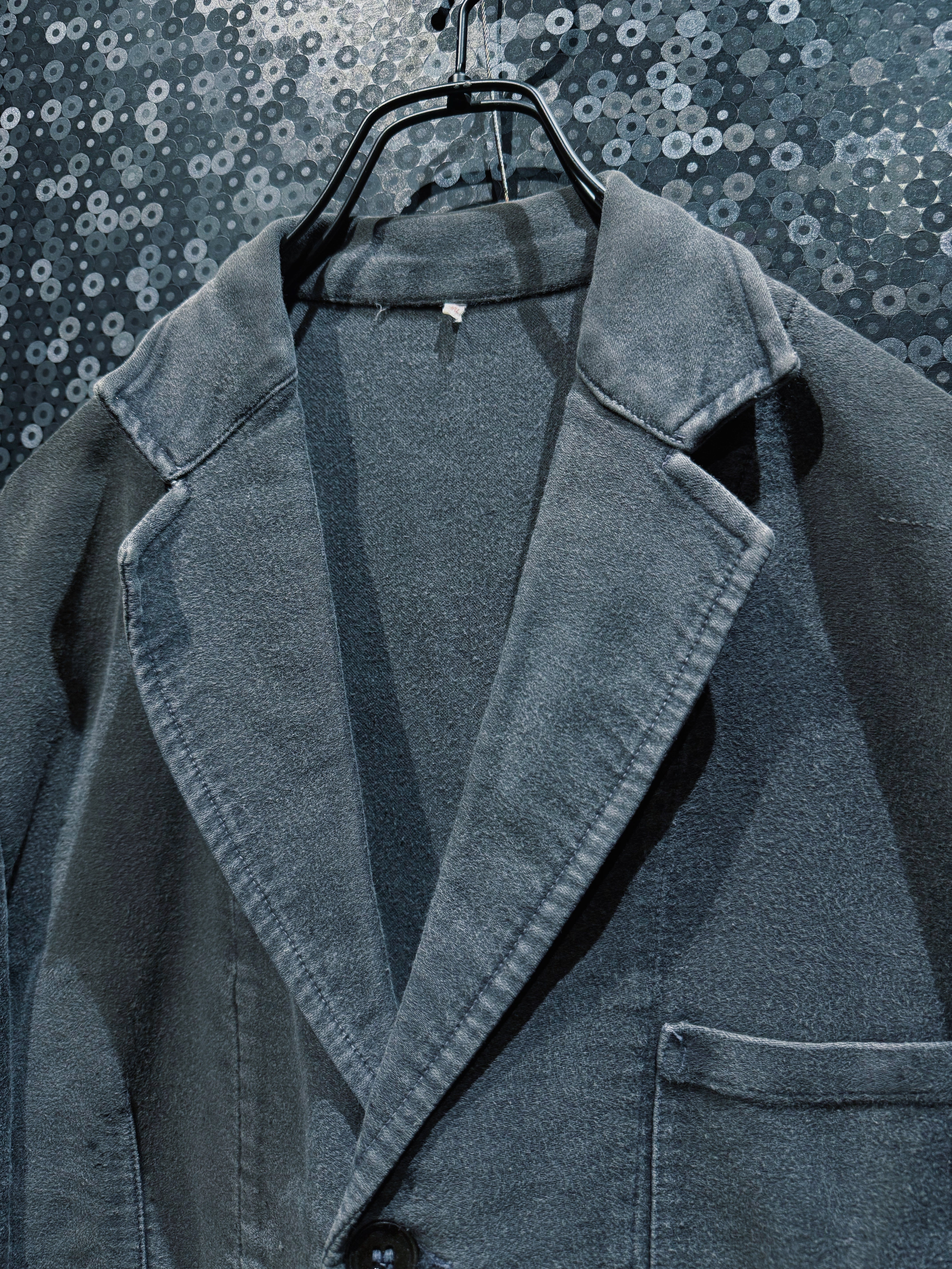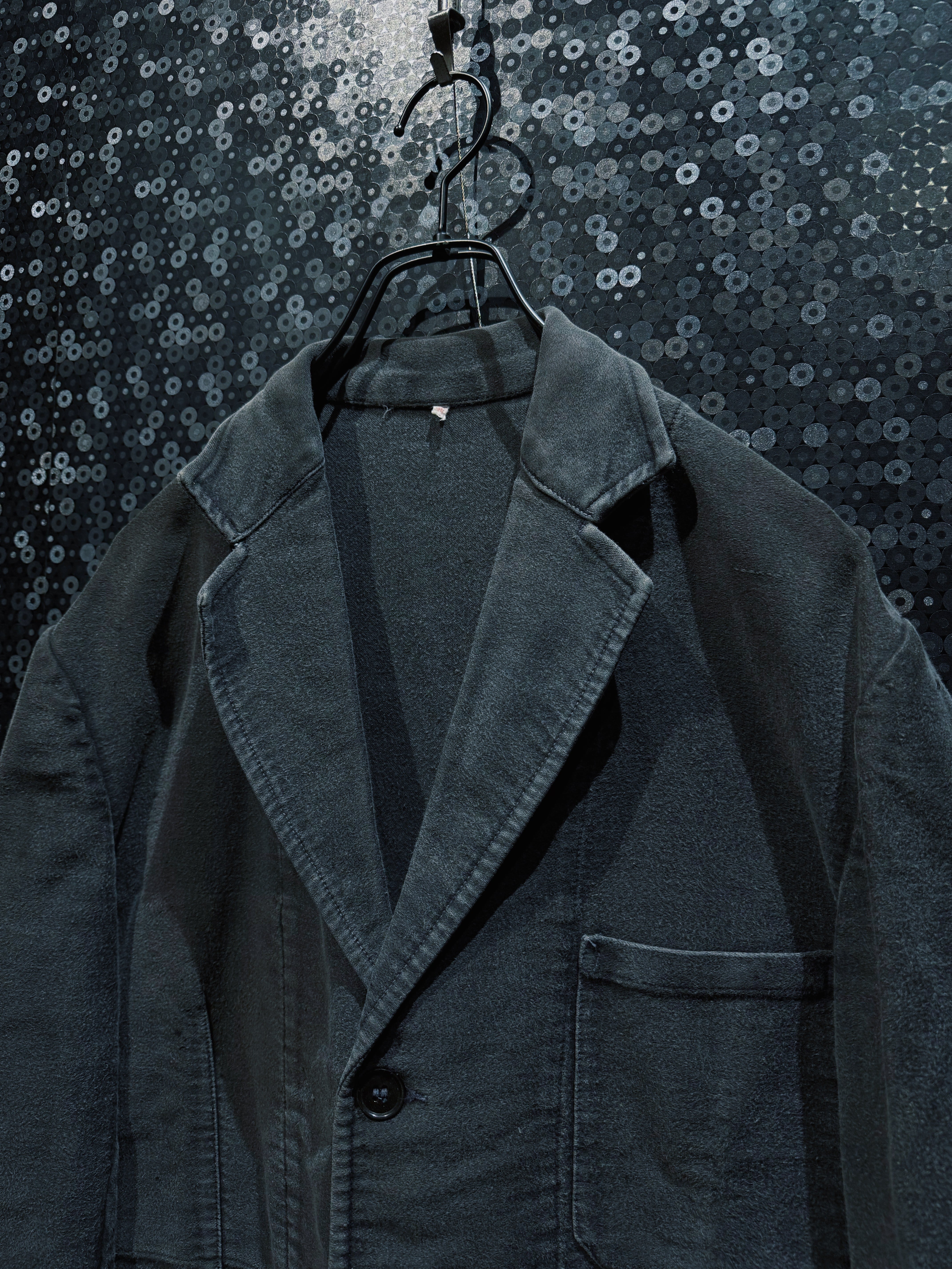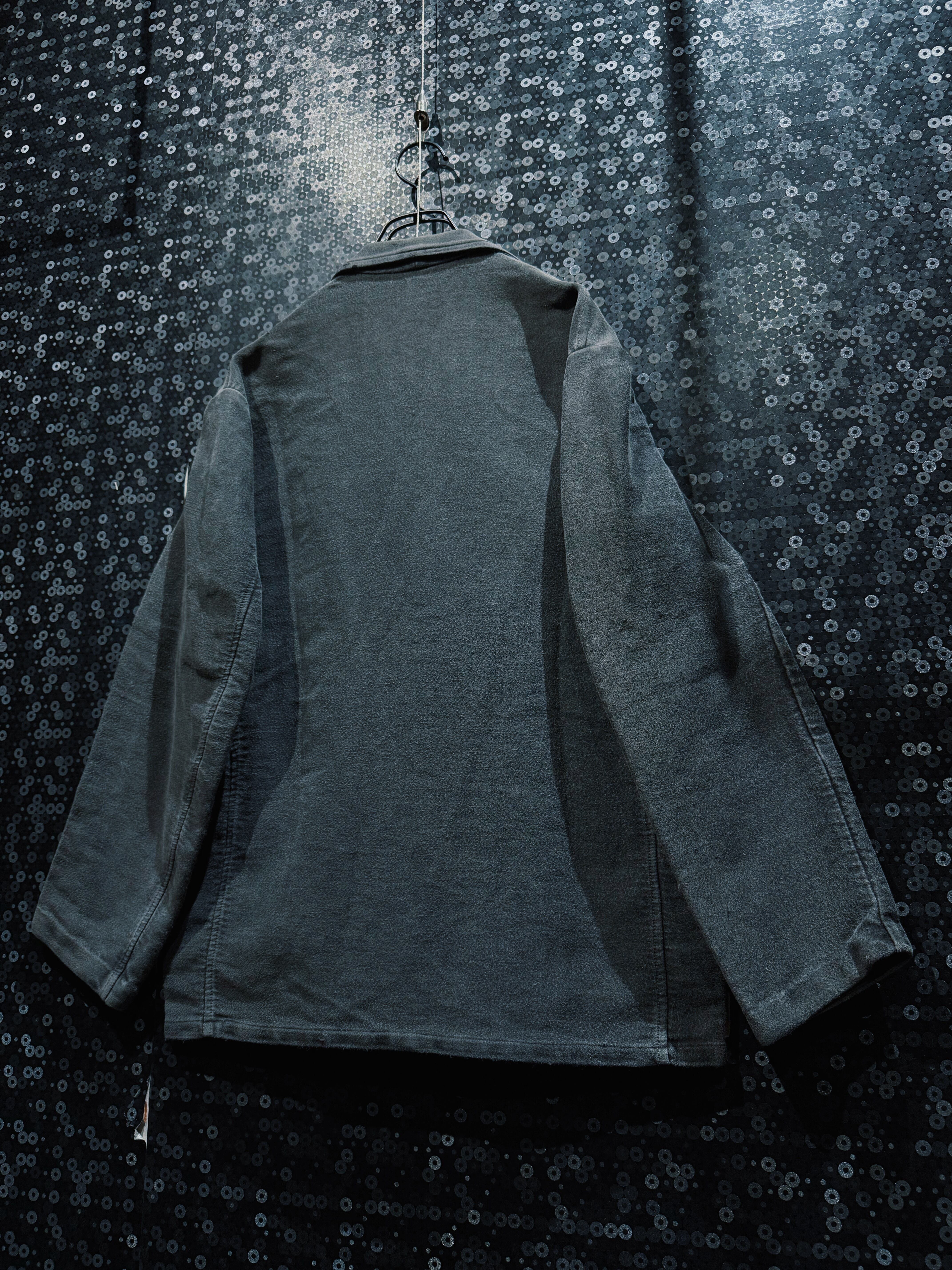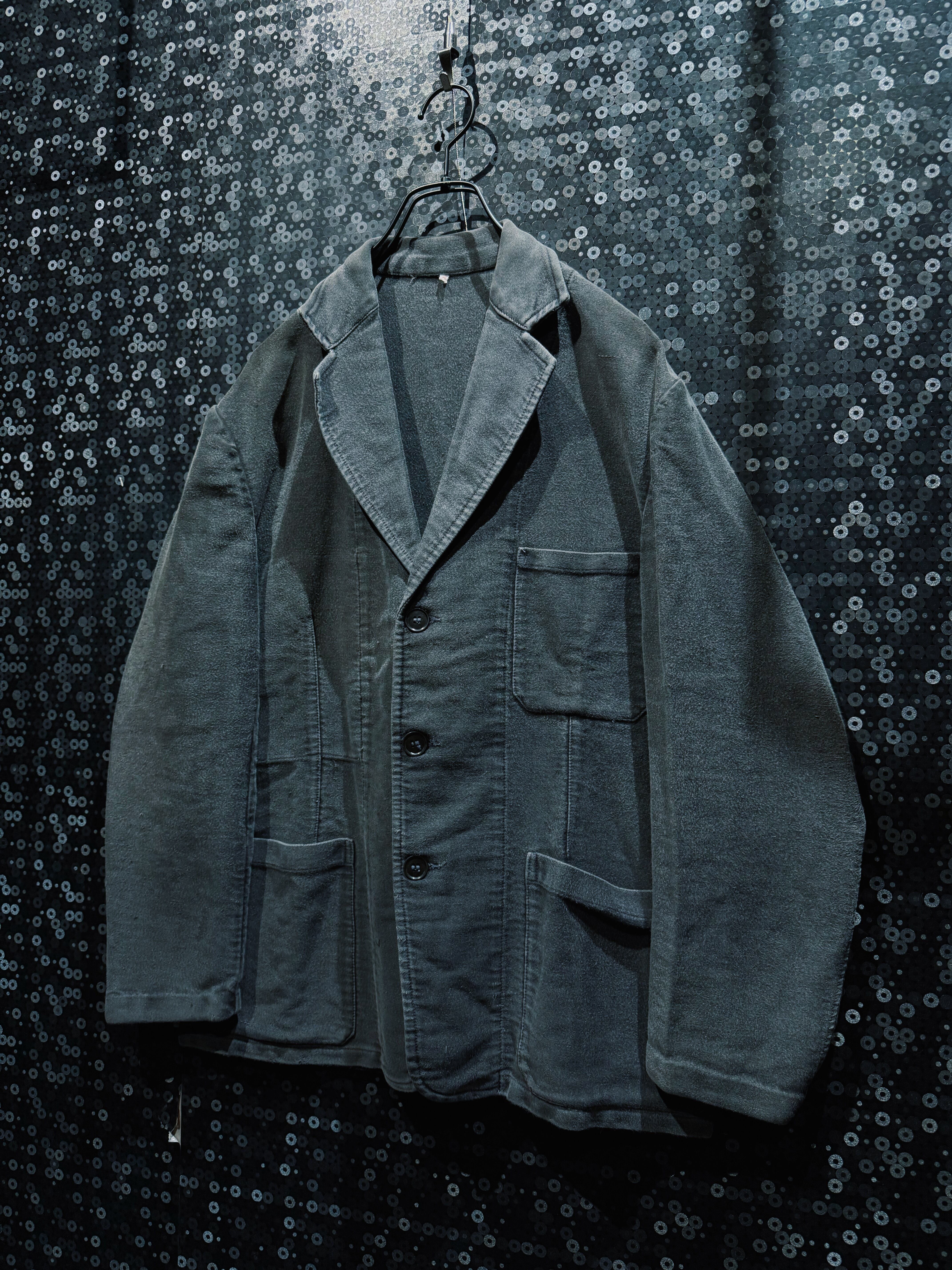 フレンチヴィンテージを象徴する素材、ブラックモールスキンを使用したワークテーラードジャケット。黒モル特有の、長年の着用によってのみ生まれるフェードとムラ感が全面に現れており、新品や後年の復刻では決して再現できない圧倒的な奥行きを持つ一着。もともとは労働着として作られた生地だからこそ、タフでありながら、使い込まれるほどに柔らかく、鈍い光沢を帯びていく。