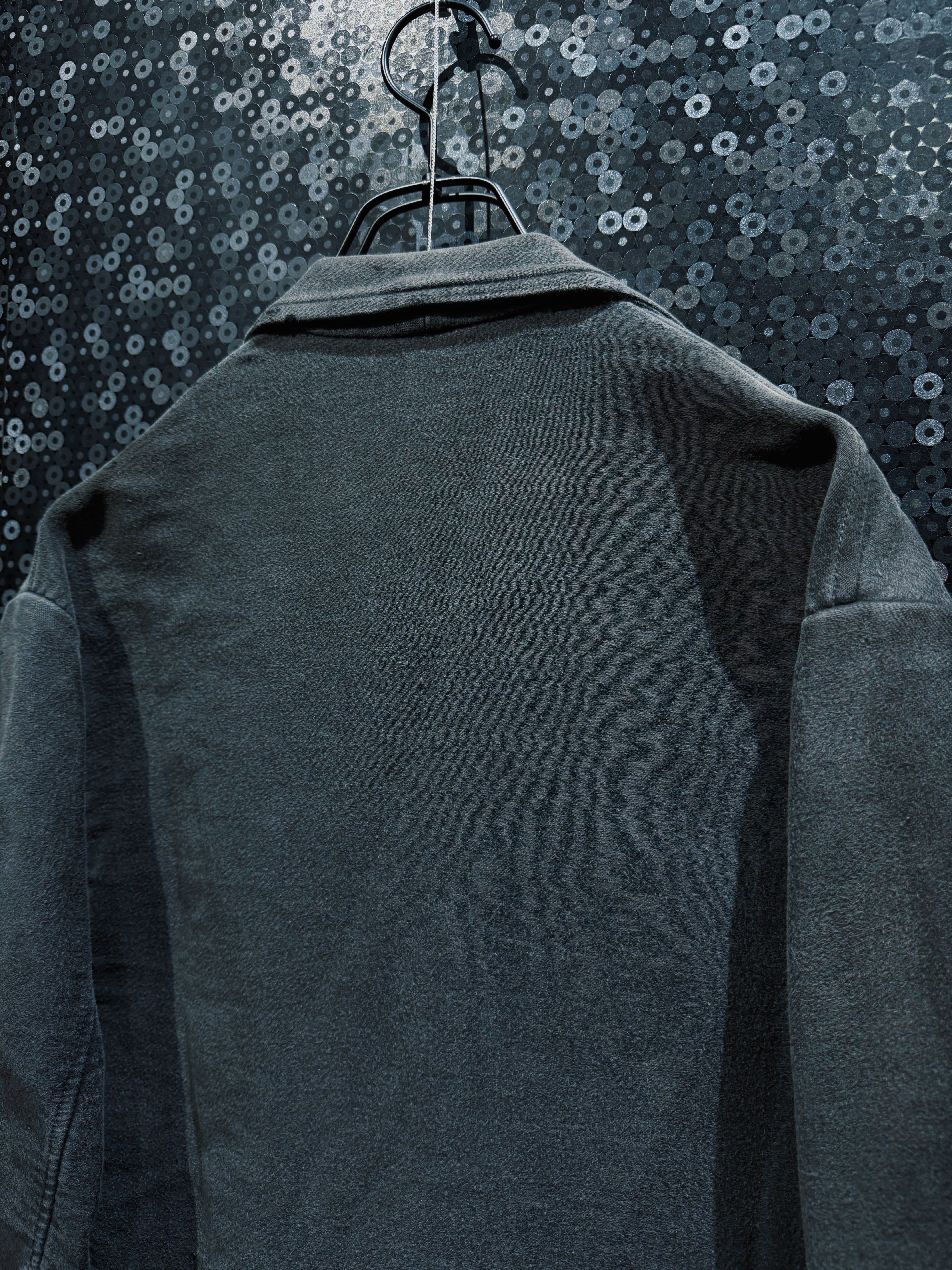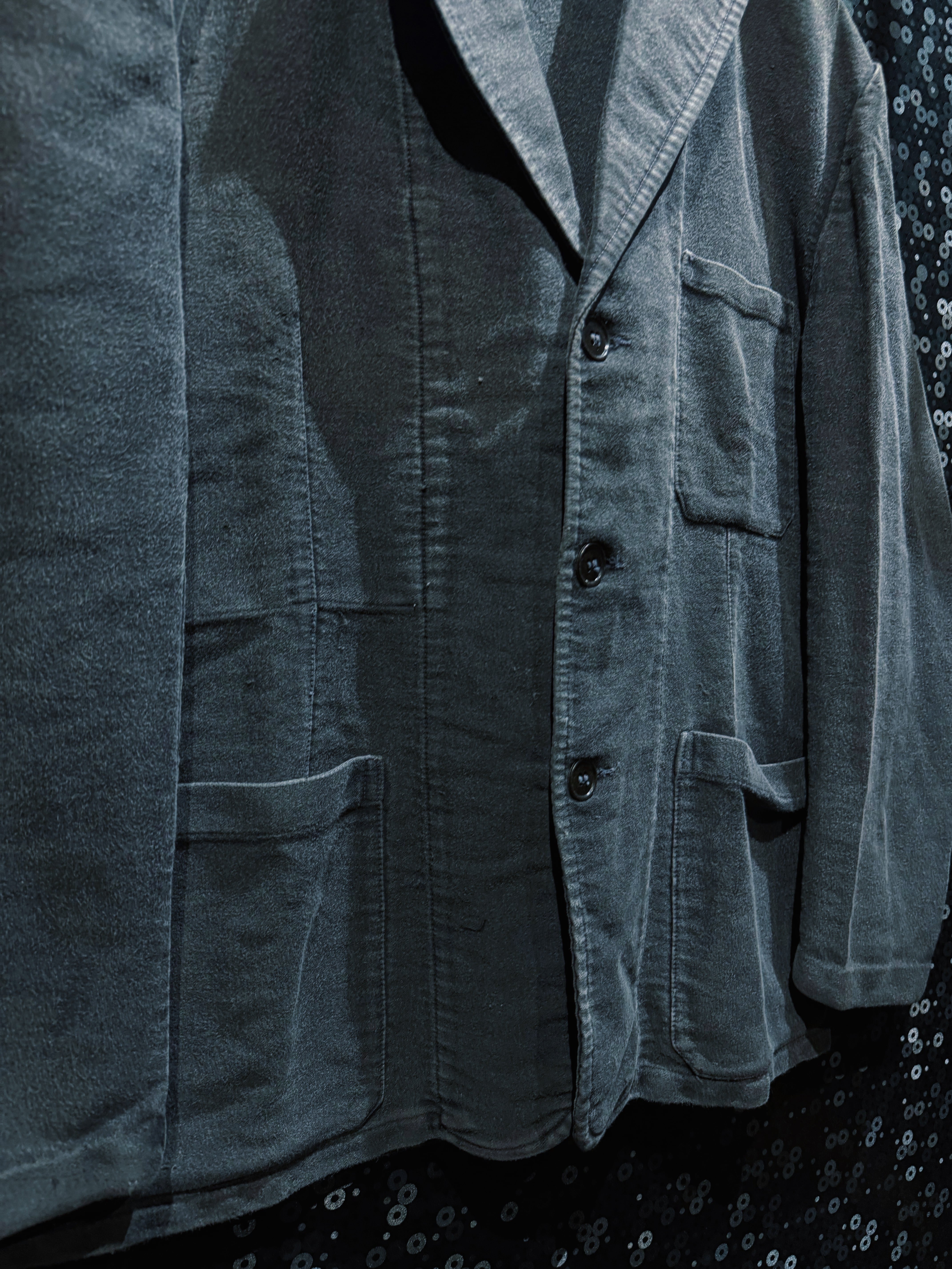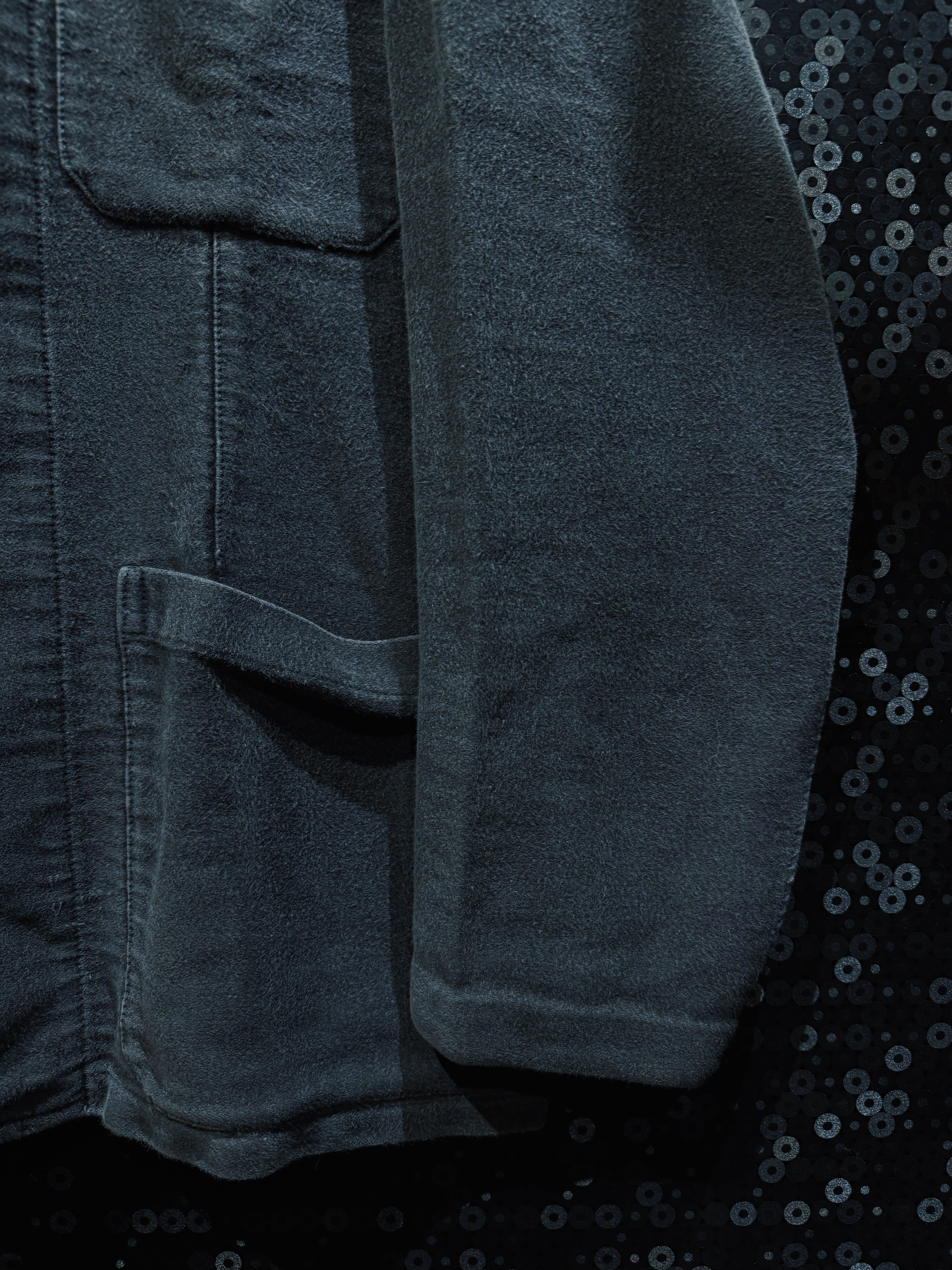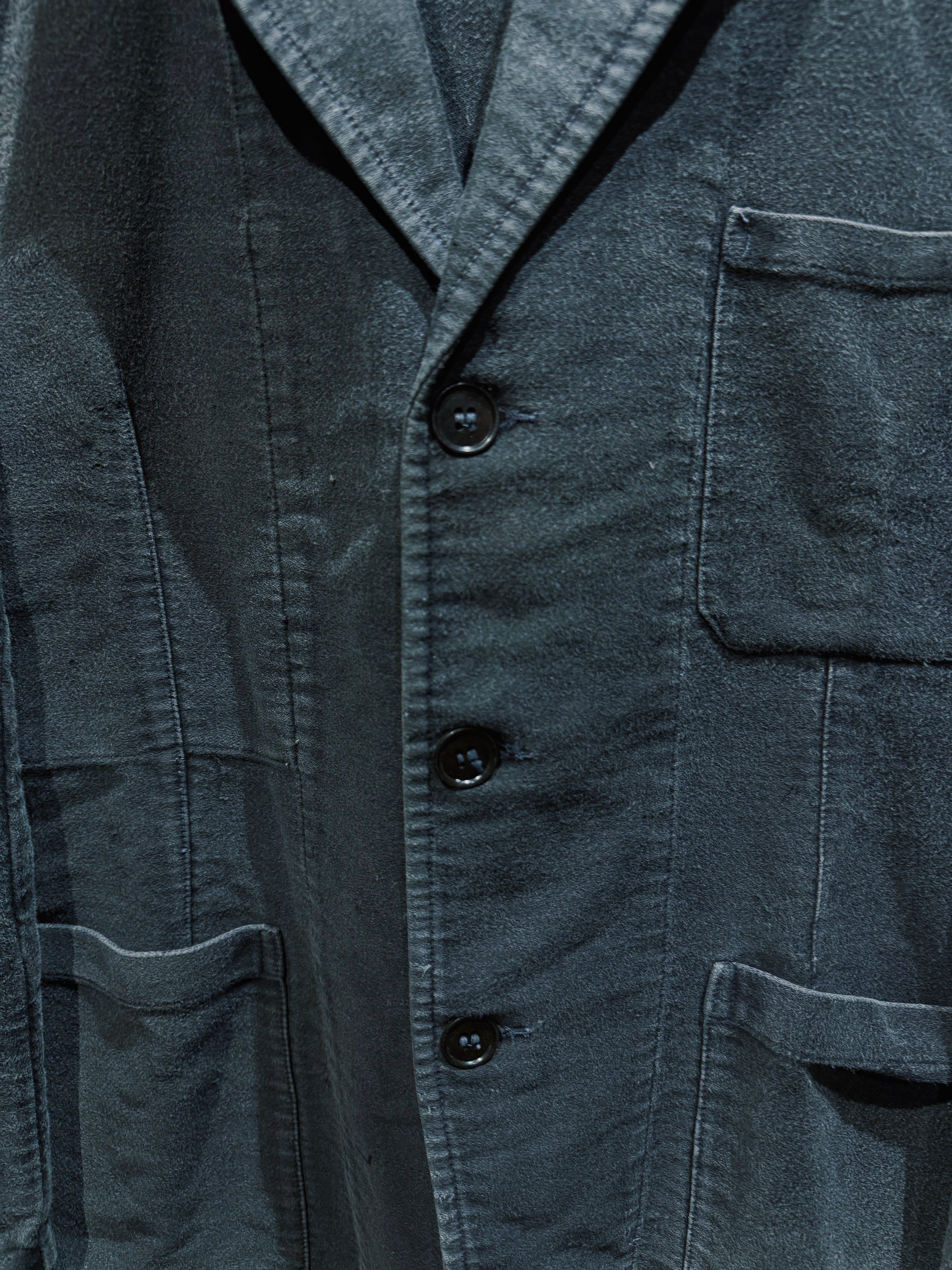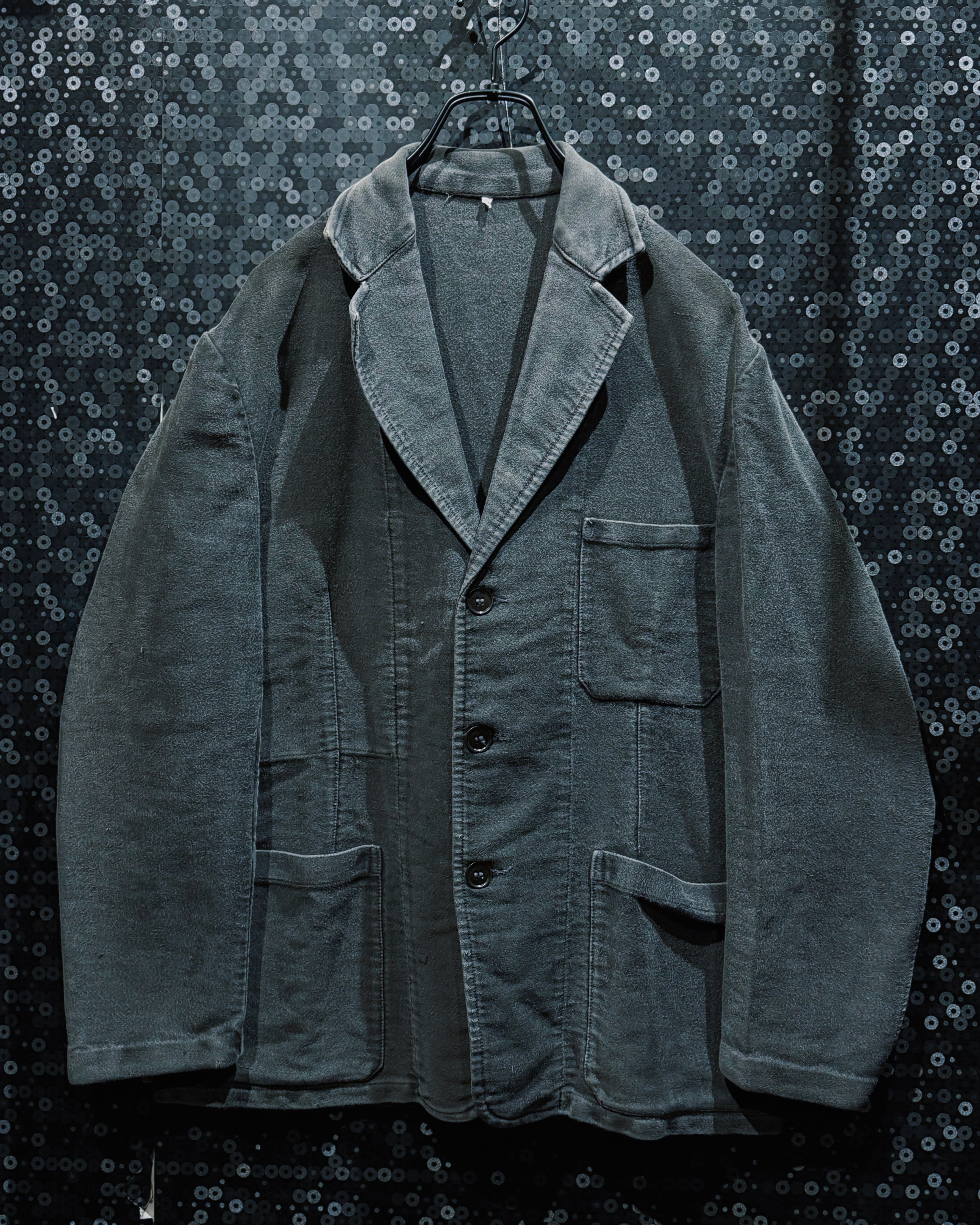 フレンチヴィンテージを象徴する素材、ブラックモールスキンを使用したワークテーラードジャケット。黒モル特有の、長年の着用によってのみ生まれるフェードとムラ感が全面に現れており、新品や後年の復刻では決して再現できない圧倒的な奥行きを持つ一着。もともとは労働着として作られた生地だからこそ、タフでありながら、使い込まれるほどに柔らかく、鈍い光沢を帯びていく。