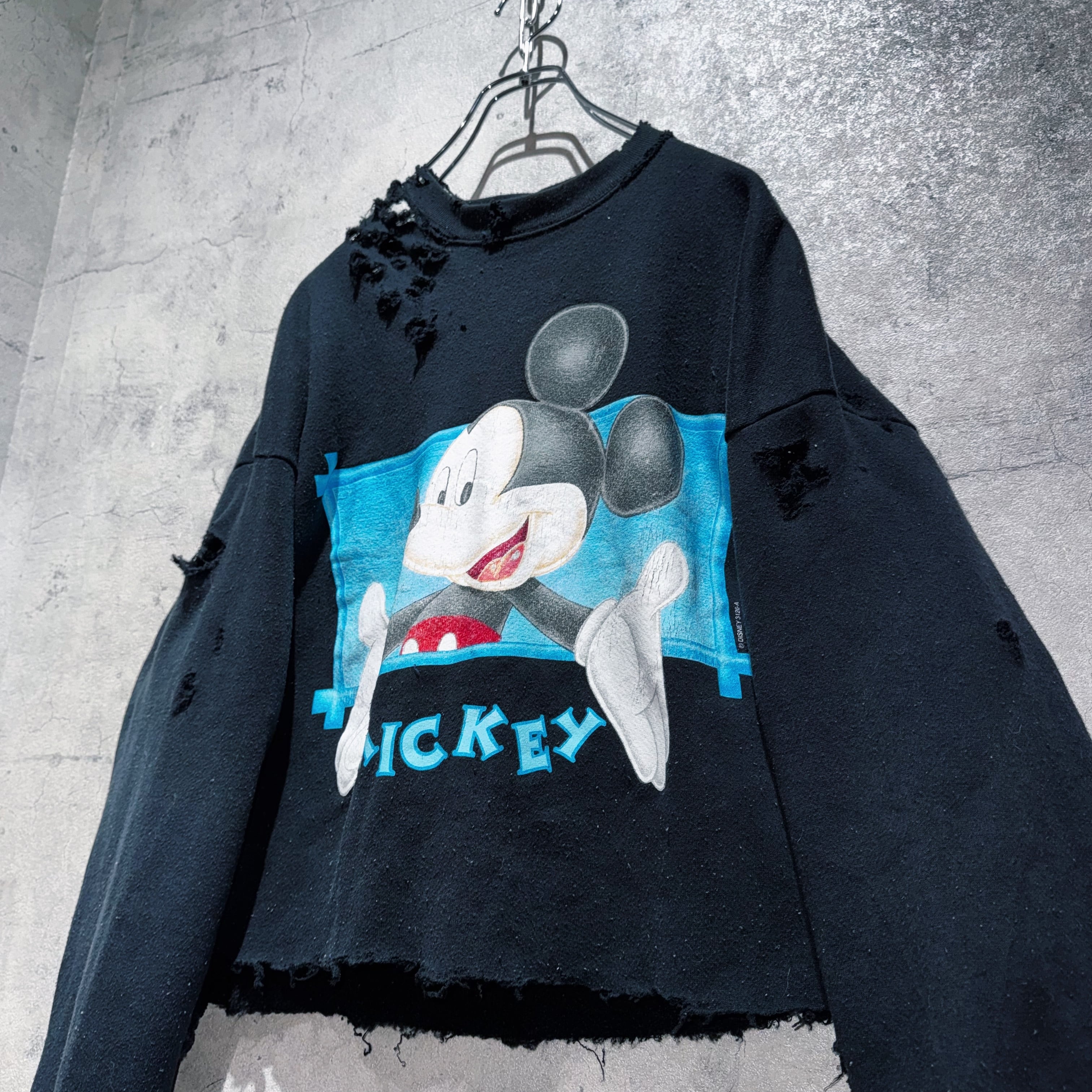 男女問わず着用できる一枚。ミッキーの可愛らしさに退廃的なボロデザインが見事に融合した唯一無二の逸品です。