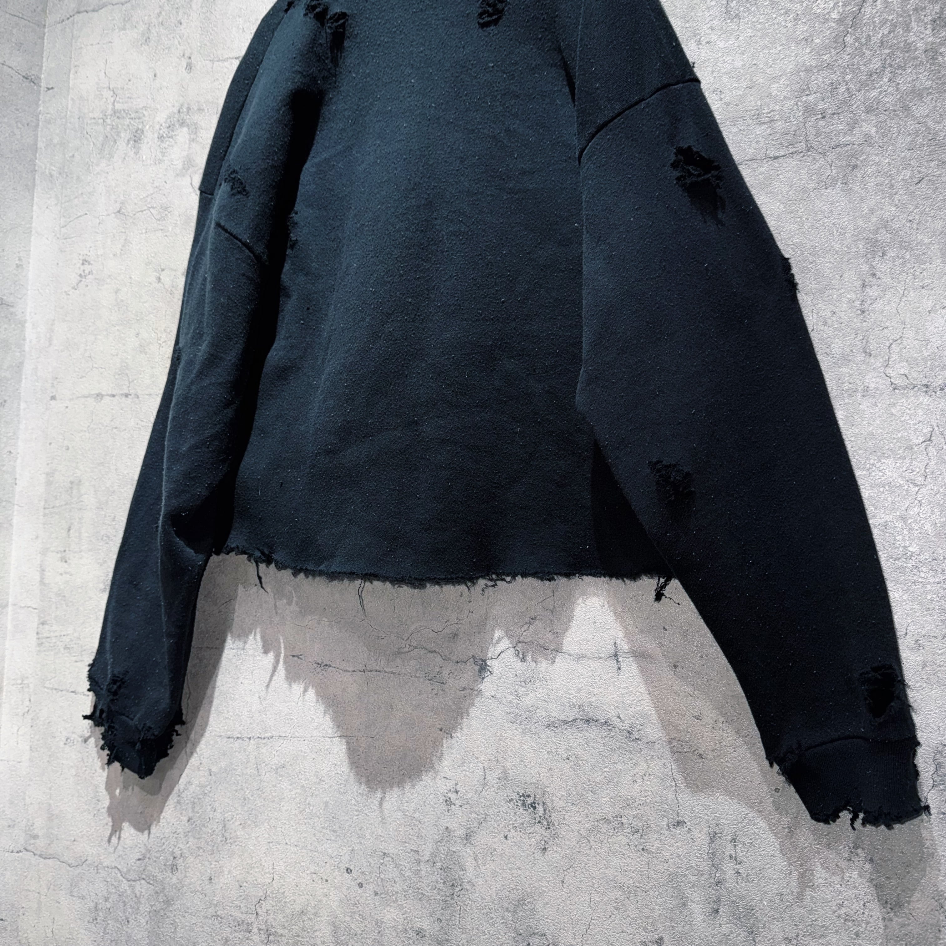今回はダメージ加工にもくわえ、大胆に丈をカットオフしクロップド丈に。着用時のシルエットがモダンになります。