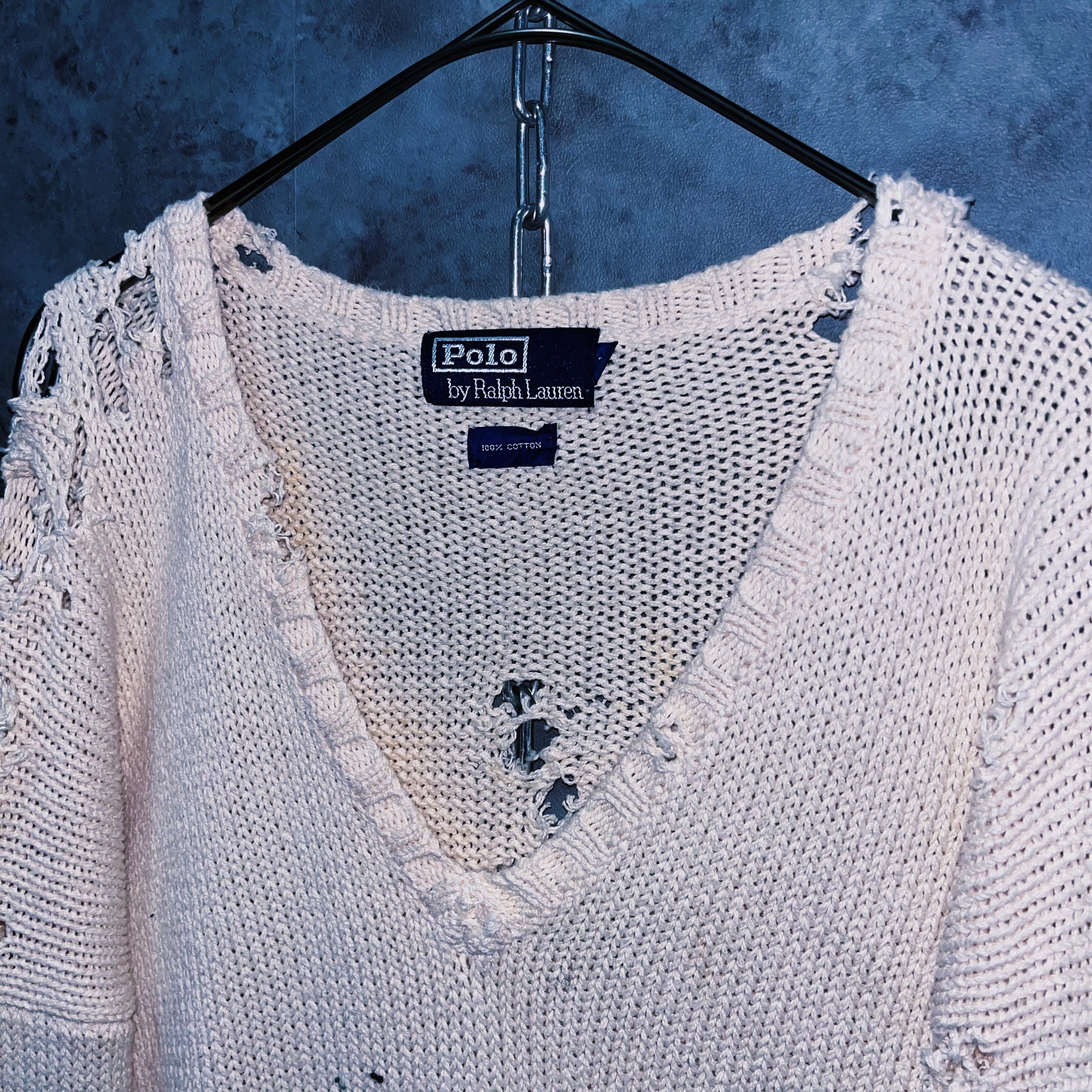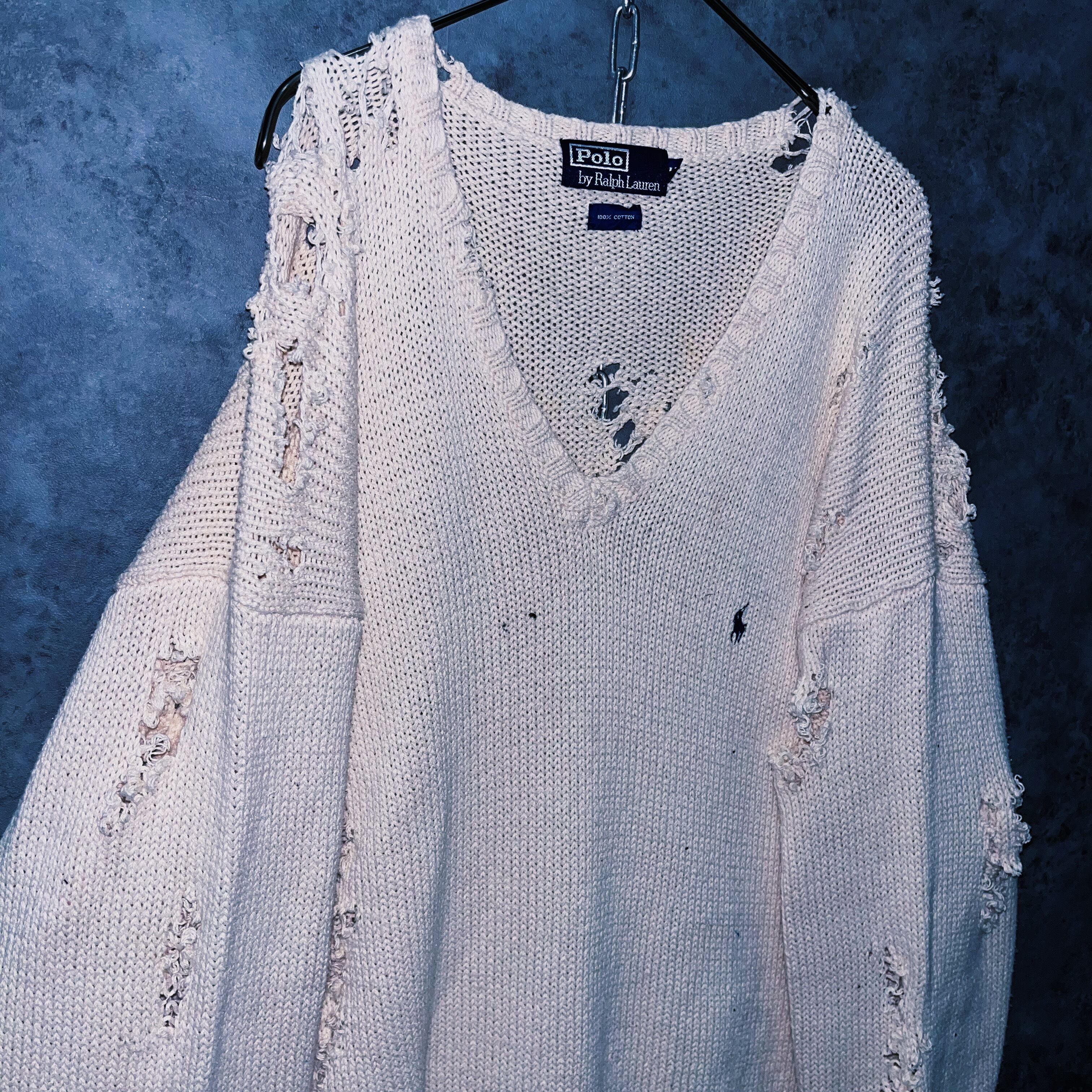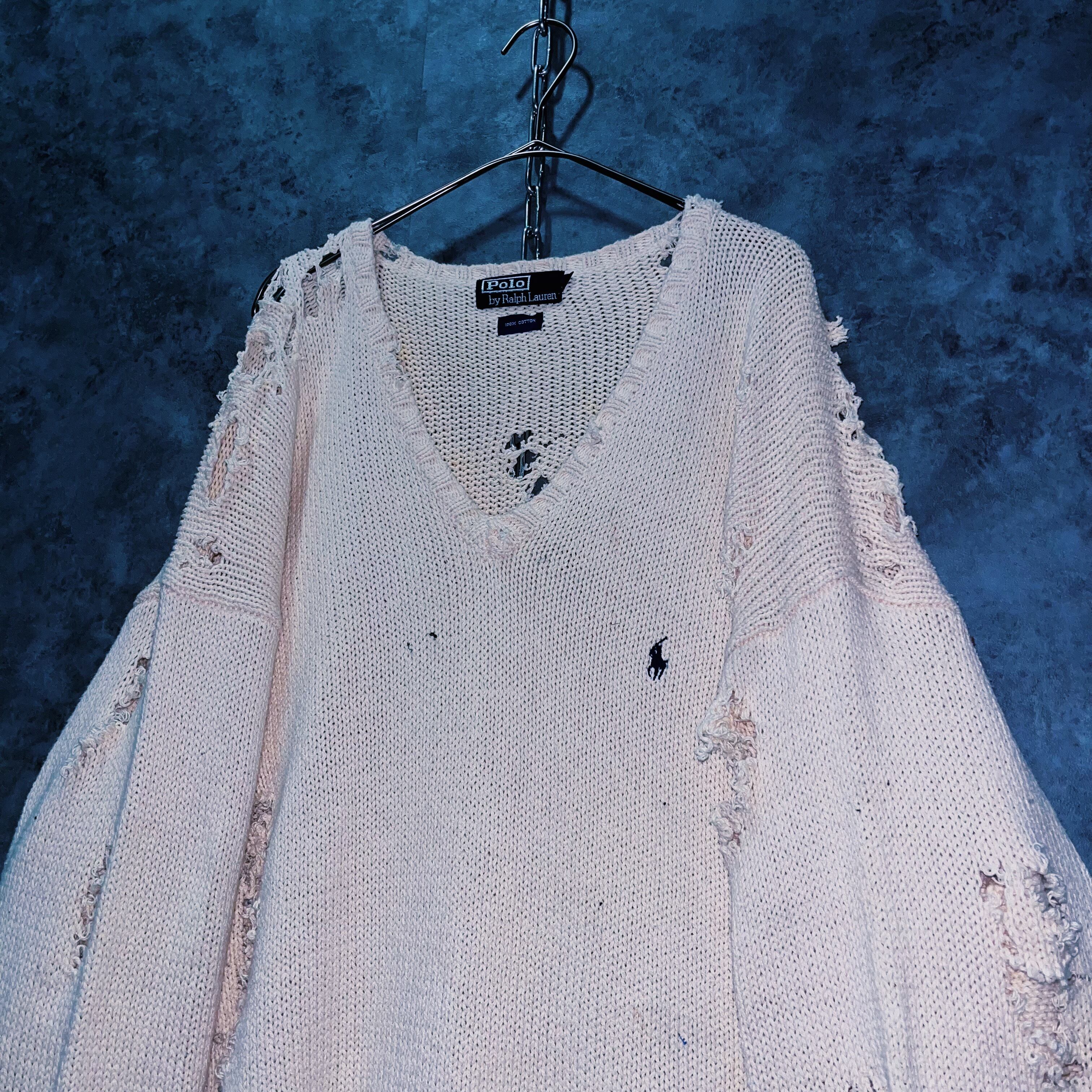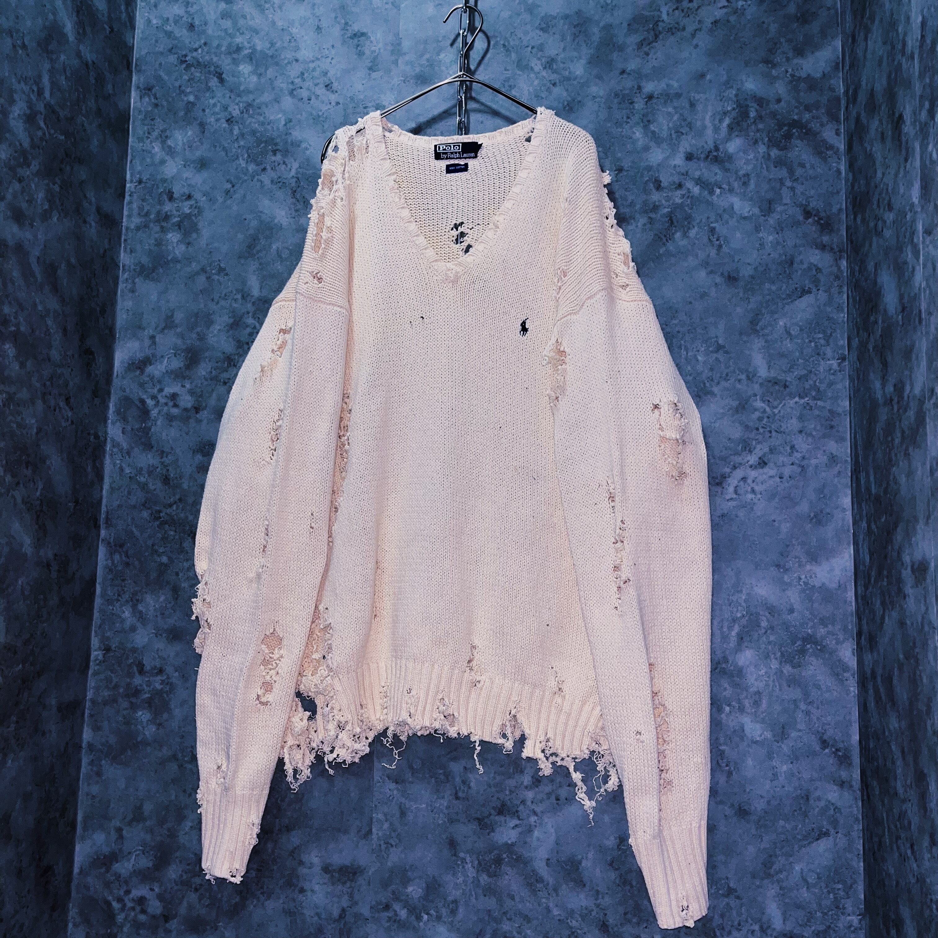 90’sヴィンテージ“ポロラルフローレン”ホワイトカラープレーンデザインボロカスタムコットンニットセーター