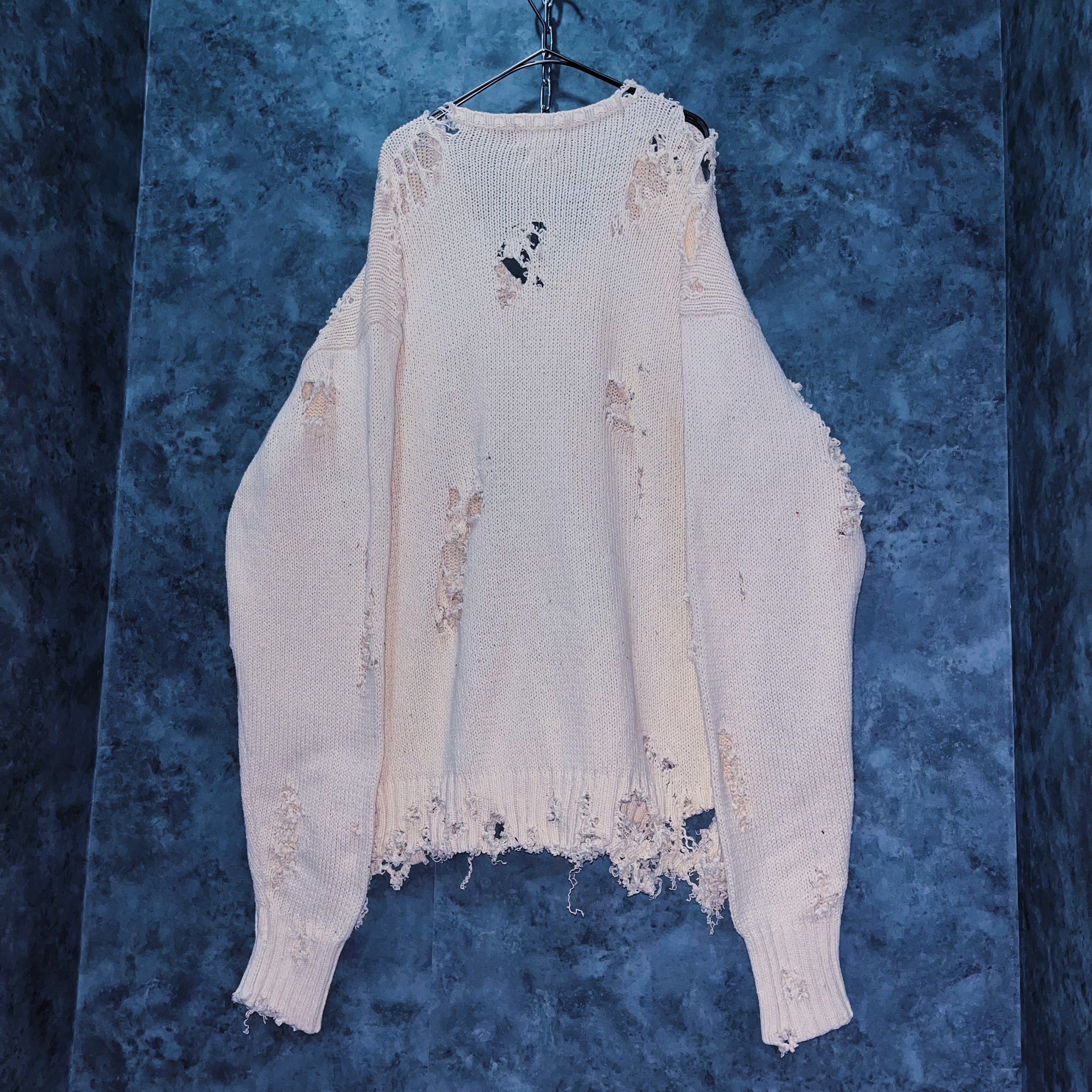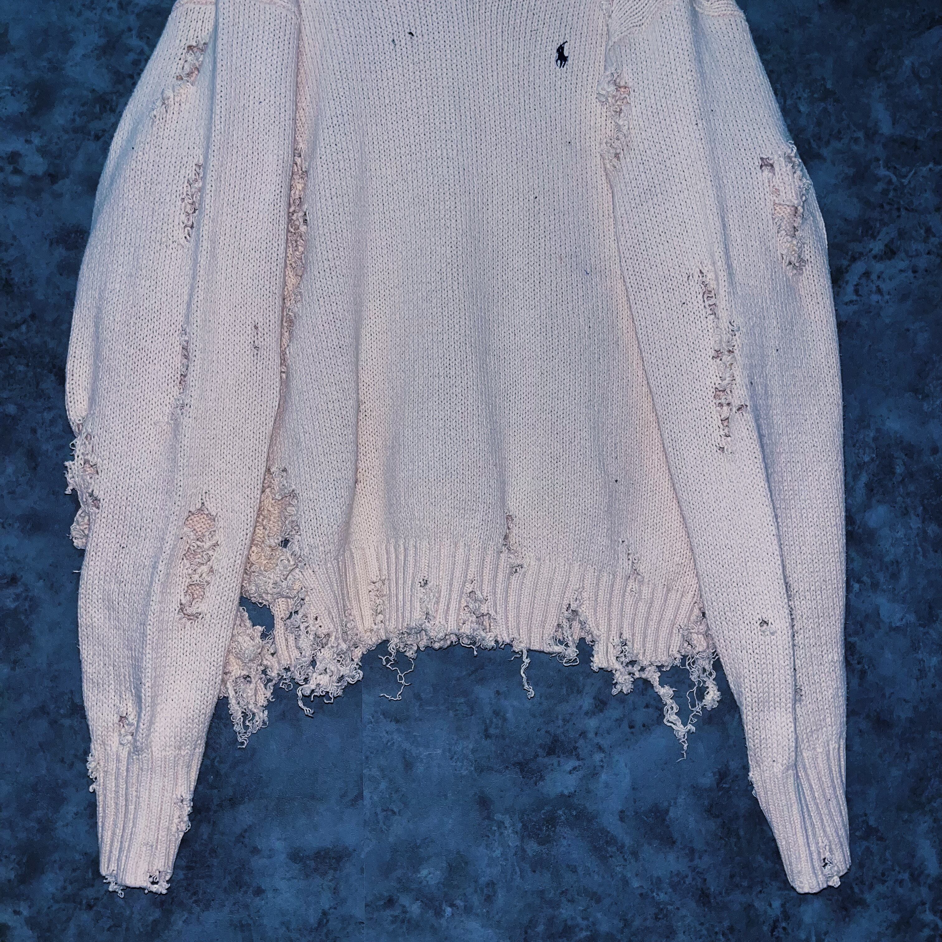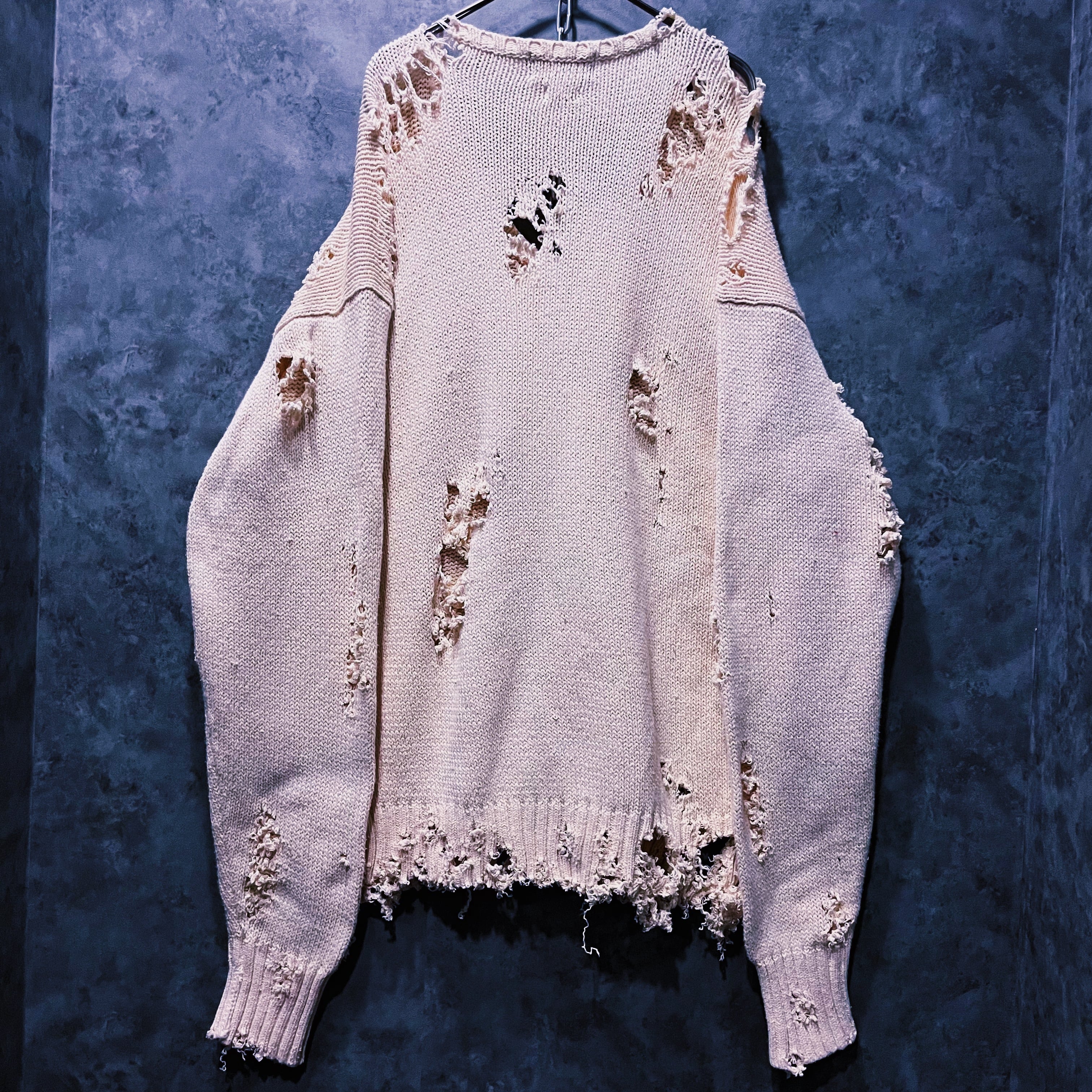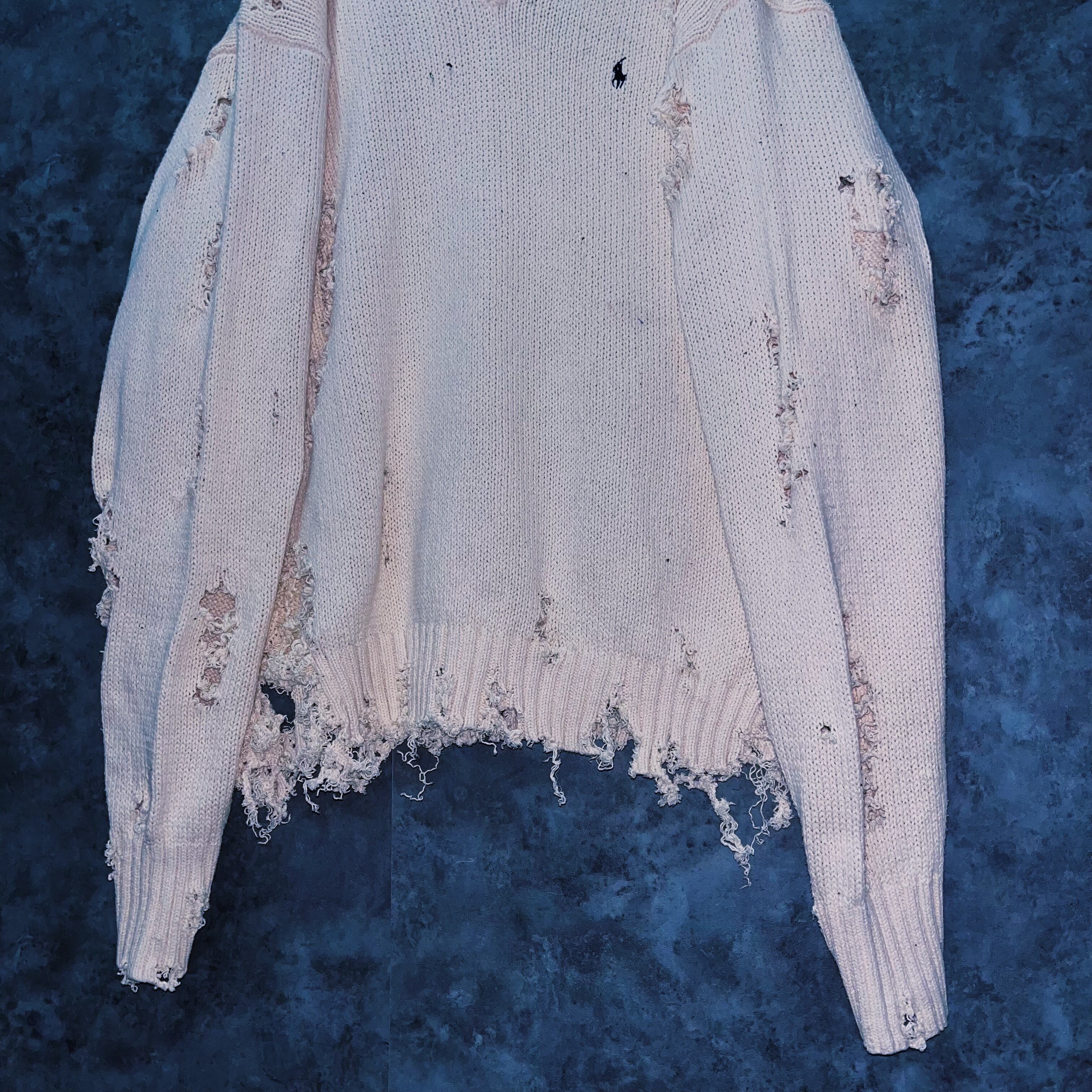 柔らかなホワイトカラーのポロのニットセーターを大胆にボロカスタムした一着。