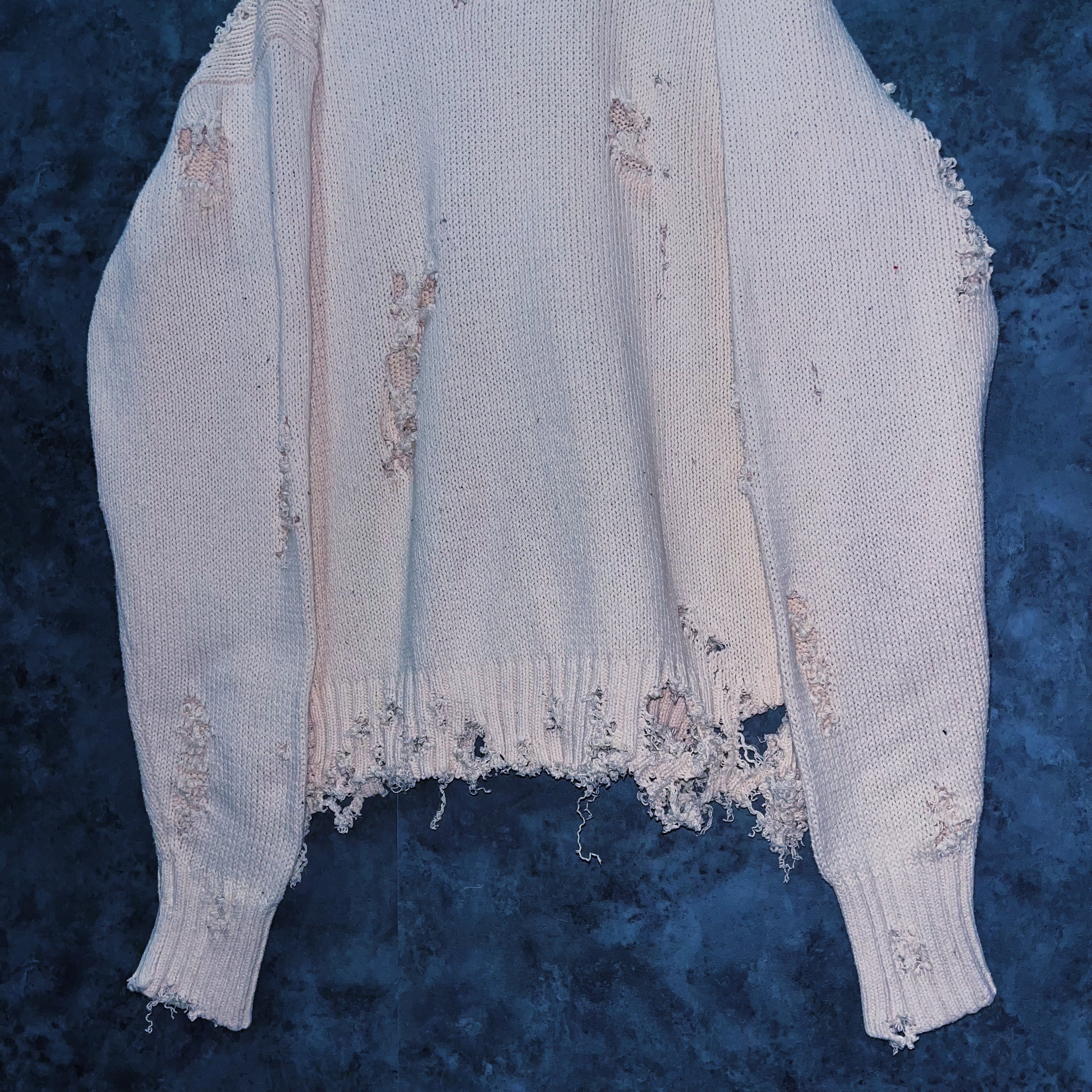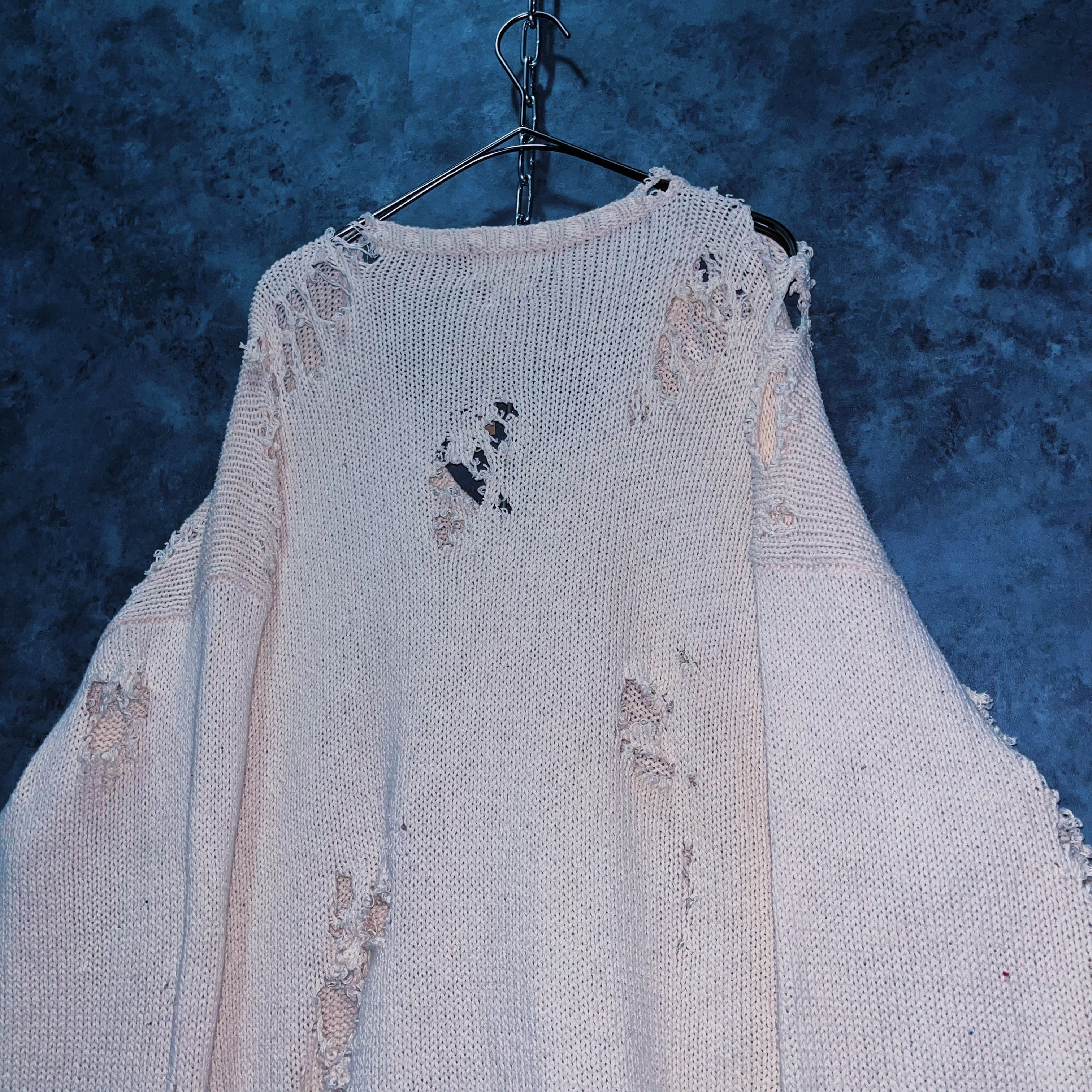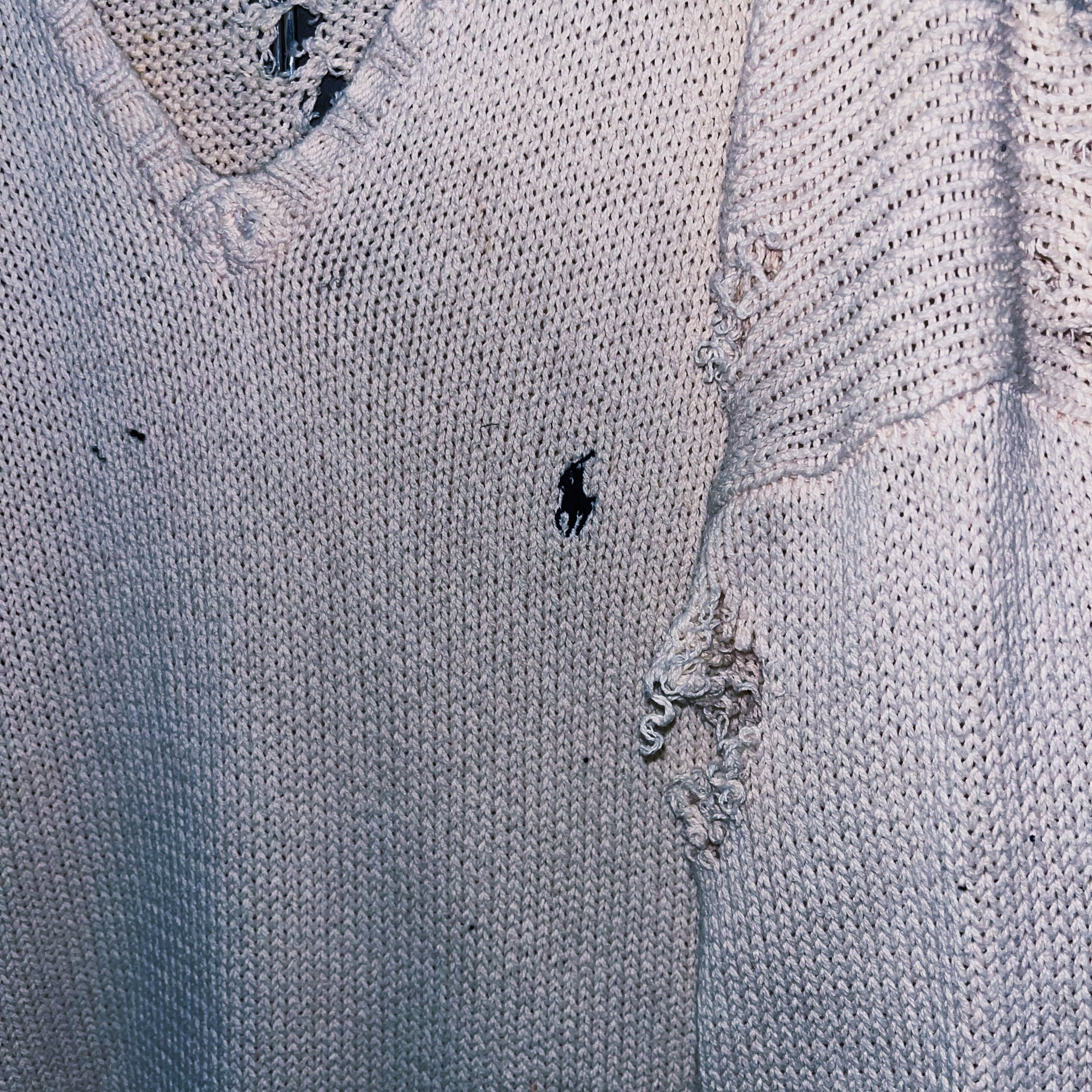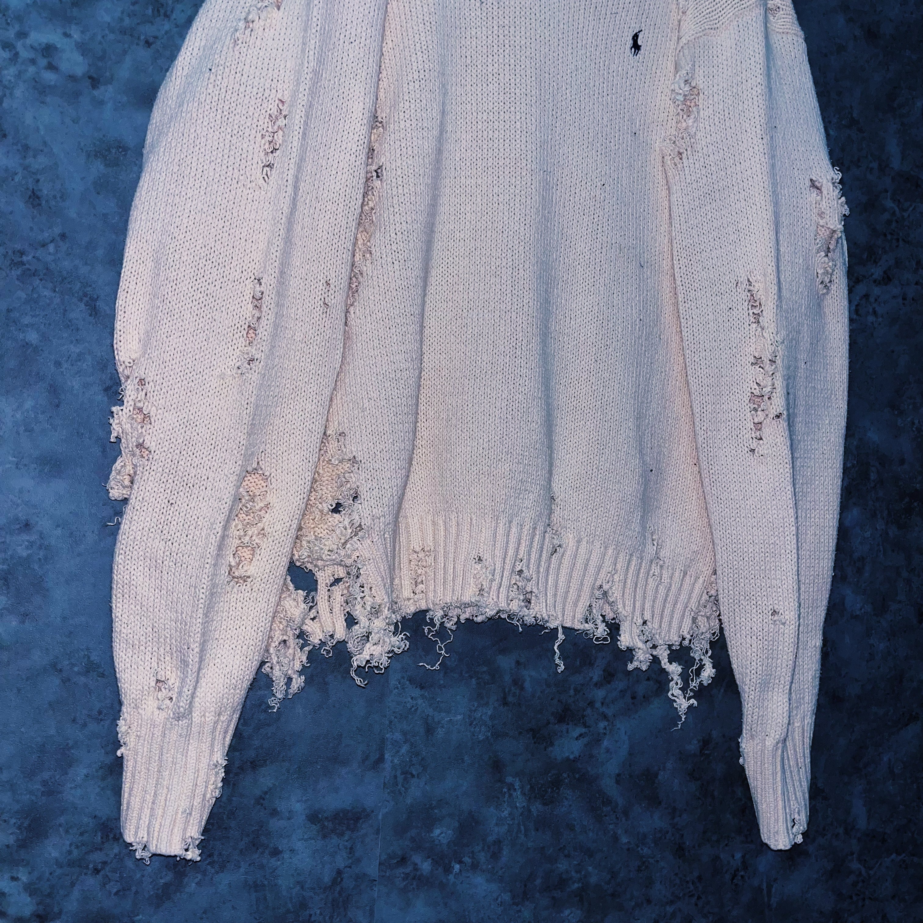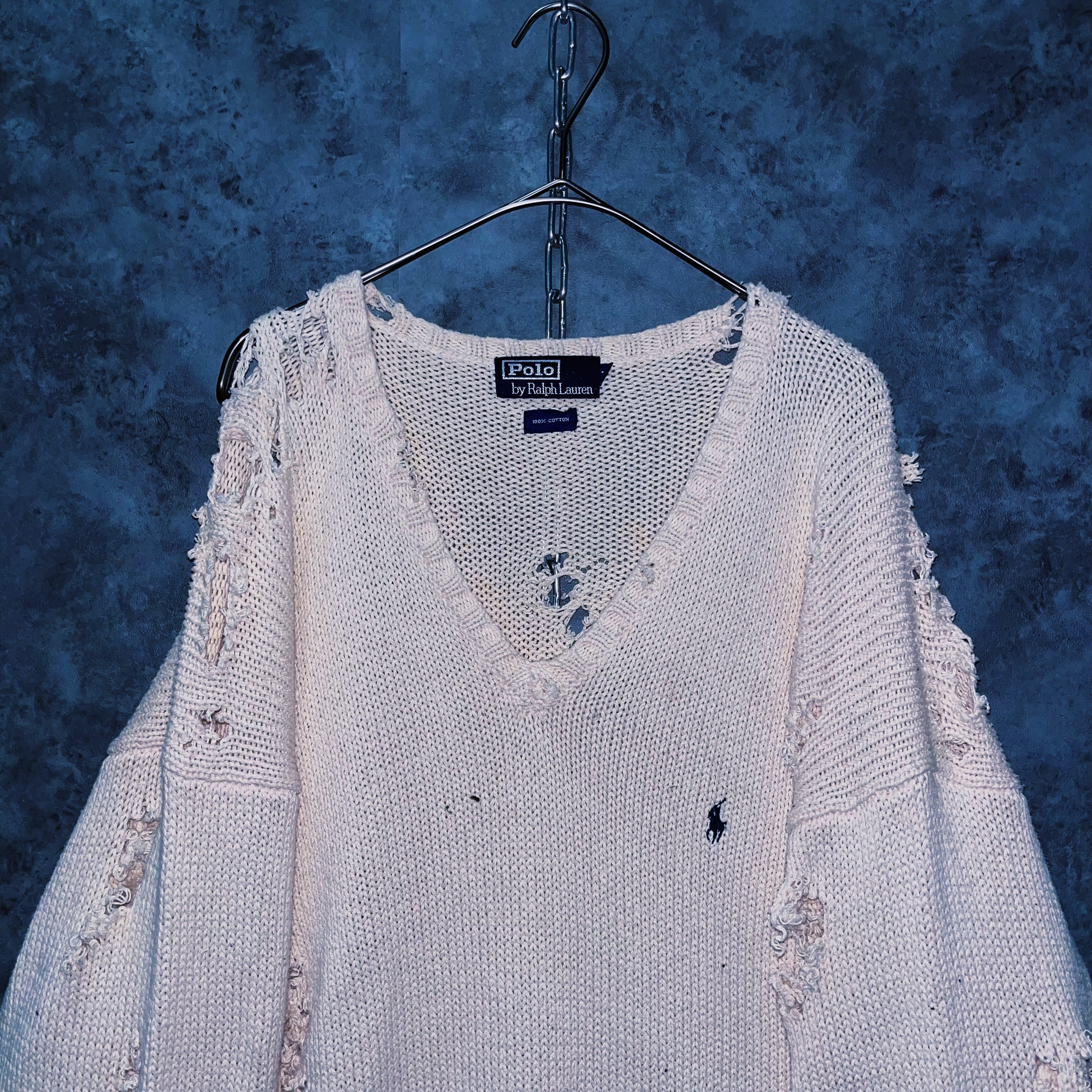 柔らかなホワイトカラーのポロのニットセーターを大胆にボロカスタムした一着。