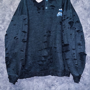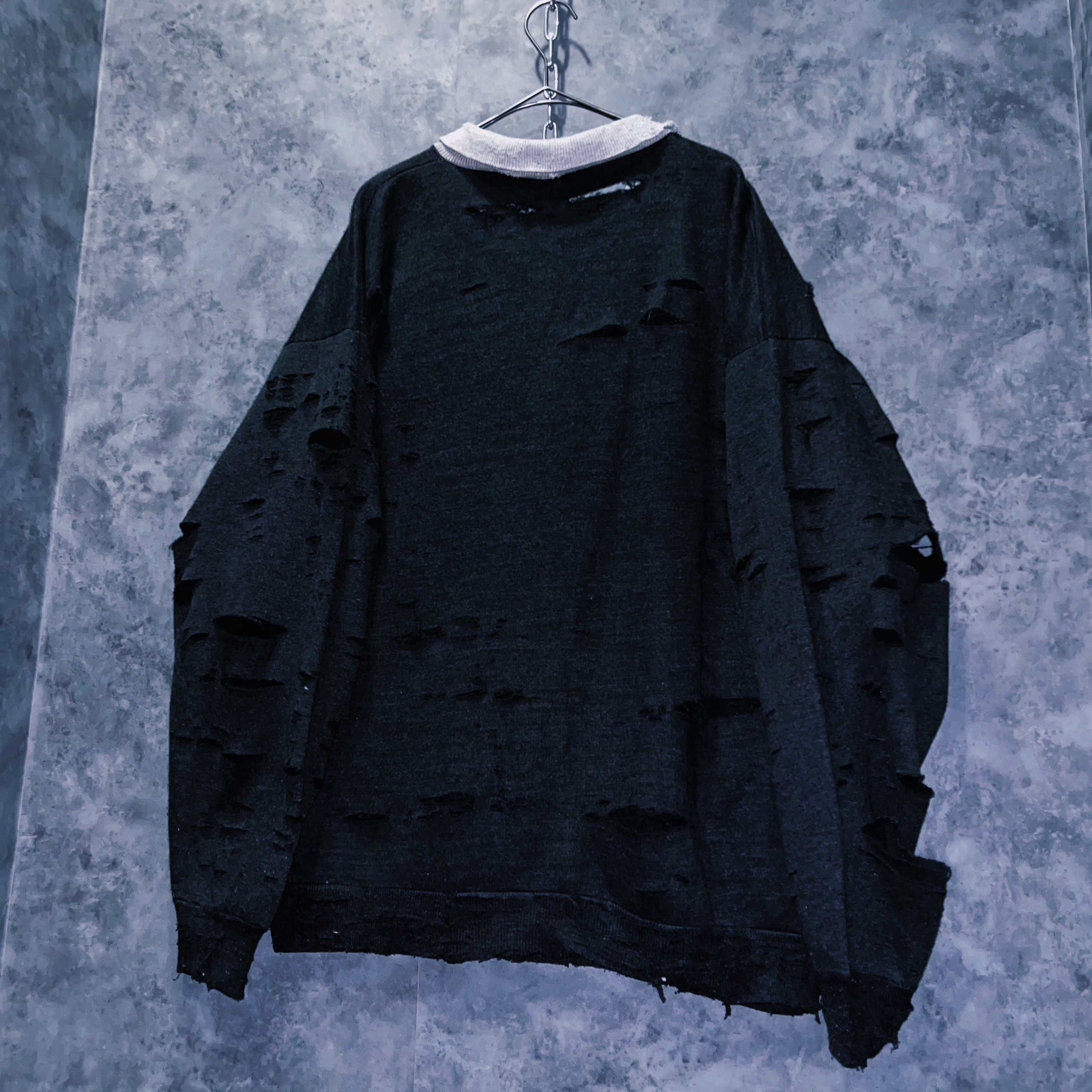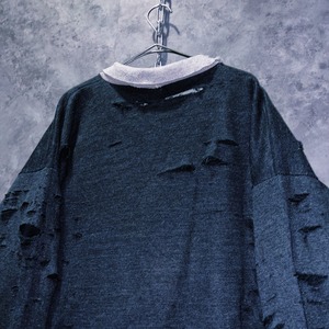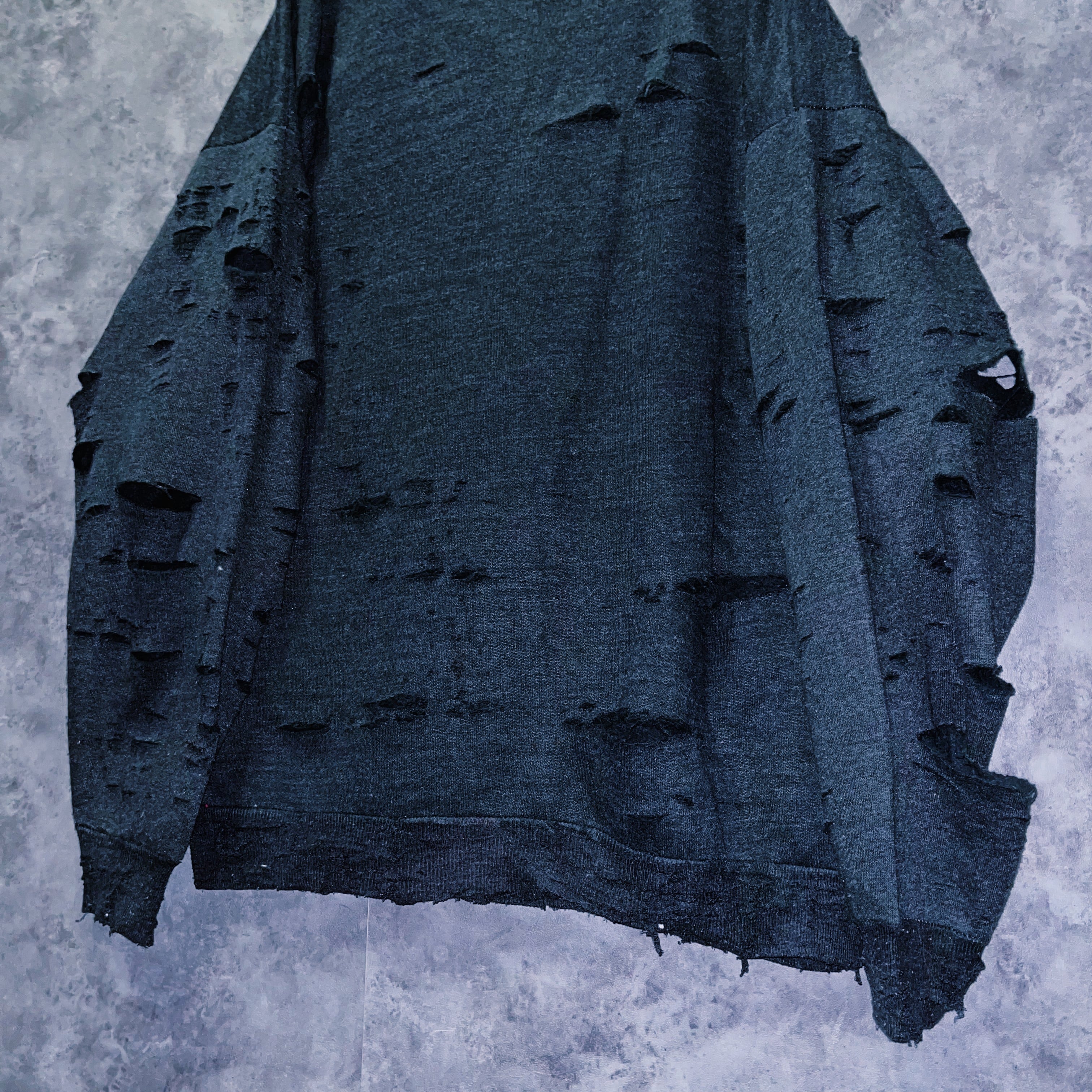 当店自慢のボロ加工が施されたことでダークな雰囲気に一気に加速をつけています。少し毛羽だったような生地感のおかげでグランジすぎることなくソフトな質感になっており、普段リメイクや、ダメージを着ない方でも挑戦しやすい仕上がり。