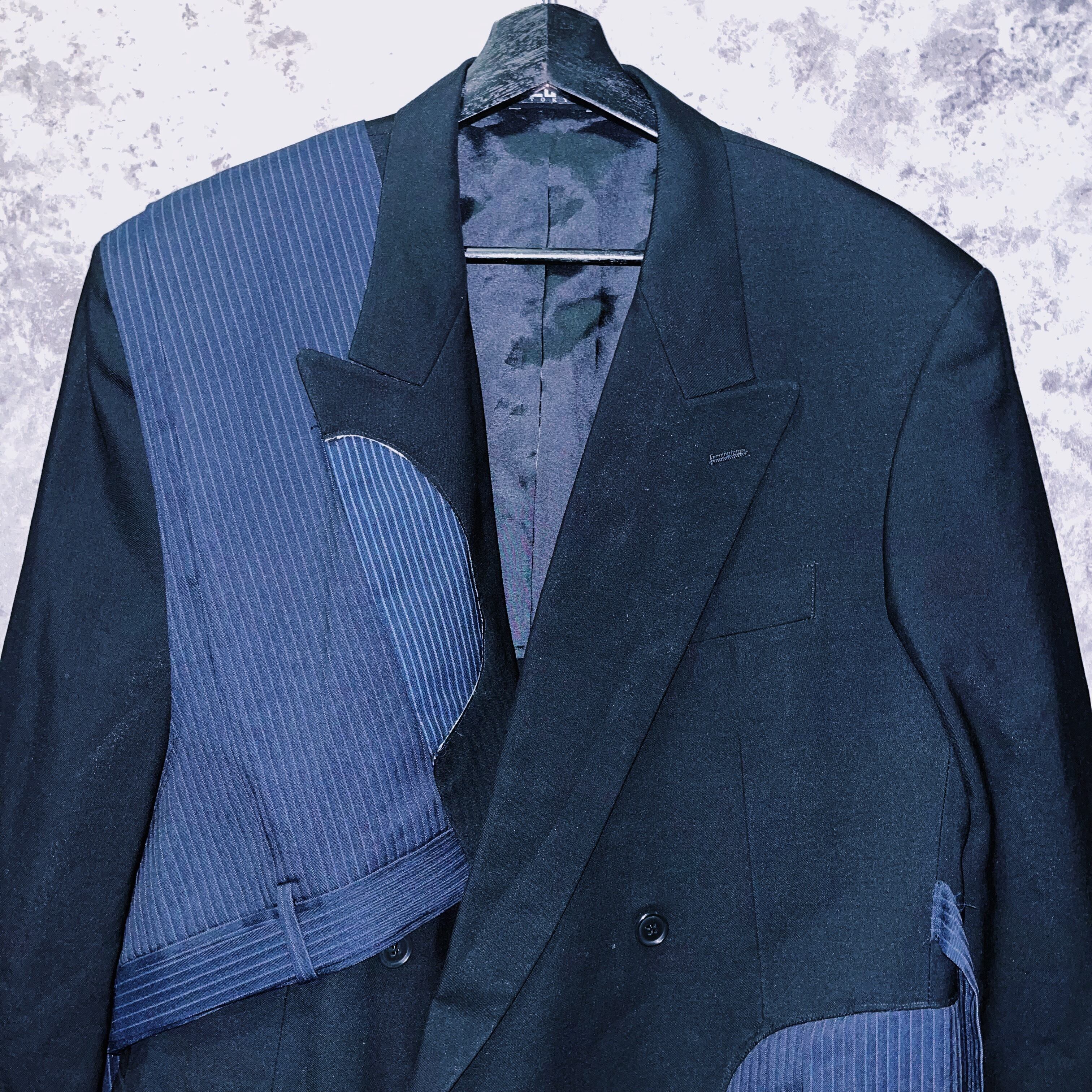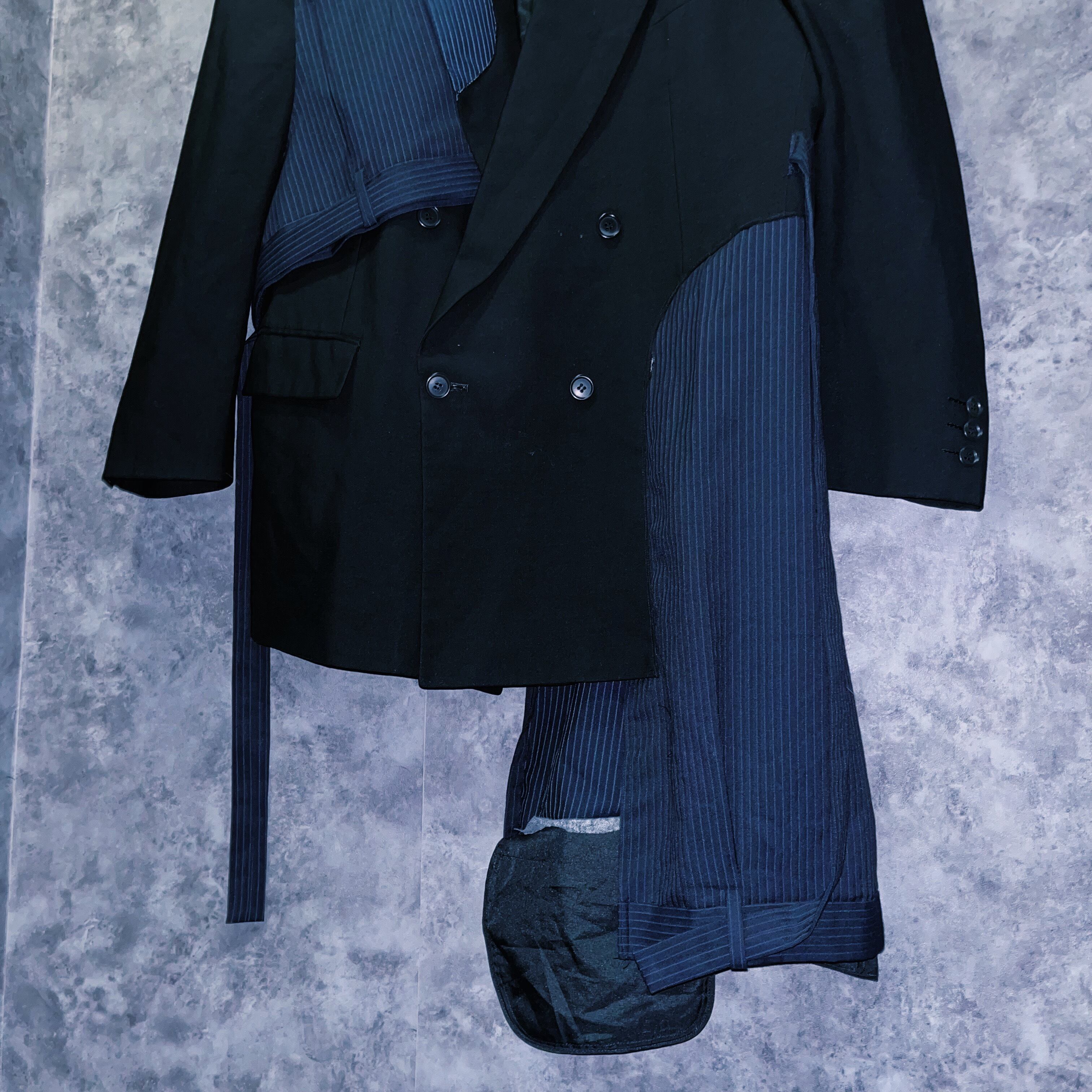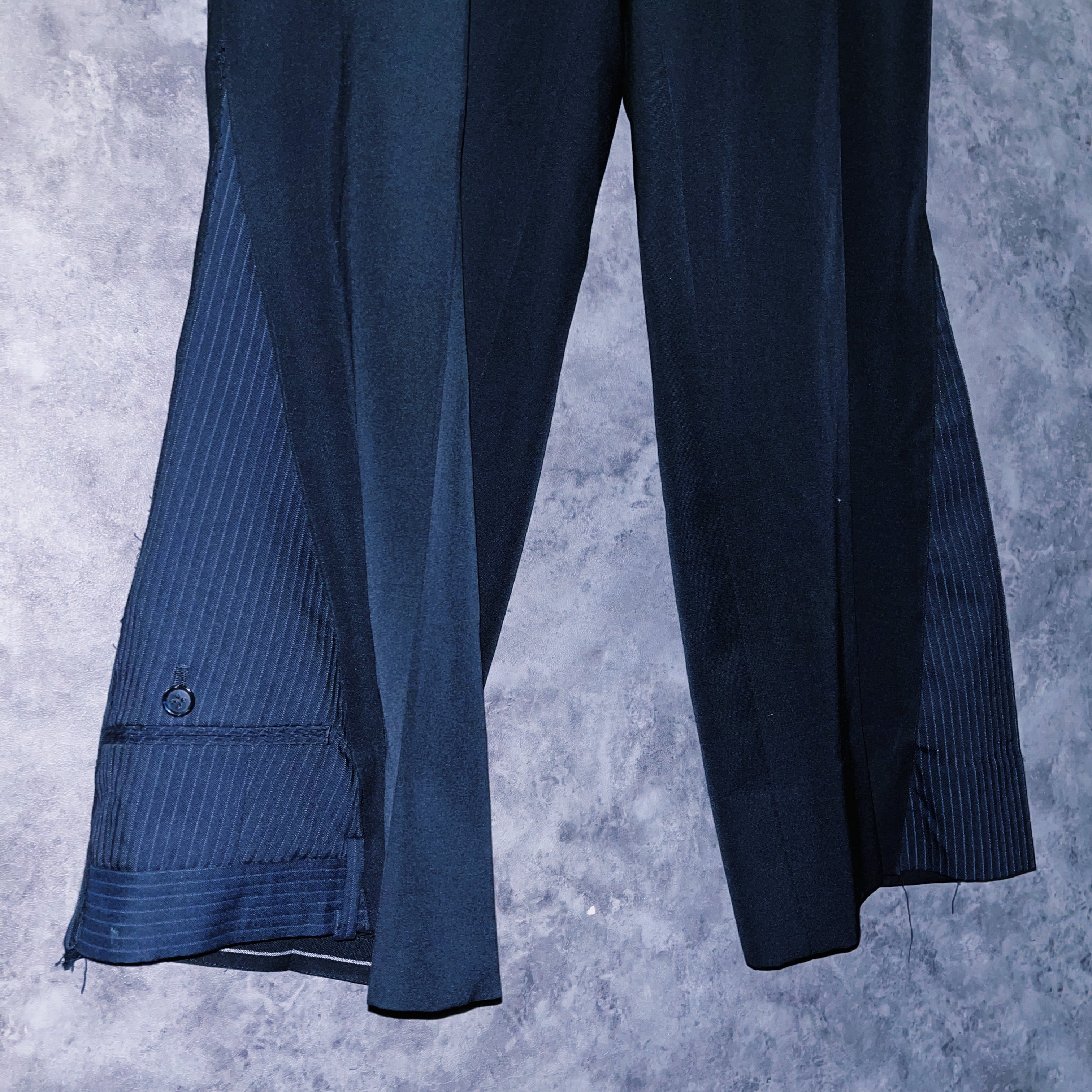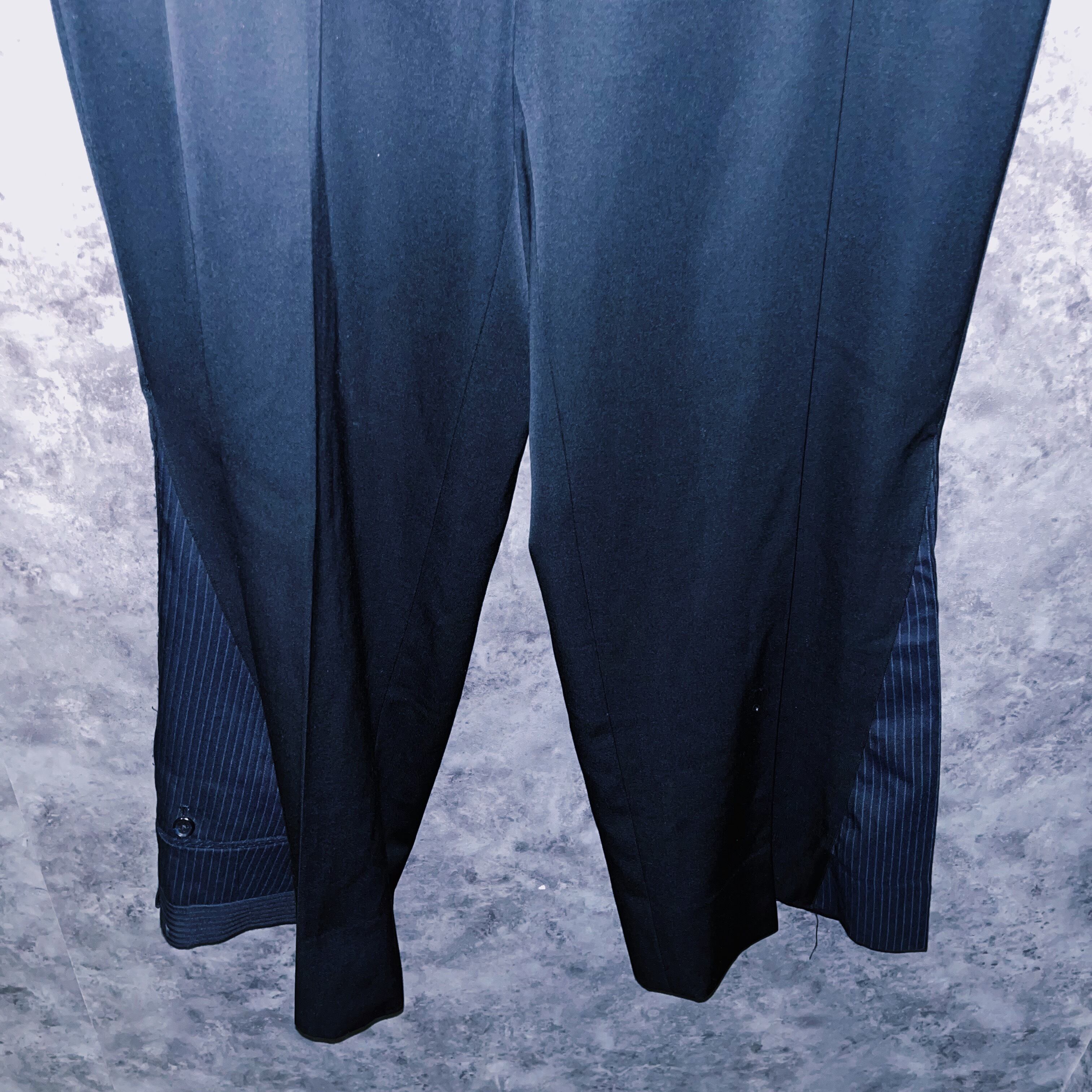ブラックカラーを基調に、ジャケットにパンツの一部を。パンツにもフレアシルエットになるように左右非対称にドッキングさせたデザインの一枚。