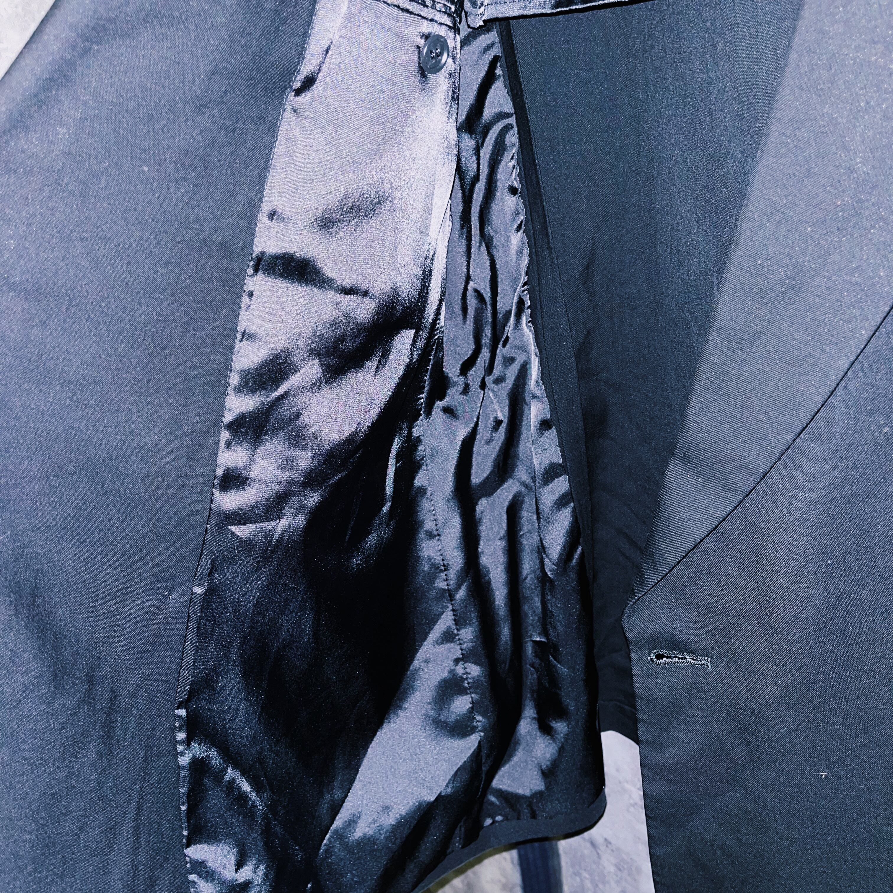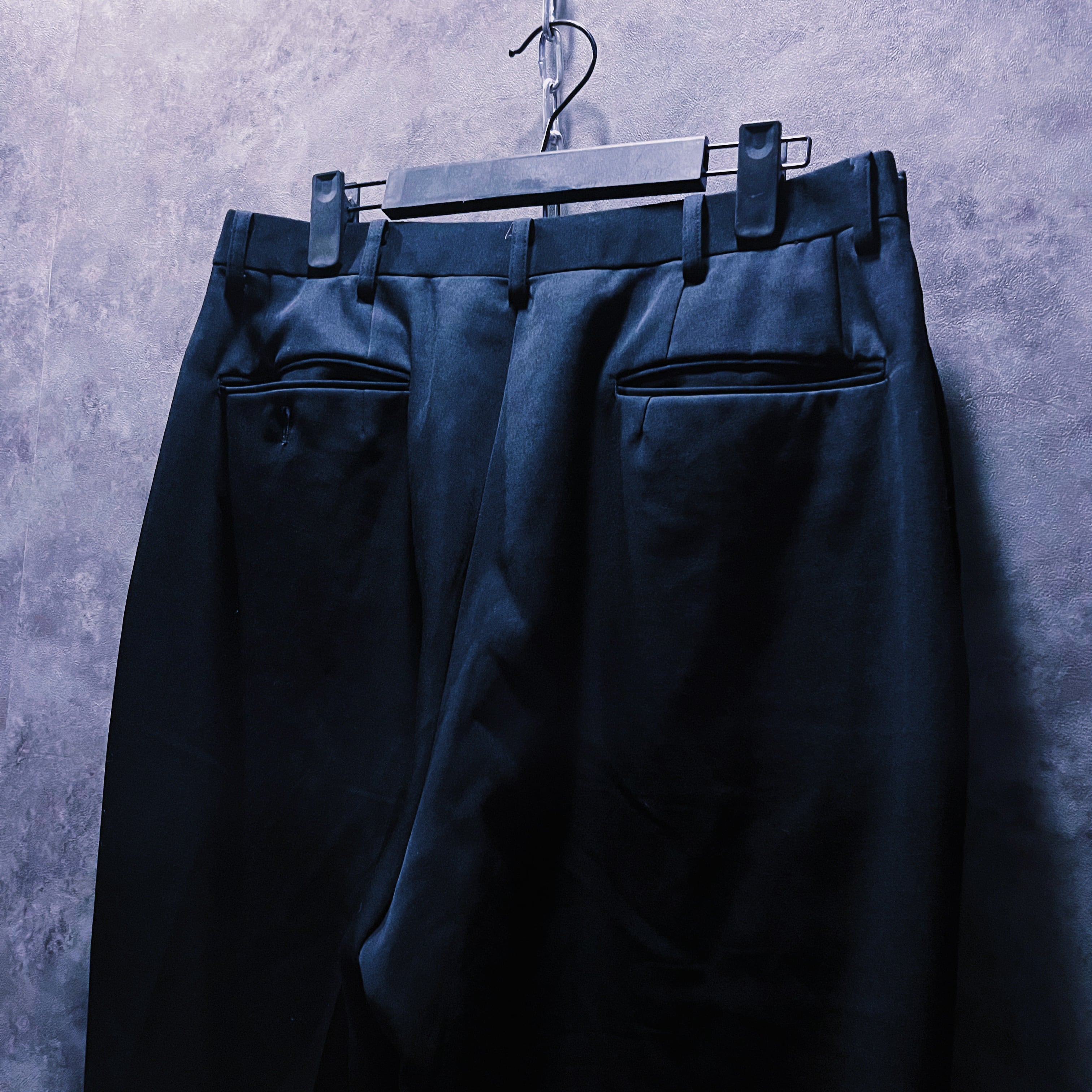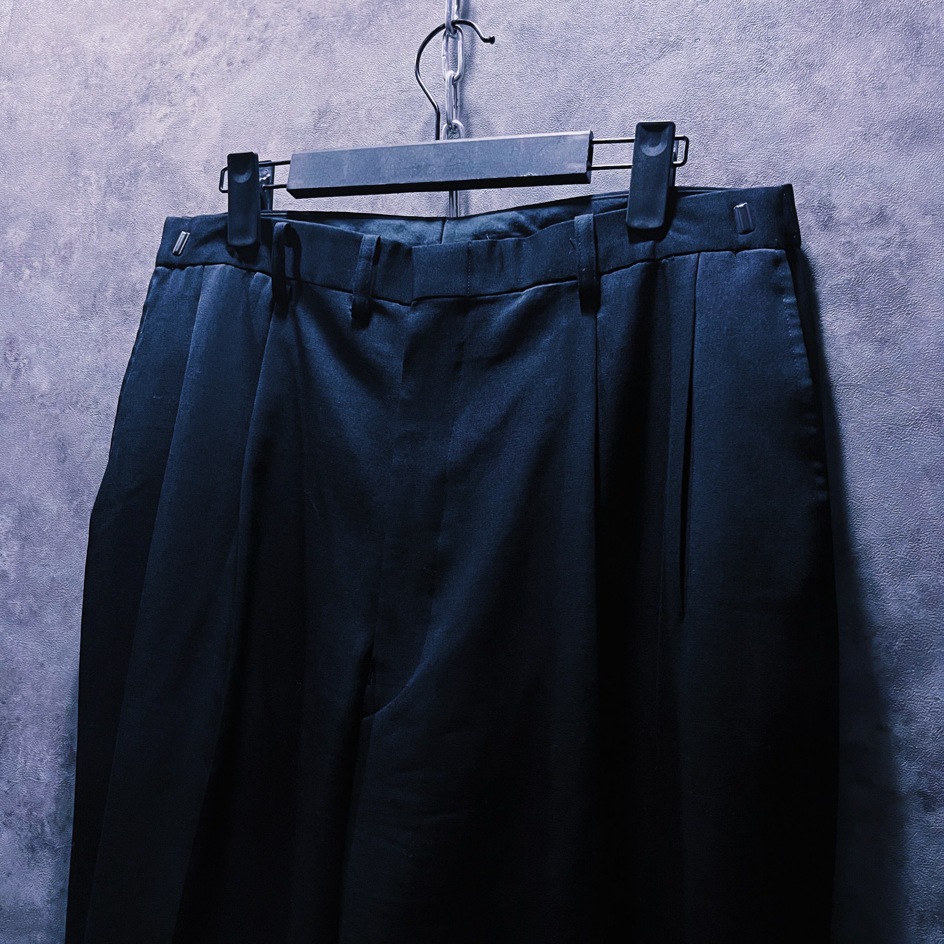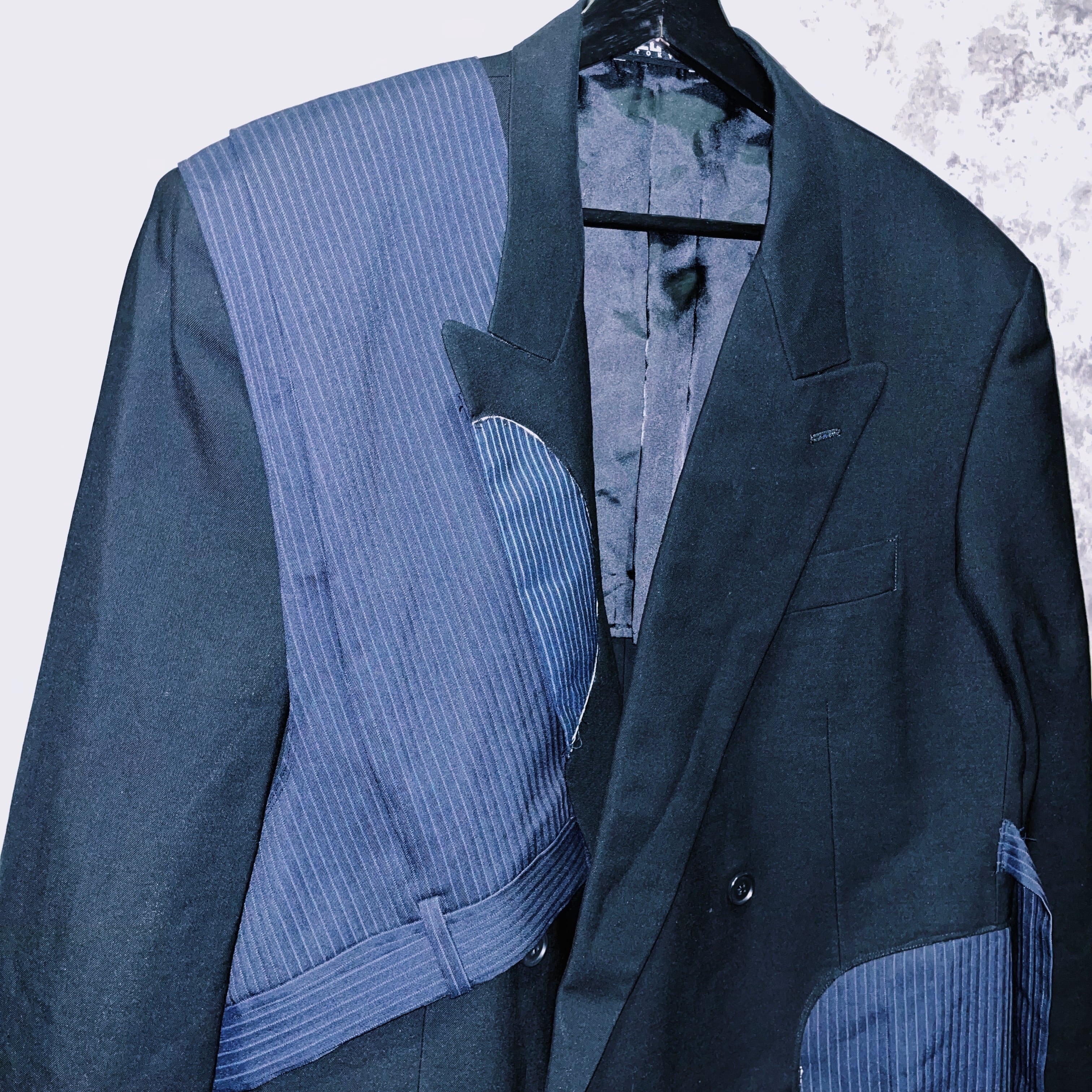 ブラックカラーを基調に、ジャケットにパンツの一部を。パンツにもフレアシルエットになるように左右非対称にドッキングさせたデザインの一枚。
