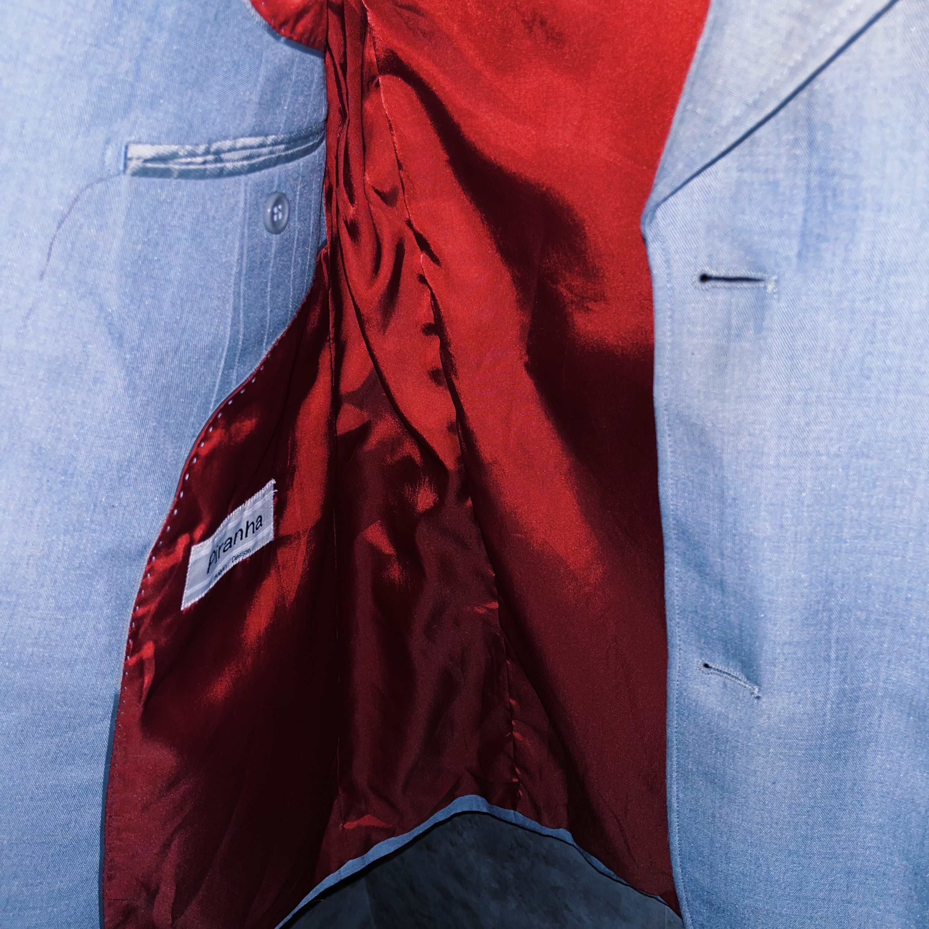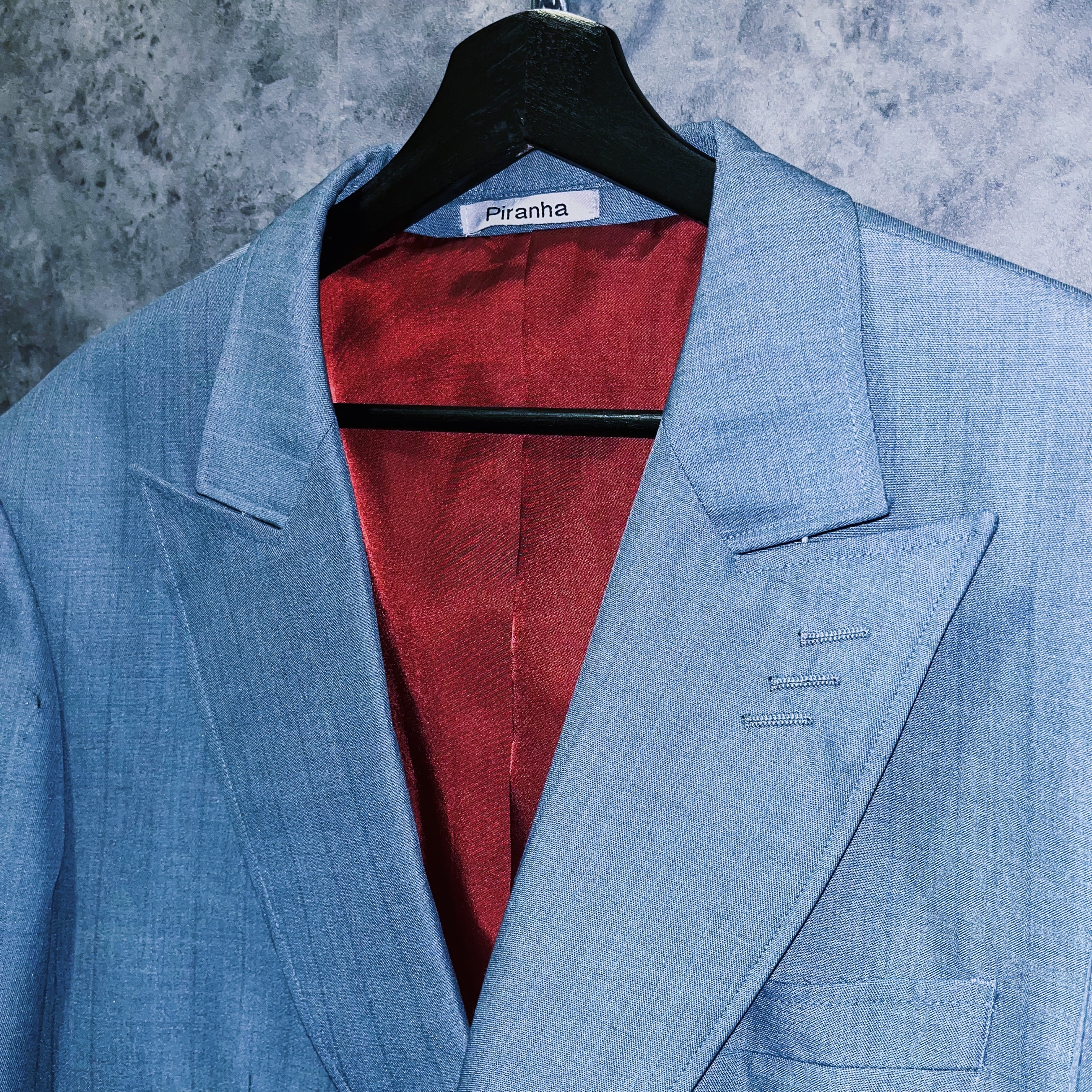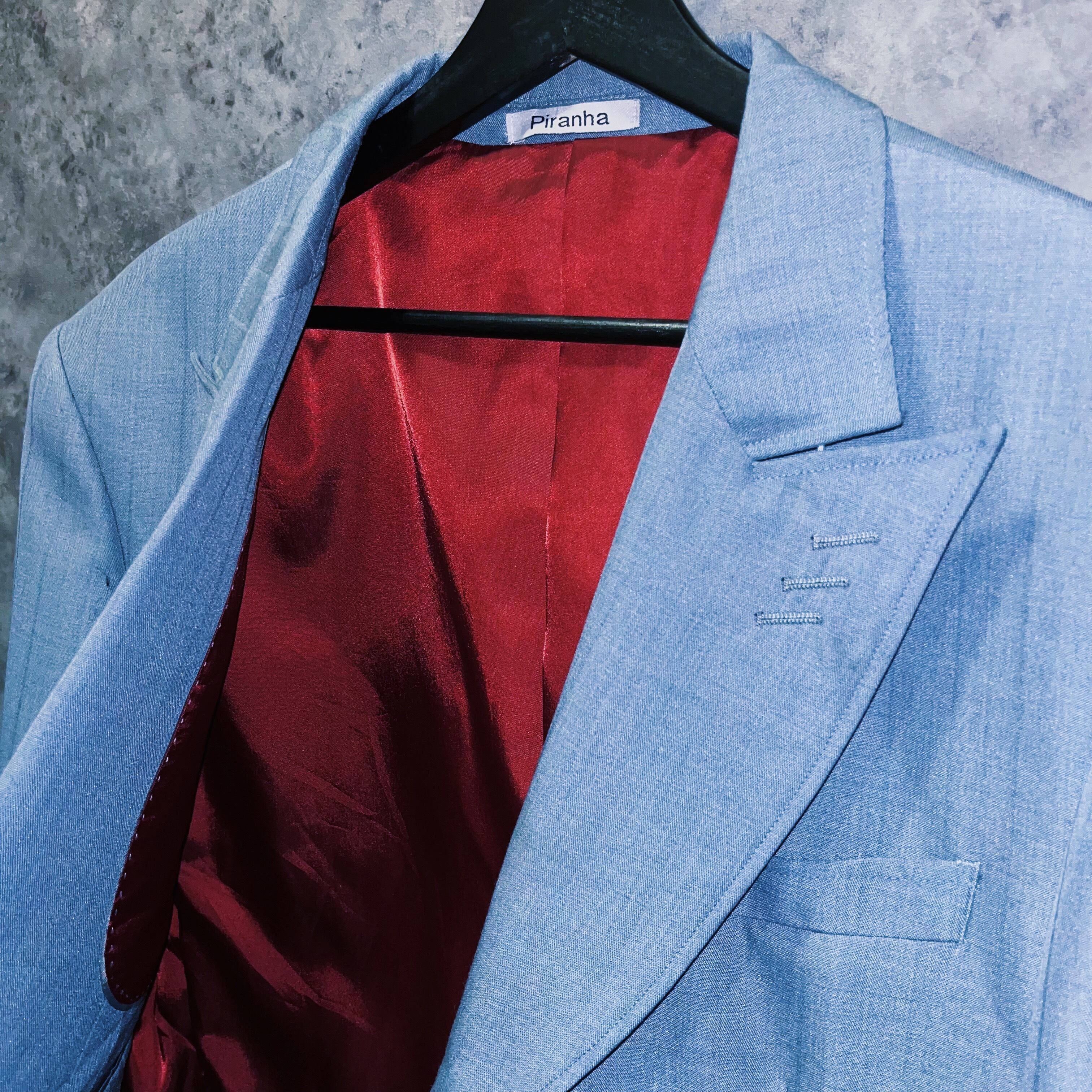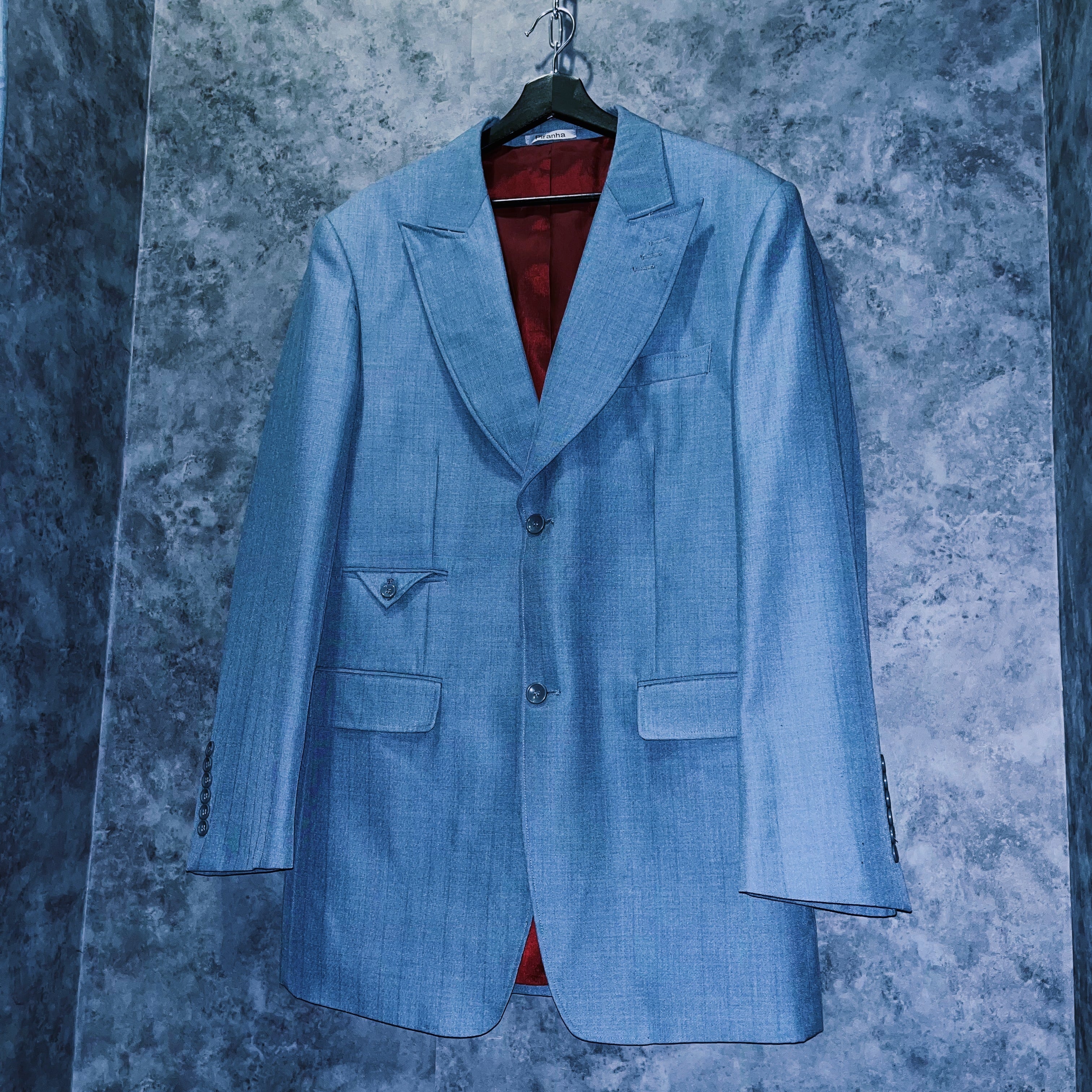 上品なブルーカラーのセットアップ。淡いブルーカラーは独特な質感を帯びており、カラーはシンプルながらも着る人の格を上げてくれるような引き締まった仕上がり。