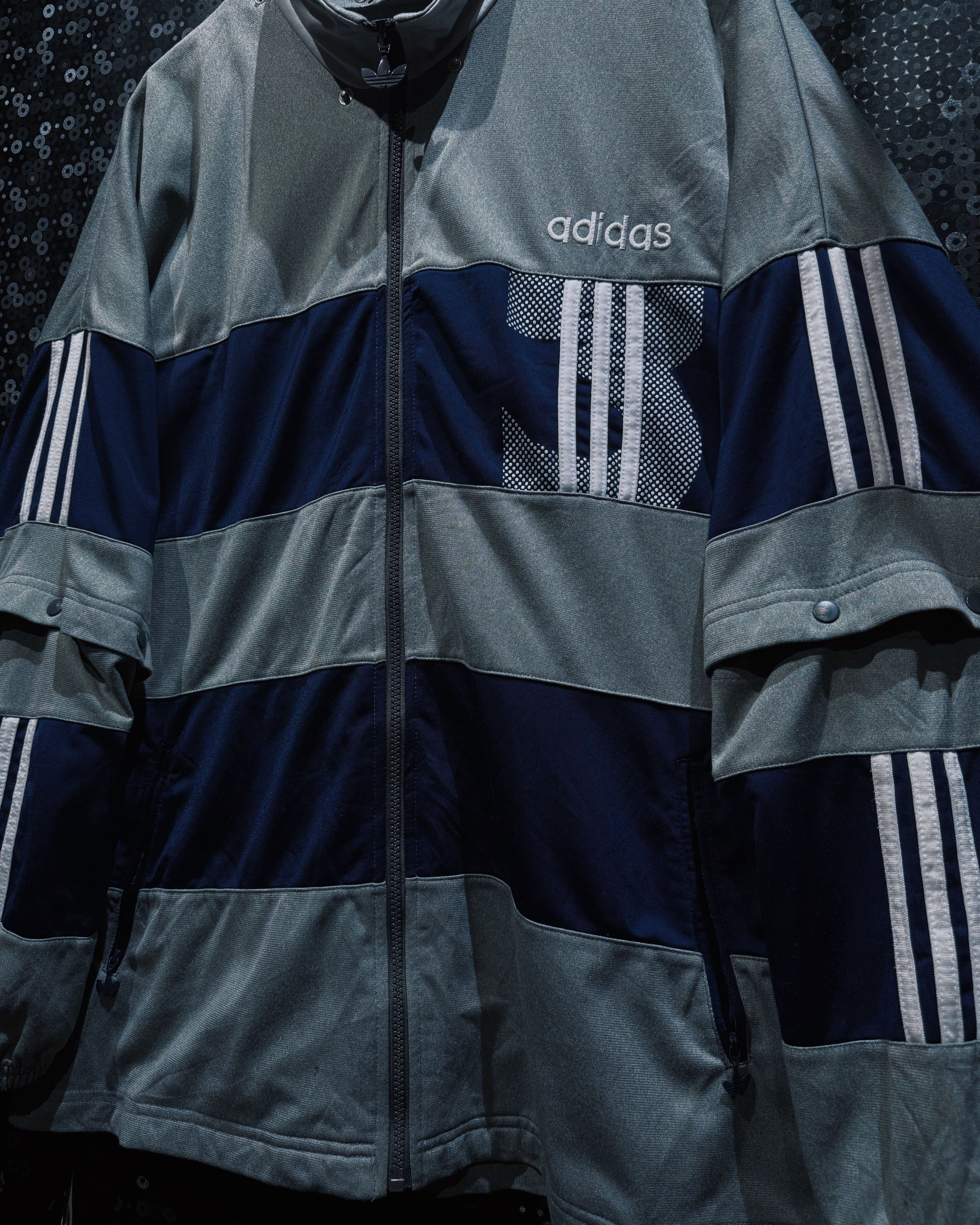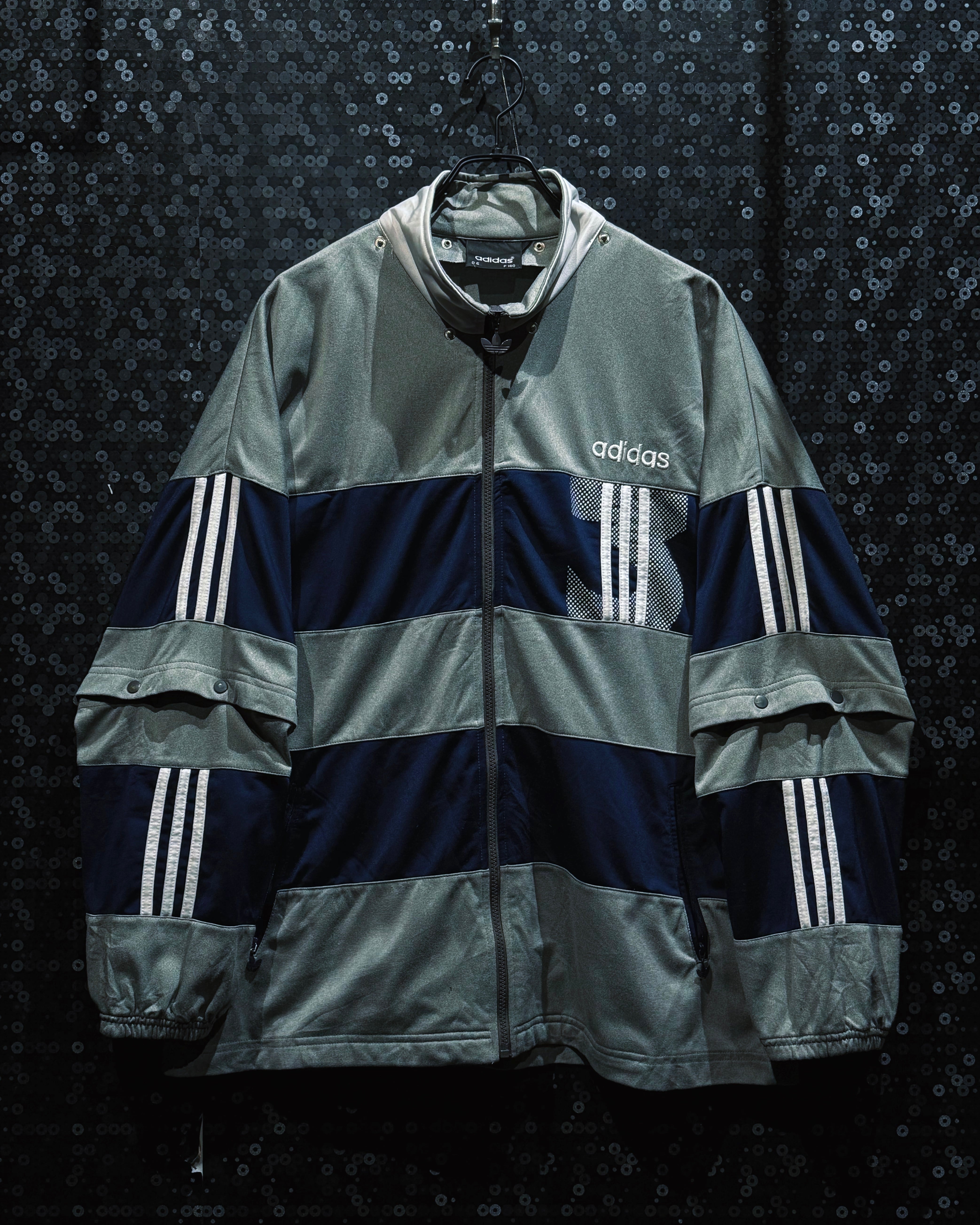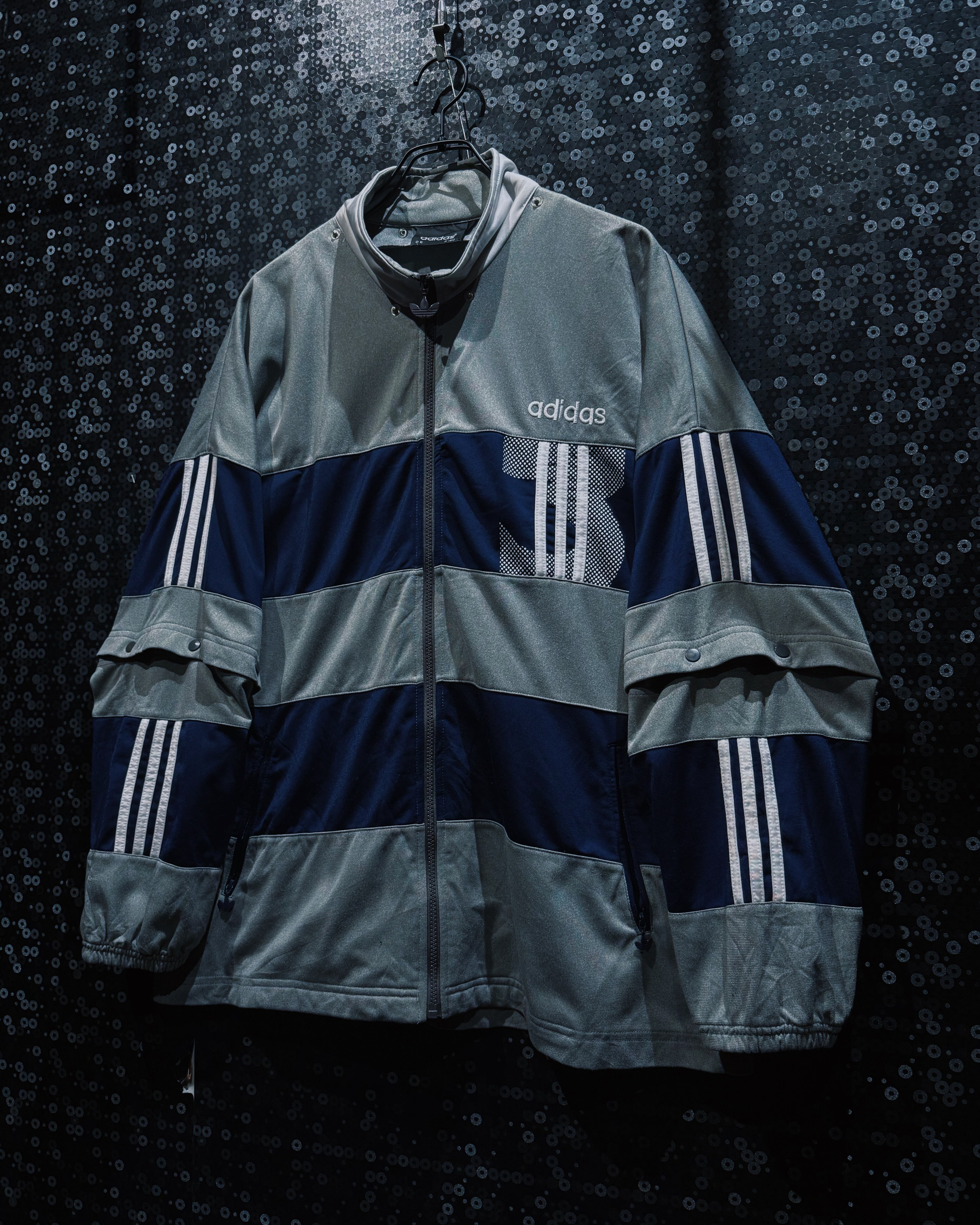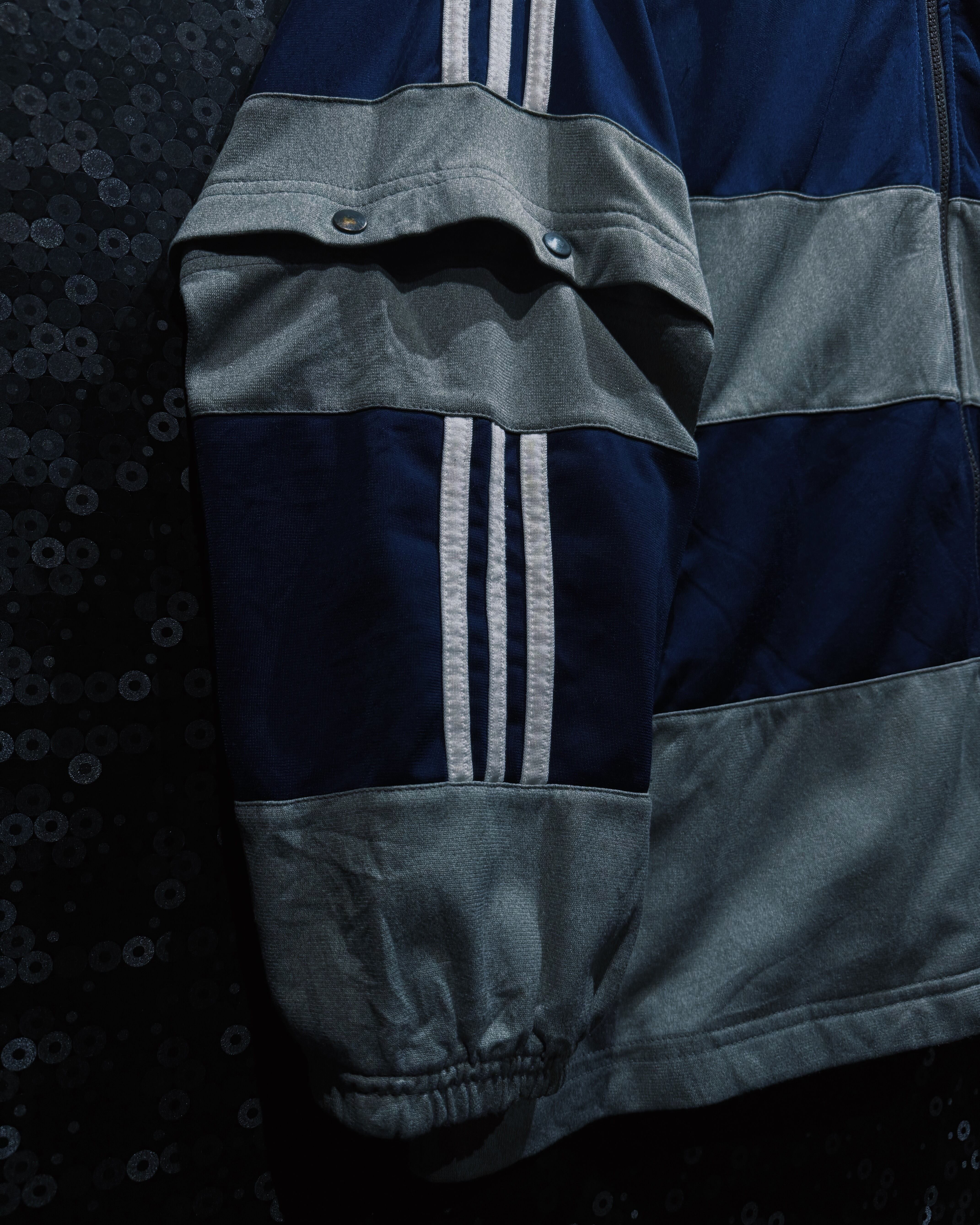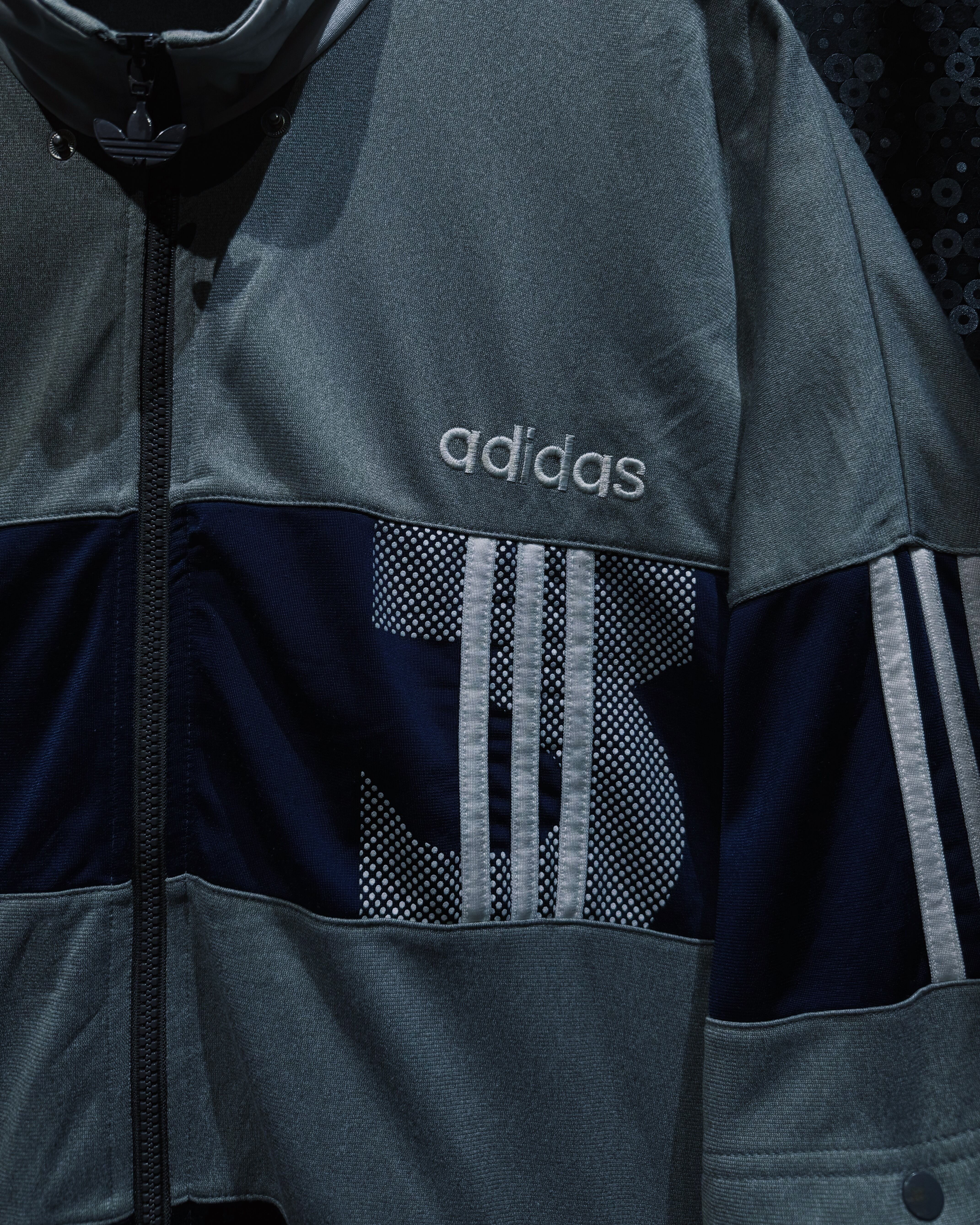 adidasらしいスポーティな機能美と、90〜00年代らしいテック感が色濃く反映されたヴィンテージトラックジャケット。シルバーグレー×ネイビーを基調に、随所へ配置されたスリーストライプとロゴワークが強い存在感を放つ一着。
