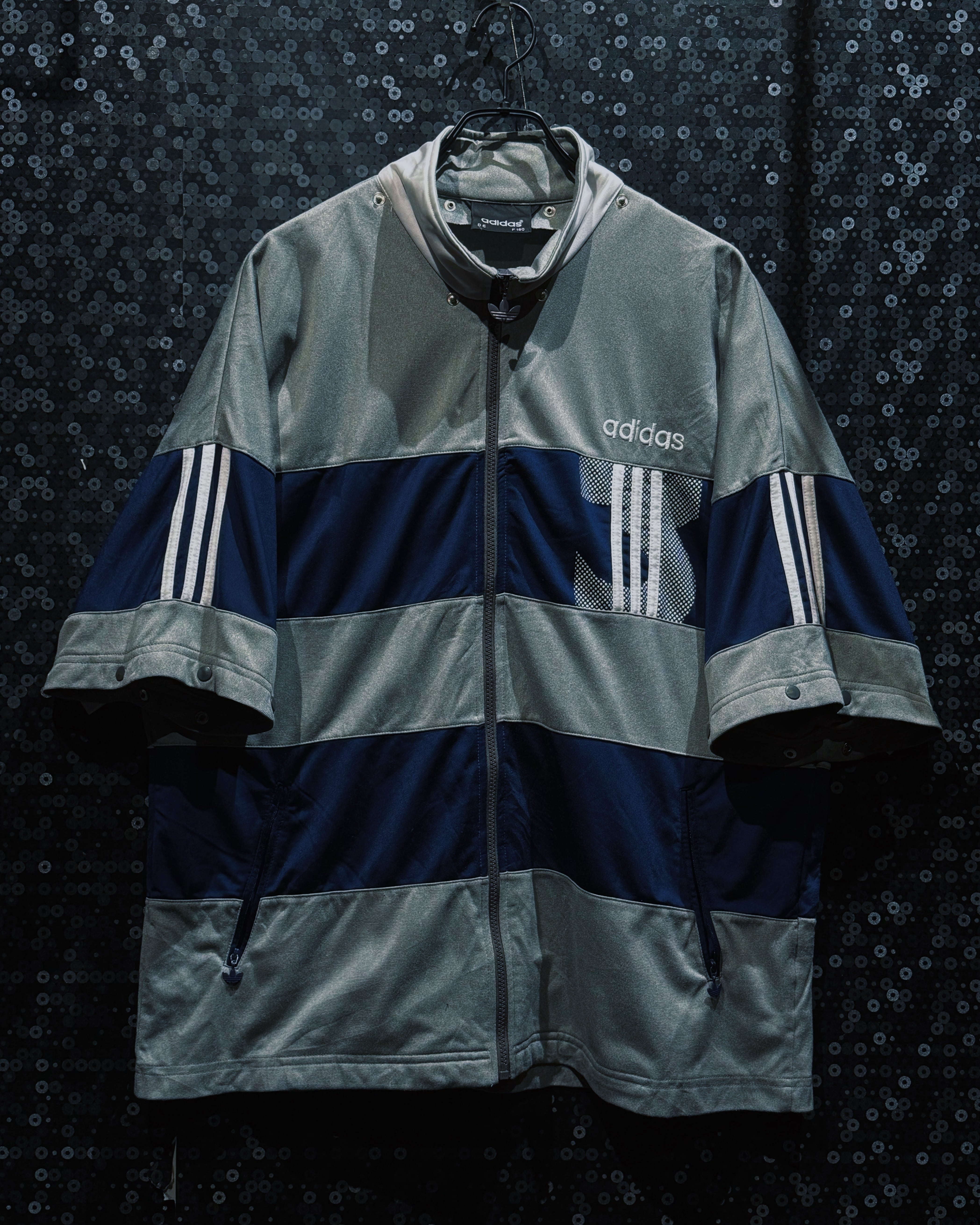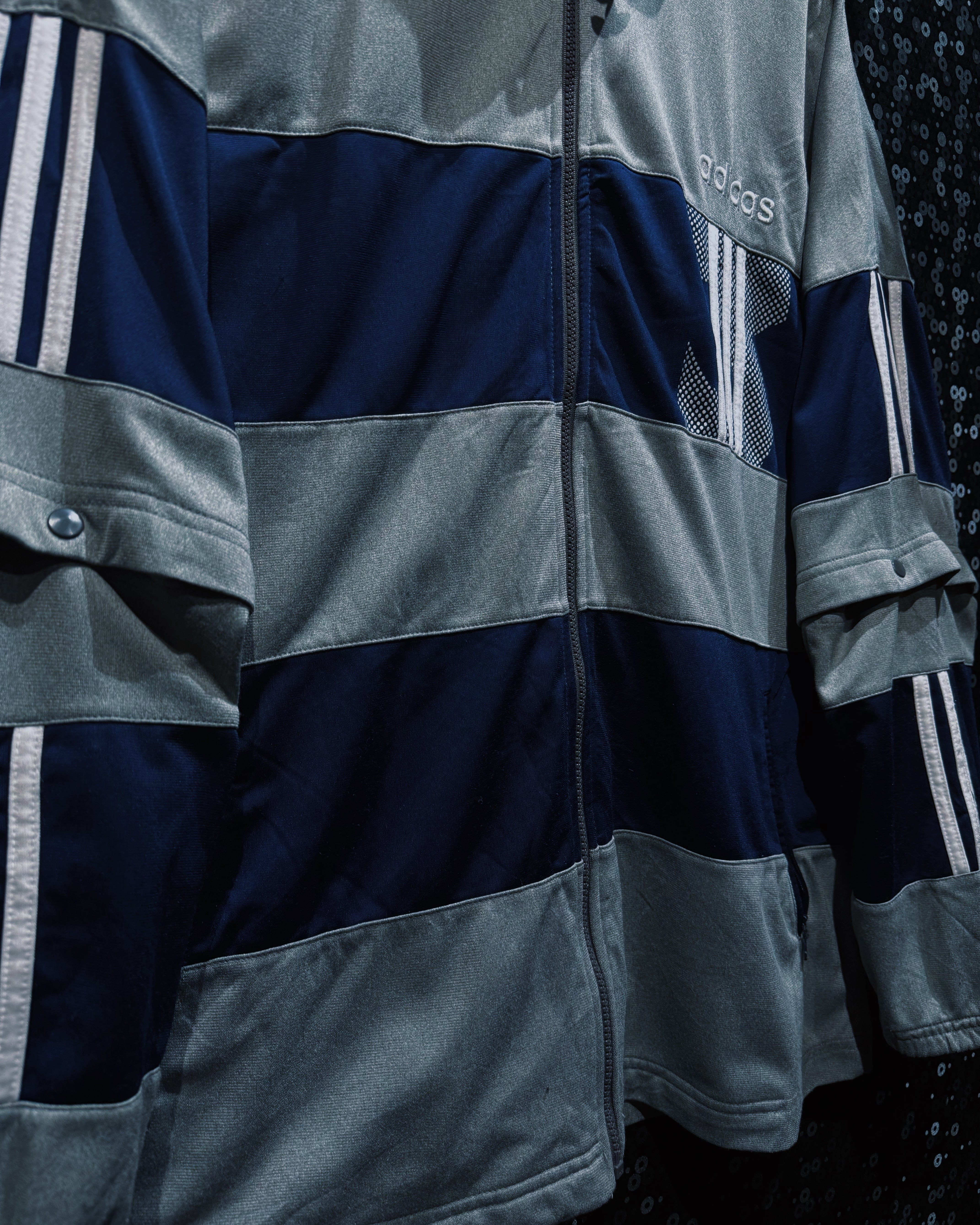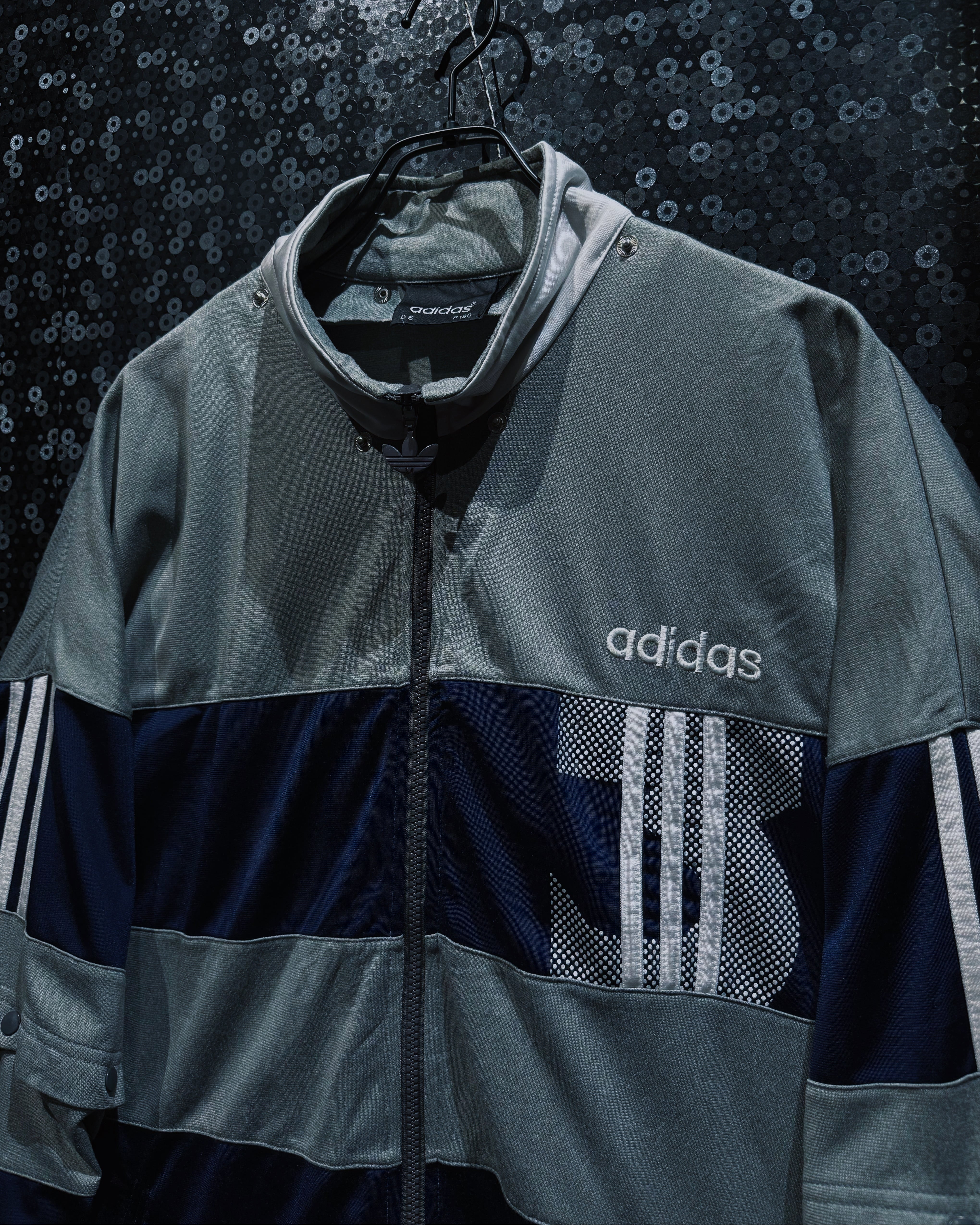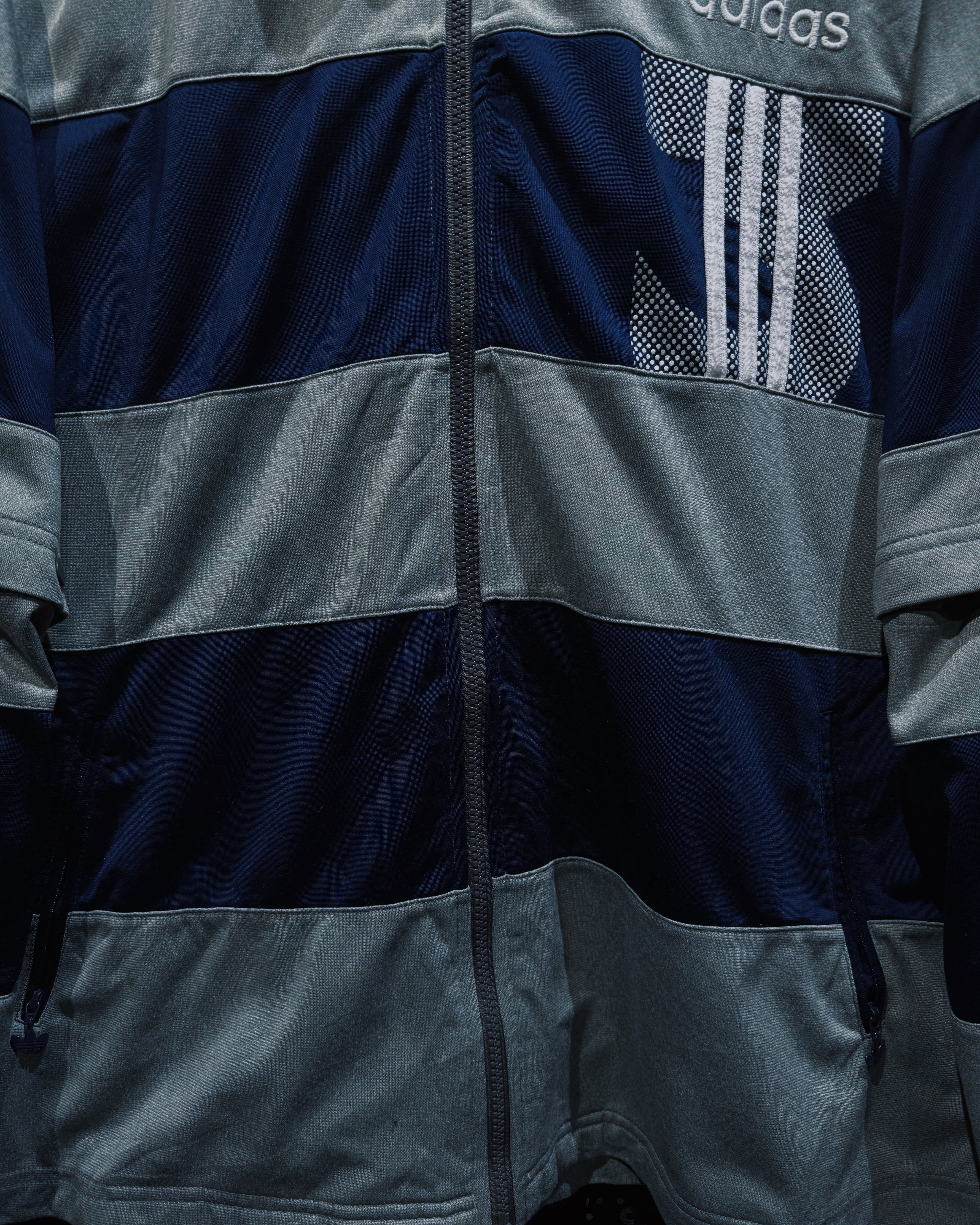 adidasらしいスポーティな機能美と、90〜00年代らしいテック感が色濃く反映されたヴィンテージトラックジャケット。シルバーグレー×ネイビーを基調に、随所へ配置されたスリーストライプとロゴワークが強い存在感を放つ一着。