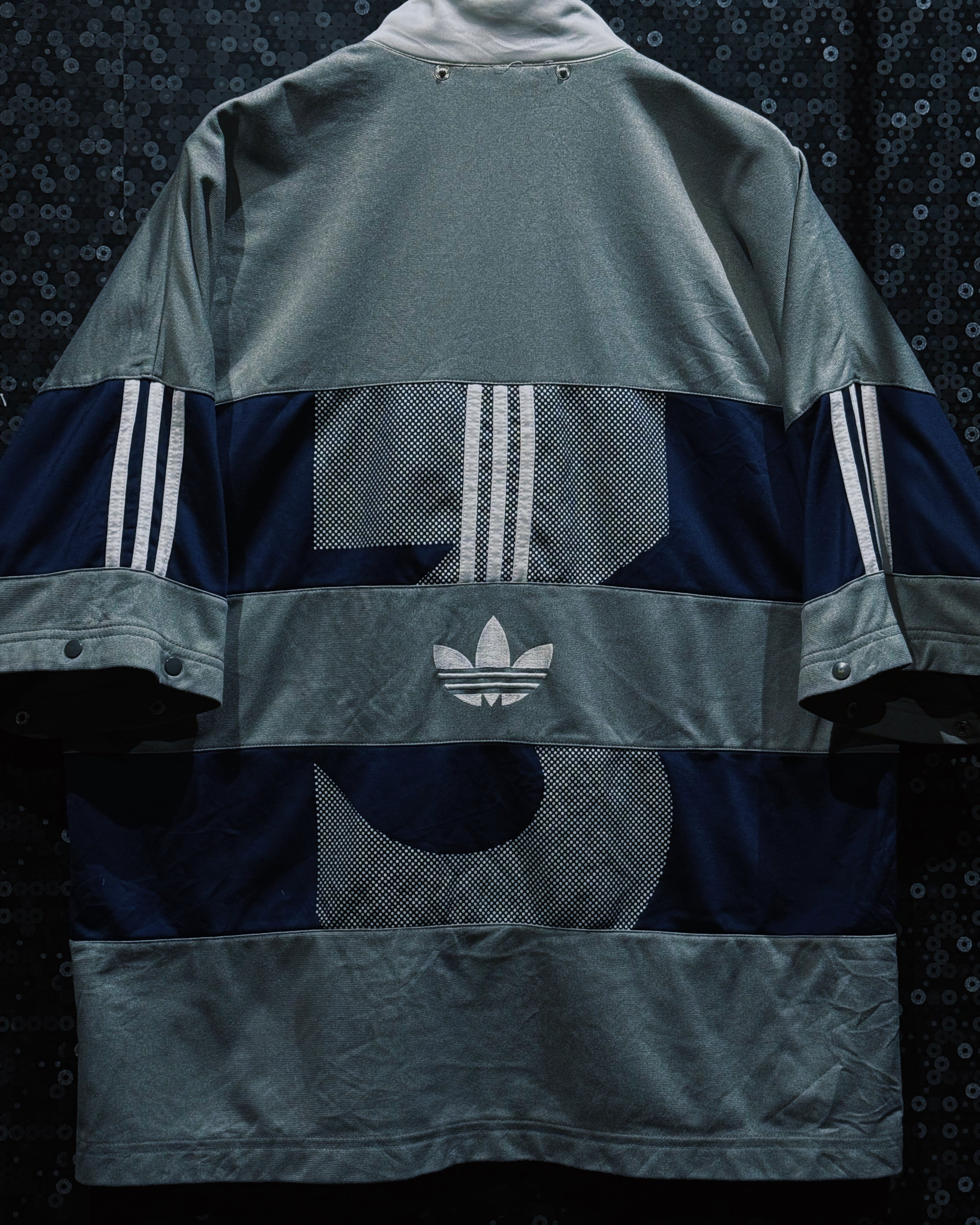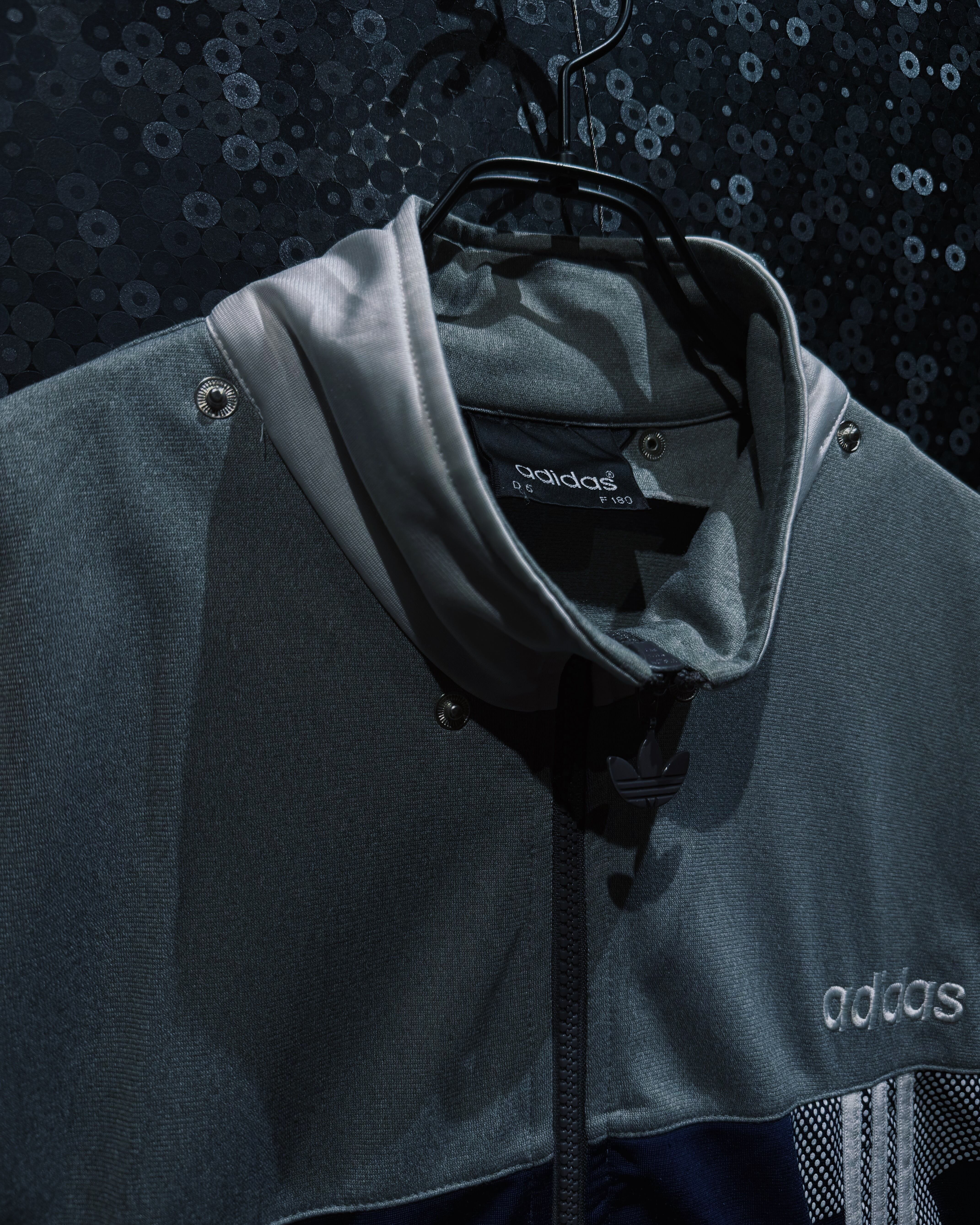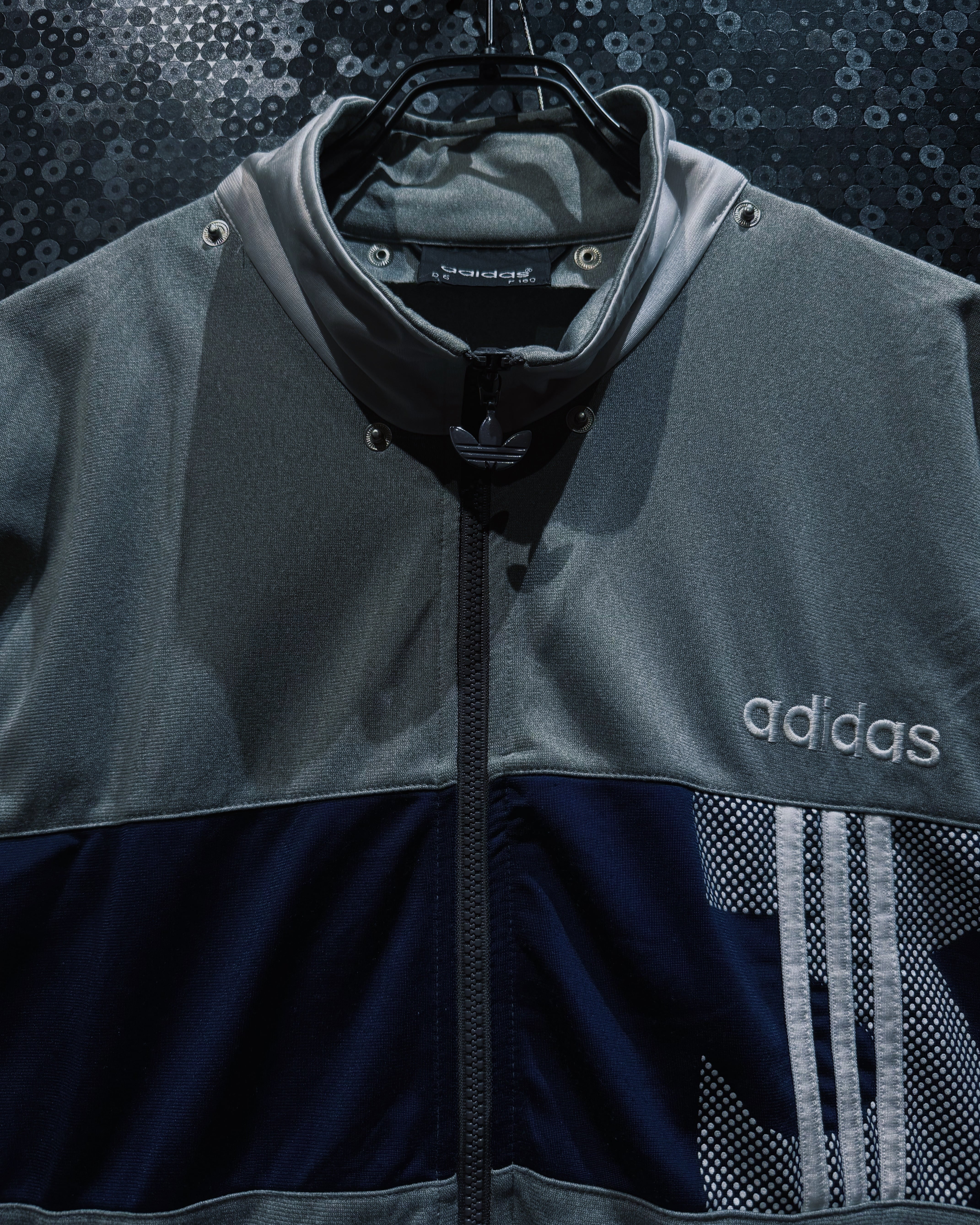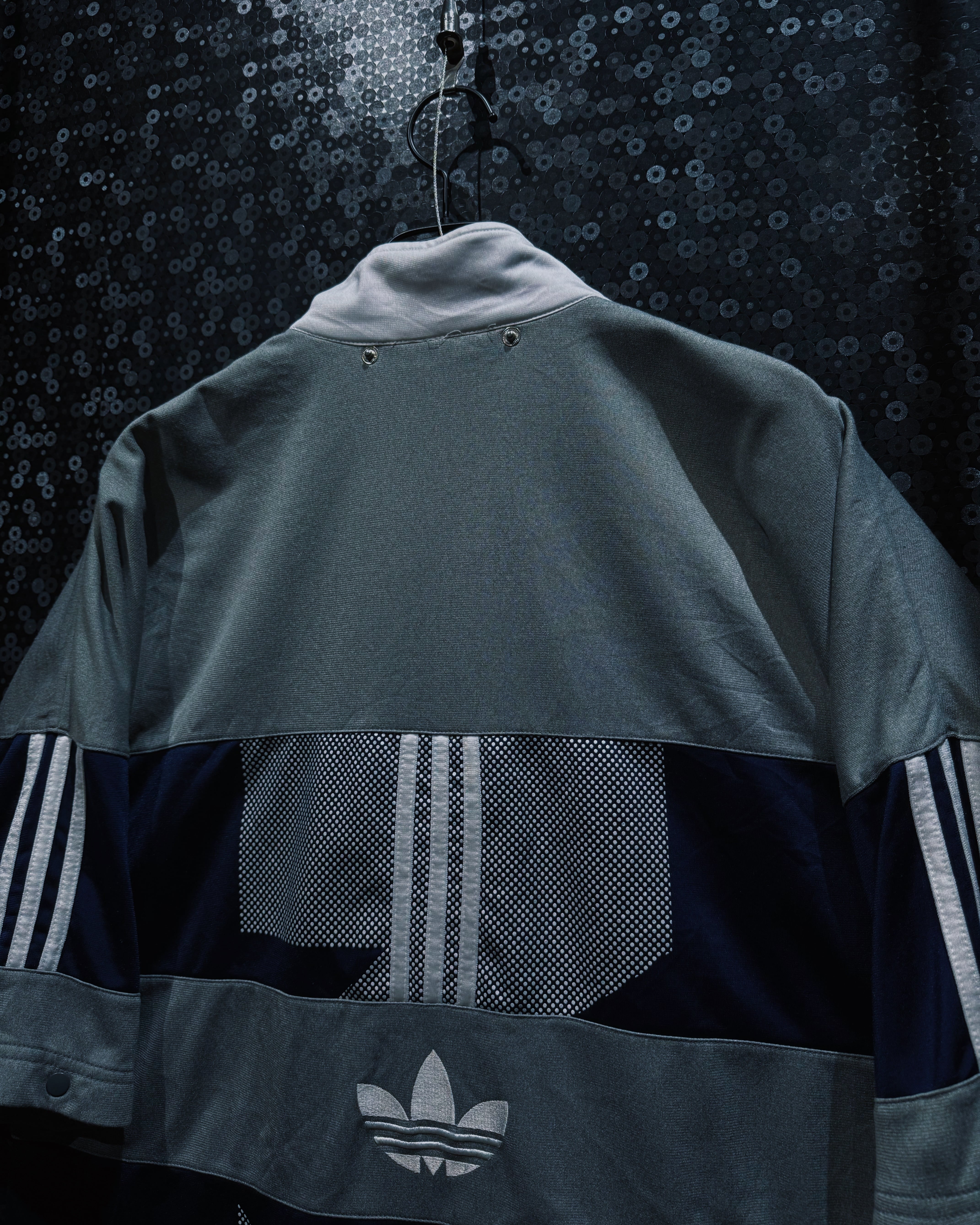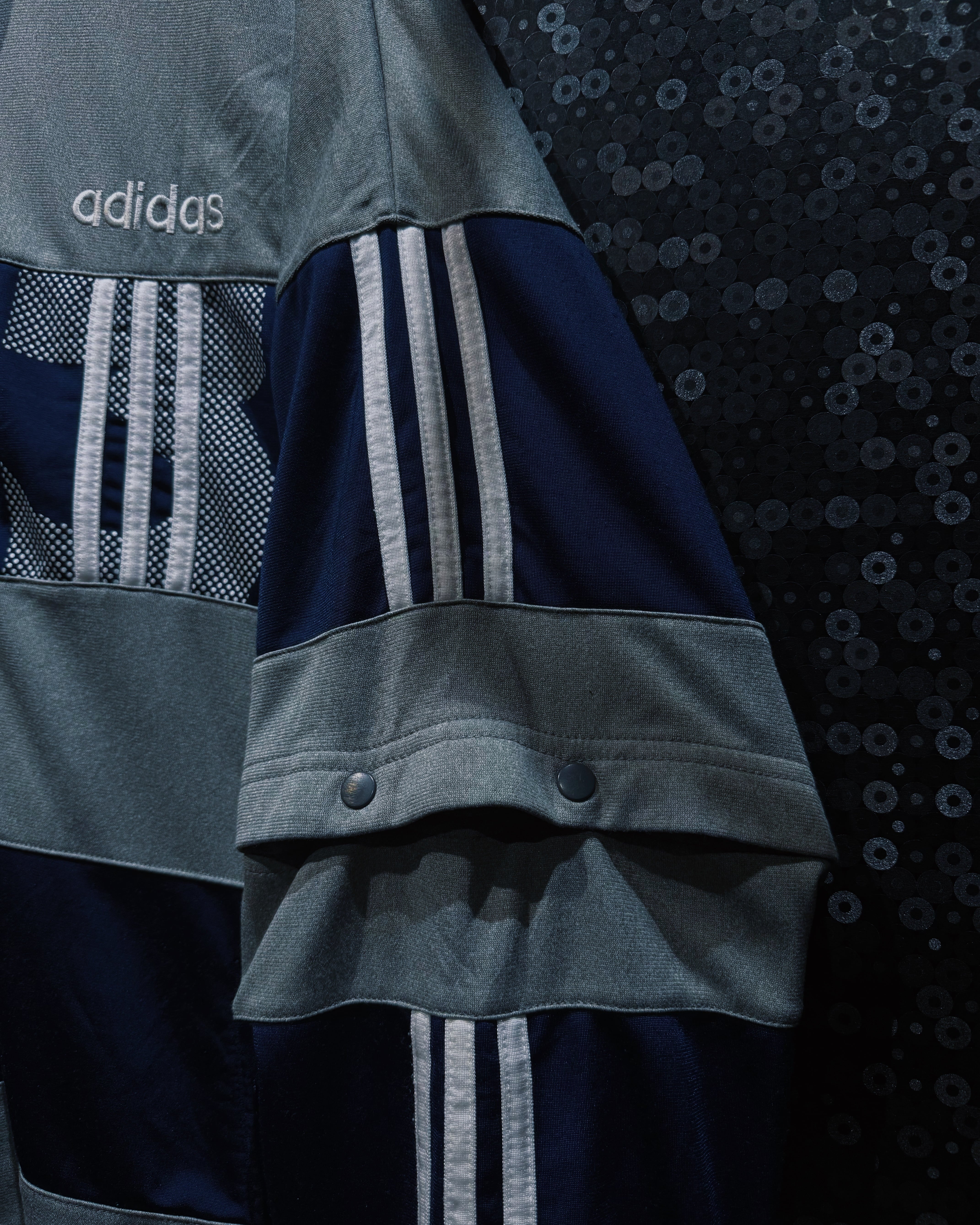 adidasらしいスポーティな機能美と、90〜00年代らしいテック感が色濃く反映されたヴィンテージトラックジャケット。シルバーグレー×ネイビーを基調に、随所へ配置されたスリーストライプとロゴワークが強い存在感を放つ一着。