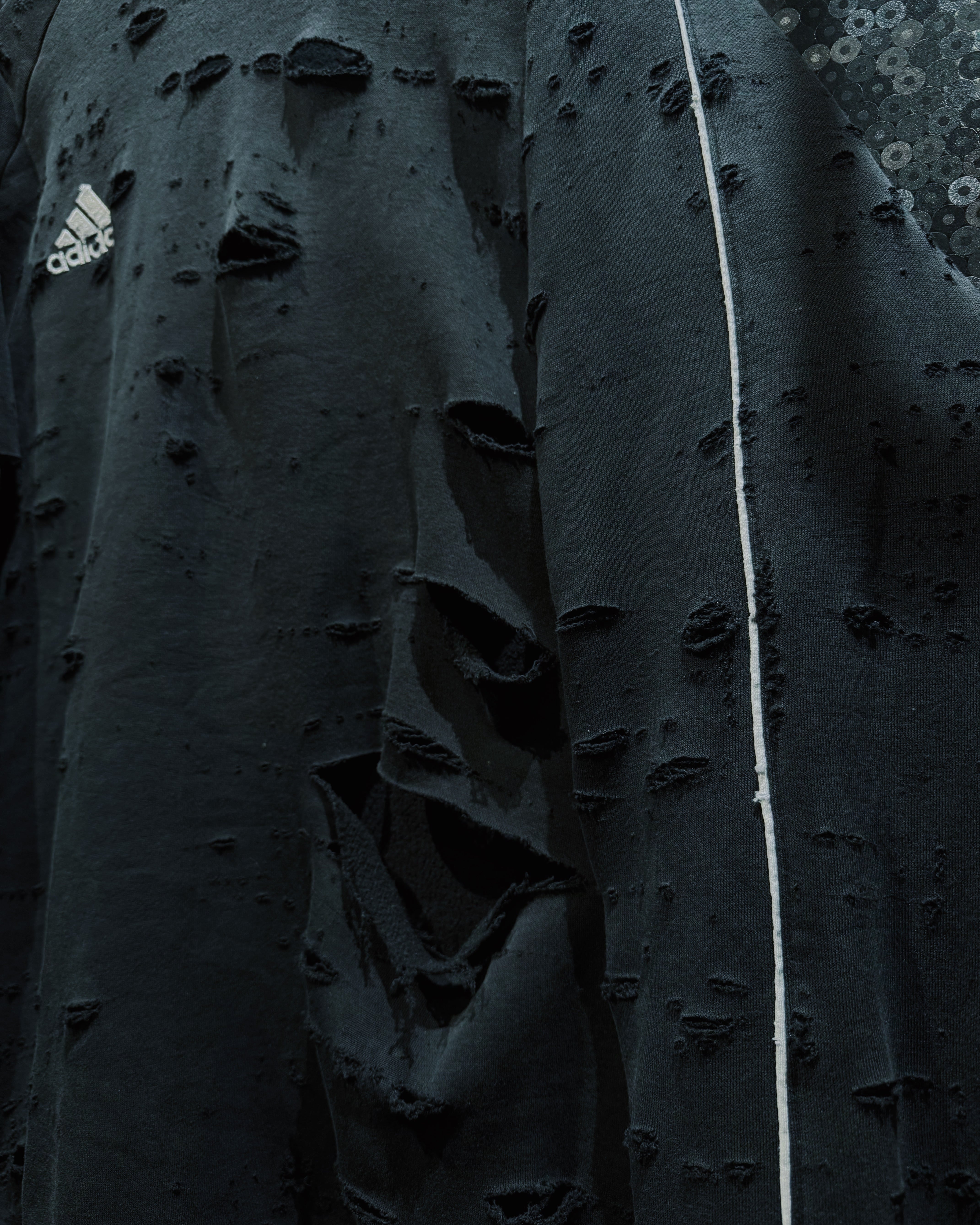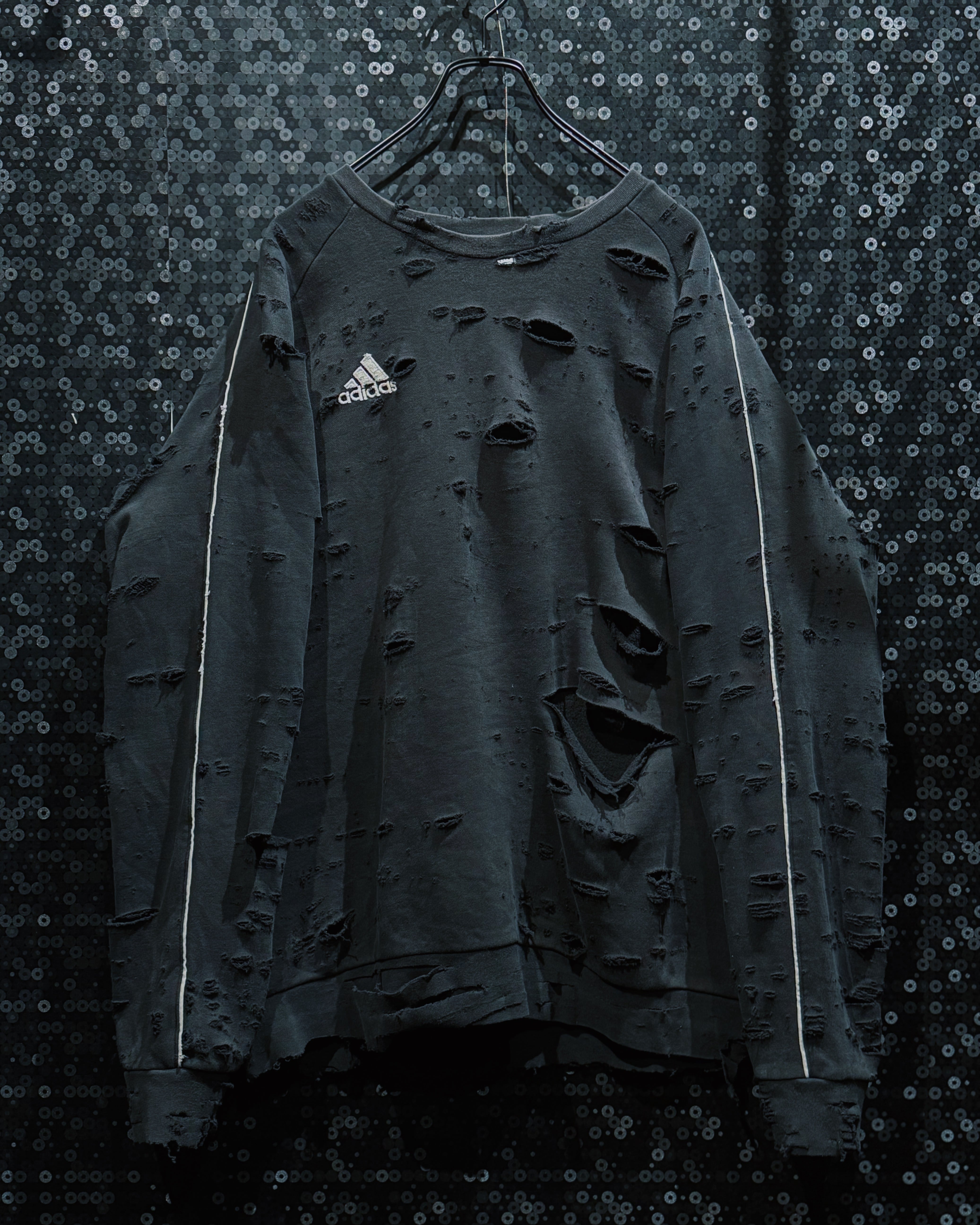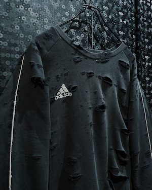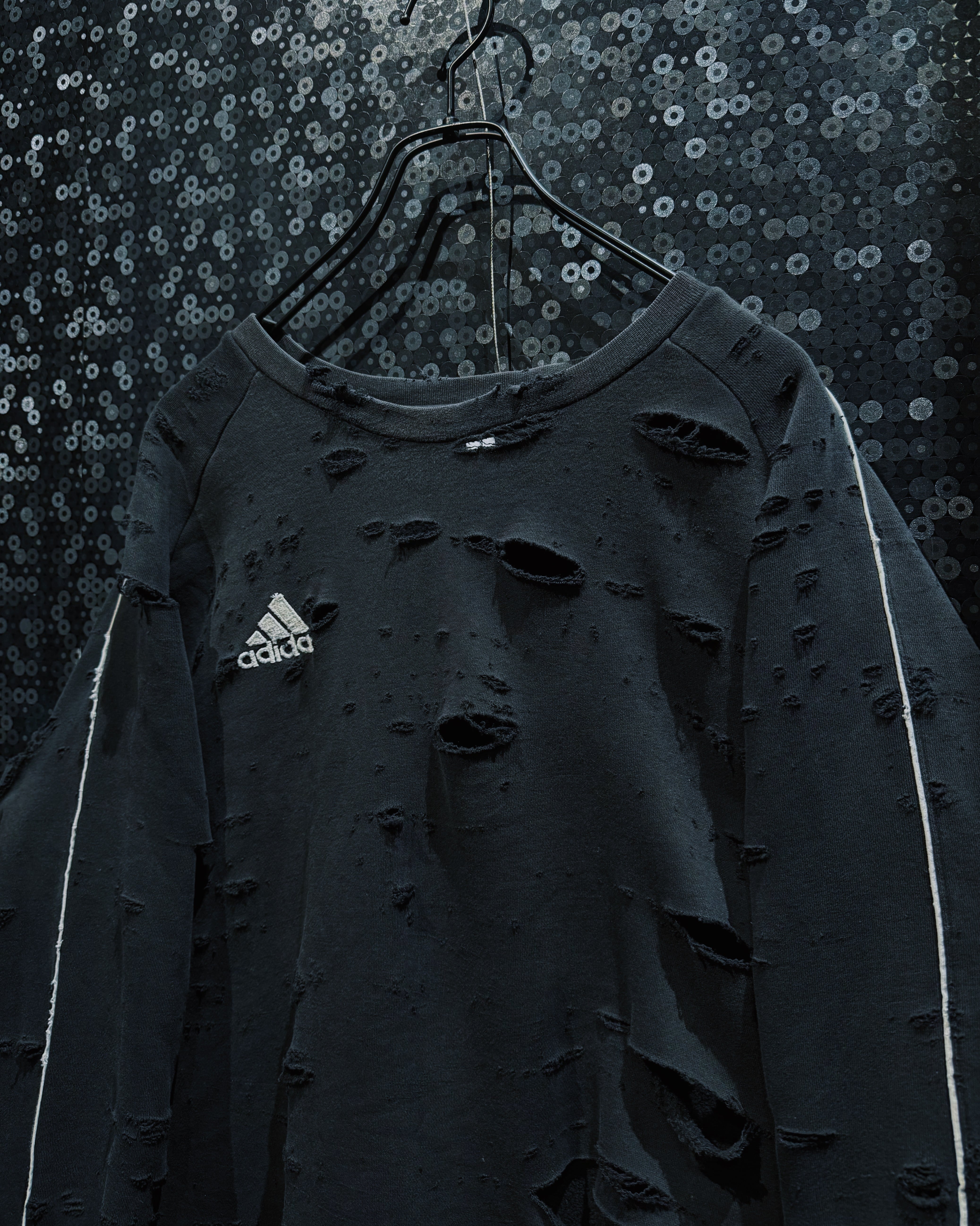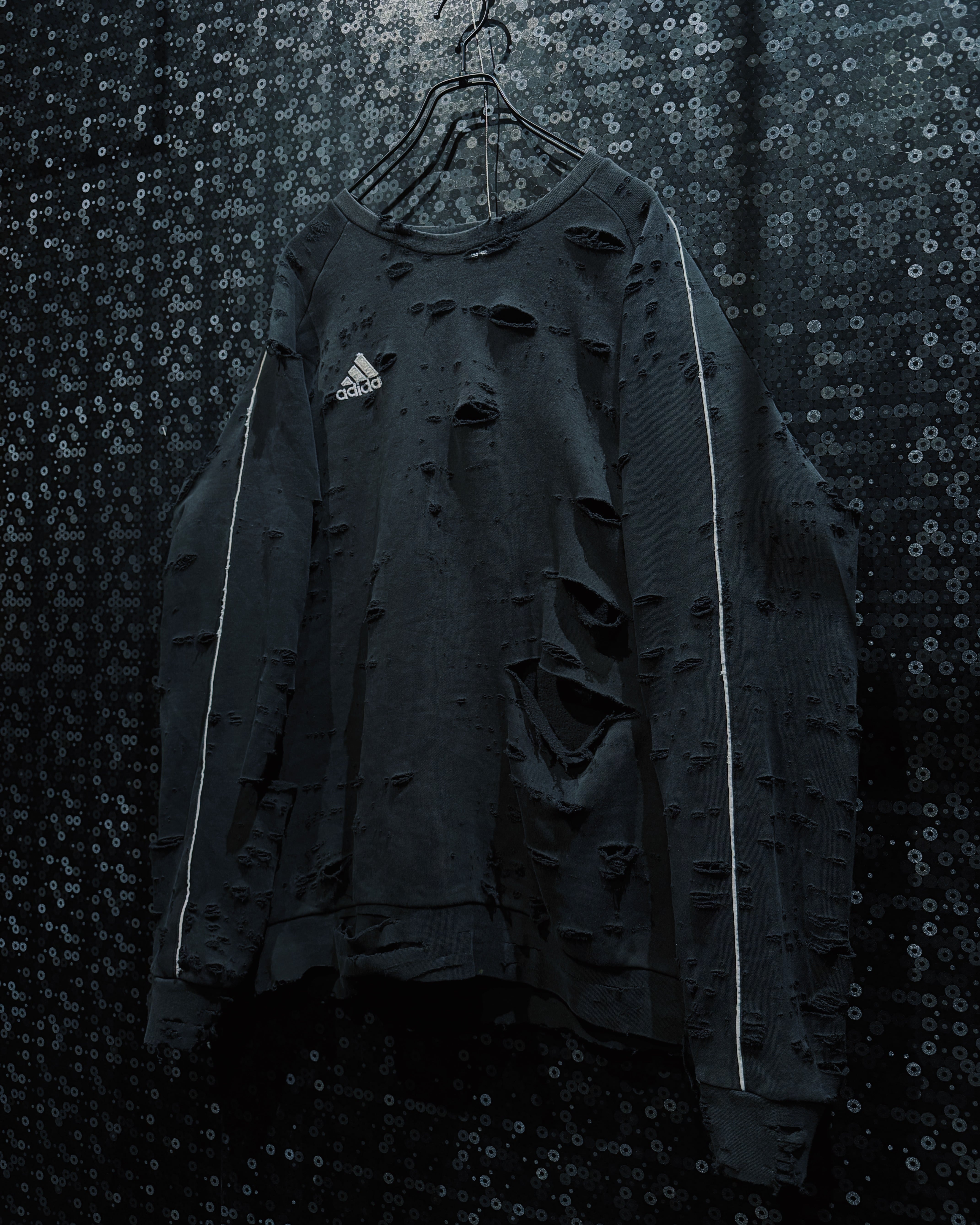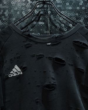 adidasのパフォーマンススウェットをベースに、AEIEMのフィルターを通して再構築したoriginal “boro” remake。全体に無数のダメージを散らしながらも、単なるクラッシュではなく、擦れ・裂け・フェードがレイヤーのように重なっていく表情が特徴的な一着。着込まれ、使い込まれた時間そのものをデザインとして落とし込んだ、静かに主張するボロ感が魅力。