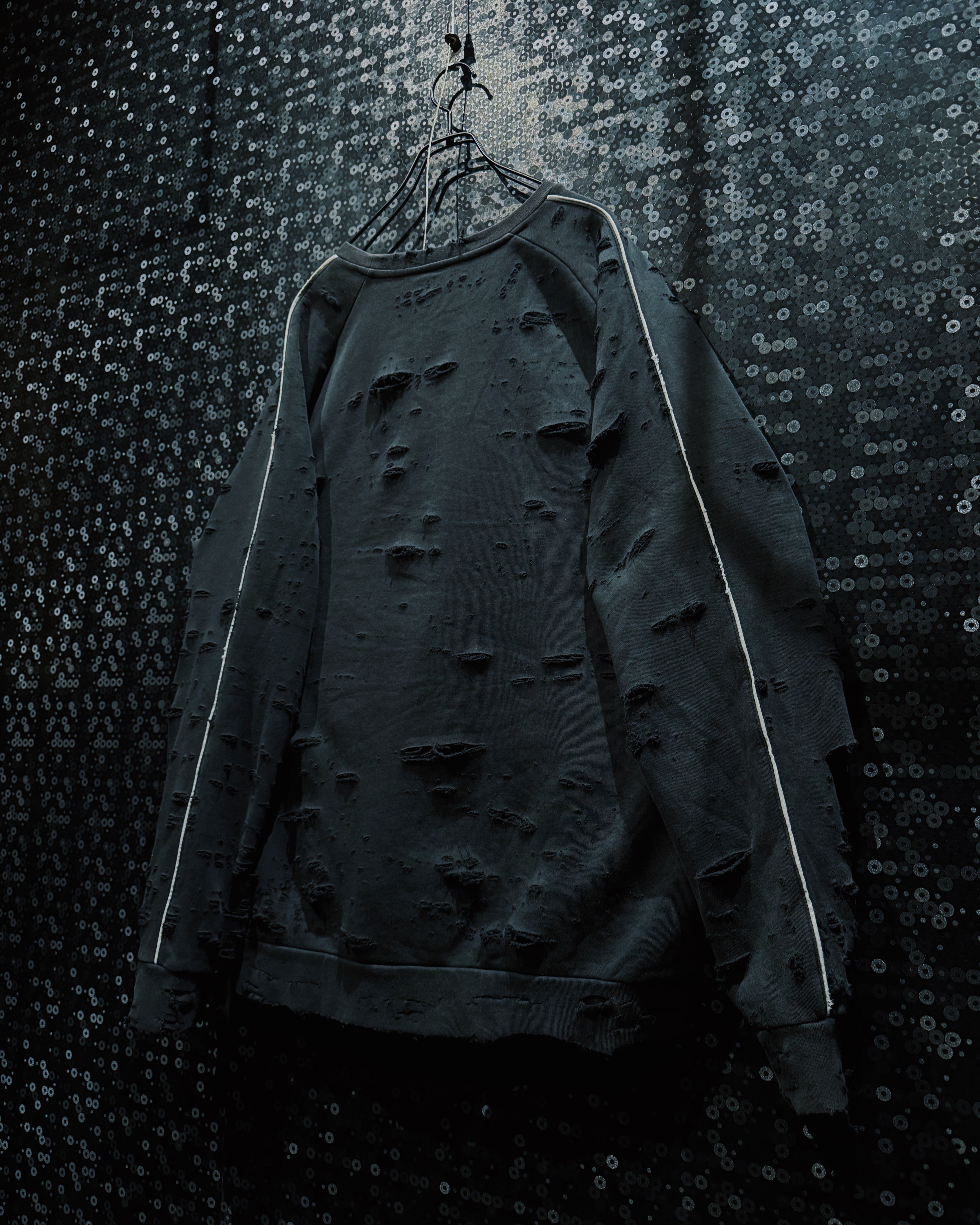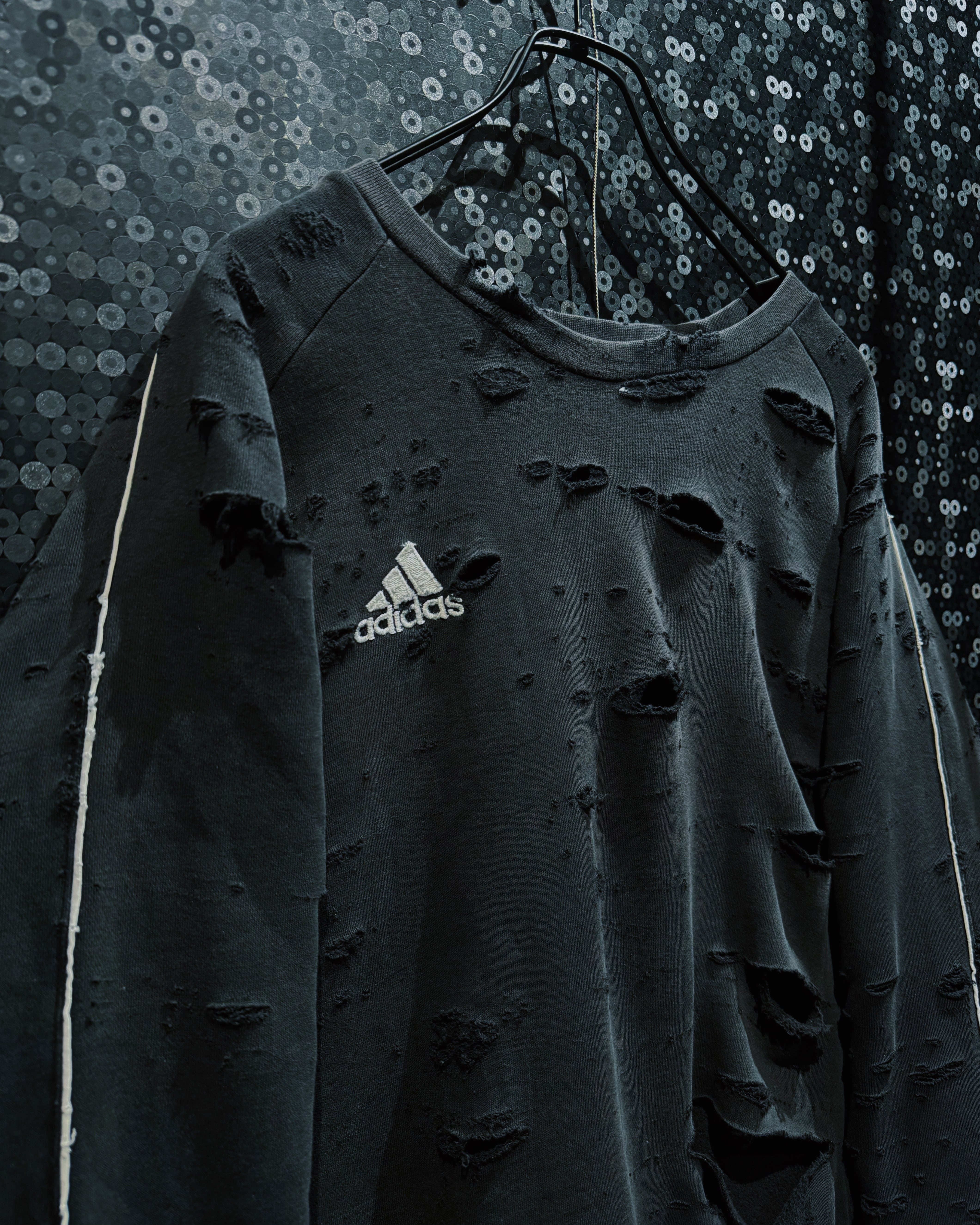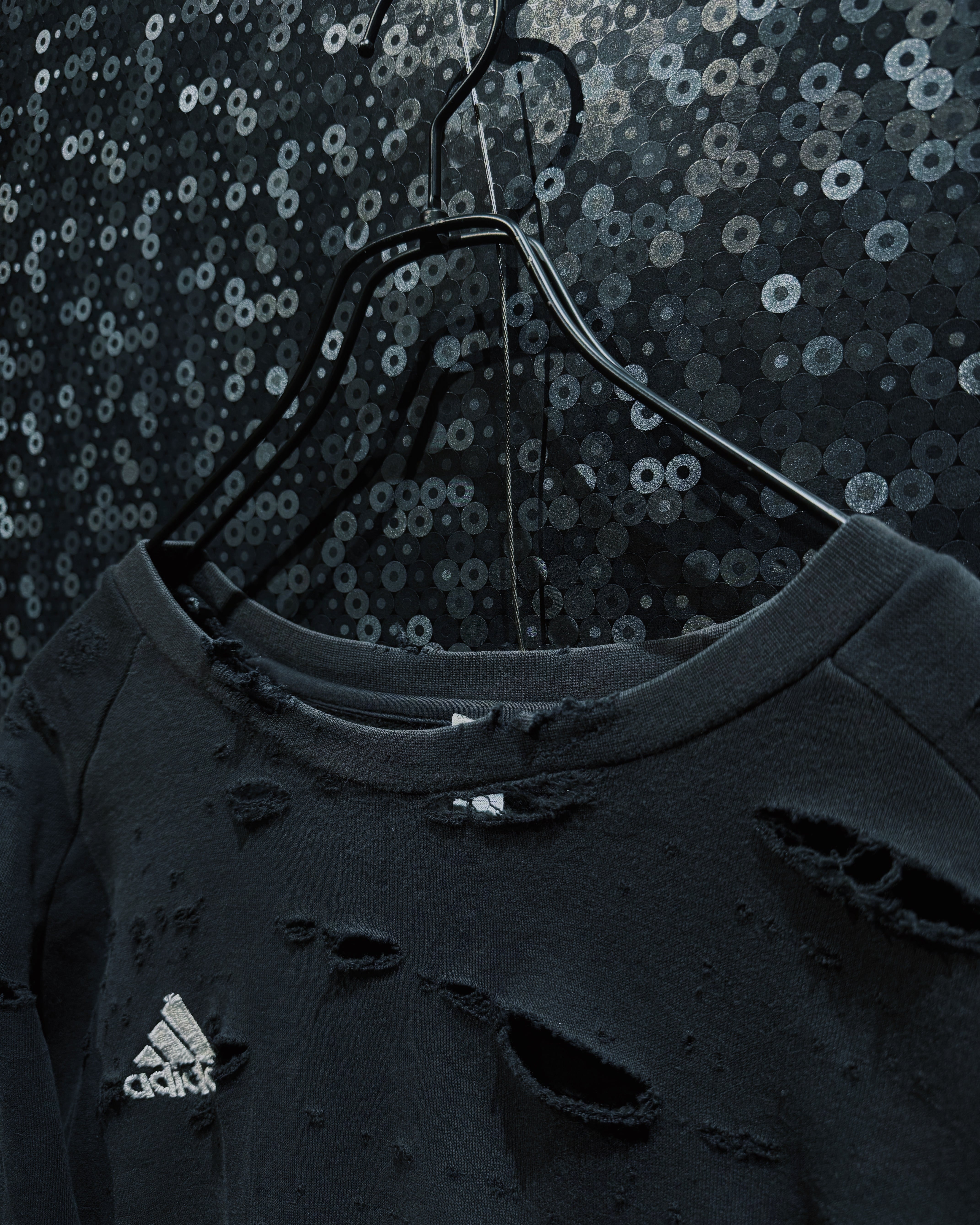 adidasのパフォーマンススウェットをベースに、AEIEMのフィルターを通して再構築したoriginal “boro” remake。全体に無数のダメージを散らしながらも、単なるクラッシュではなく、擦れ・裂け・フェードがレイヤーのように重なっていく表情が特徴的な一着。着込まれ、使い込まれた時間そのものをデザインとして落とし込んだ、静かに主張するボロ感が魅力。