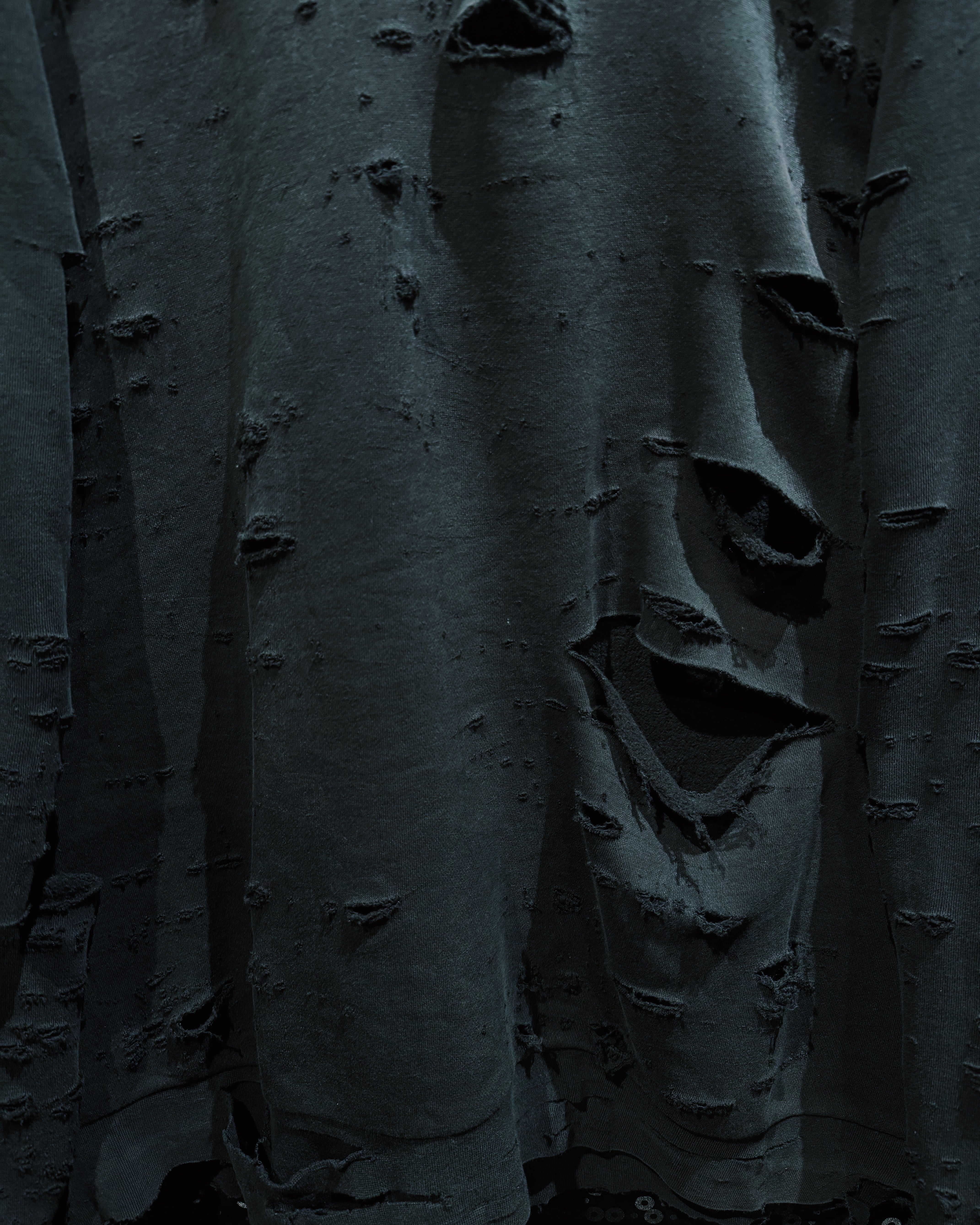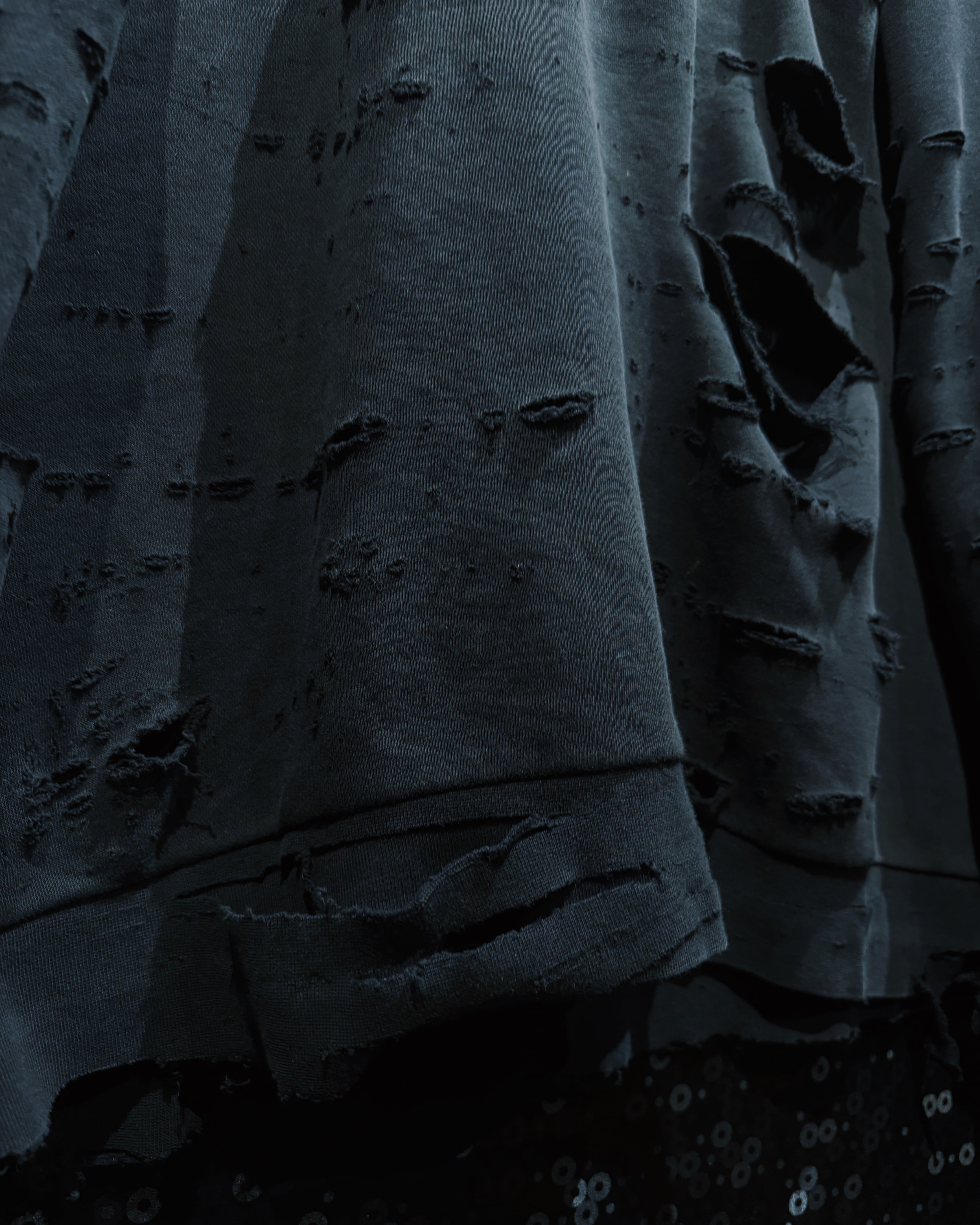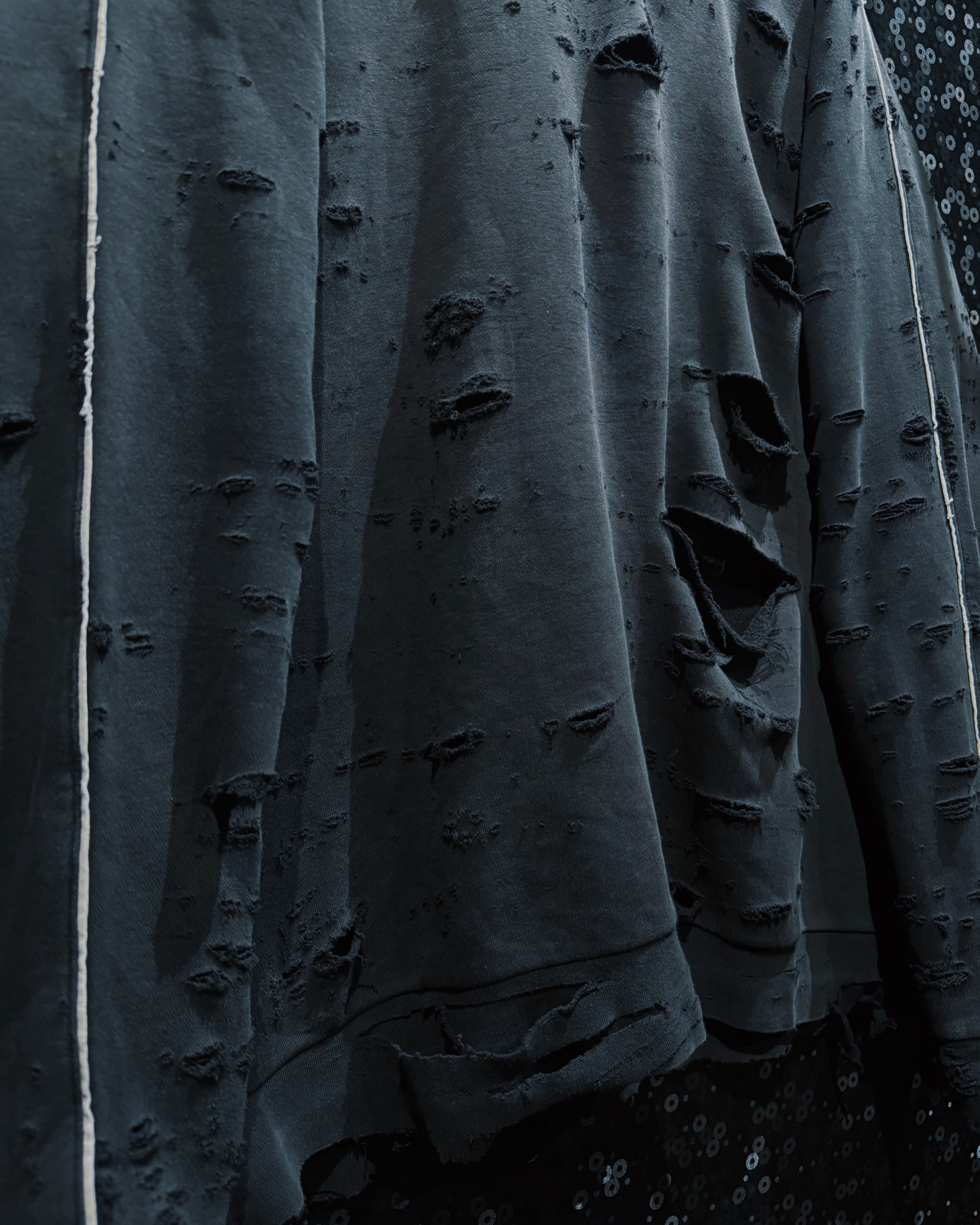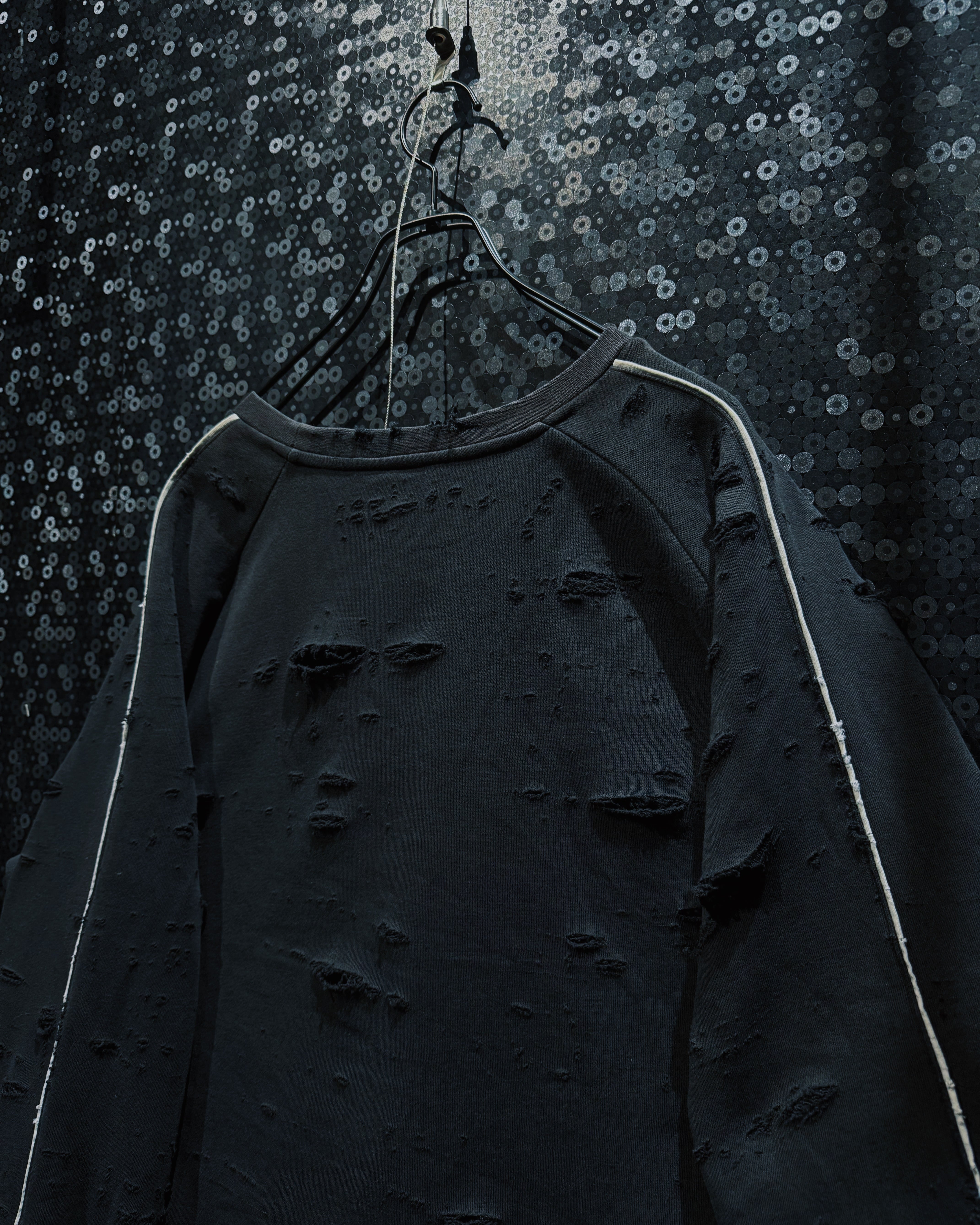 adidasのパフォーマンススウェットをベースに、AEIEMのフィルターを通して再構築したoriginal “boro” remake。全体に無数のダメージを散らしながらも、単なるクラッシュではなく、擦れ・裂け・フェードがレイヤーのように重なっていく表情が特徴的な一着。着込まれ、使い込まれた時間そのものをデザインとして落とし込んだ、静かに主張するボロ感が魅力。