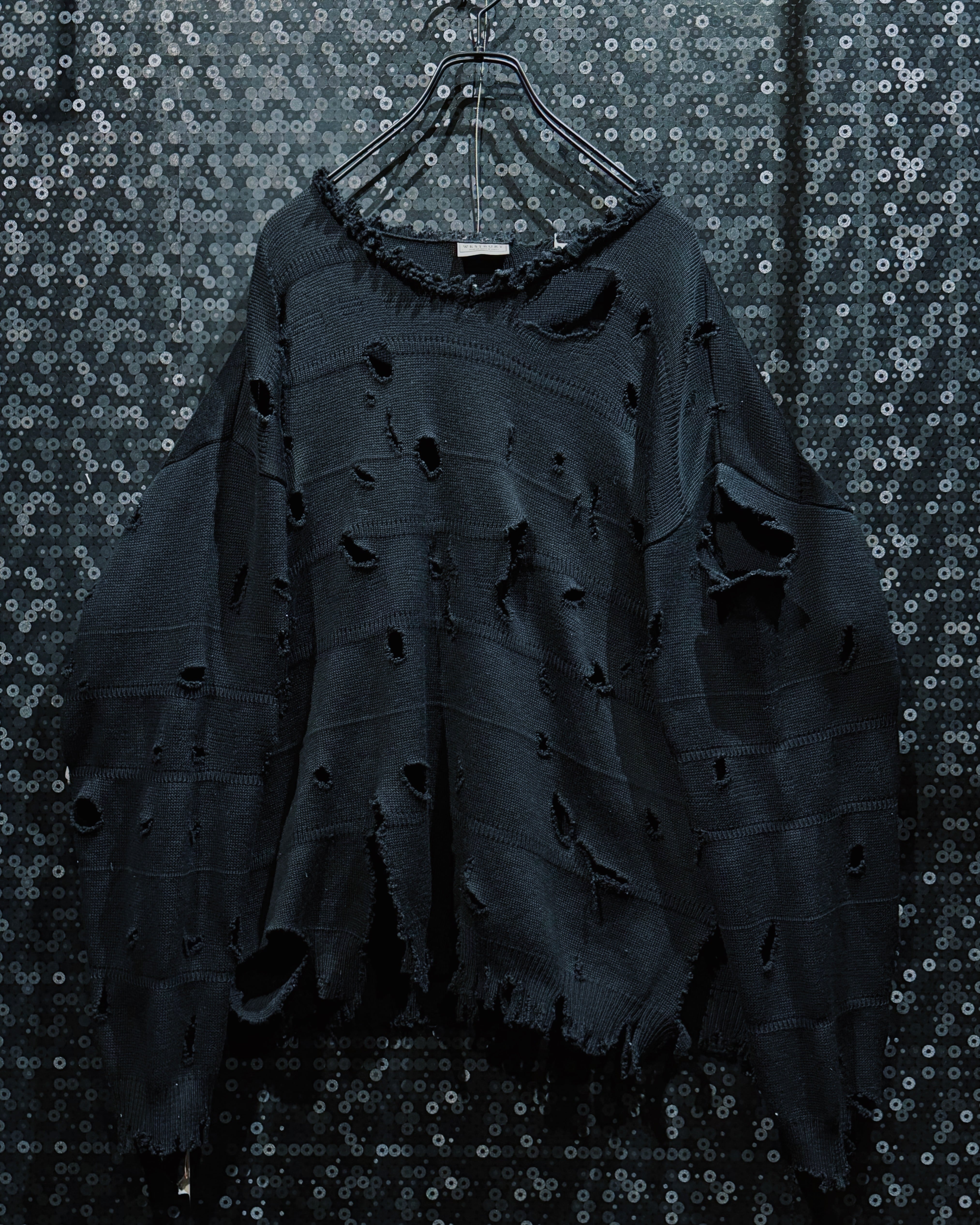 C&A取扱のクラシックニットブランド〈WESTBURY〉のプルオーバーニットをベースに、全体へ無数のクラッシュとホールを刻み込んだoriginal“boro”remake。均一で整った編み地をあえて破壊することで、ニット本来の柔らかさとボロ特有の荒さが共存する、非常に情報量の多い一着に仕上がっている。