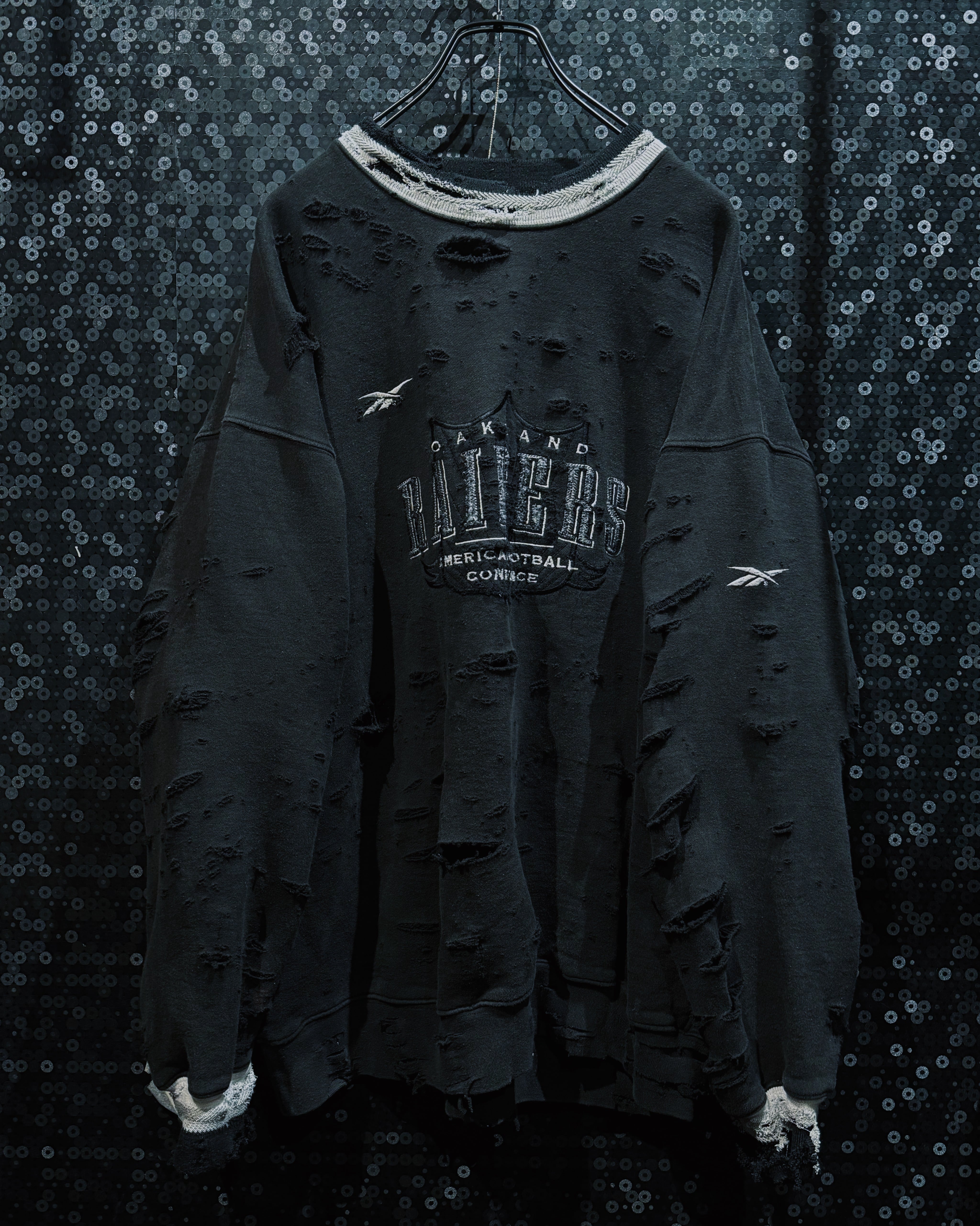 ReebokのNFLチームモノ「RAIDERS」グラフィックを土台に、全体へ極限までボロ加工を施した、圧倒的存在感を放つoriginal“boro”remakeスウェット。ブラックベースのボディに、長年着倒されたかのようなクラッシュと擦れを全面に散らし、グラフィックそのものが風化していく過程を可視化したような一着に仕上がっている。