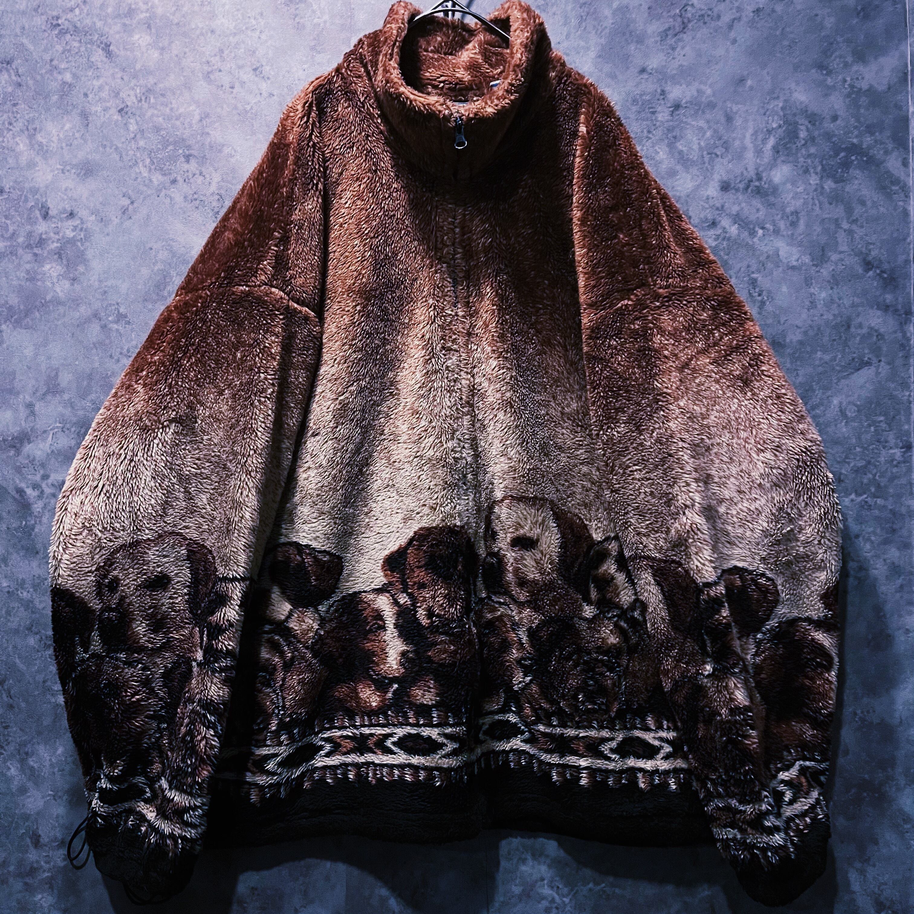 【doppio】vintage puppies design brown color zip up fleece jacket