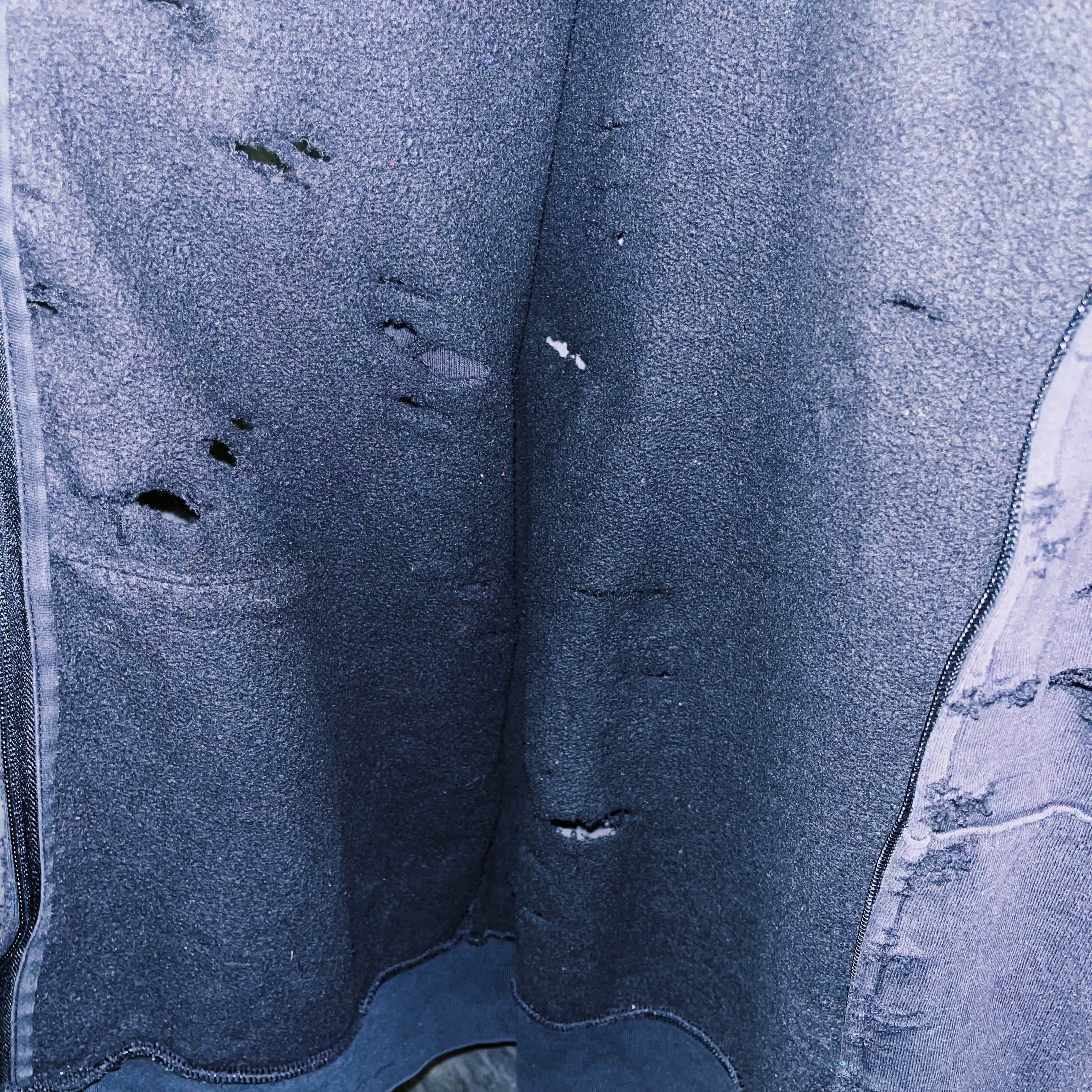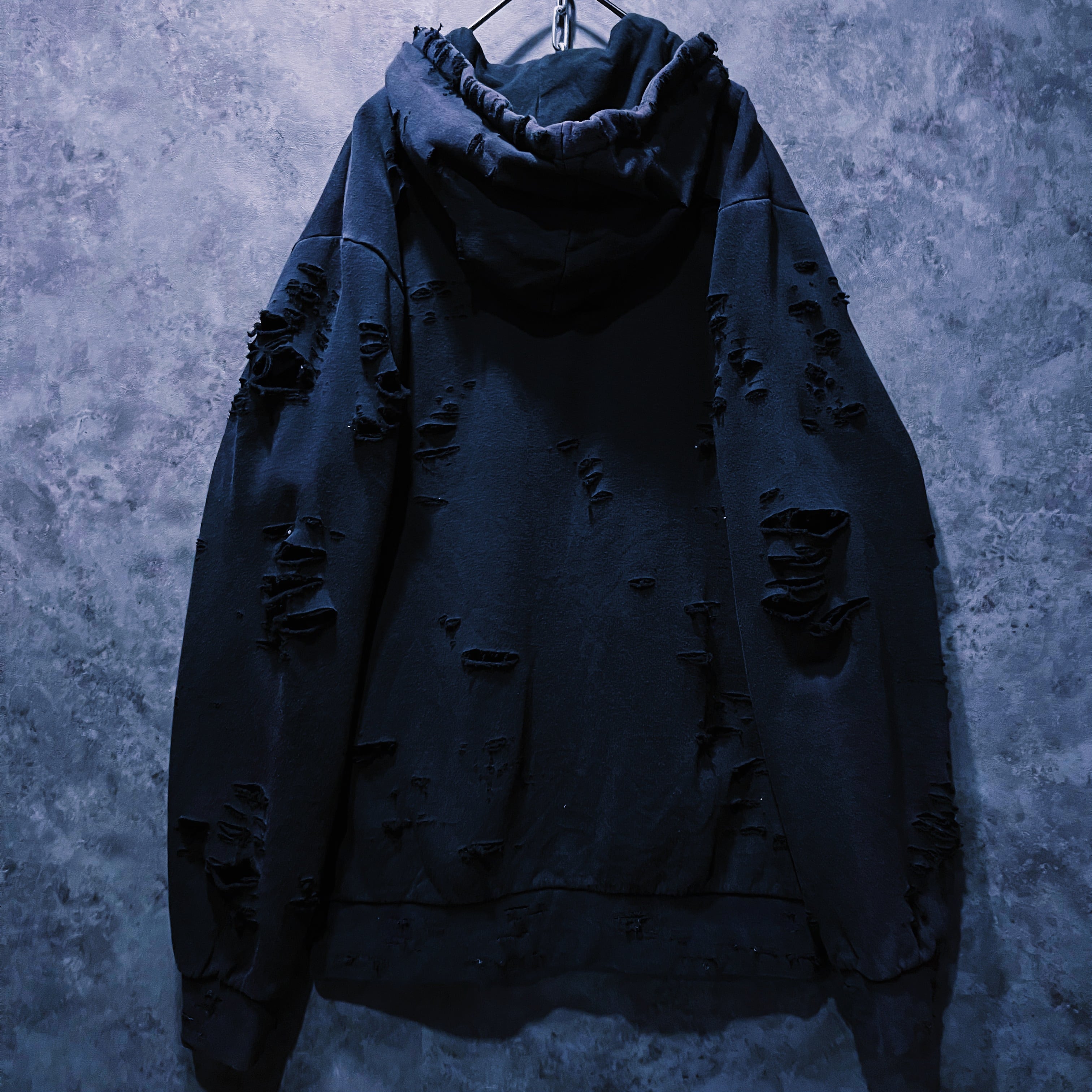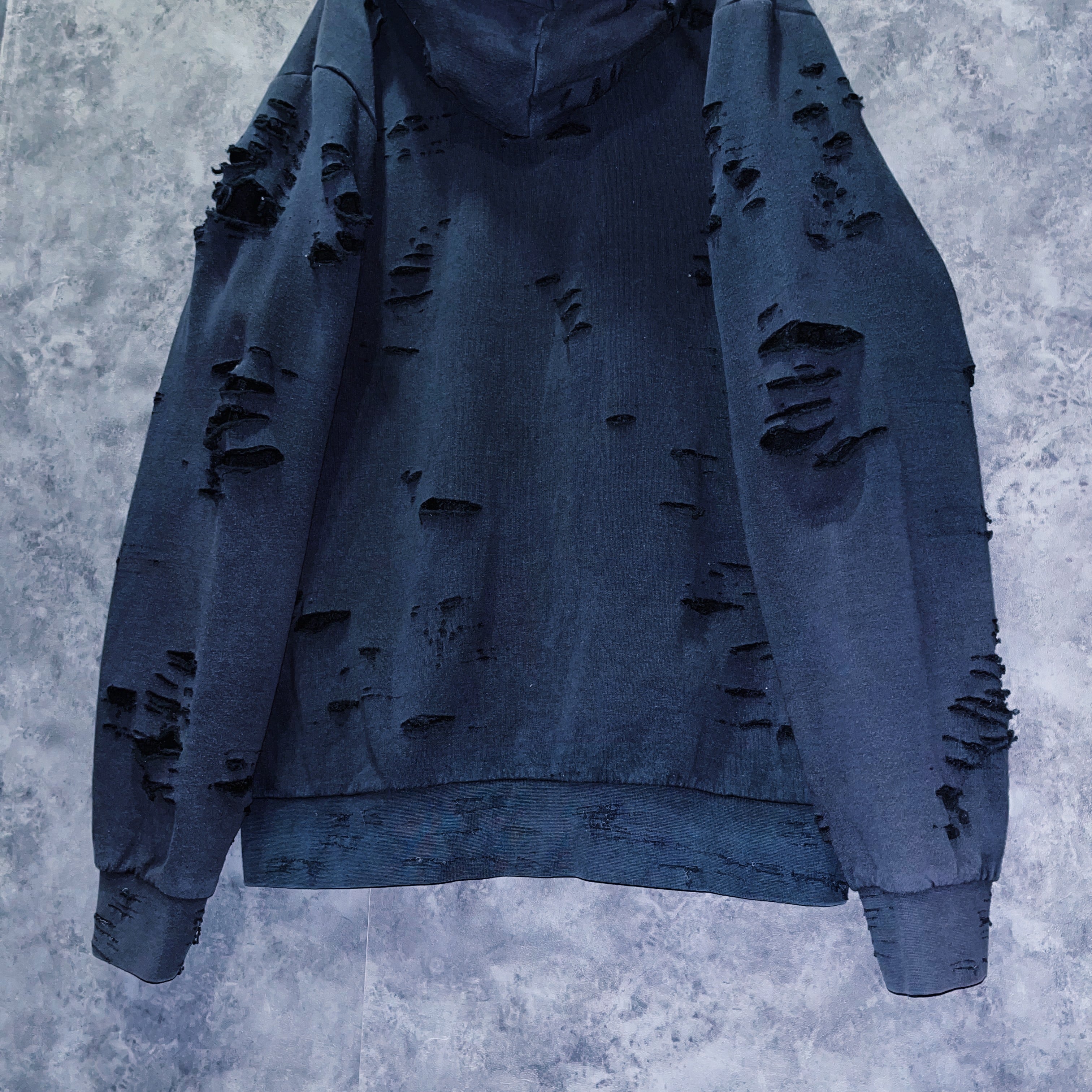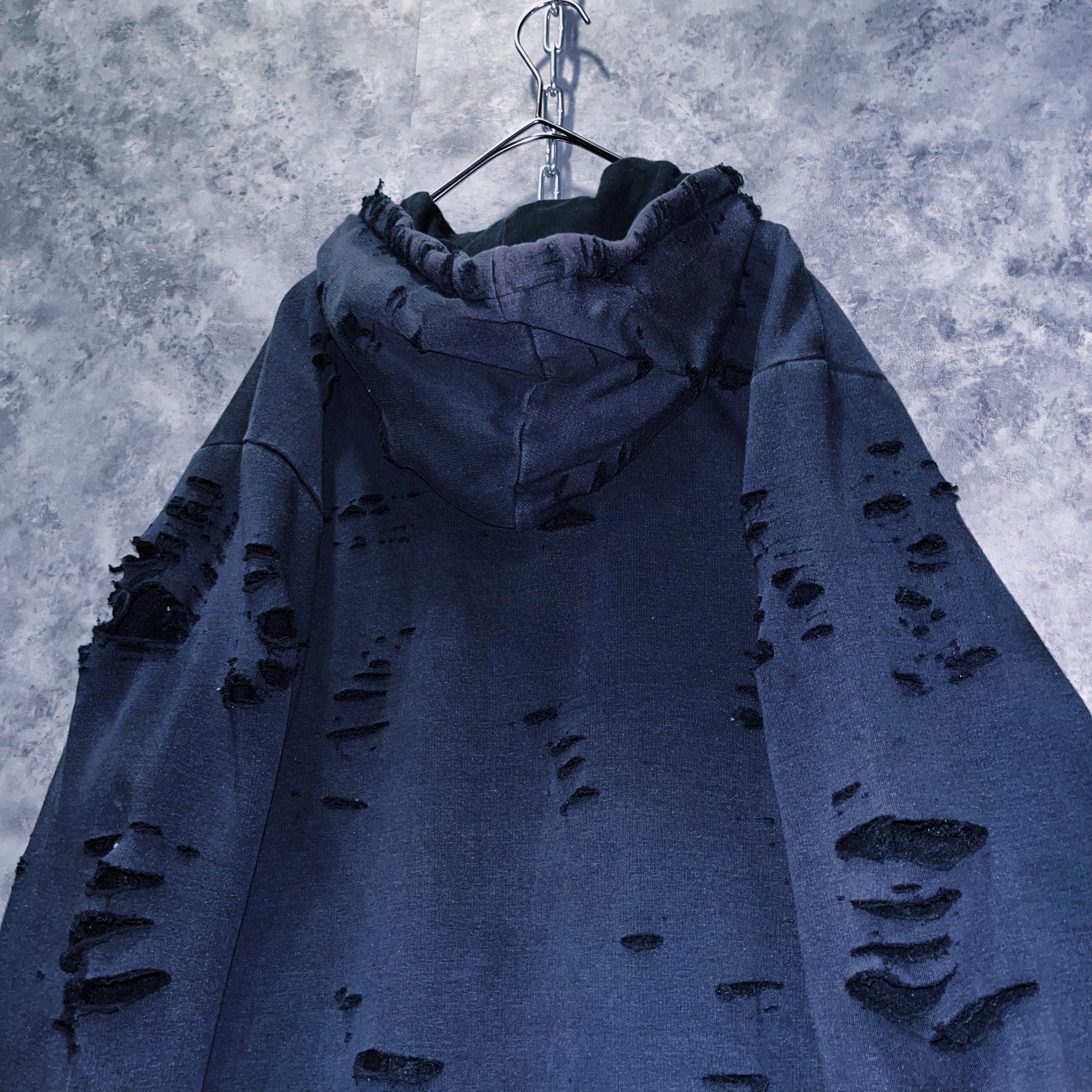 ボディには褪せたフェードデザインが施されており、ダメージと素晴らしい相性を見せてくれています。退廃的な印象を受ける一枚で、サッと羽織ってダメージの隙間からカラーをチラ見せするのもファッションを楽しませてくれます。