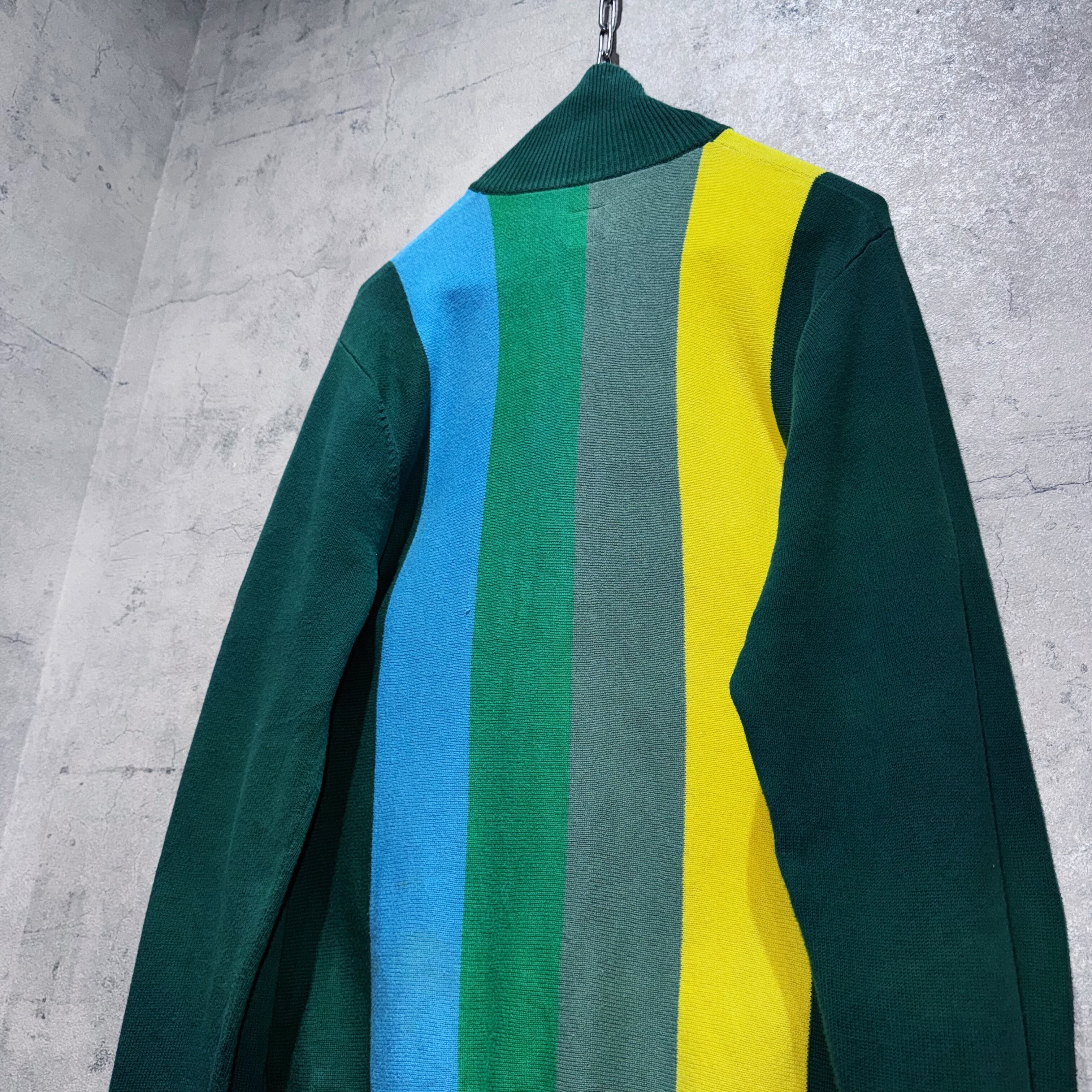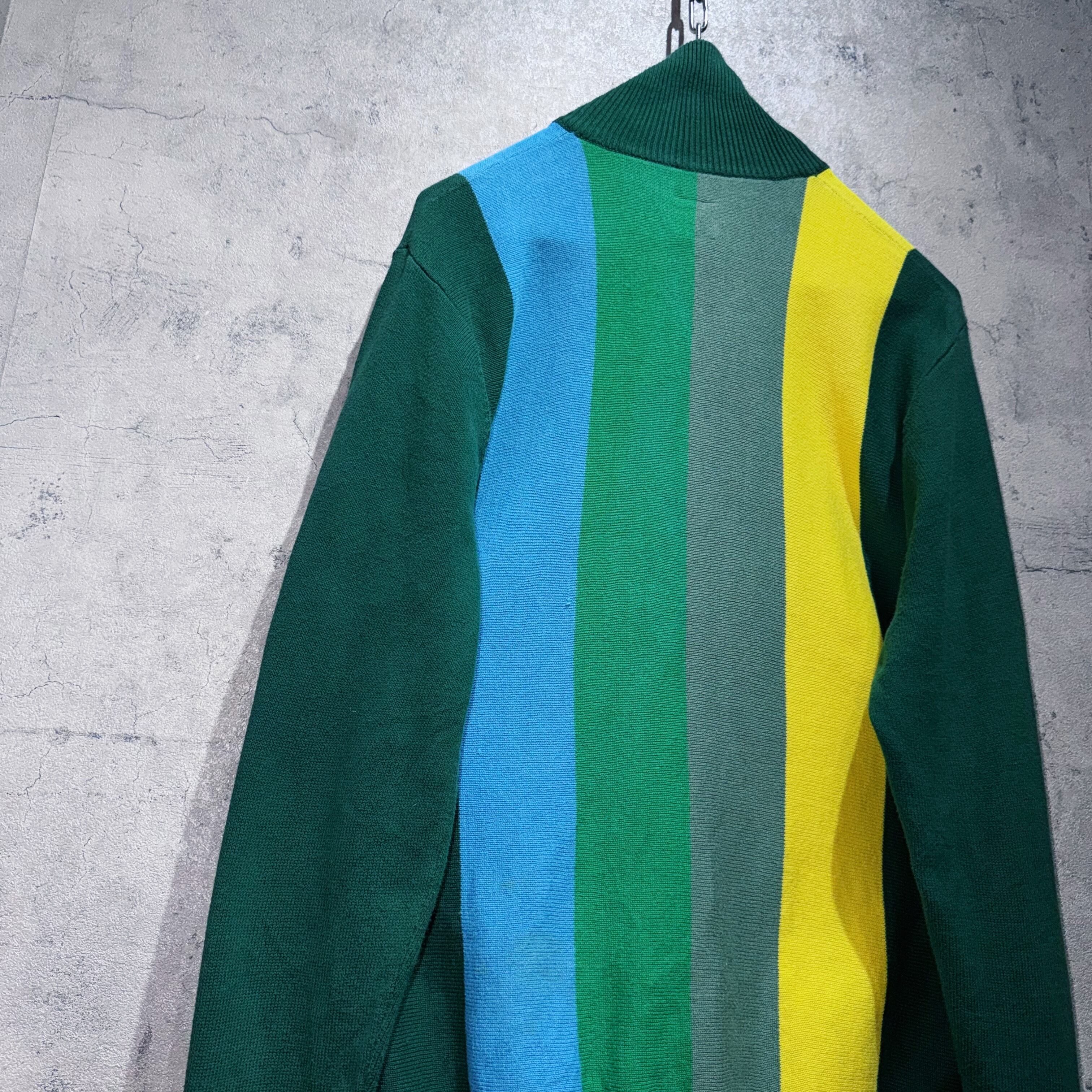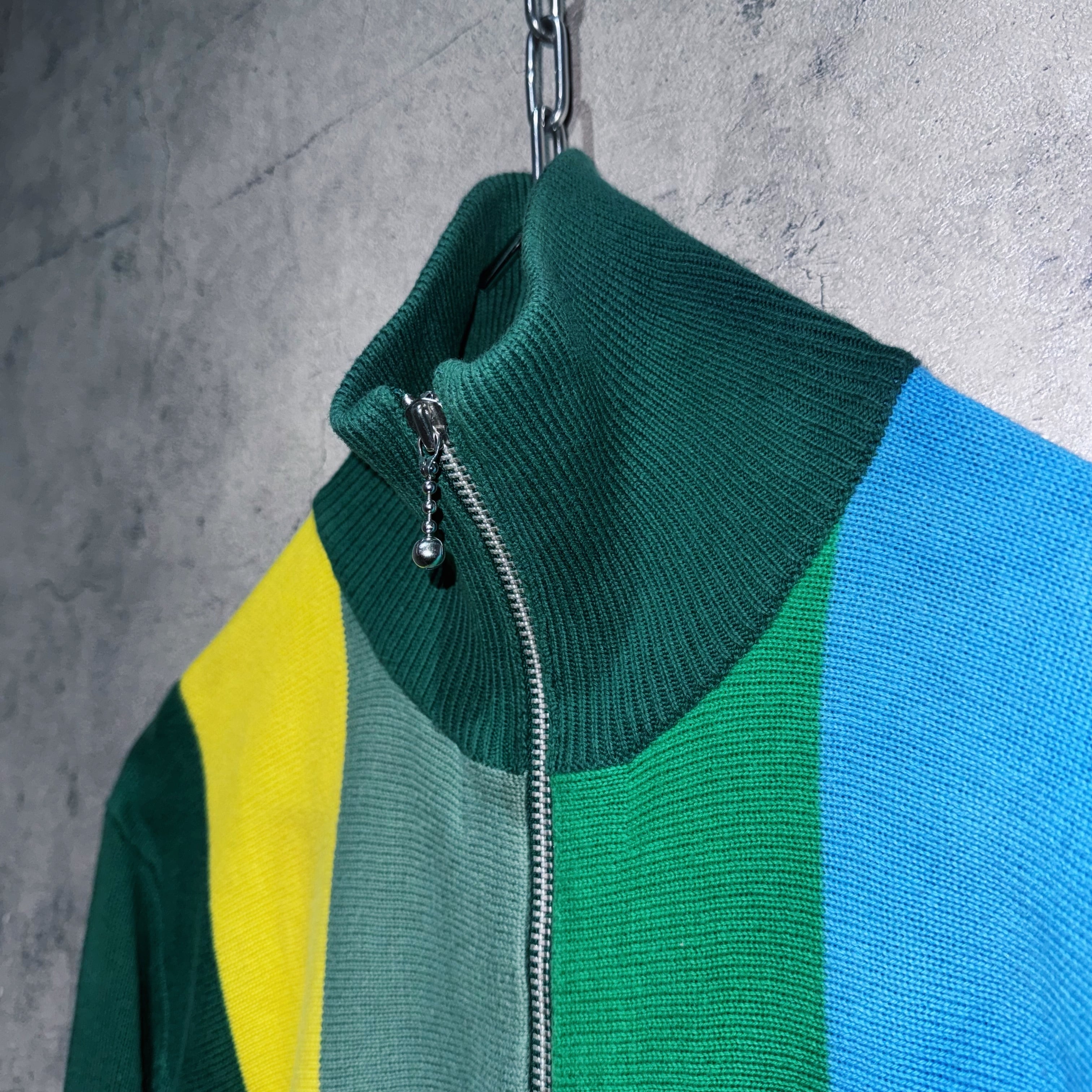 グリーン、ロイヤルグリーン、モスグリーン、ブルー、イエローの5色がスイッチングしたカラーリングが素晴らしいニットトラックジャケット。