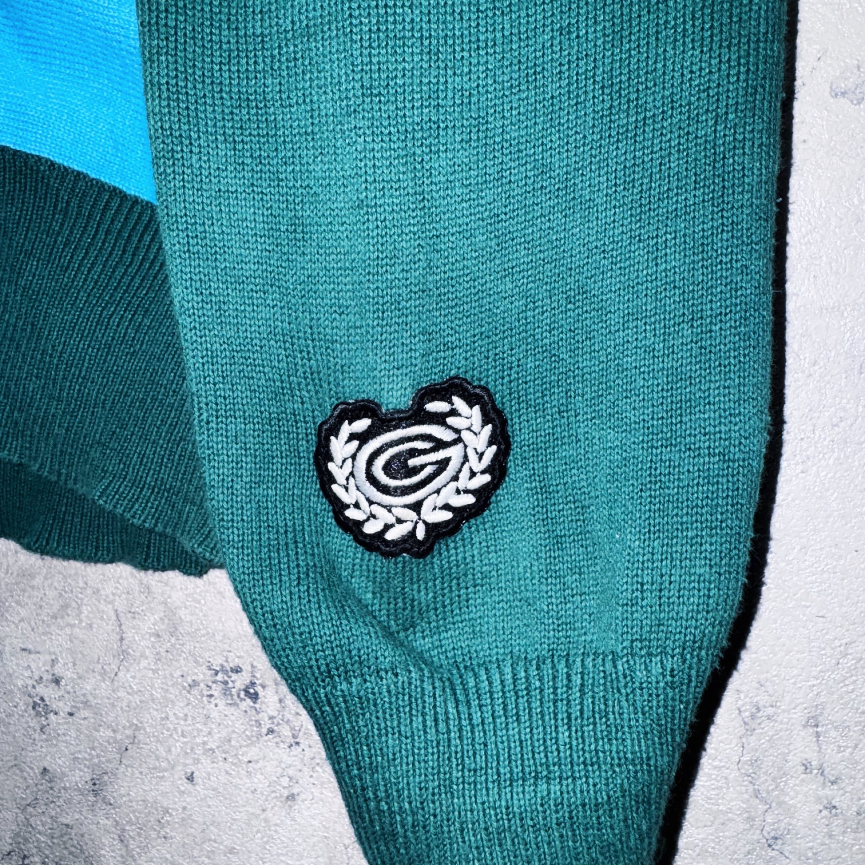 このニット素材のアイテムがアディダスから販売されたいたのがかなり稀有ですね。90後半〜2000年初頭のアディダスアイテムで使われていたGのエンブレムマークも搭載。