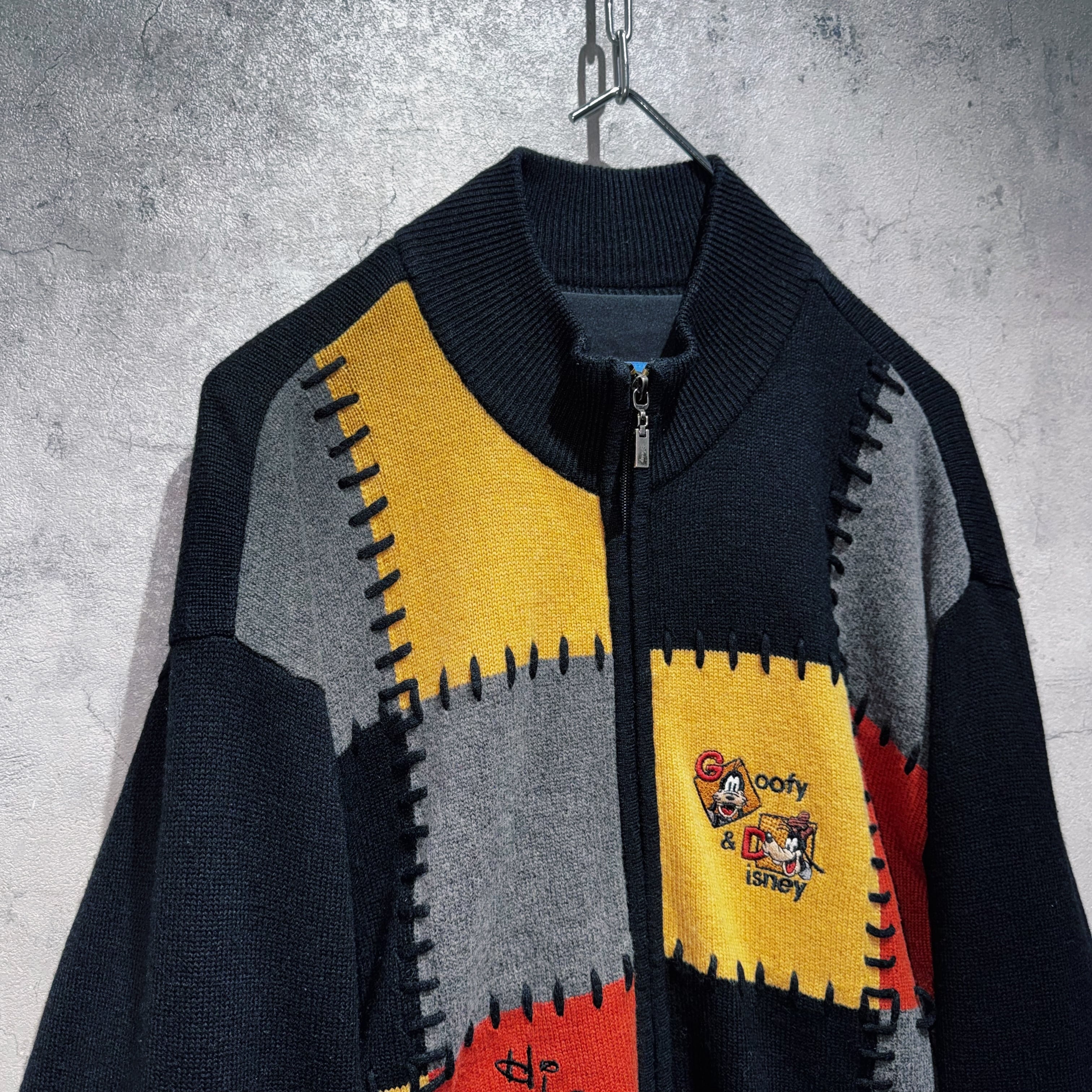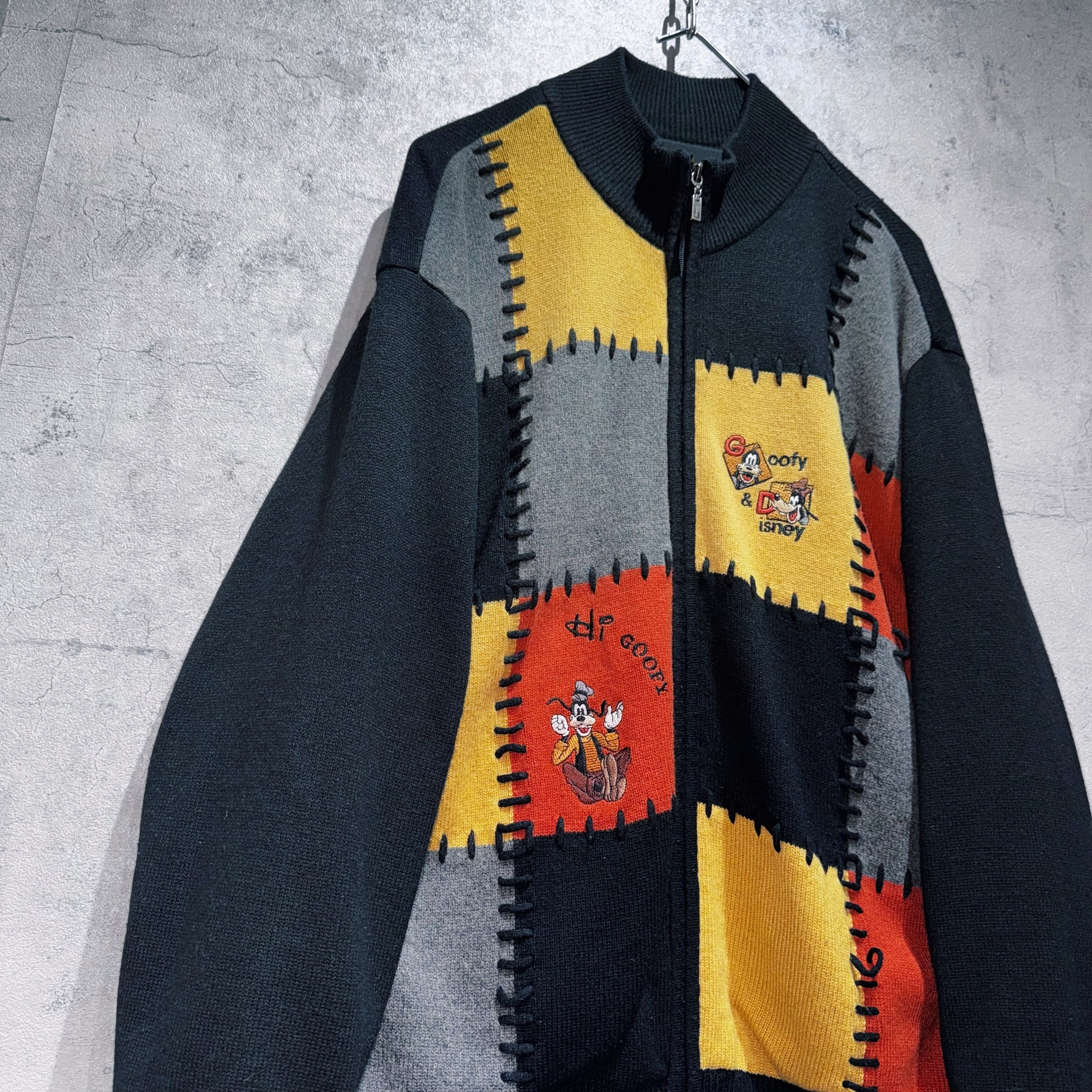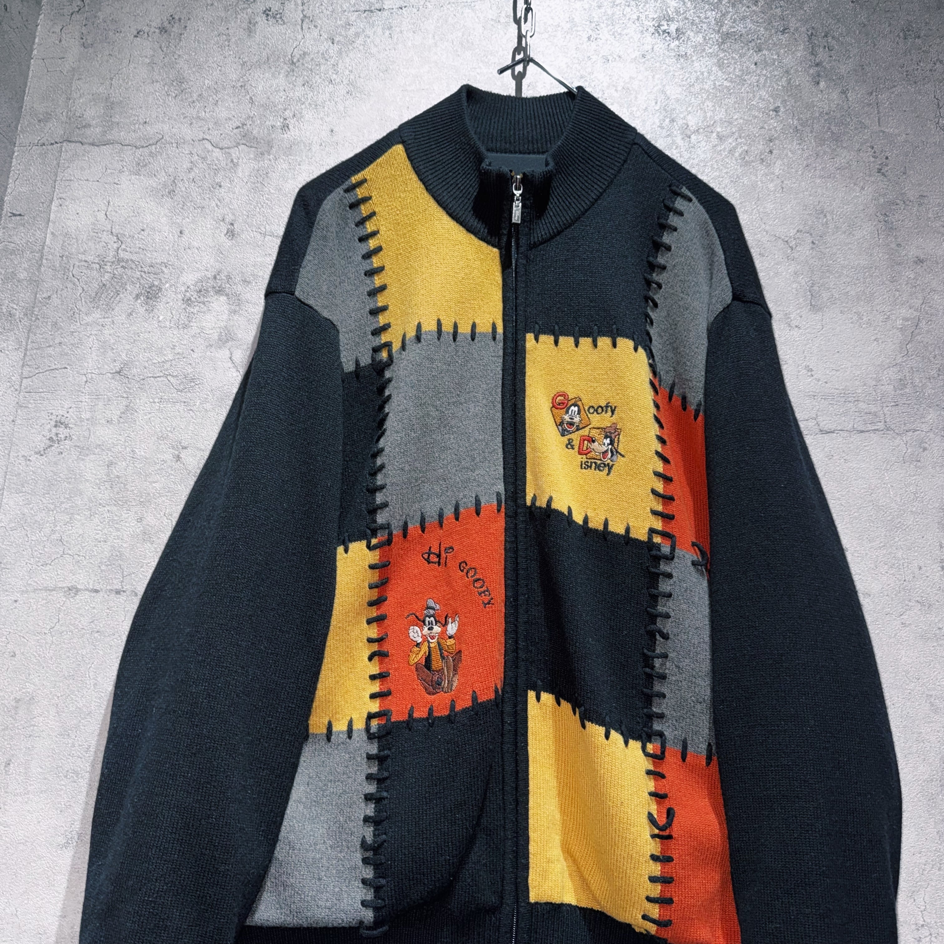 今回はグーフィーデザインのジップニット。フロントがオレンジ、イエロー、ブラック、グレーのボックス型でスイッチングしており、そこにグーフィーの刺繍をあしらった可愛らしいデザイン。