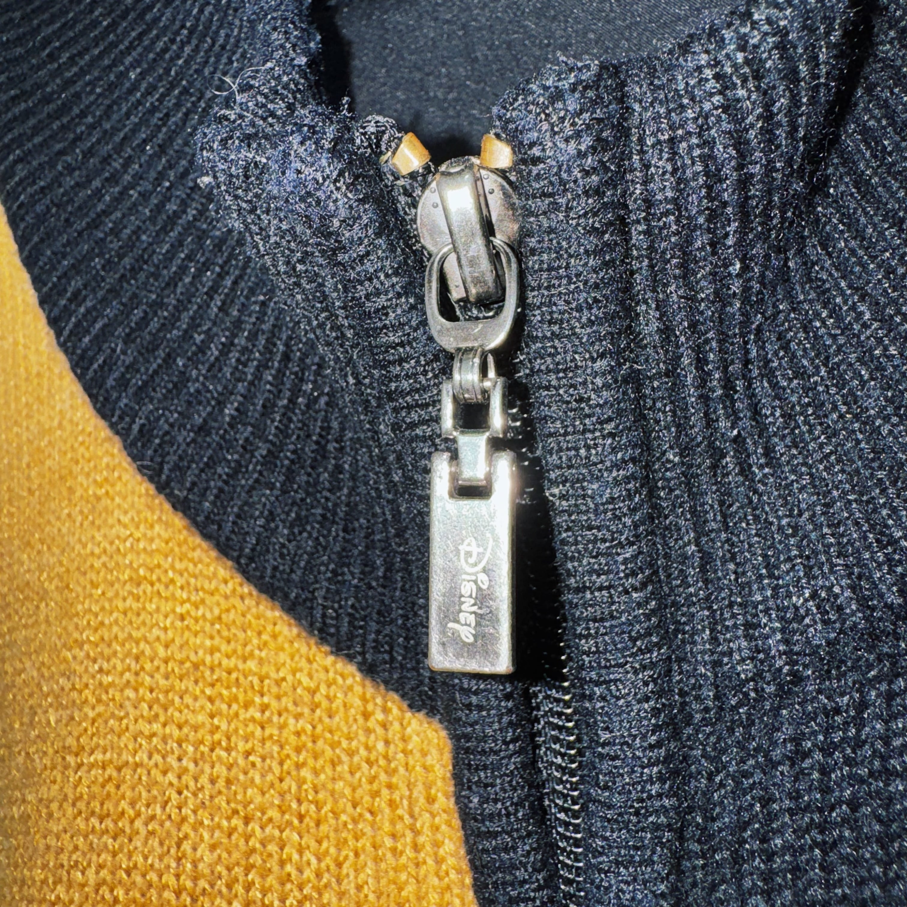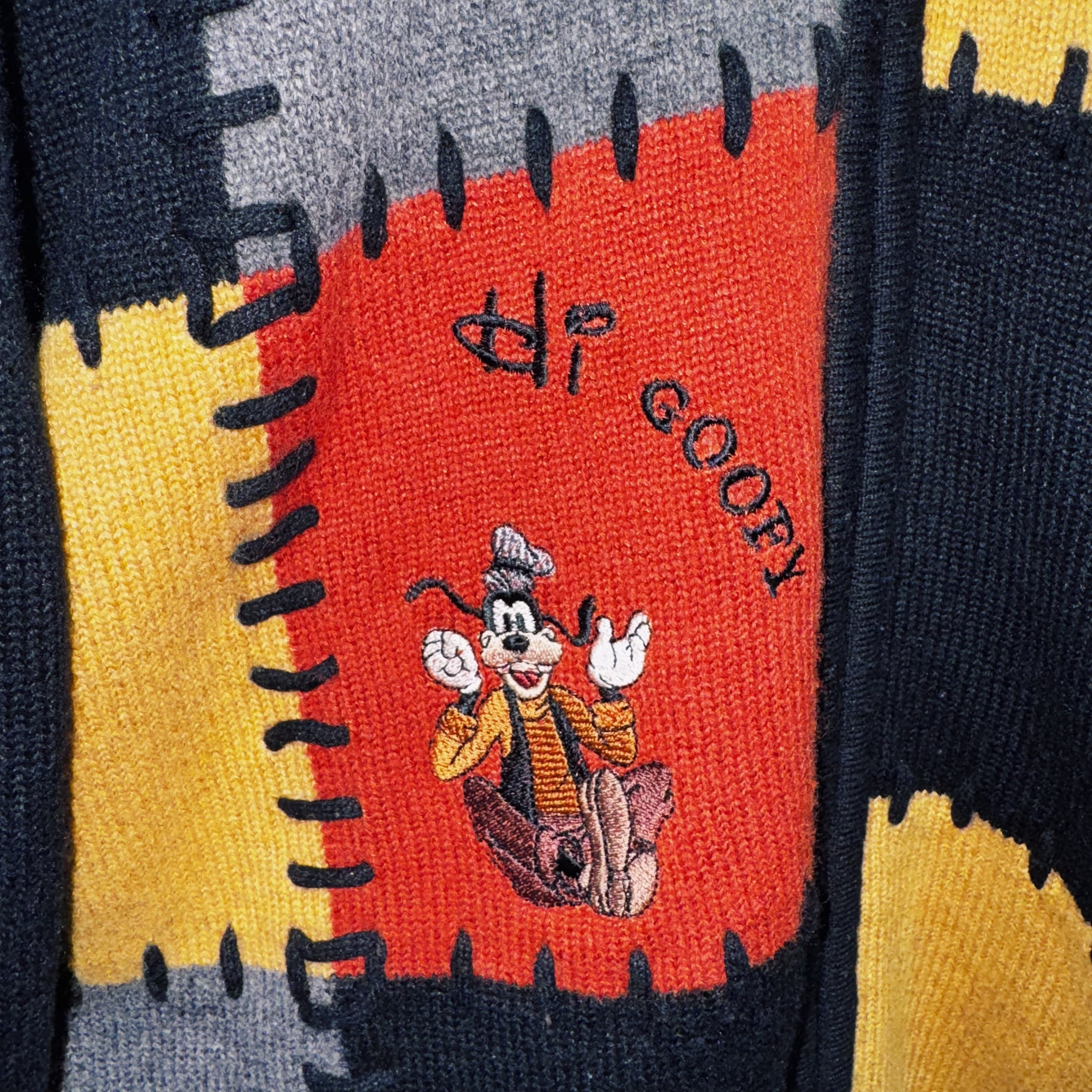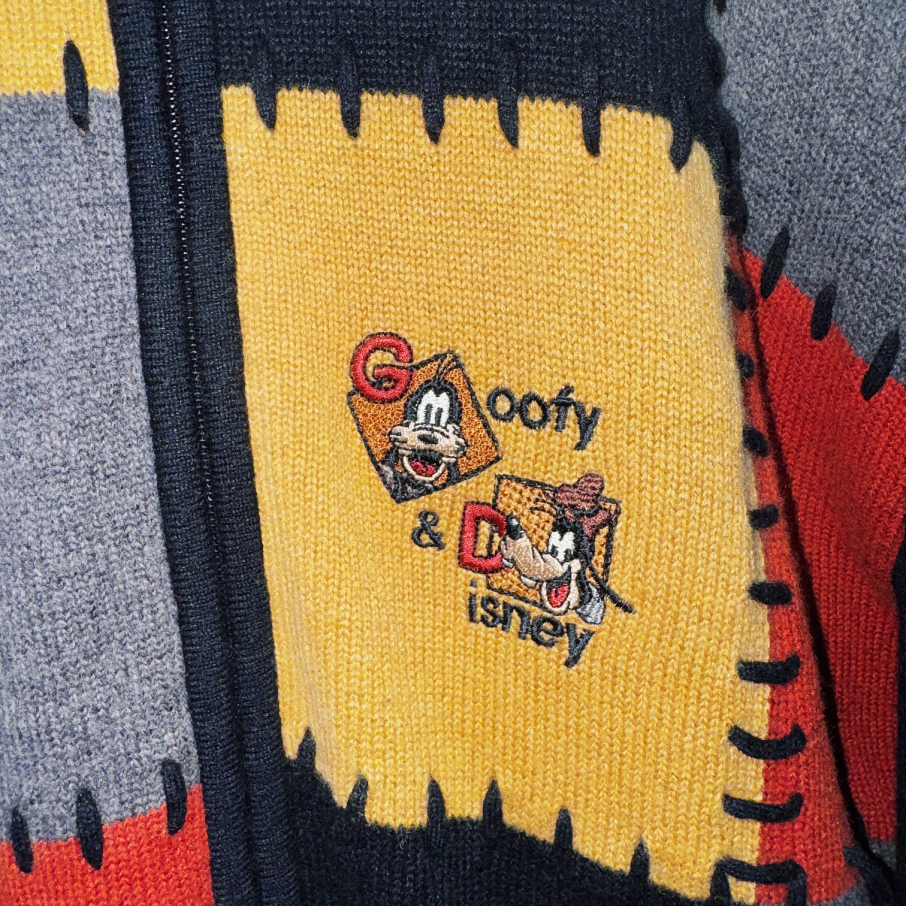 今回はグーフィーデザインのジップニット。フロントがオレンジ、イエロー、ブラック、グレーのボックス型でスイッチングしており、そこにグーフィーの刺繍をあしらった可愛らしいデザイン。
