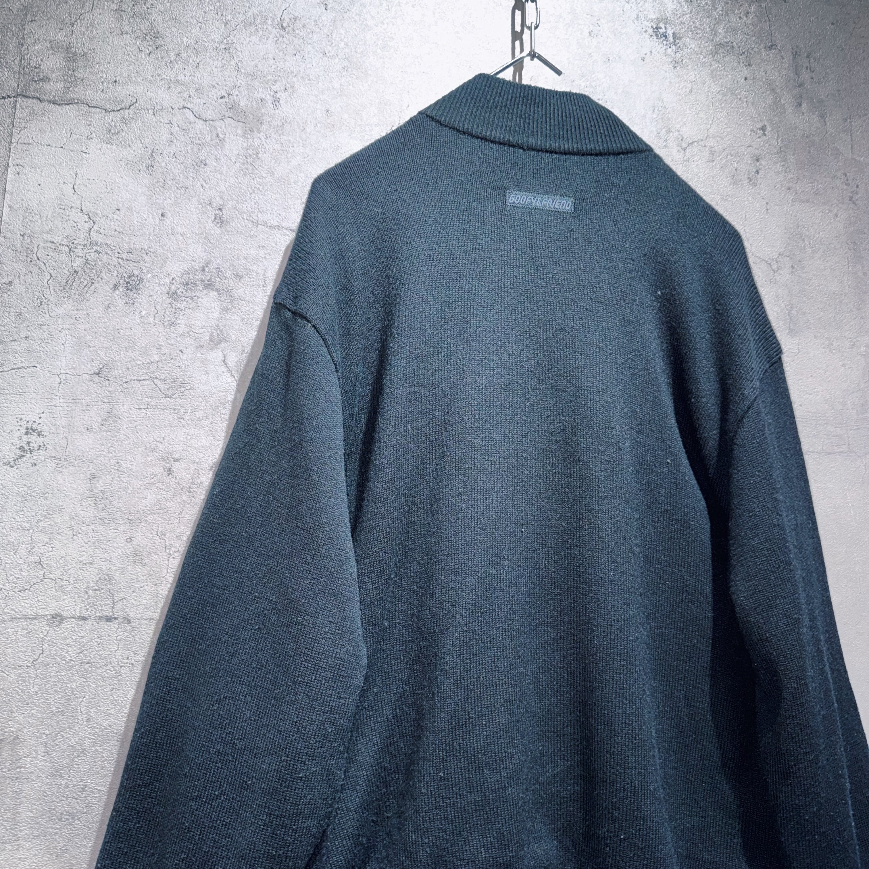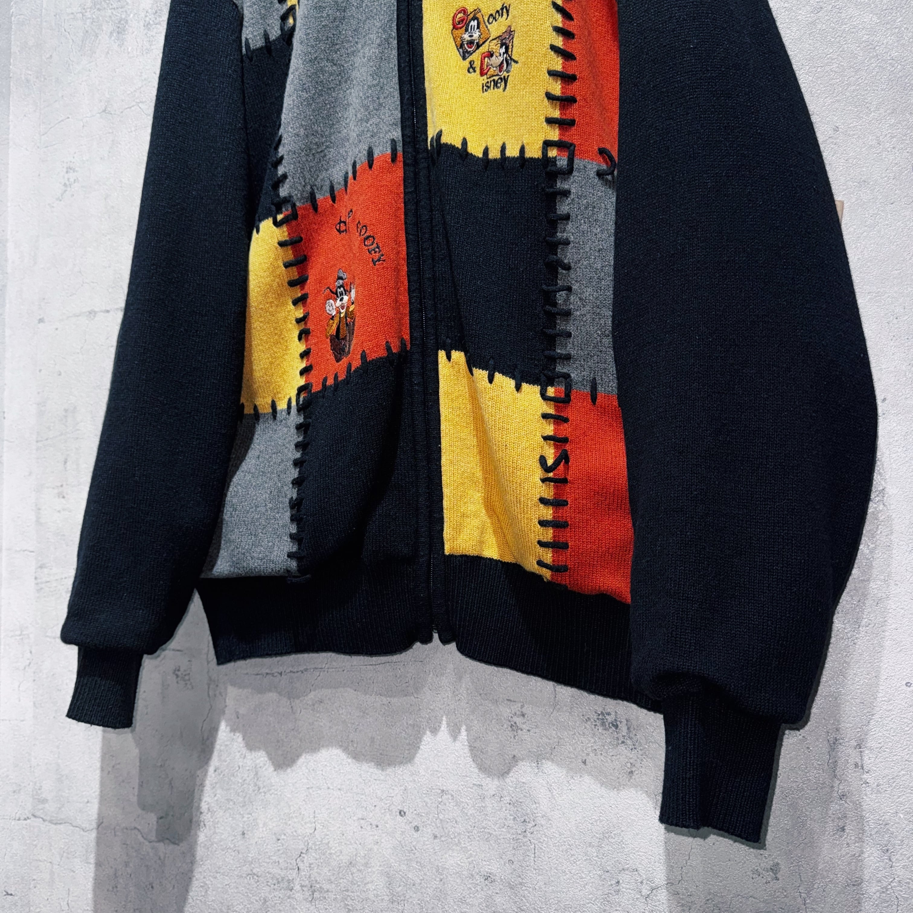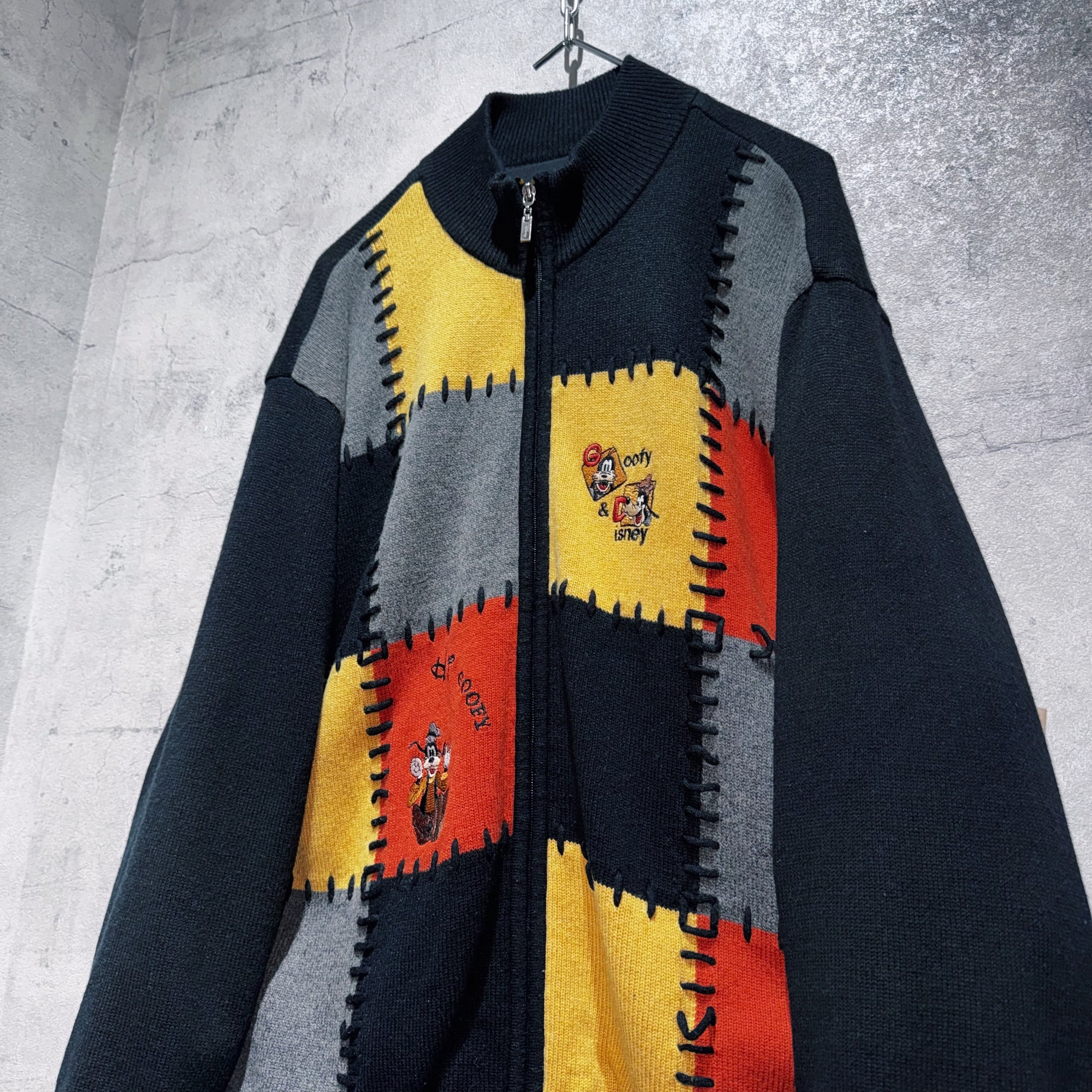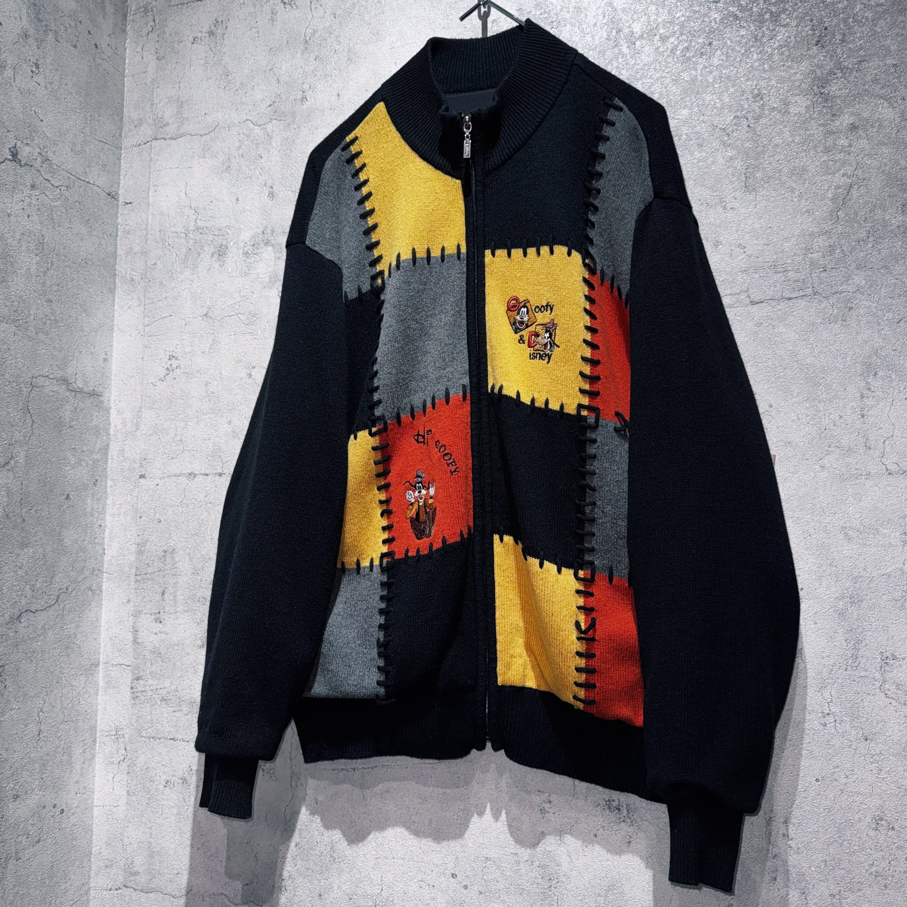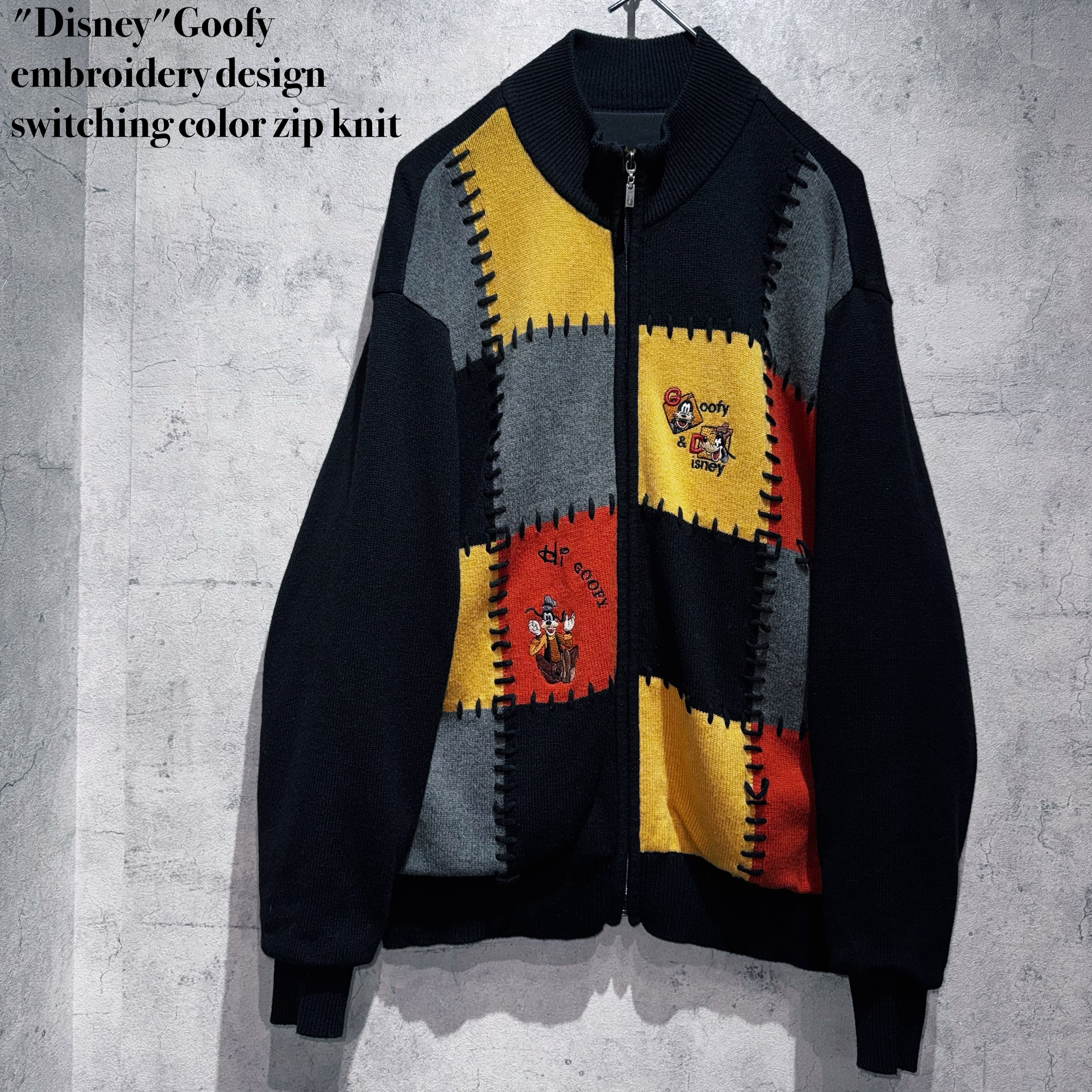 "ディズニー"グーフィーエンブロイダリーデザインスイッチングカラージップニット