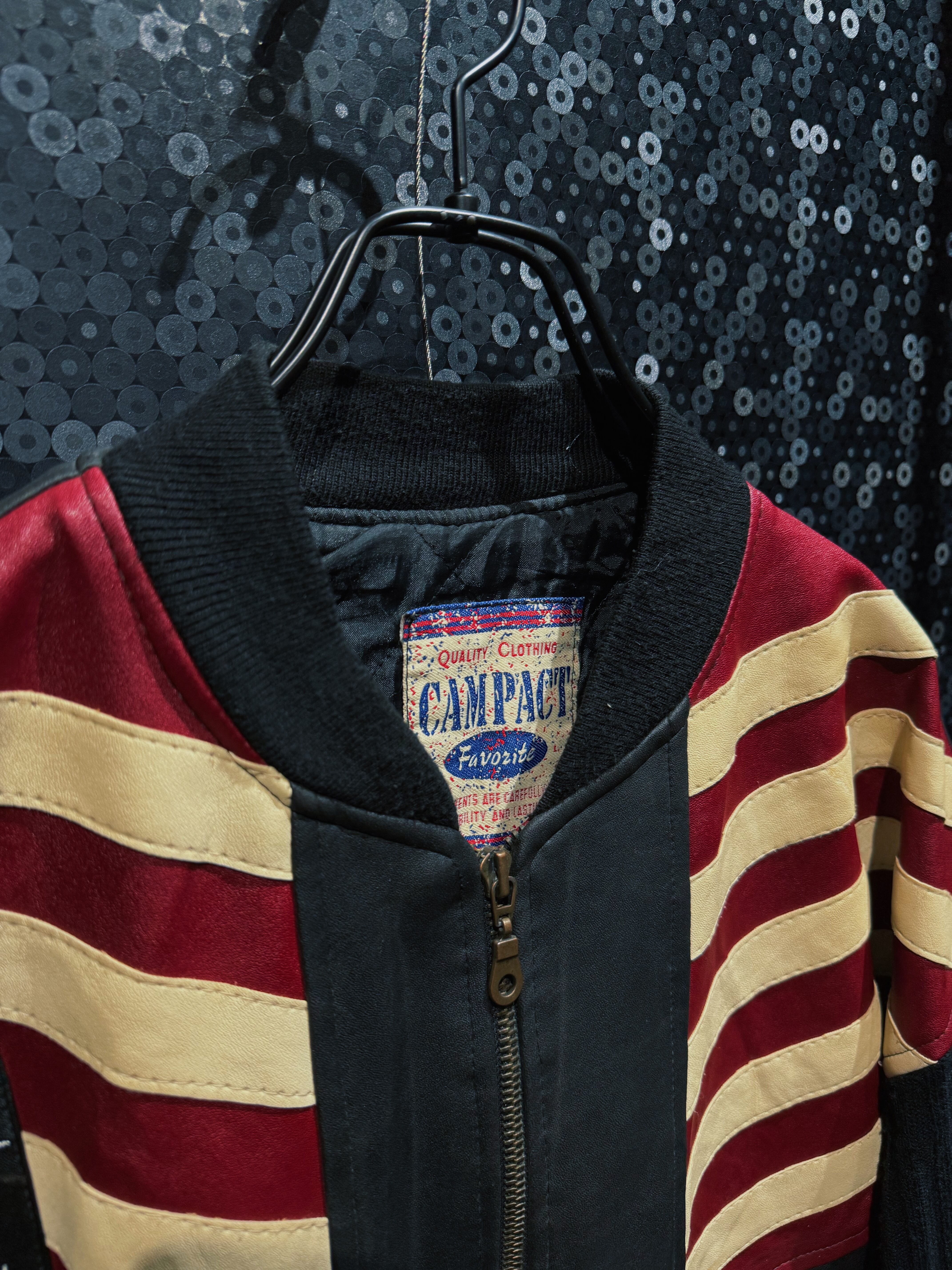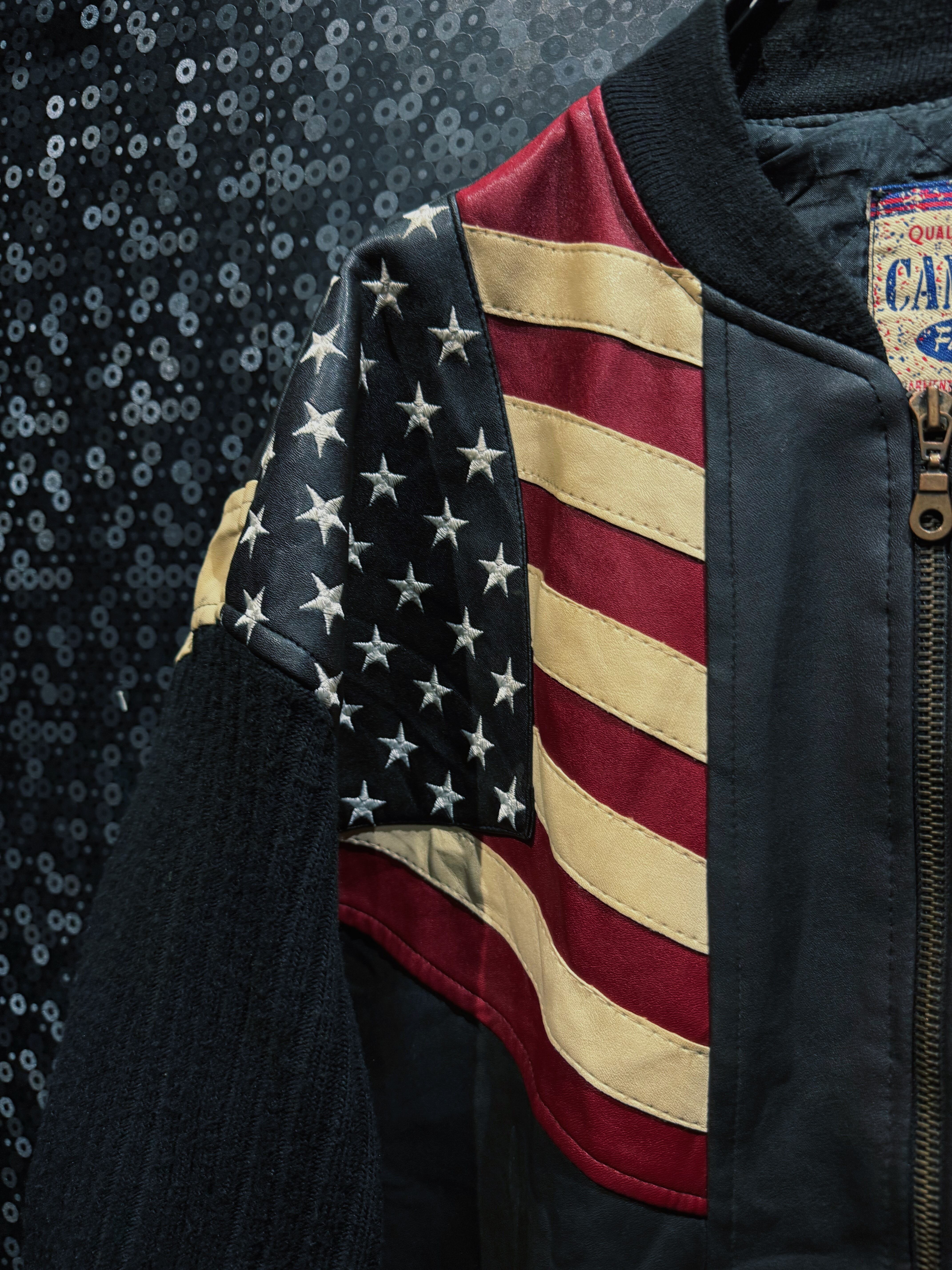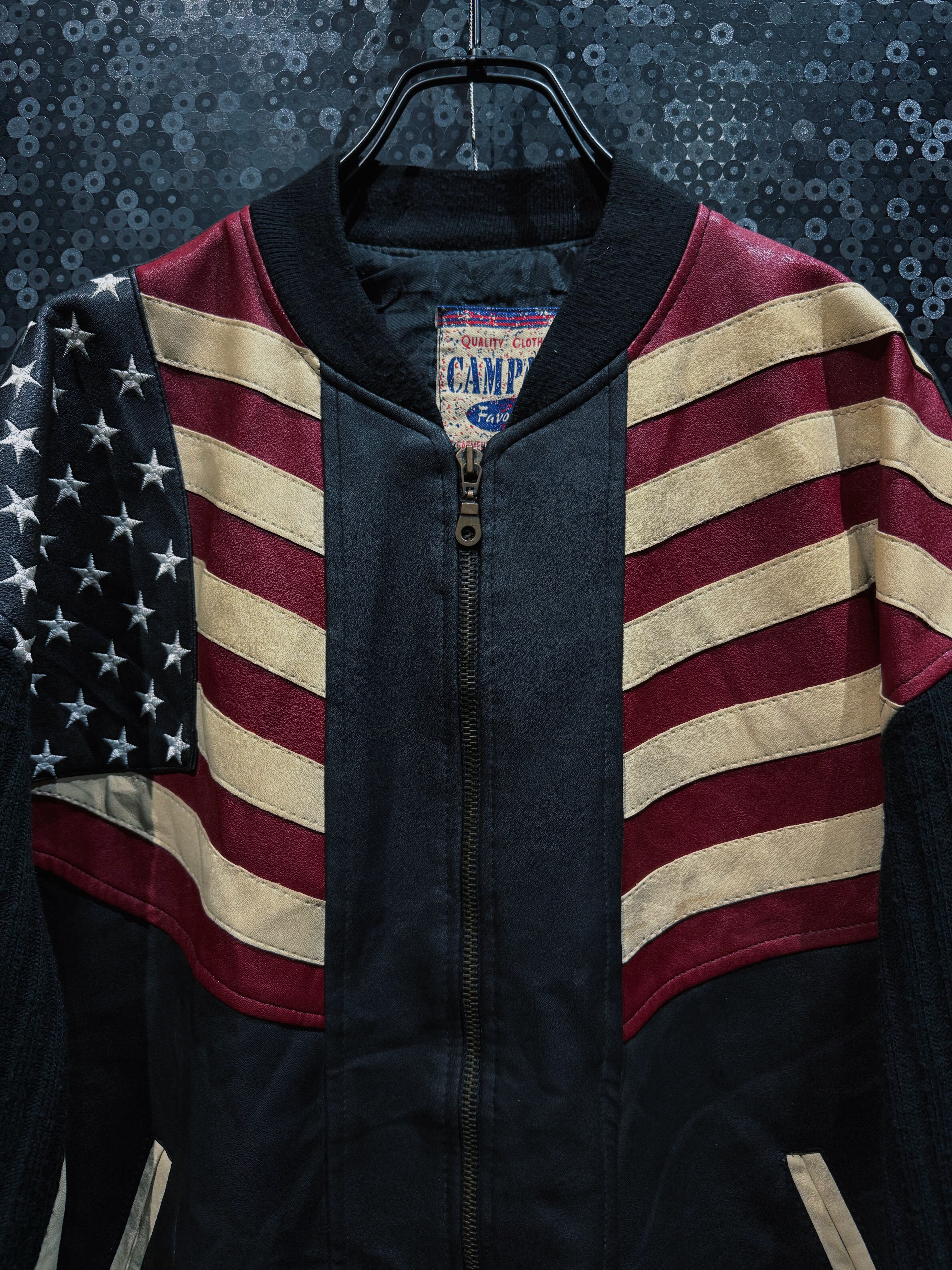 “CAMPACT”による、星条旗モチーフを大胆に落とし込んだヴィンテージレザーボンバージャケット。ブラックレザーボディをベースに、レッド・アイボリー・ネイビーで構成されたアメリカンフラッグパネルをフロント全面に切り替えた、非常にインパクトの強い一着。色味は経年により程よくフェードしており、主張の強さの中にヴィンテージ特有の深みと落ち着きが共存している。