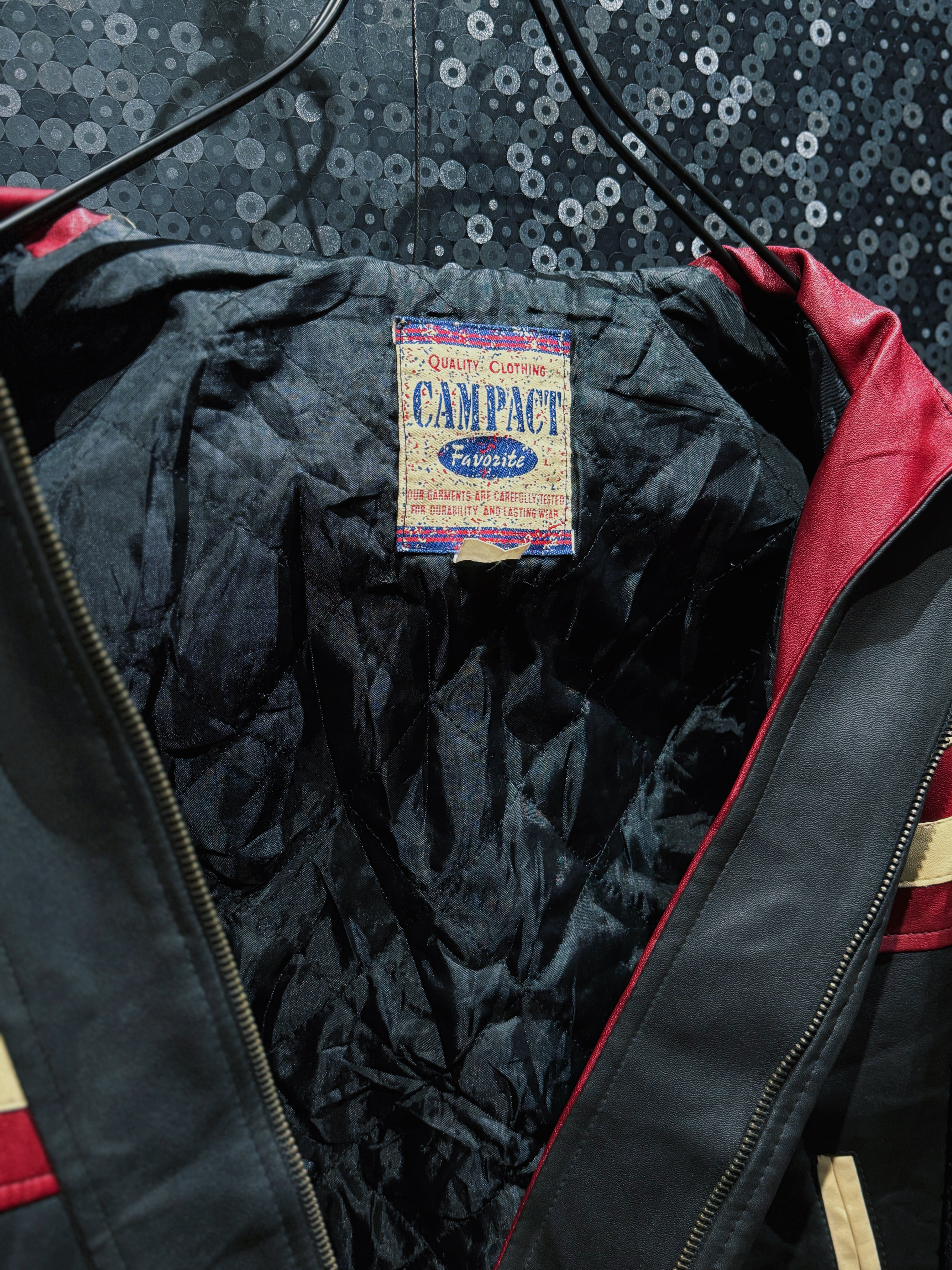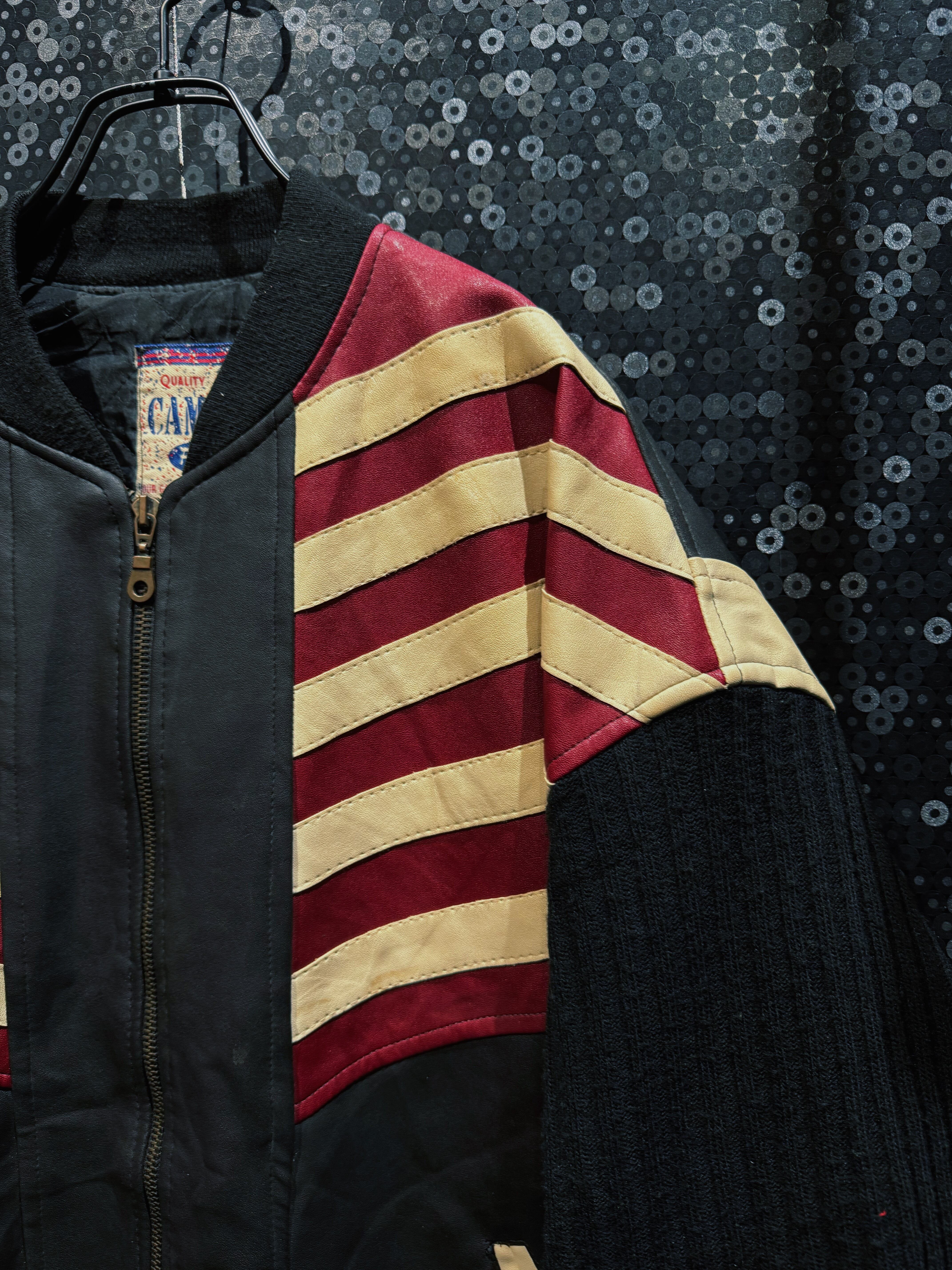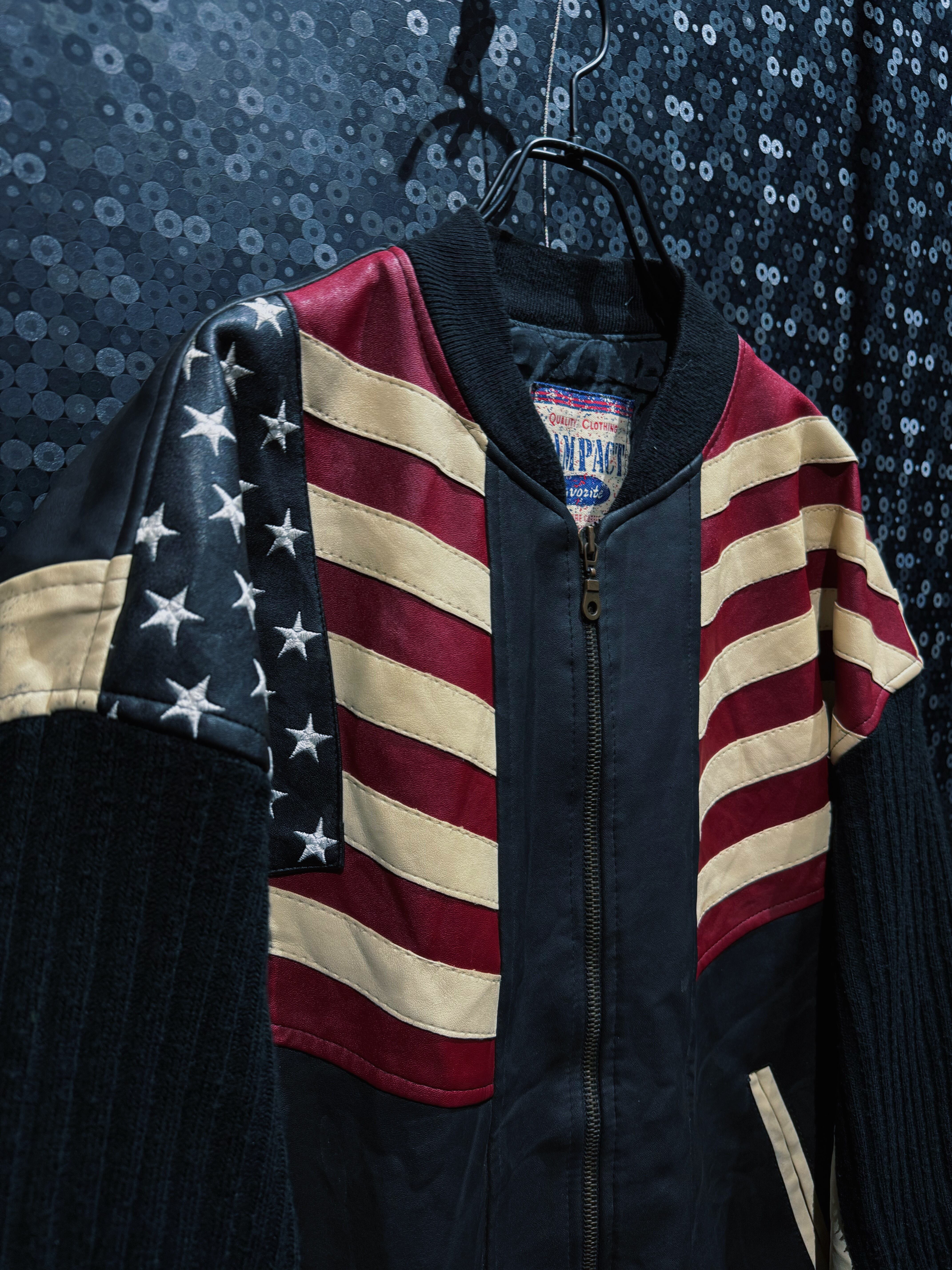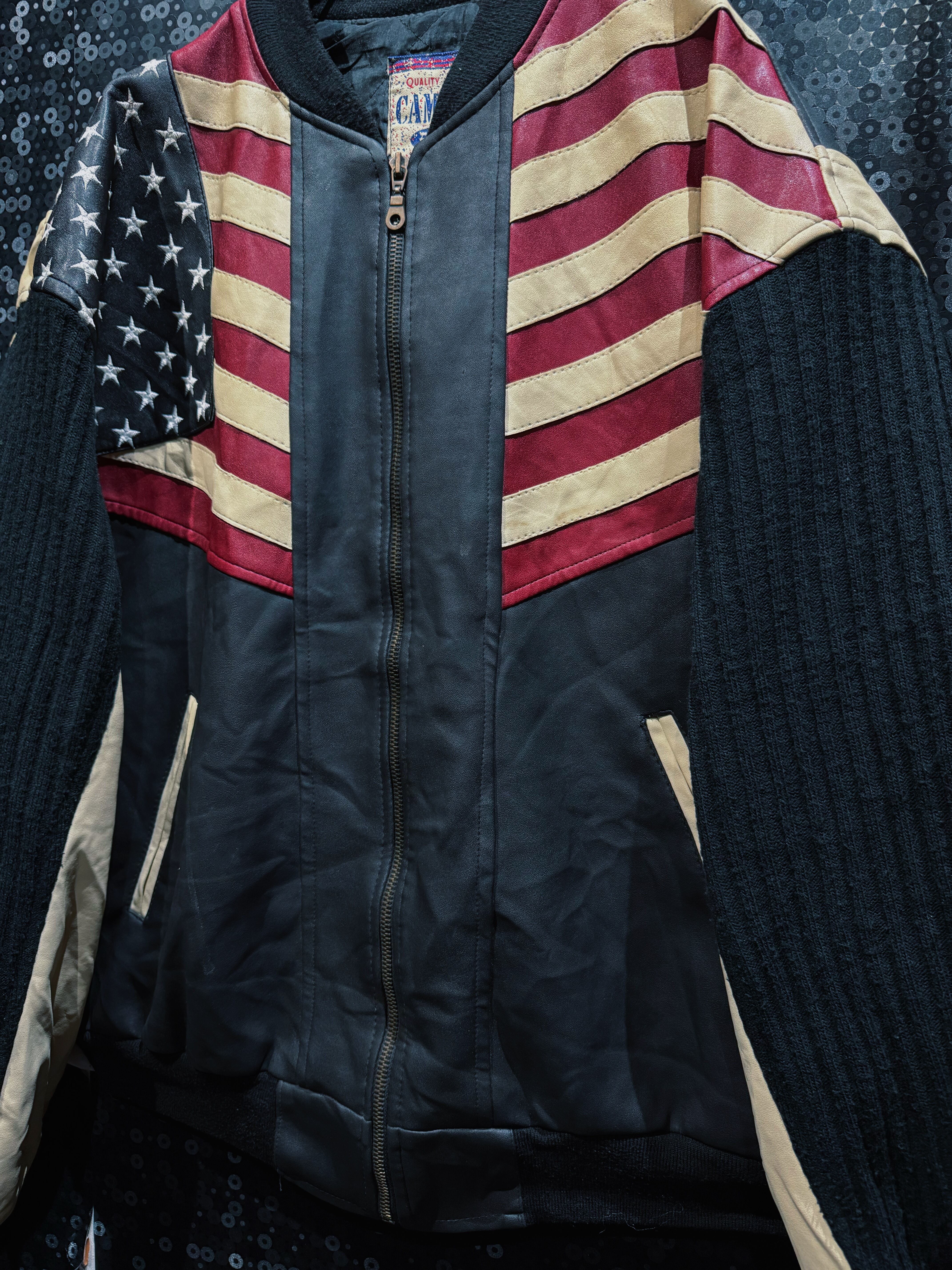 “CAMPACT”による、星条旗モチーフを大胆に落とし込んだヴィンテージレザーボンバージャケット。ブラックレザーボディをベースに、レッド・アイボリー・ネイビーで構成されたアメリカンフラッグパネルをフロント全面に切り替えた、非常にインパクトの強い一着。色味は経年により程よくフェードしており、主張の強さの中にヴィンテージ特有の深みと落ち着きが共存している。