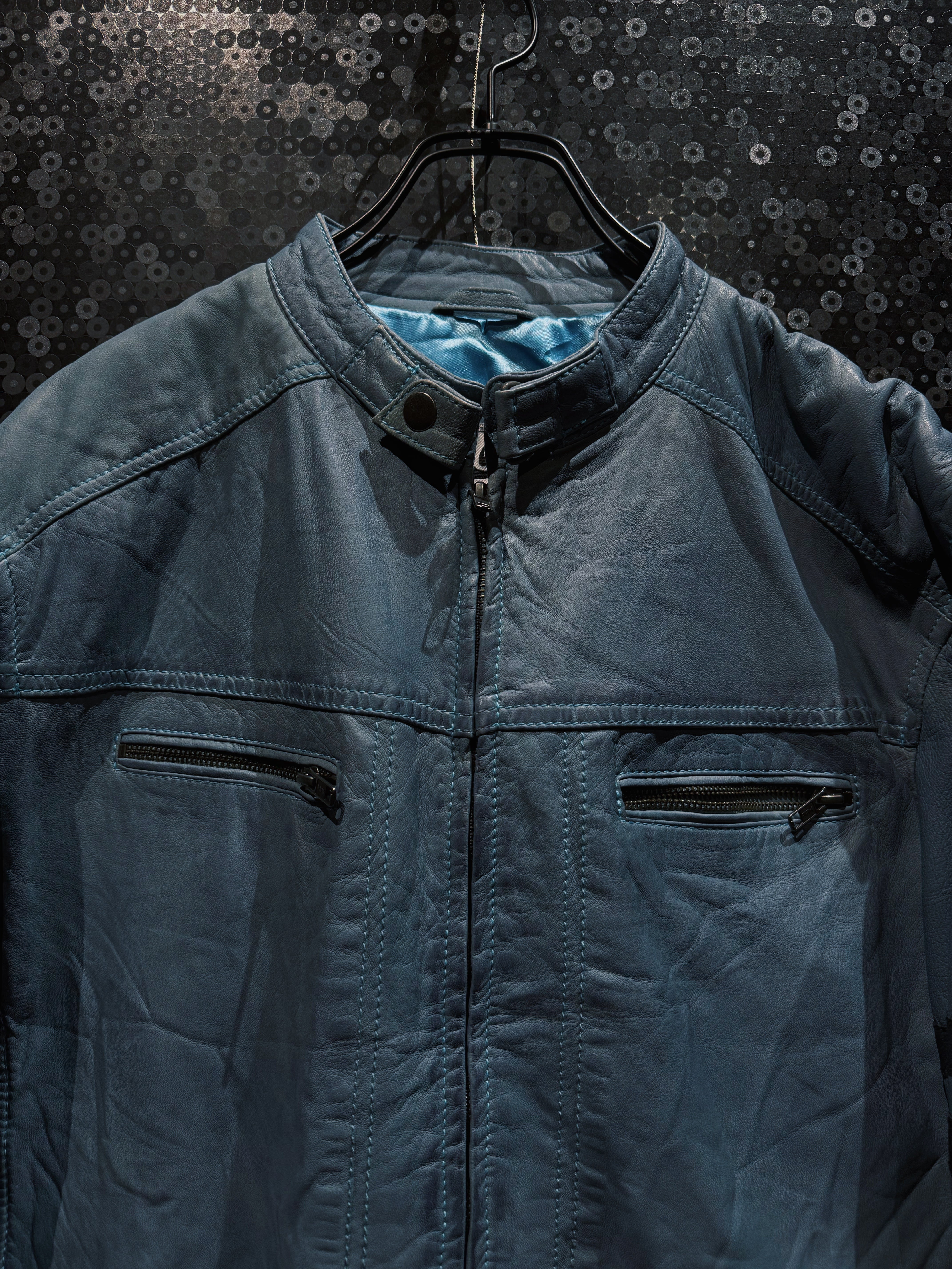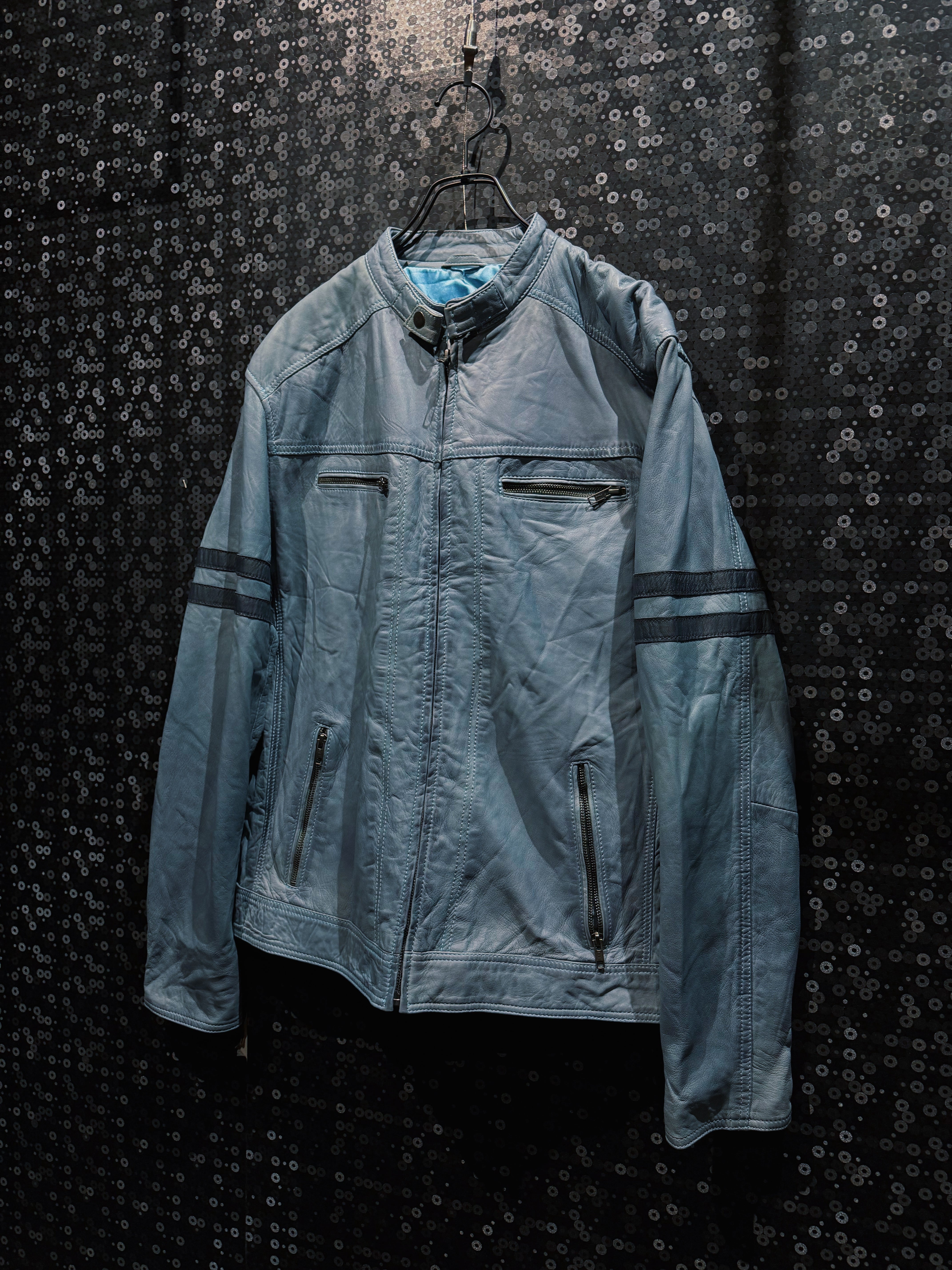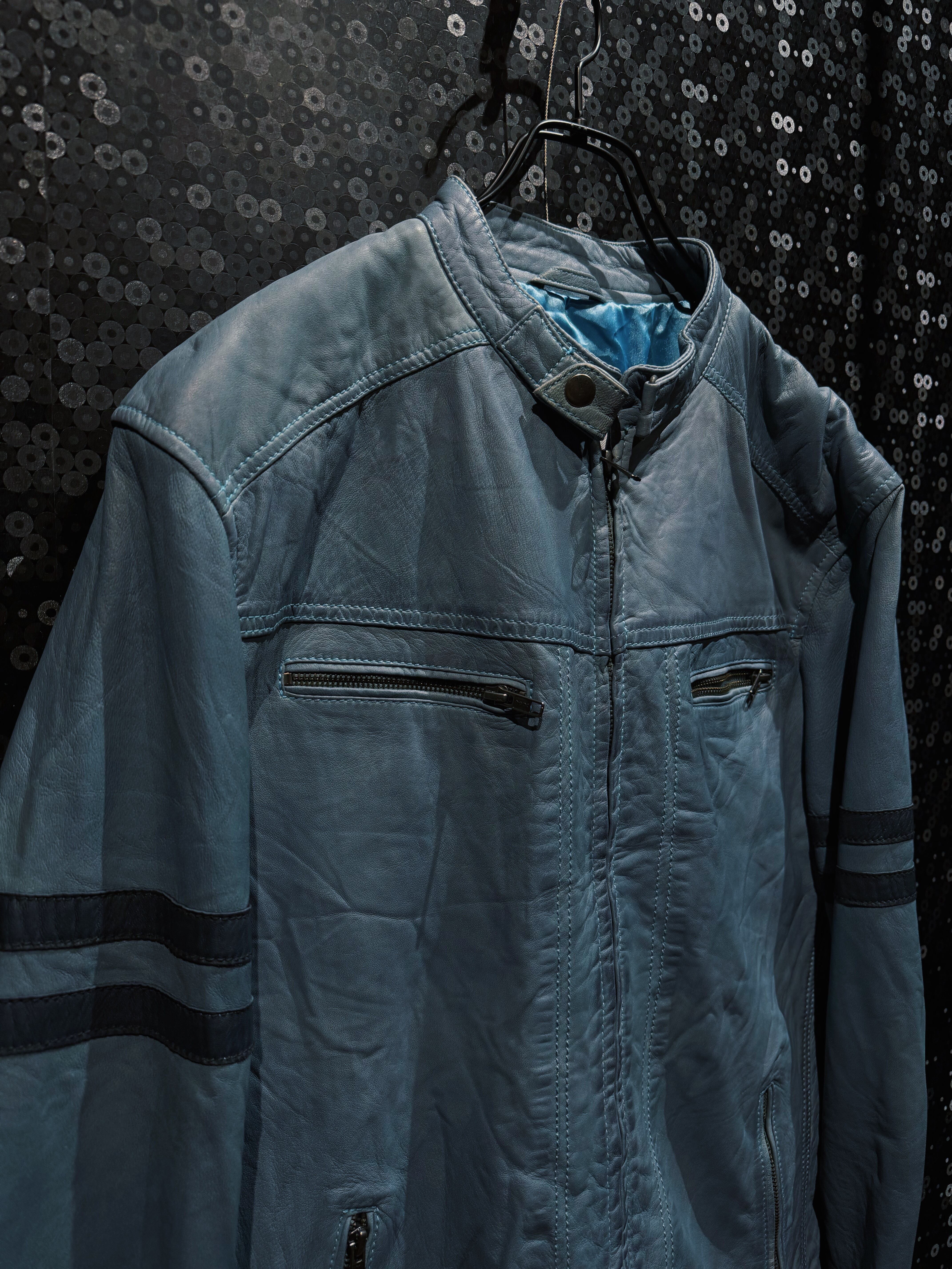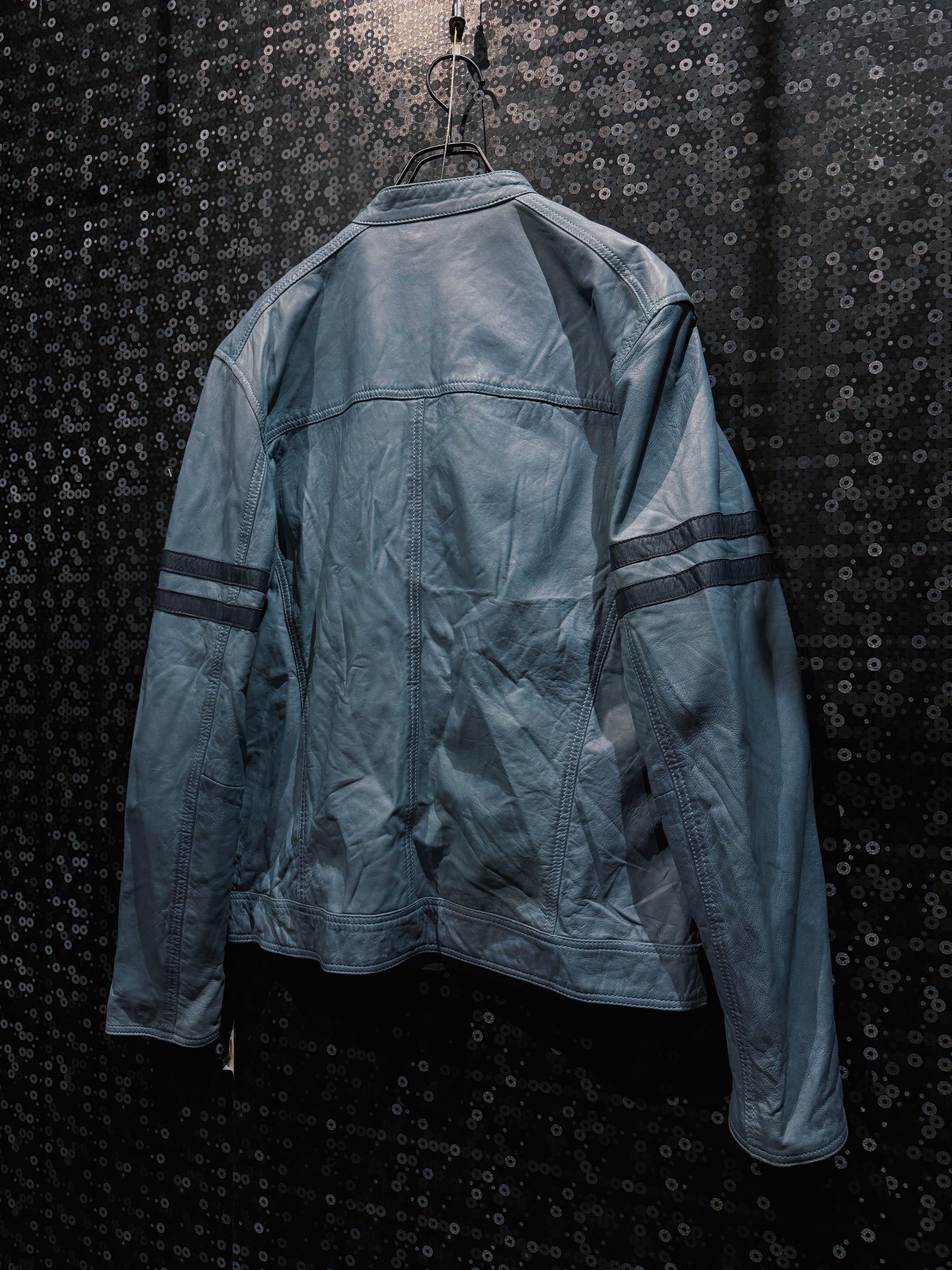 淡くフェードしたブルーグレーのレザーが印象的な、ヴィンテージスタンドカラーライダース。ブラックやブラウンではまず出てこないこの色味は、経年による退色と革質が噛み合って初めて成立する個体で、均一ではない色ムラやシワの入り方がそのまま表情として完成している。
