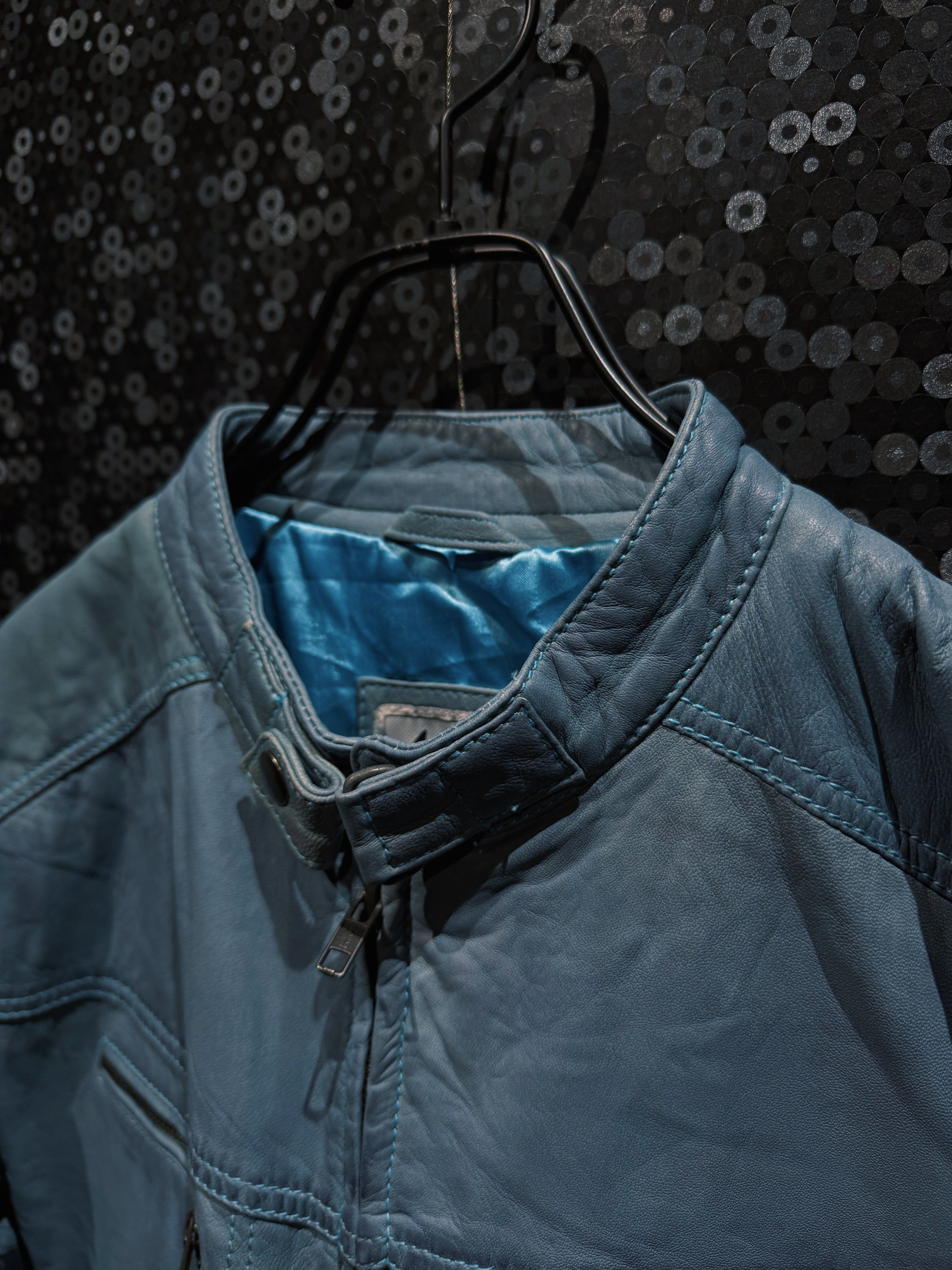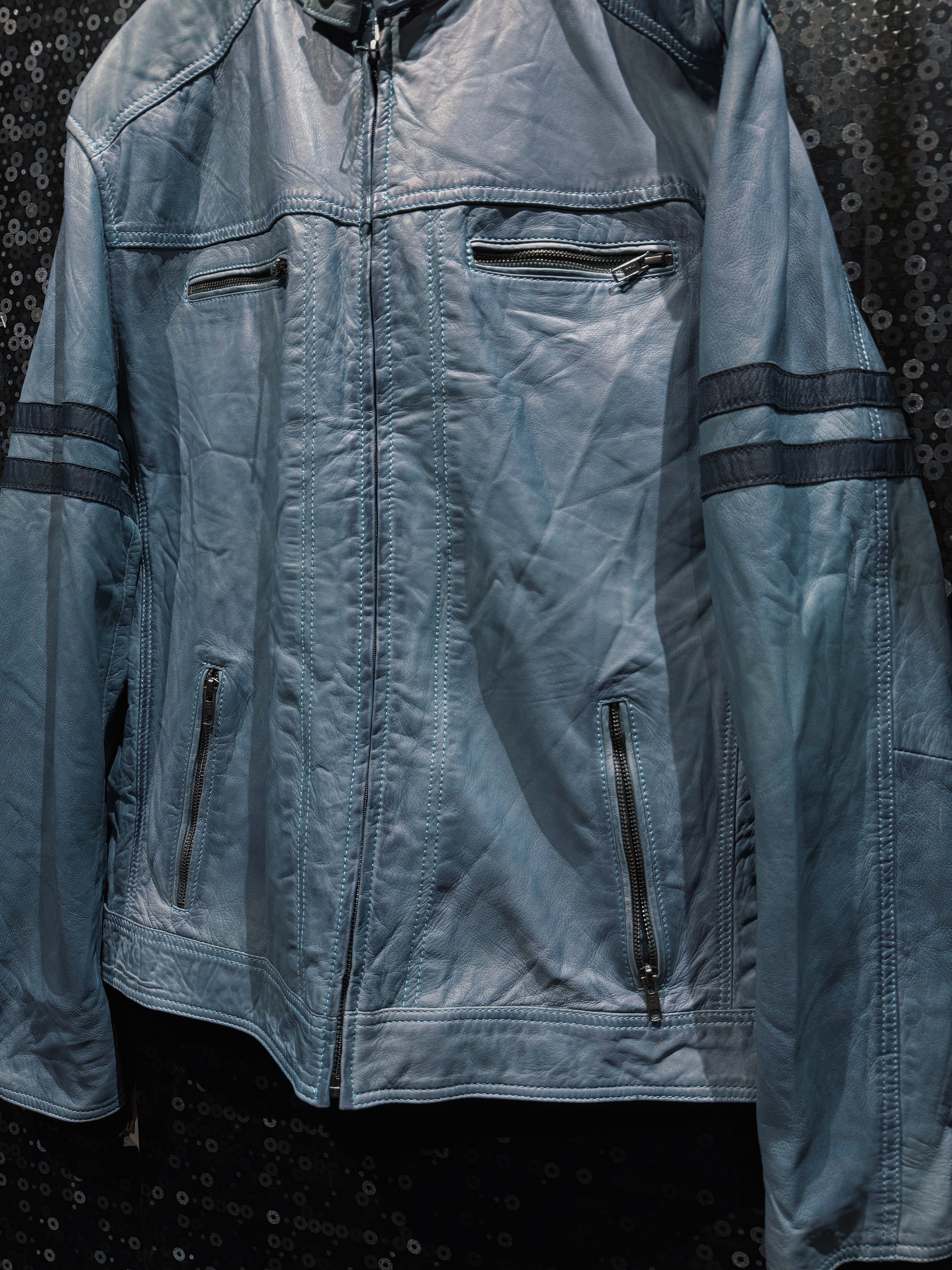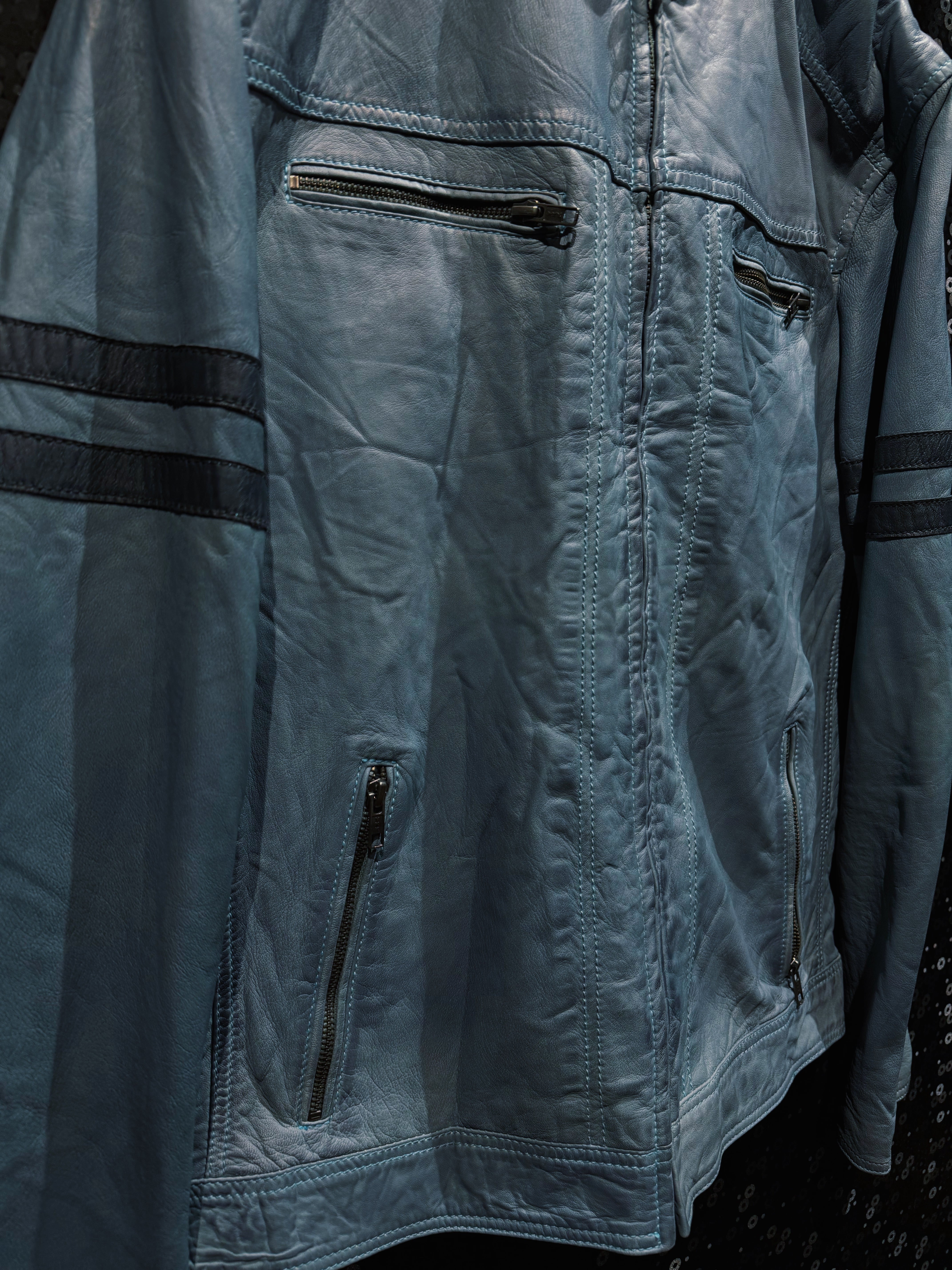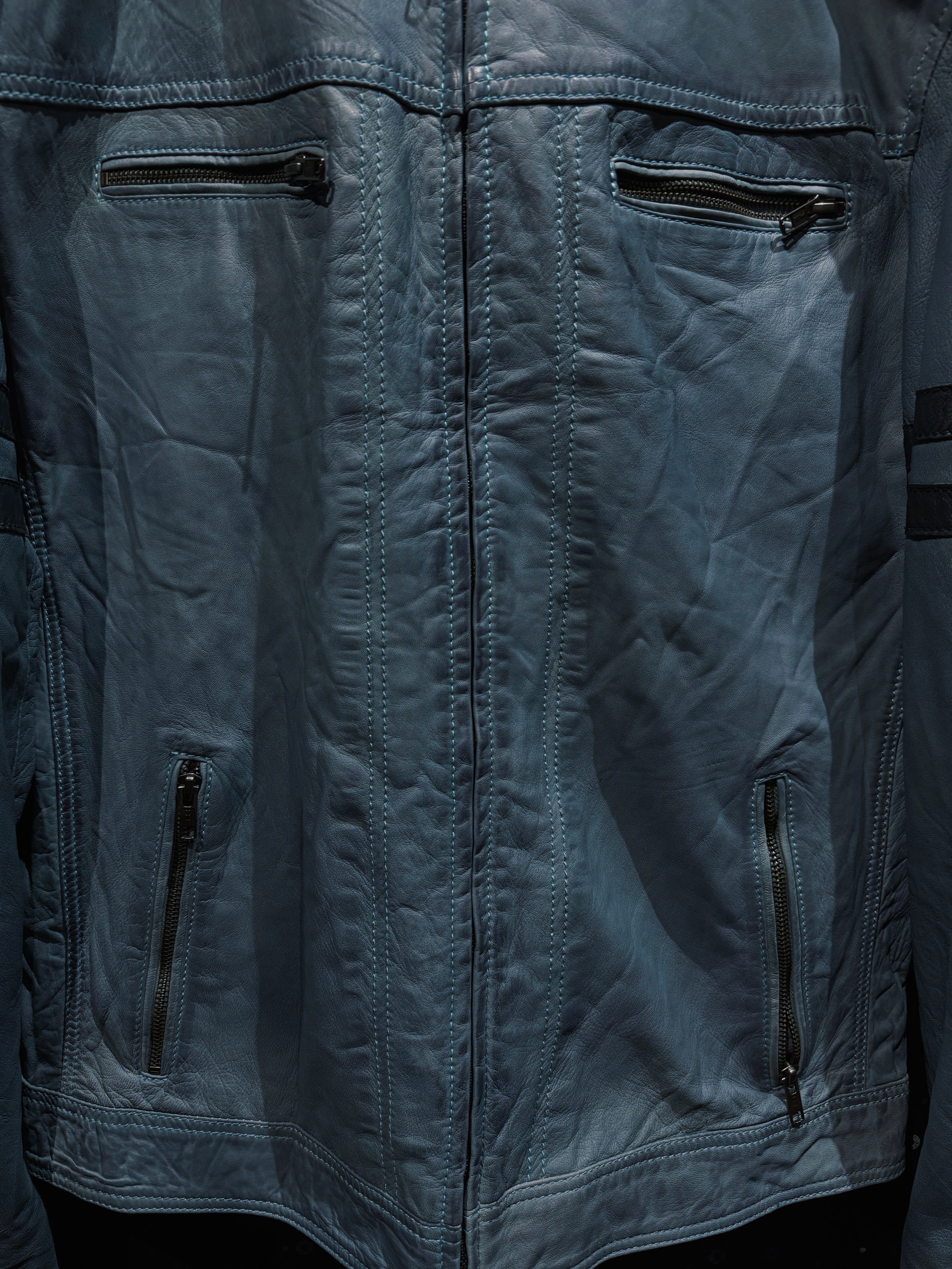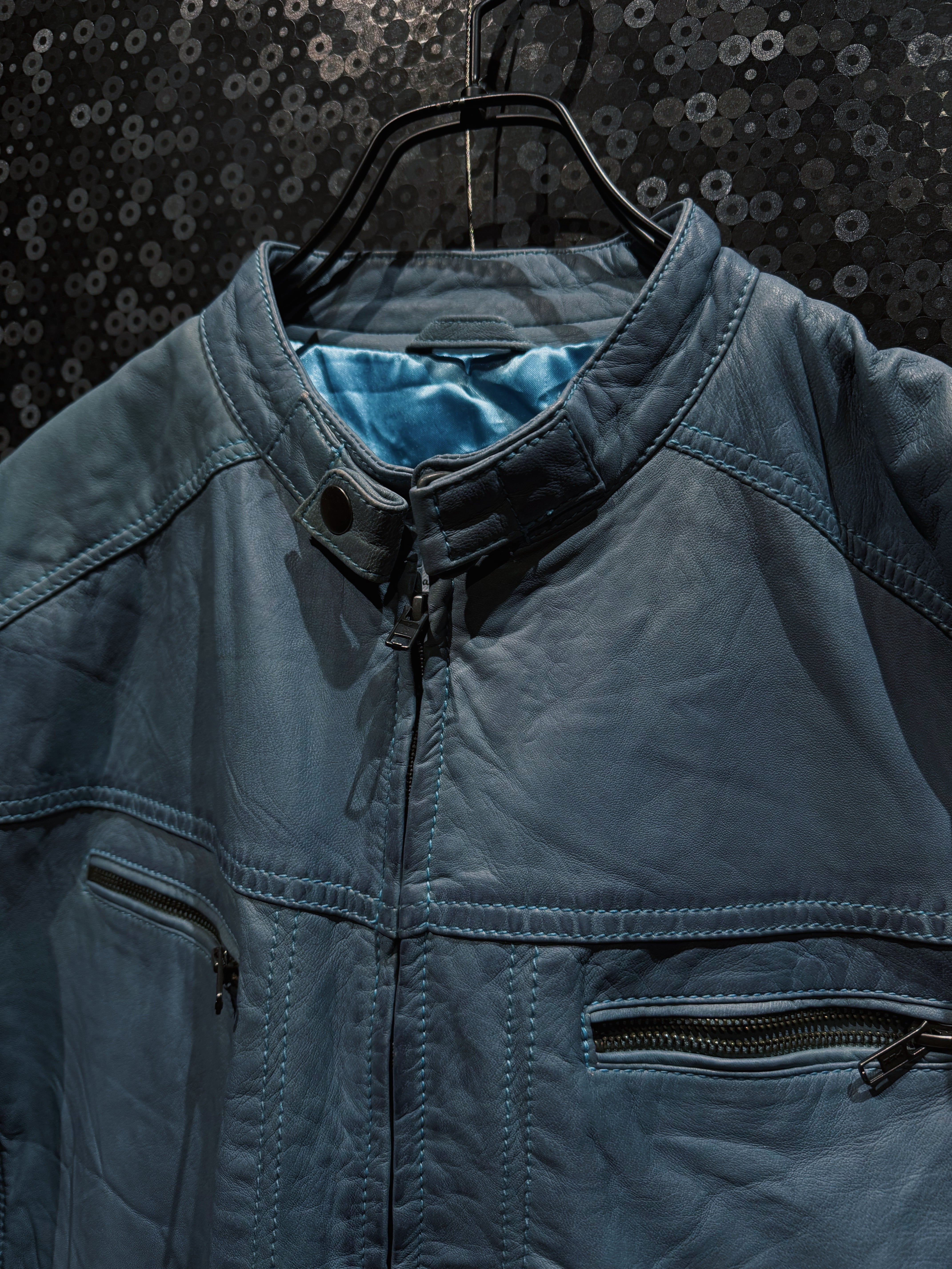 淡くフェードしたブルーグレーのレザーが印象的な、ヴィンテージスタンドカラーライダース。ブラックやブラウンではまず出てこないこの色味は、経年による退色と革質が噛み合って初めて成立する個体で、均一ではない色ムラやシワの入り方がそのまま表情として完成している。