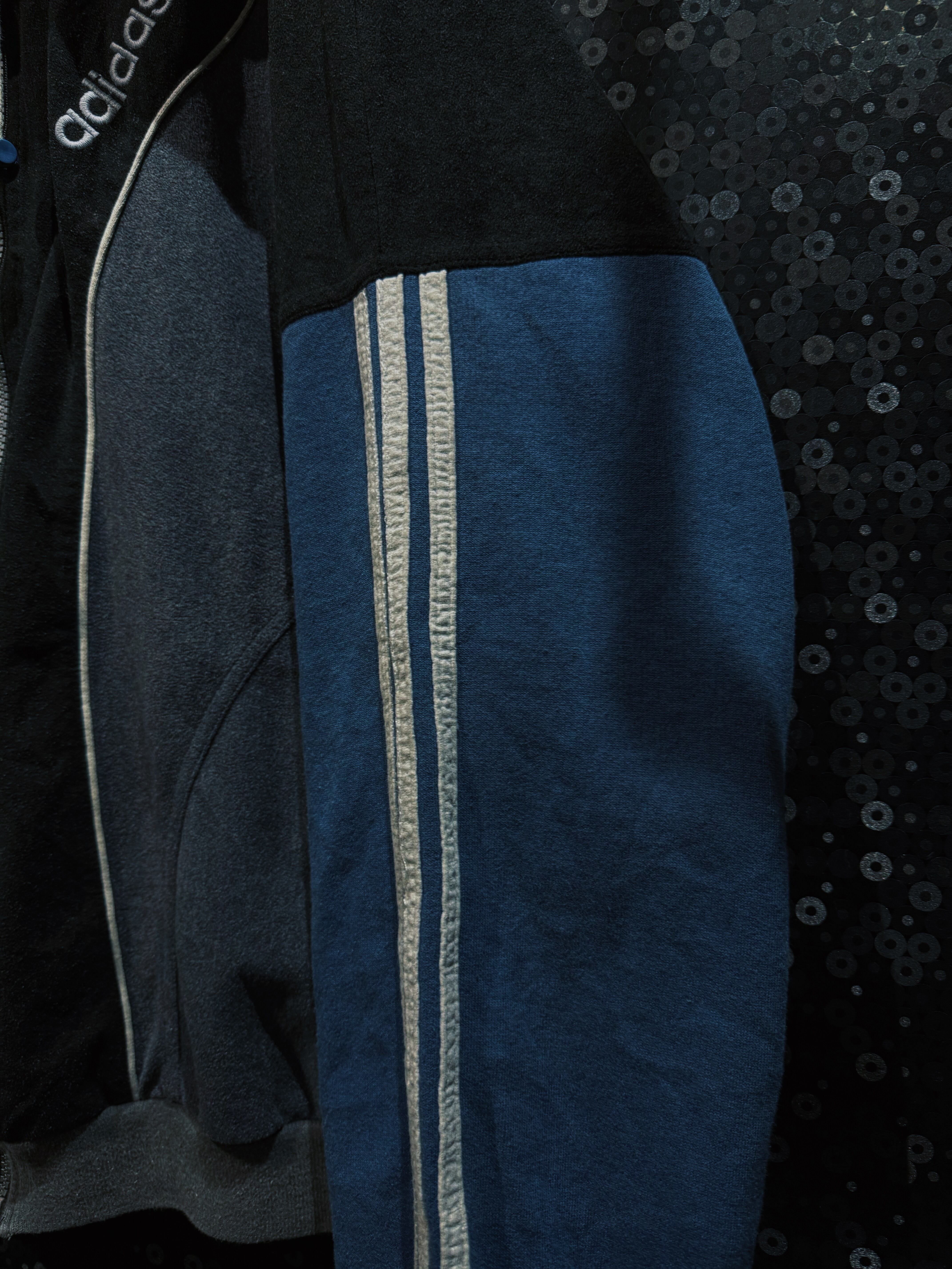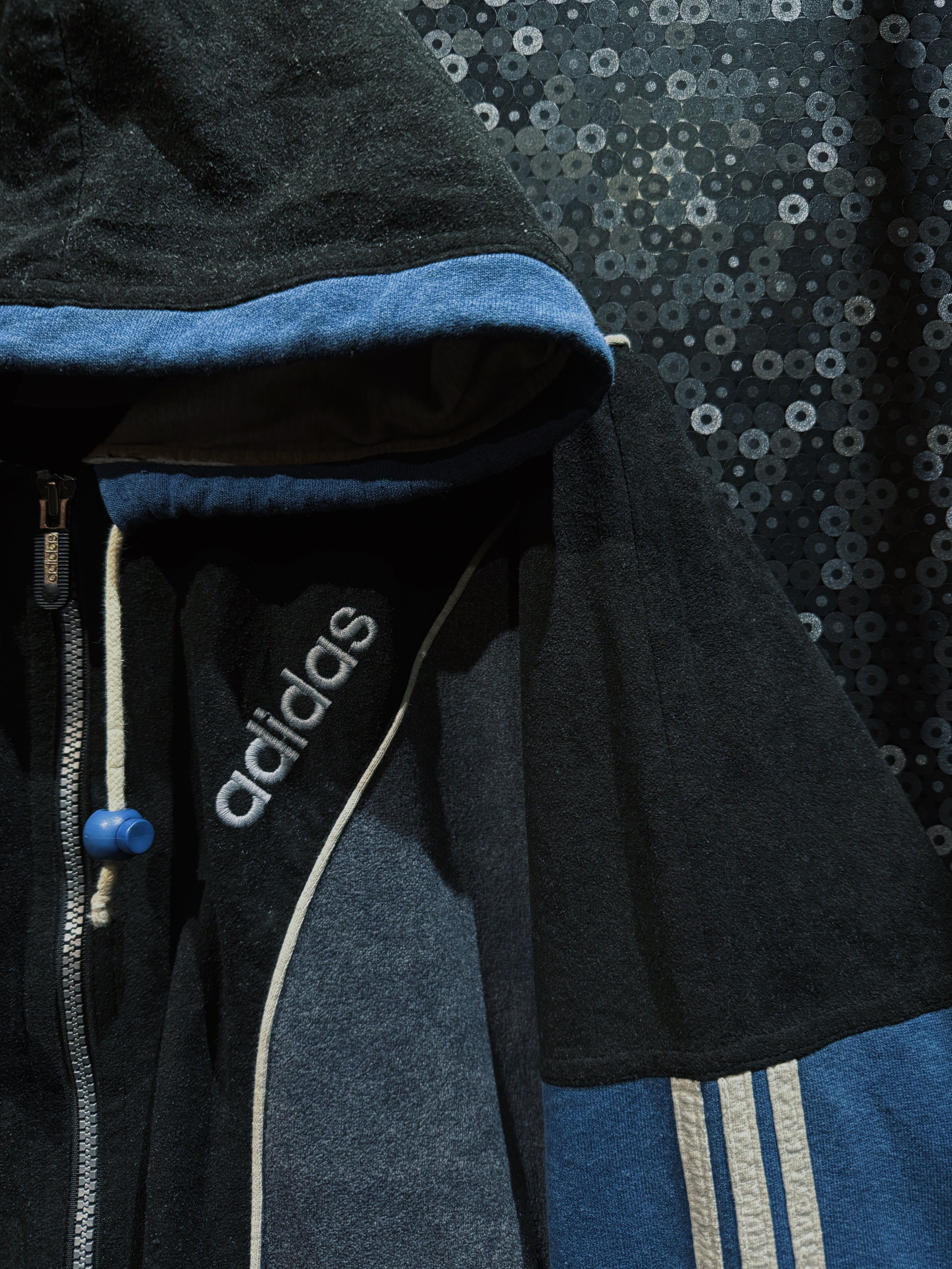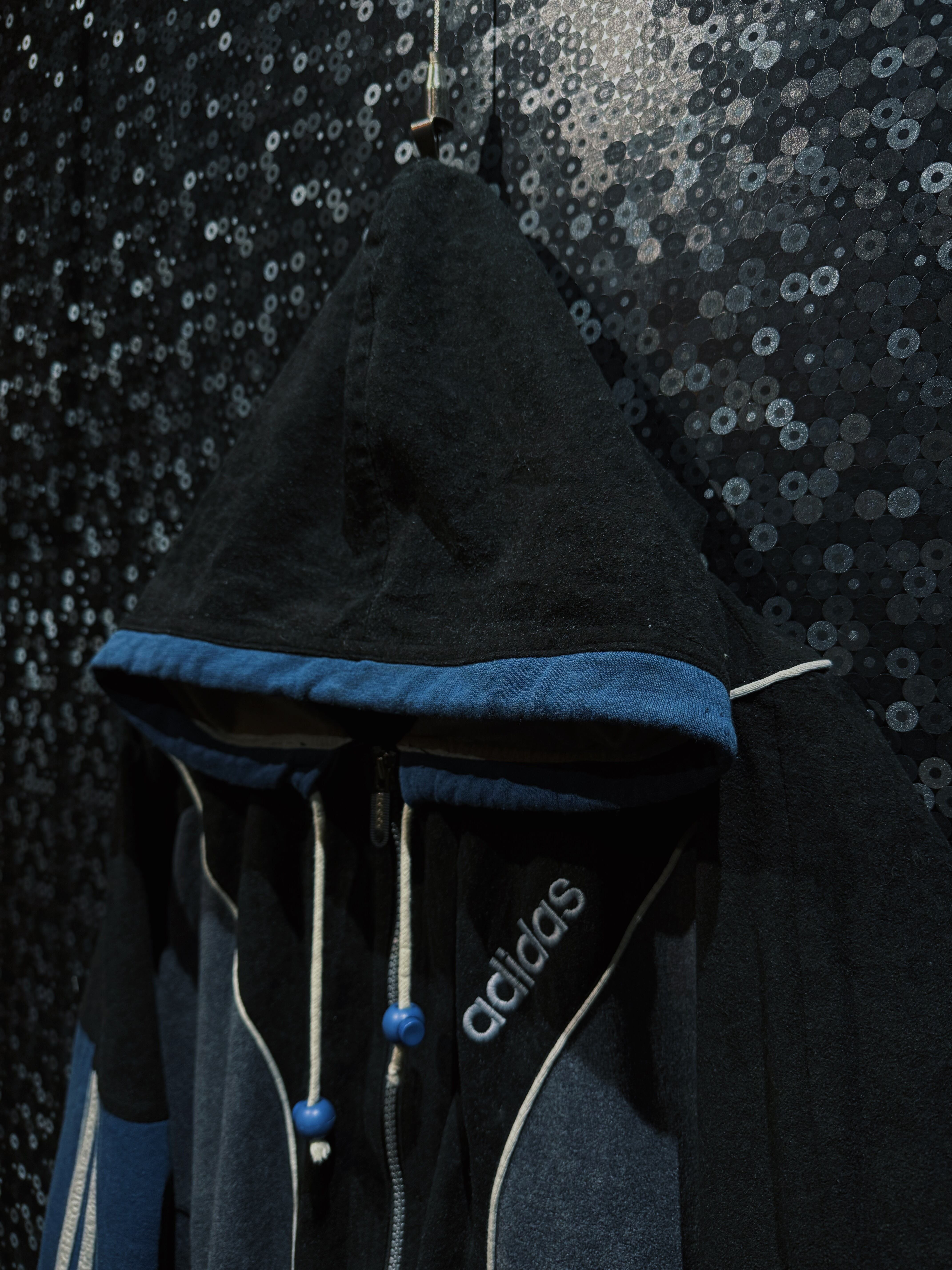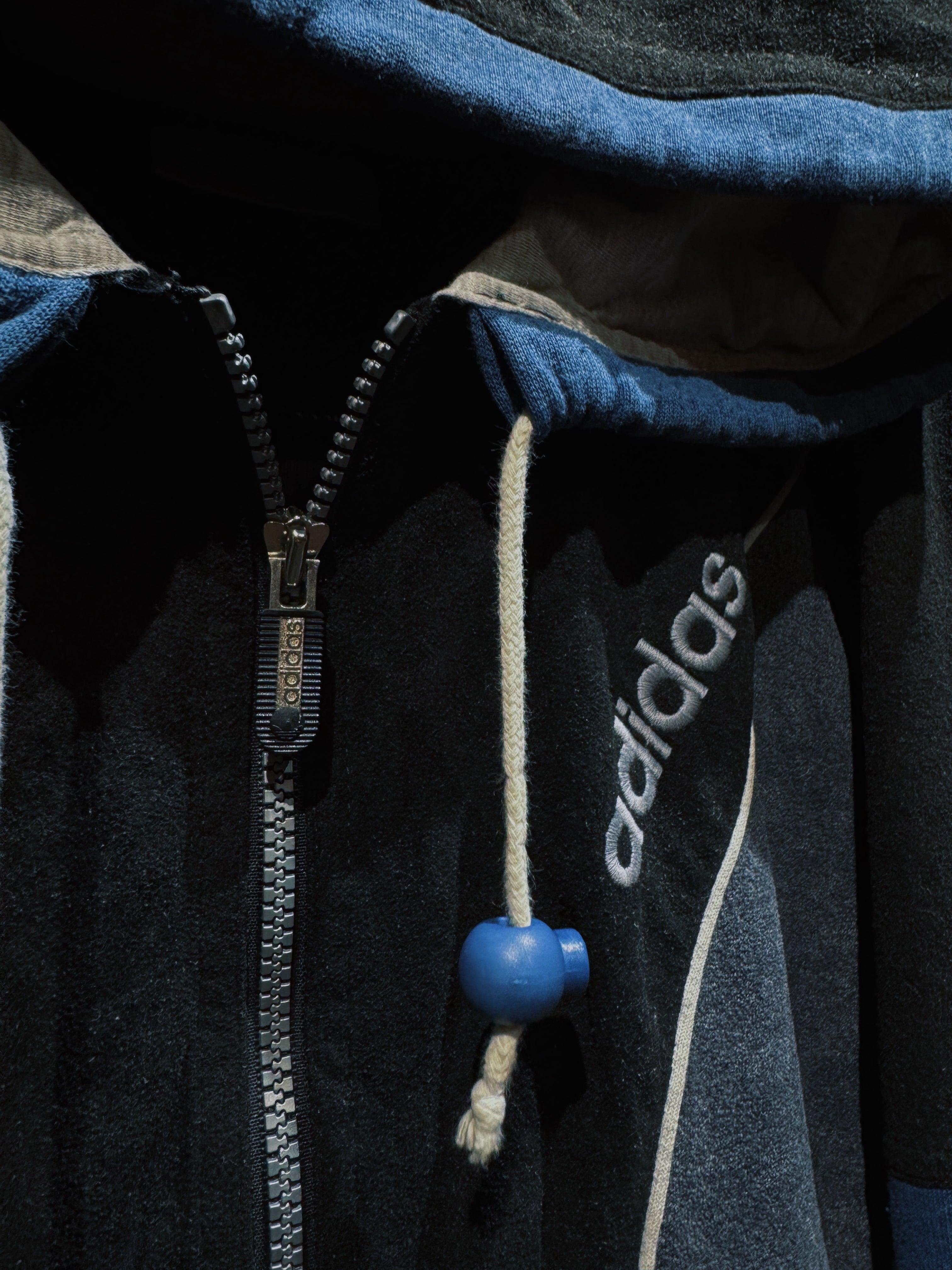 肉厚なフリースボディをベースに、ブラック×ネイビーの切り替えが映えるadidas originalsのジップフーディー。